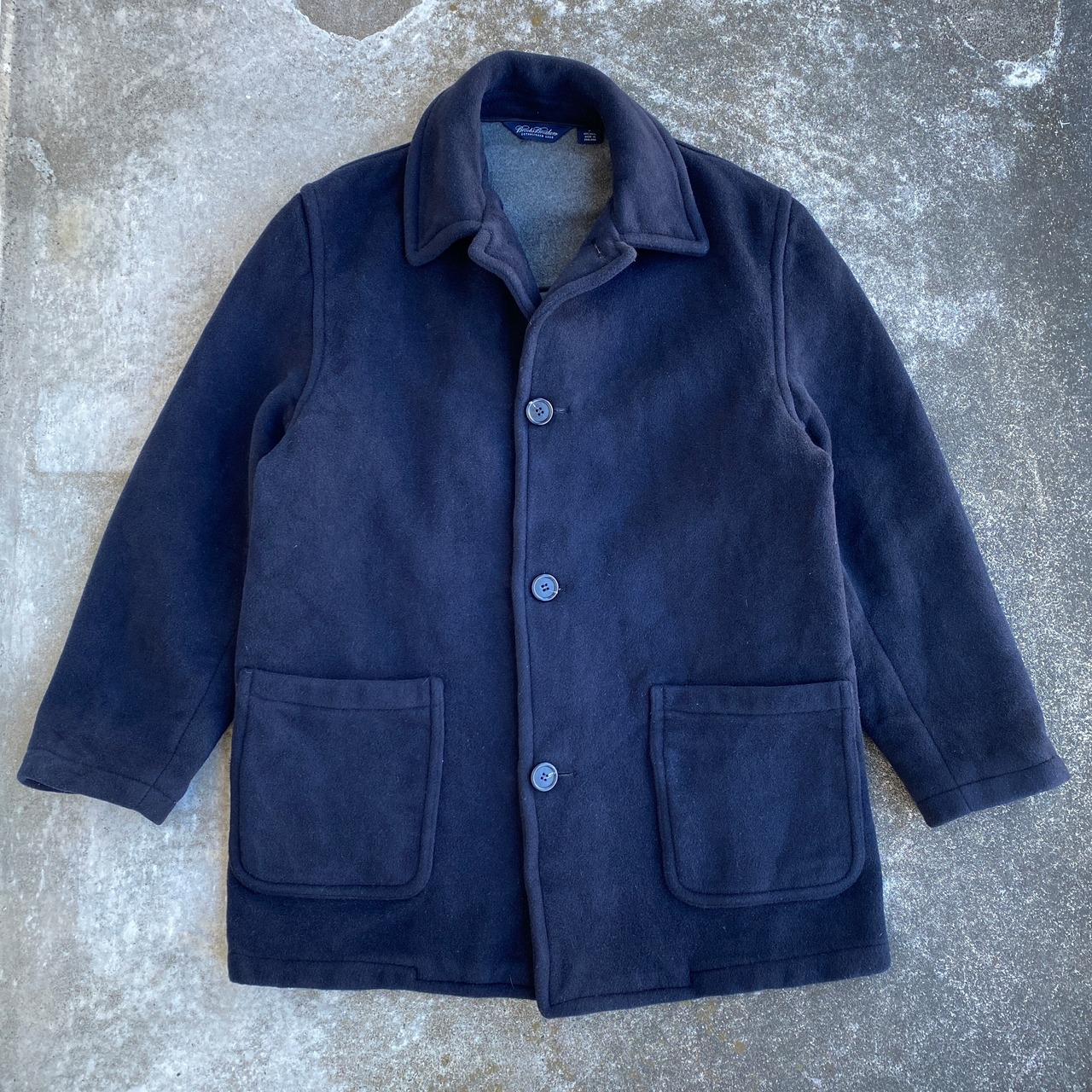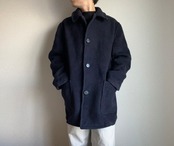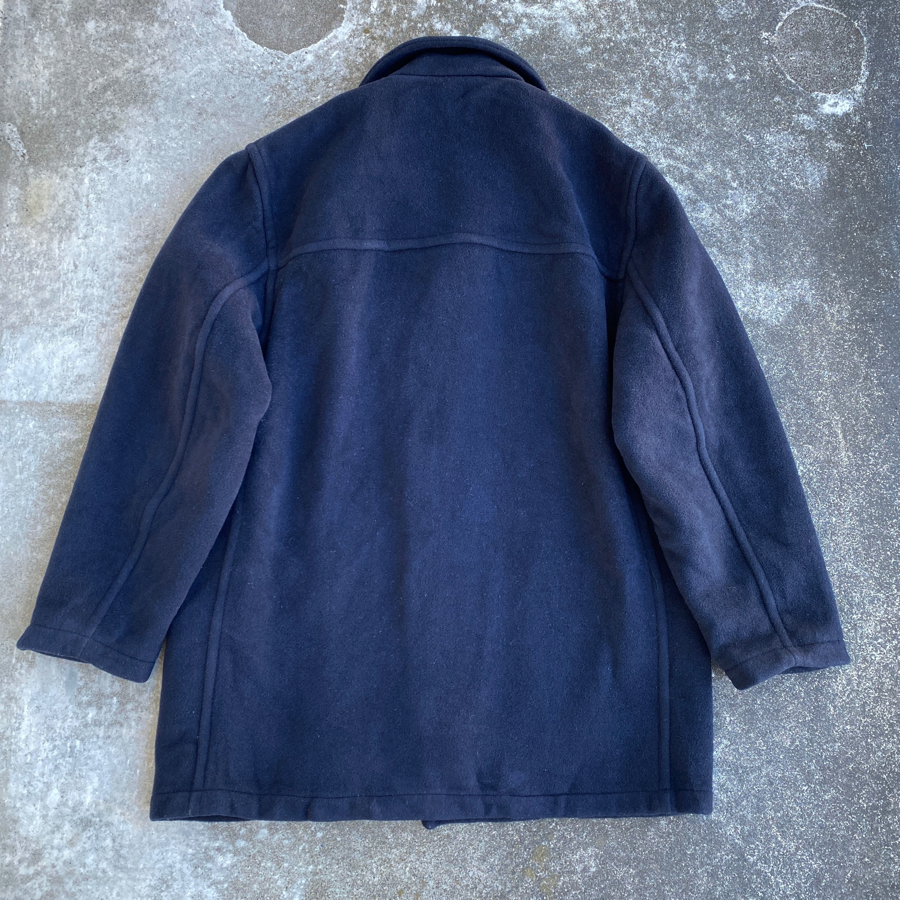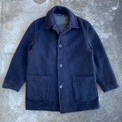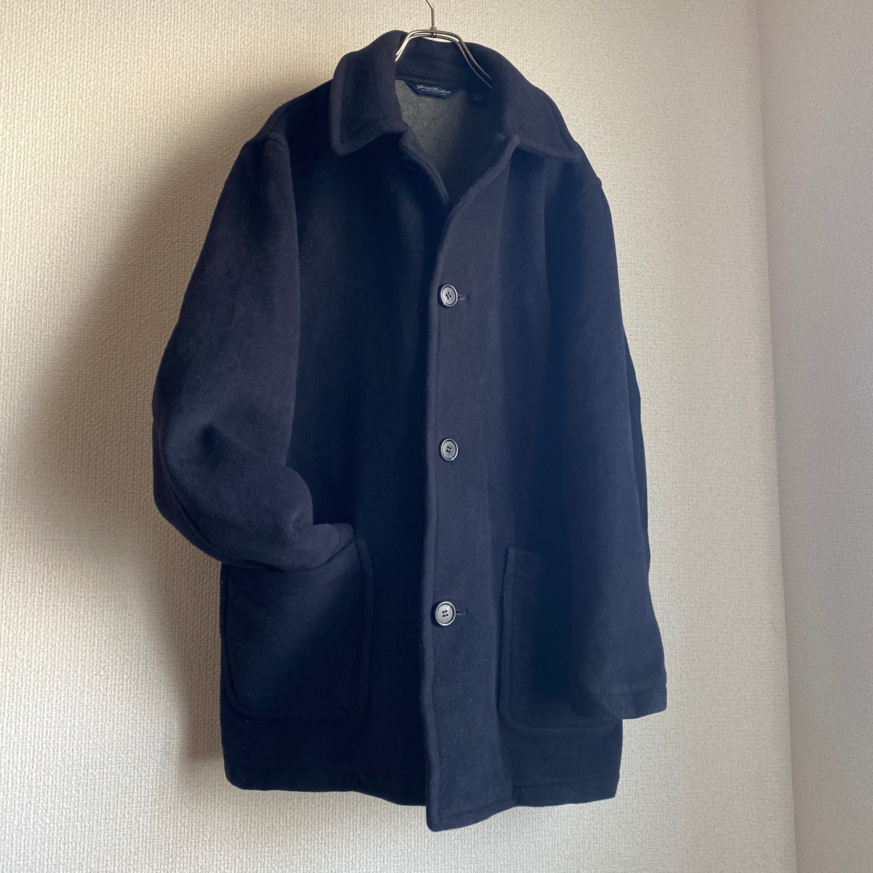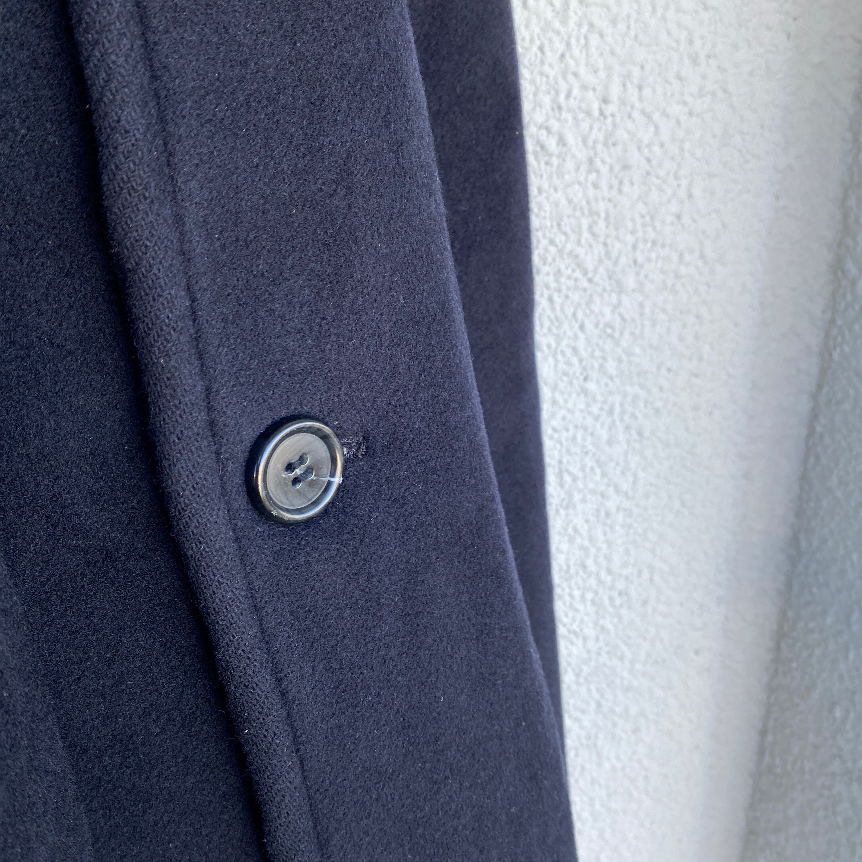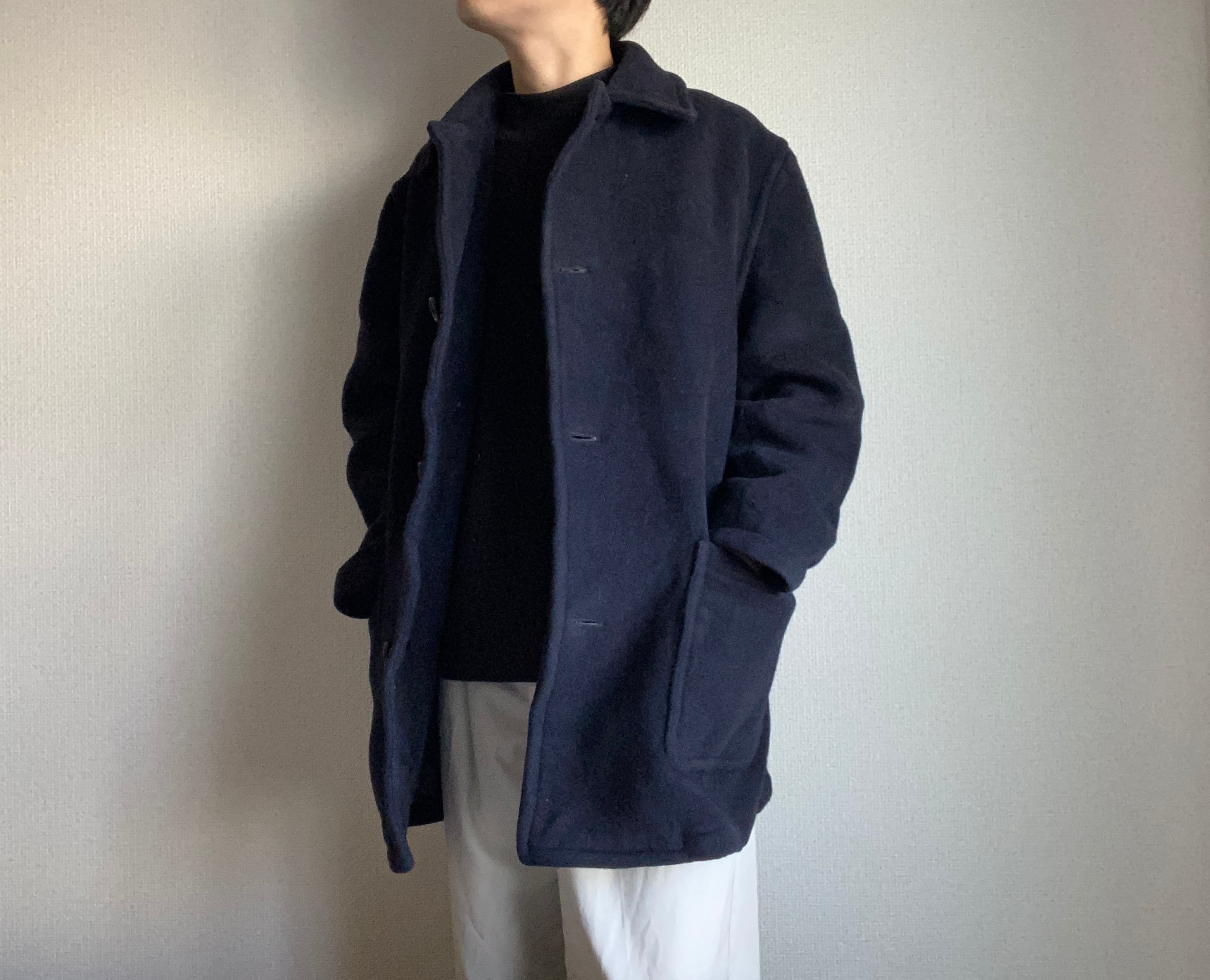かなり肉厚で、カシミヤ混のような柔らかいモチッとした質感のウールに、上品なダークネイビーの色目(吊るしの画像が近いです)、ゆったりとパターンがとられた丸みのあるシルエットが非常に格好良い一着。