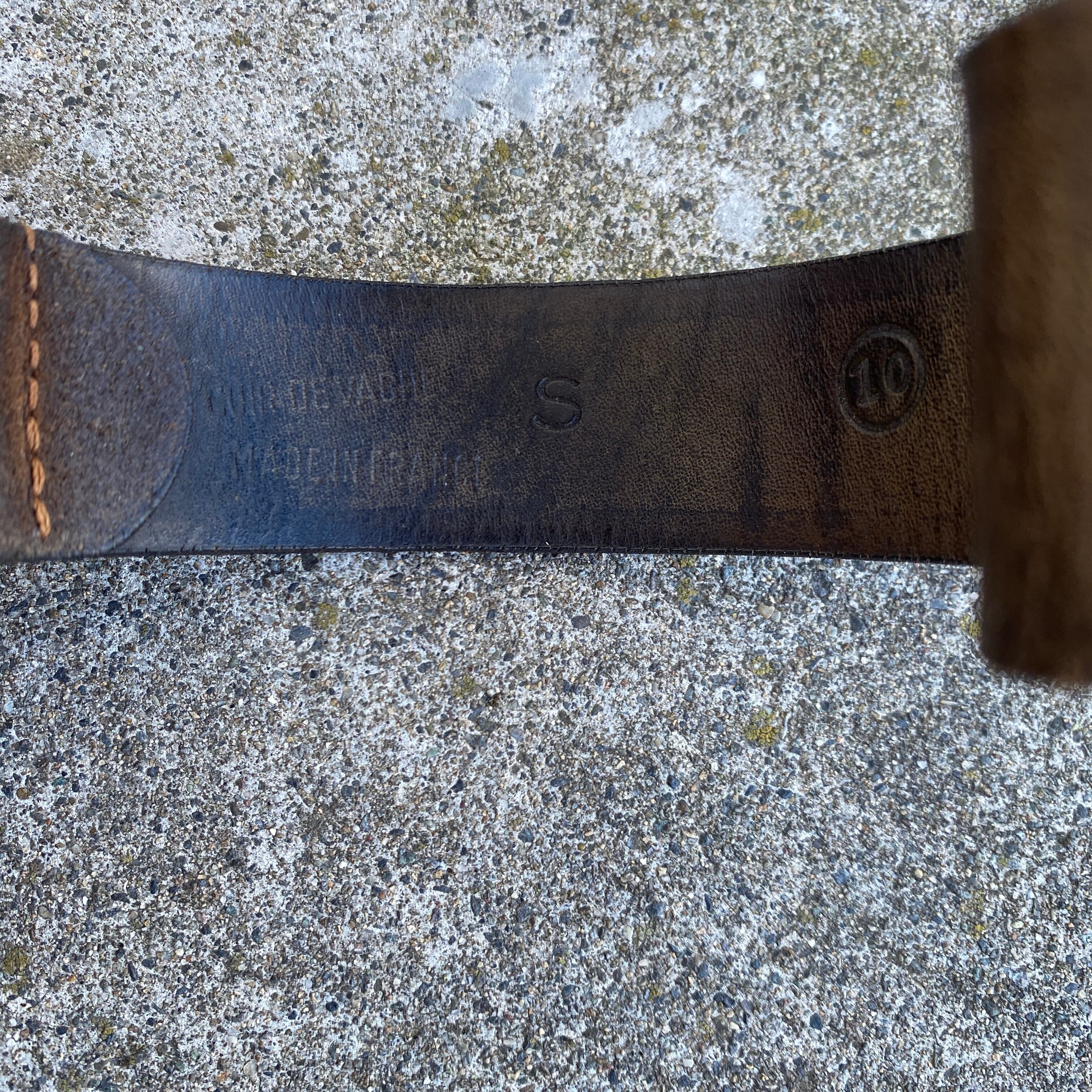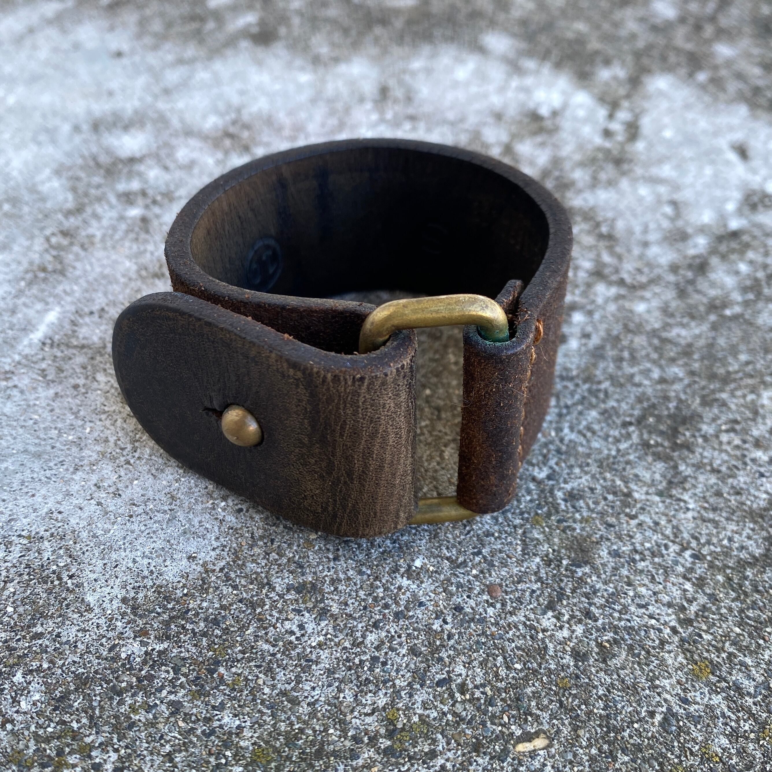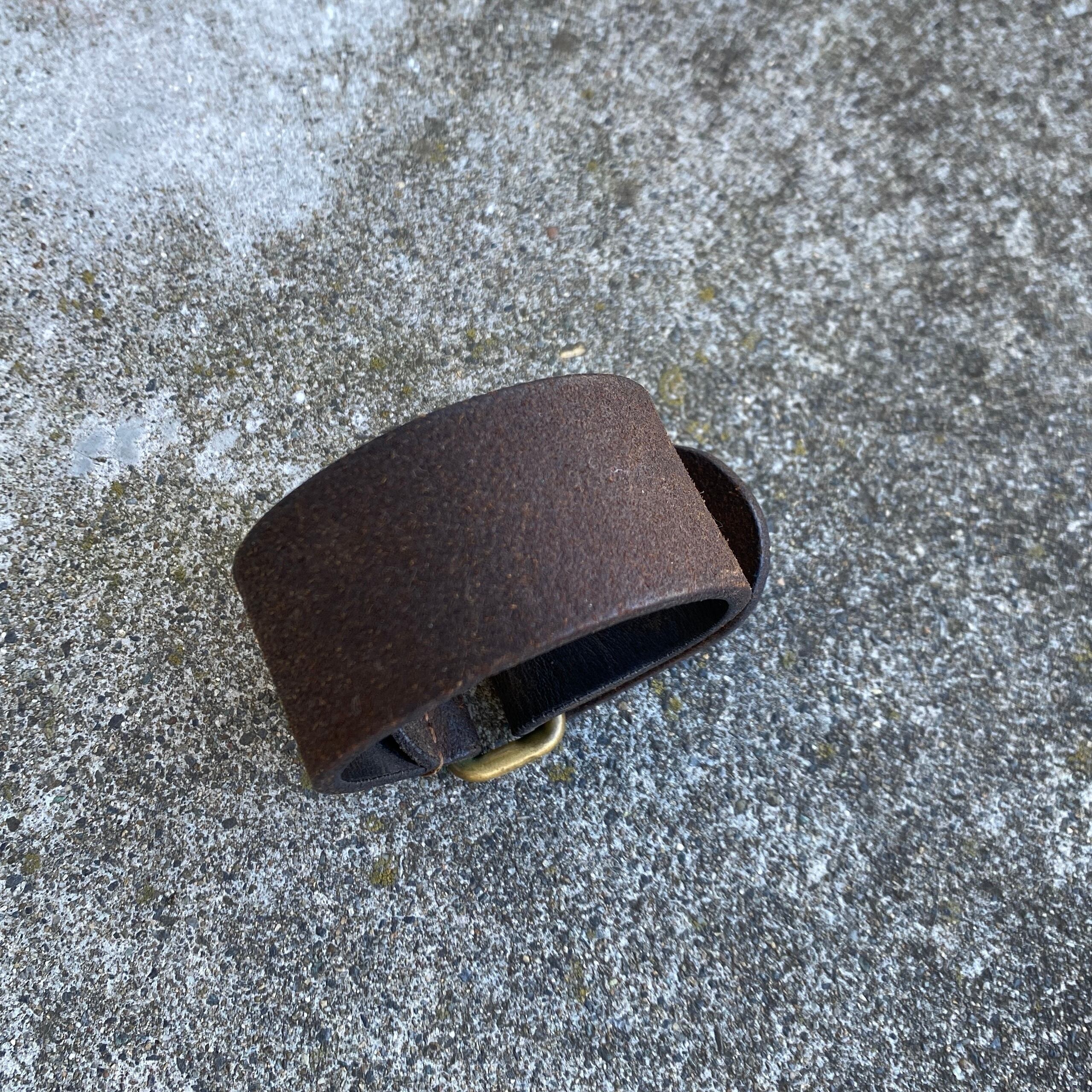 ブラウンのレザーと真鍮金具を使ったシンプルなブレスレットですが、金具部分で折り返すことでスエード、スムース両面が表にくるマルタンらしいデザインです。