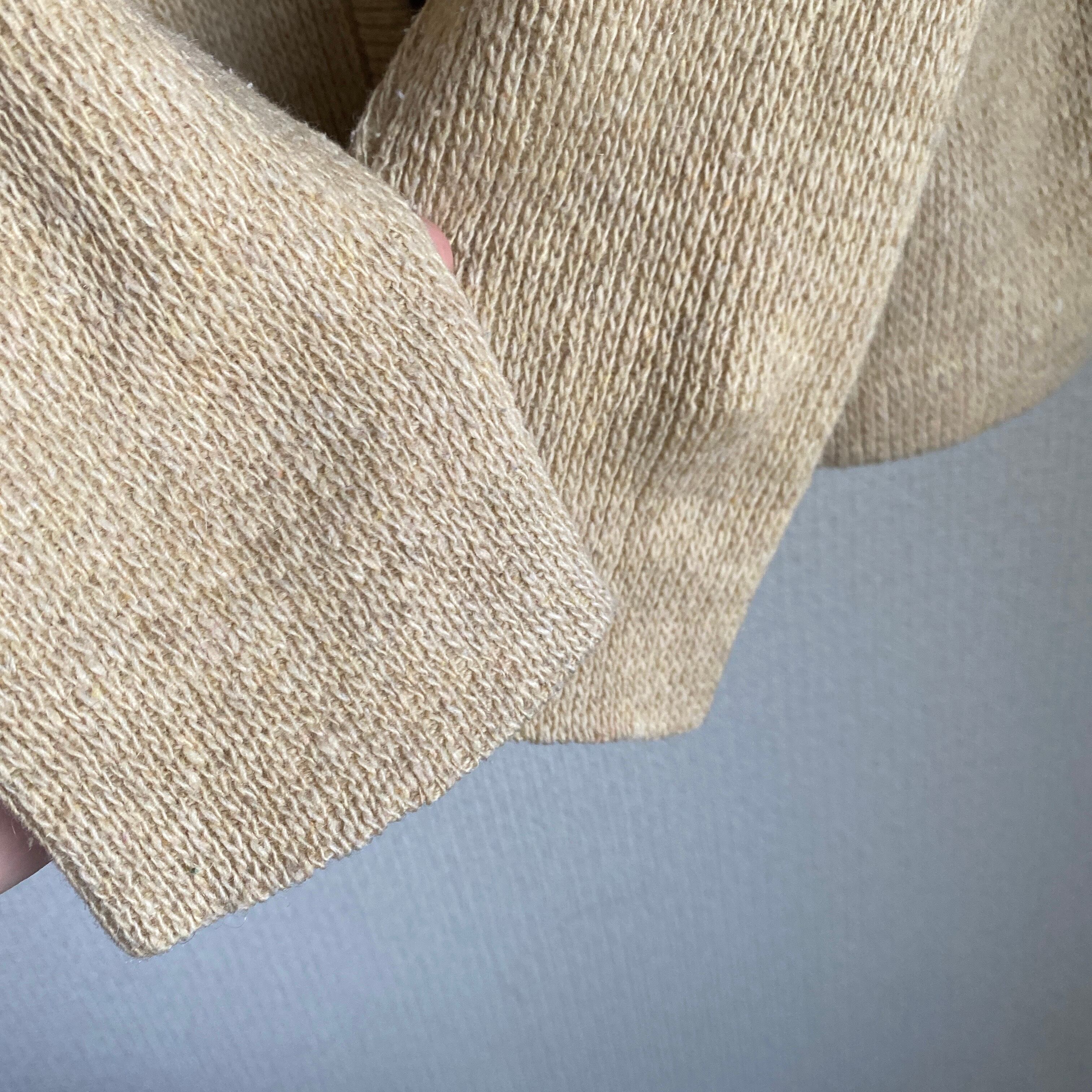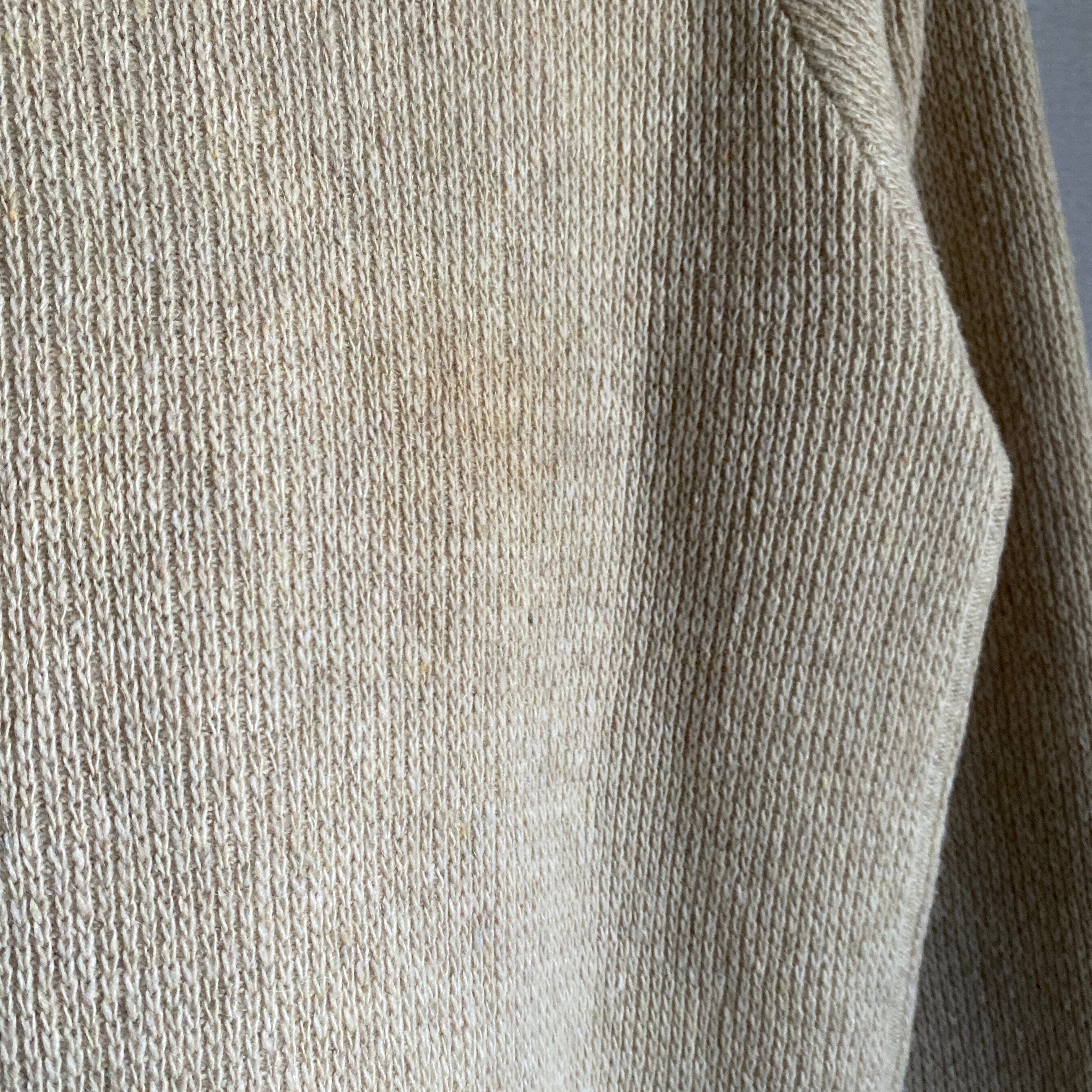 サクッとした風合いの良いニット素材に、混じり気のあるベージュとダークブラウンの配色、リブのつかないミニマルなデザインが素晴らしい一着。