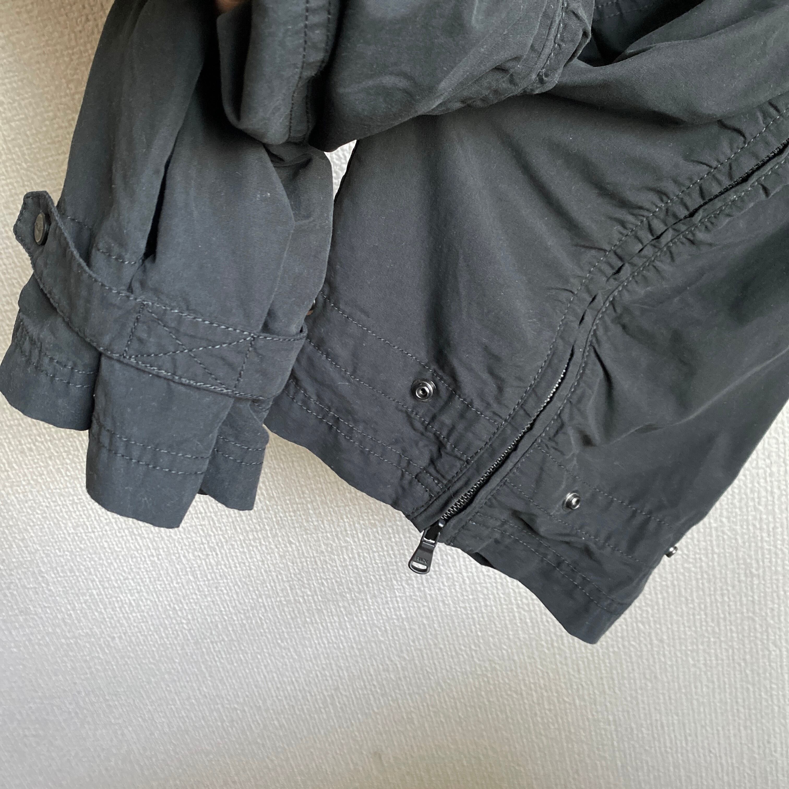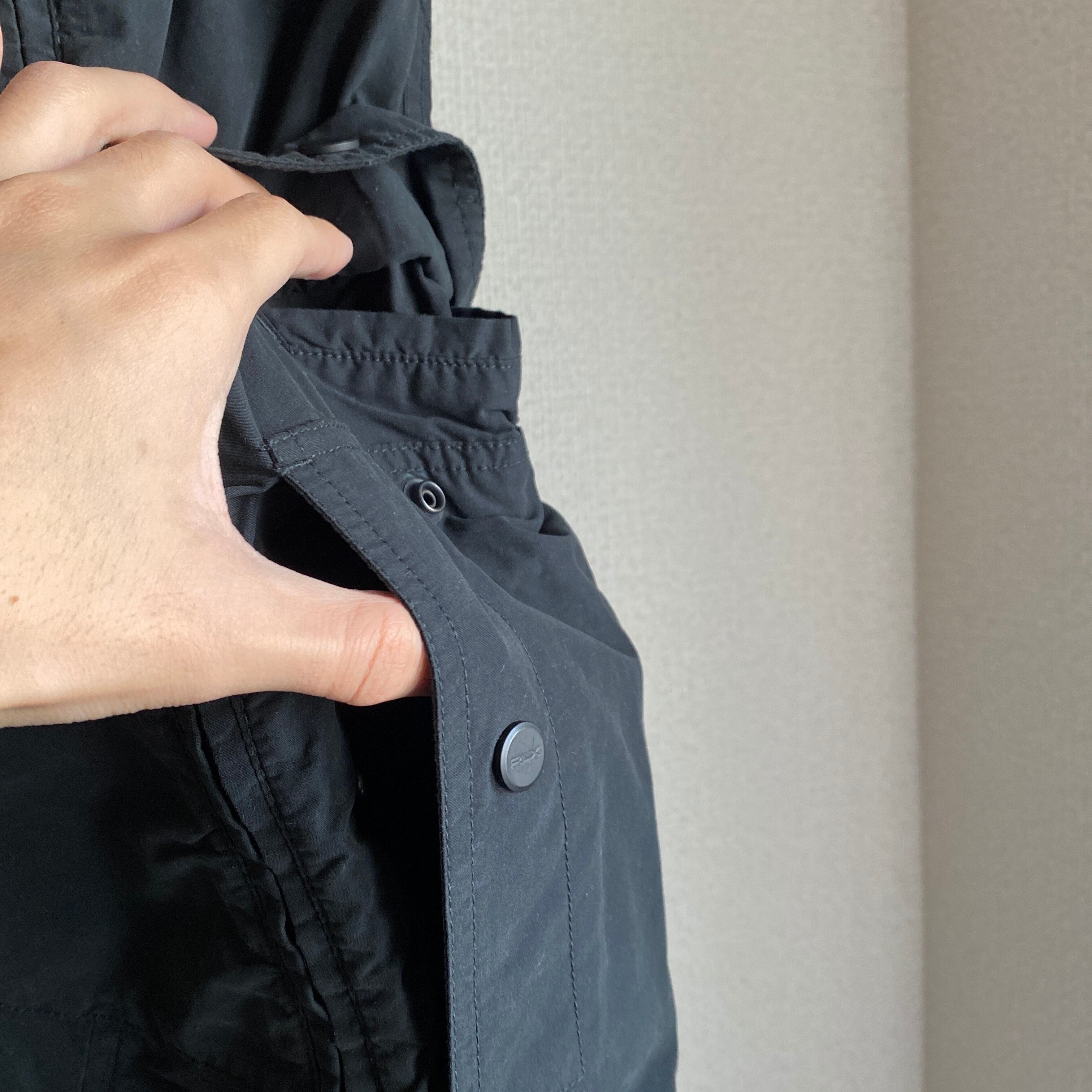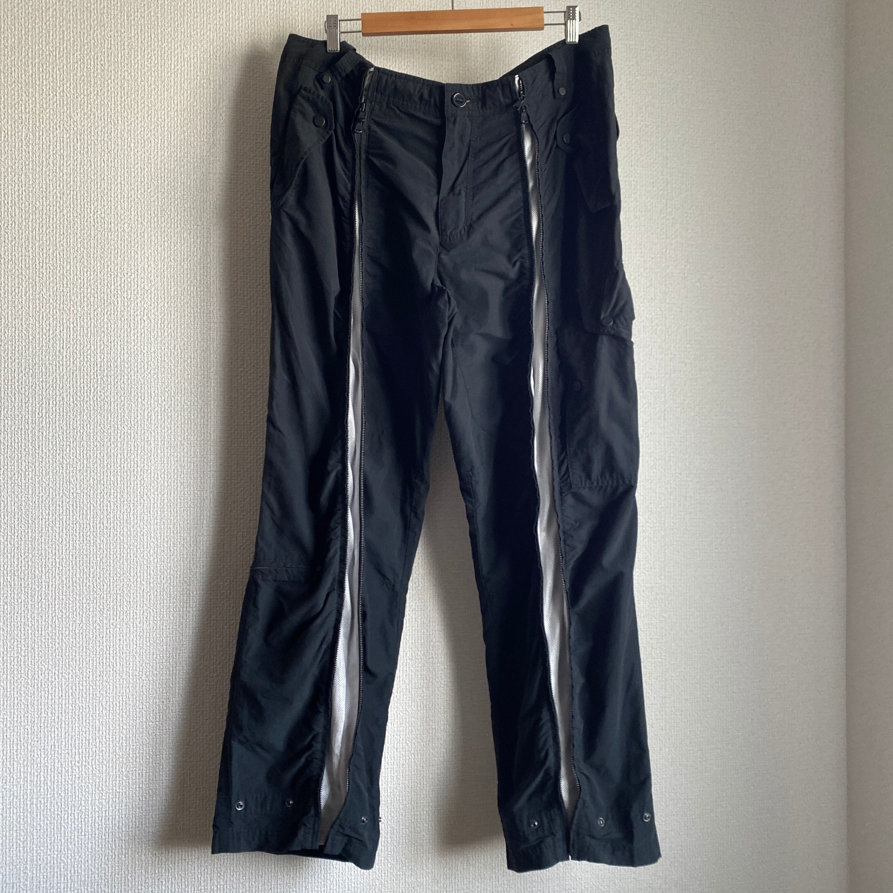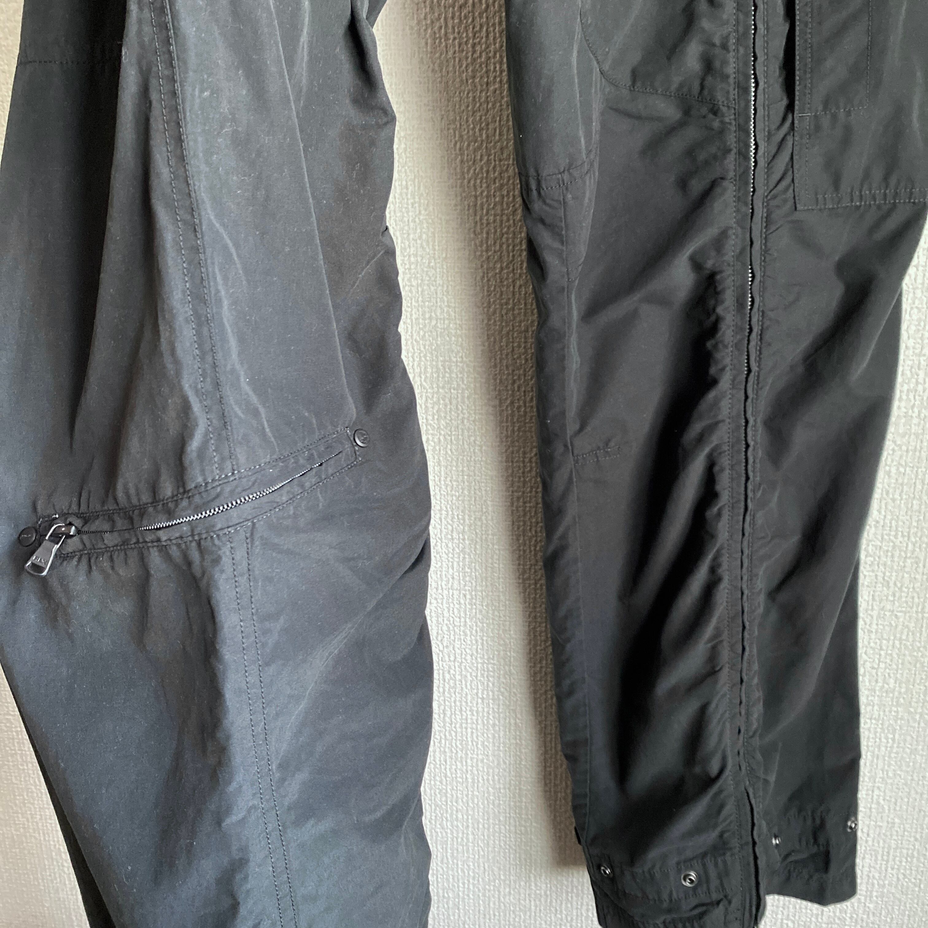 ブラックの艶消しコットンナイロンボディに、USAAF A-11 trousersのようなフロントジップデザイン(開けた部分のみメッシュ)、やや浅い股上のワイドストレートシルエット(裾はスナップでぎゅっと詰められます)が非常に格好良い一着。