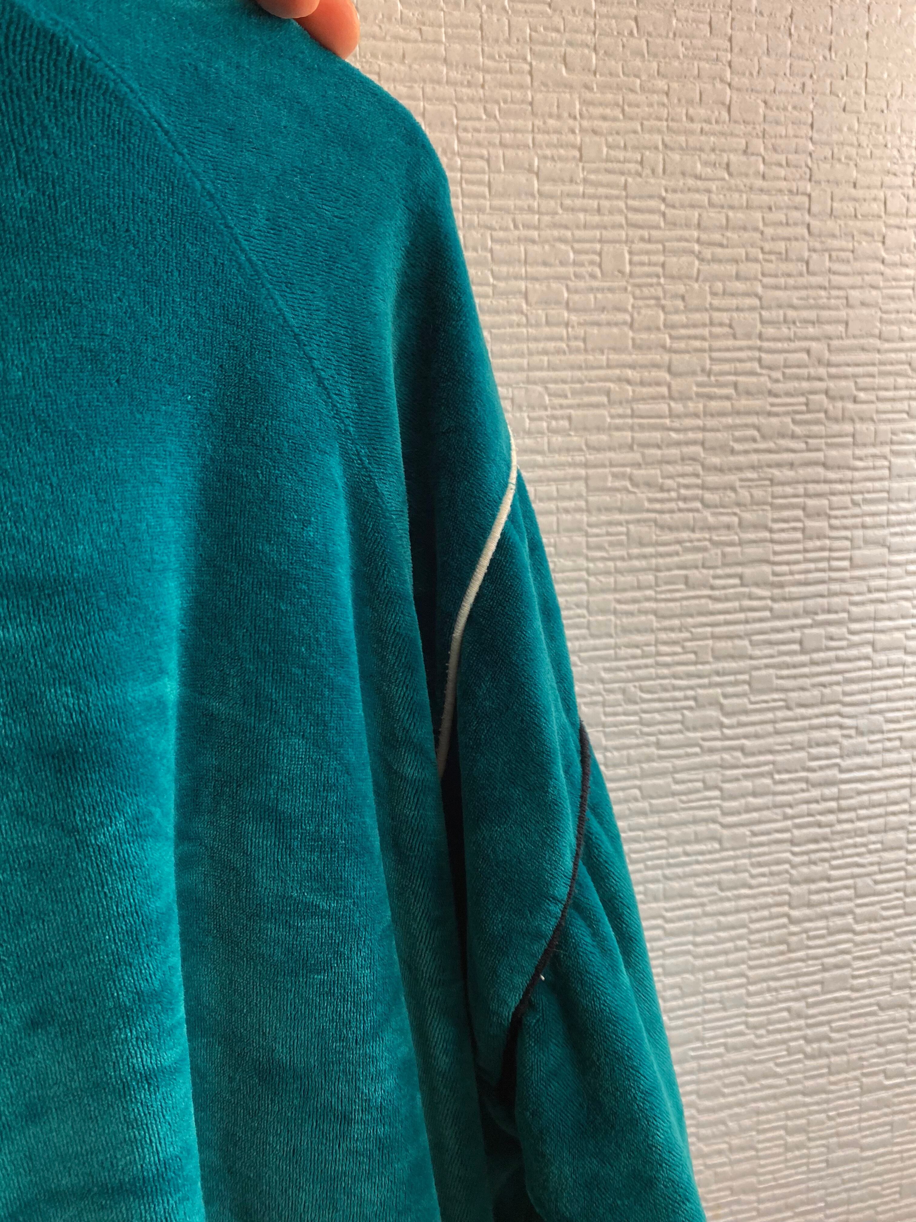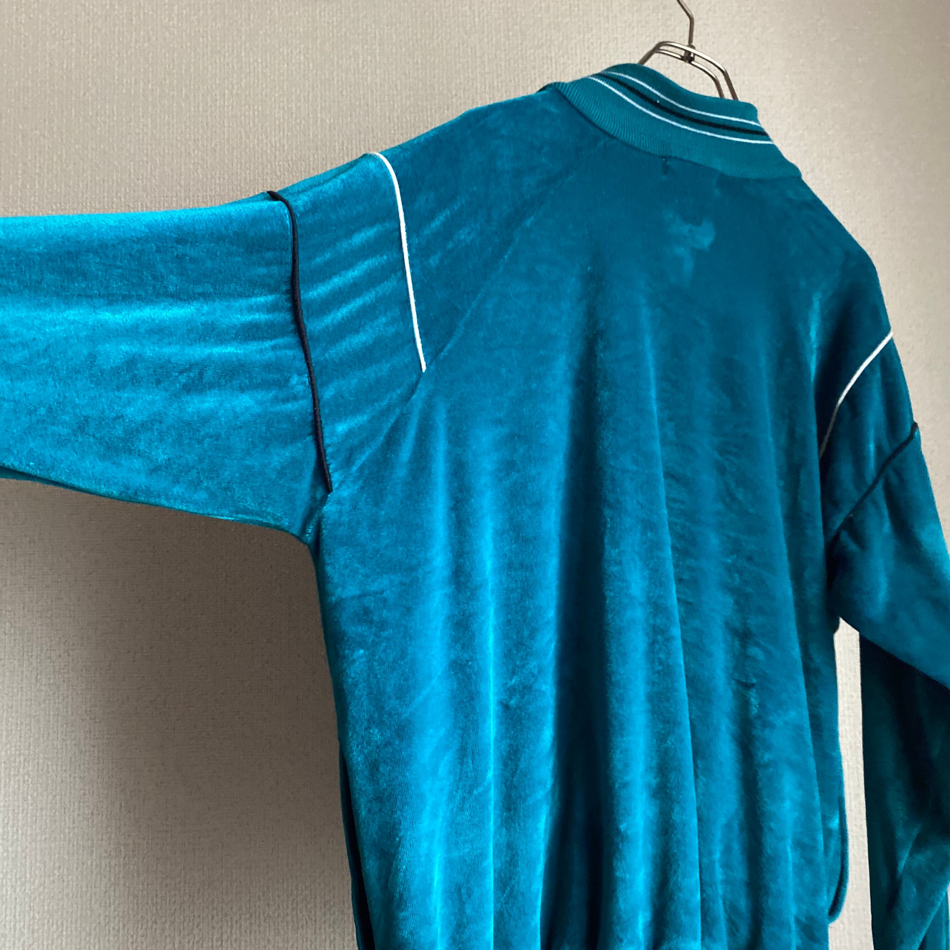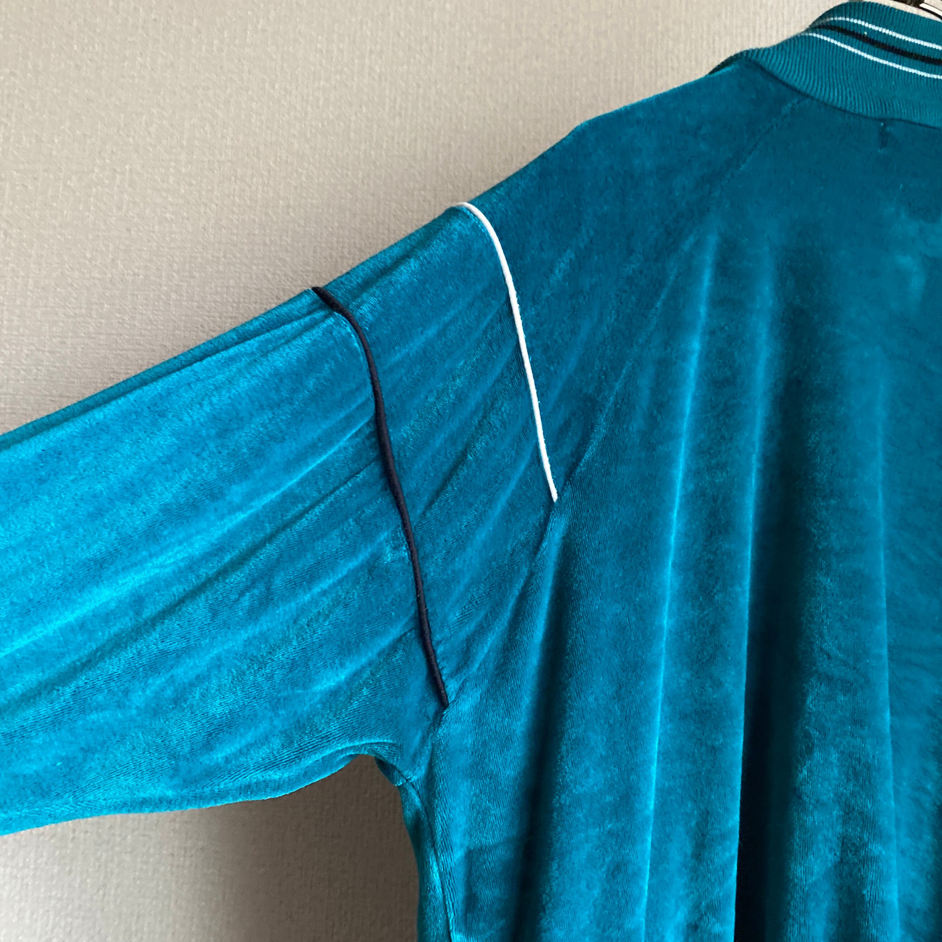 エメラルドブルー(画像8のややグリーンみあるカラーが近いです)の綺麗な色目に、ベロアの落ち感のある生地感が非常に雰囲気の良い一着。