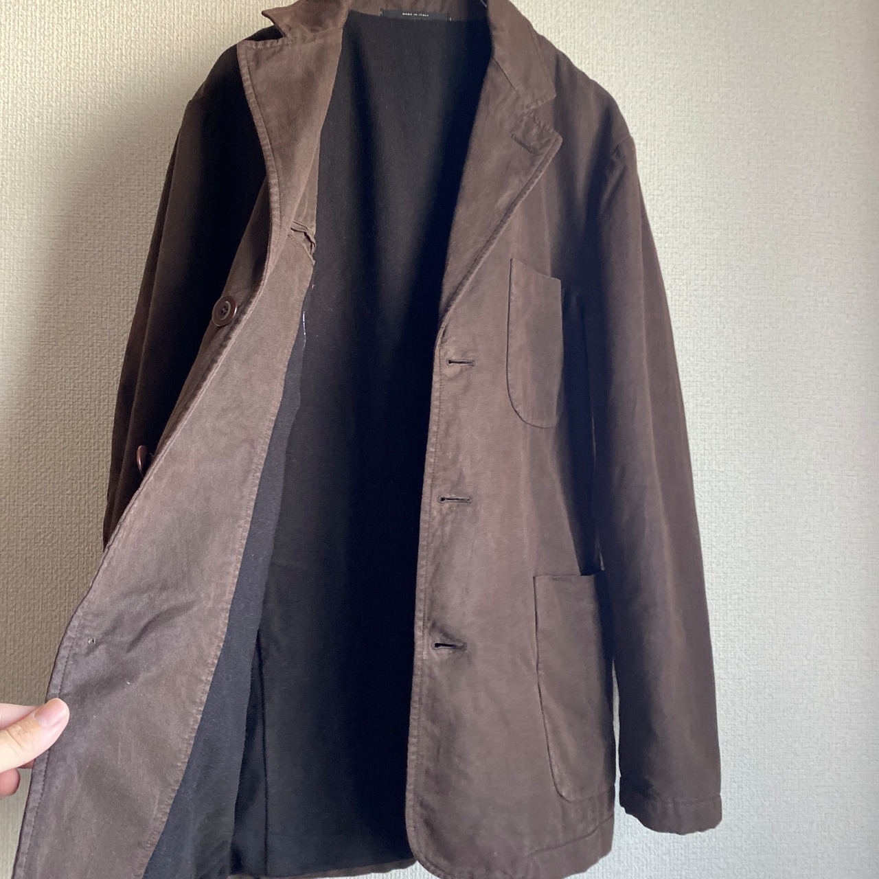 ボディ裏地にはウールカシミヤの裏地がついているので、一枚で着ても暖かく今の時期重宝します。
