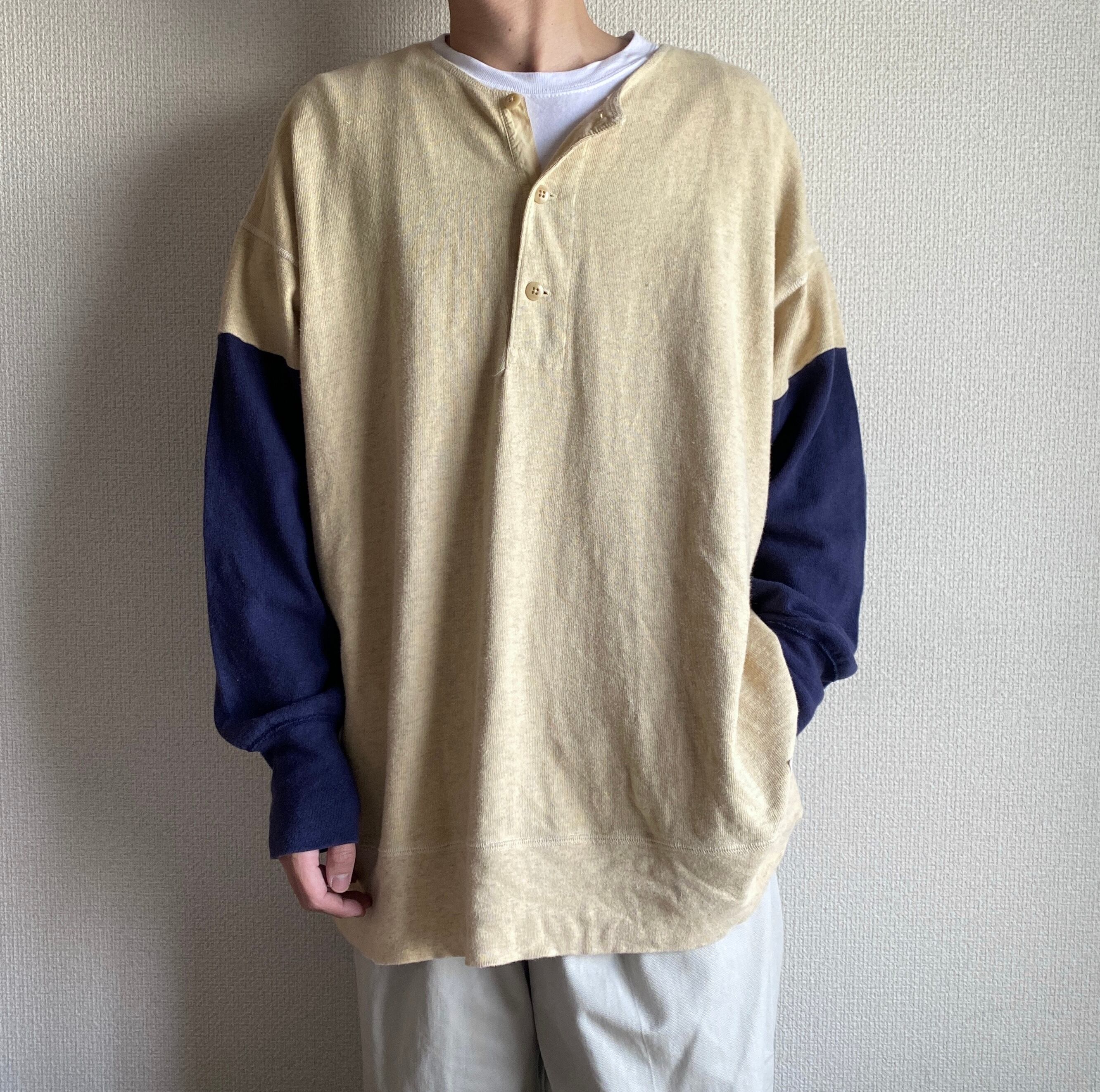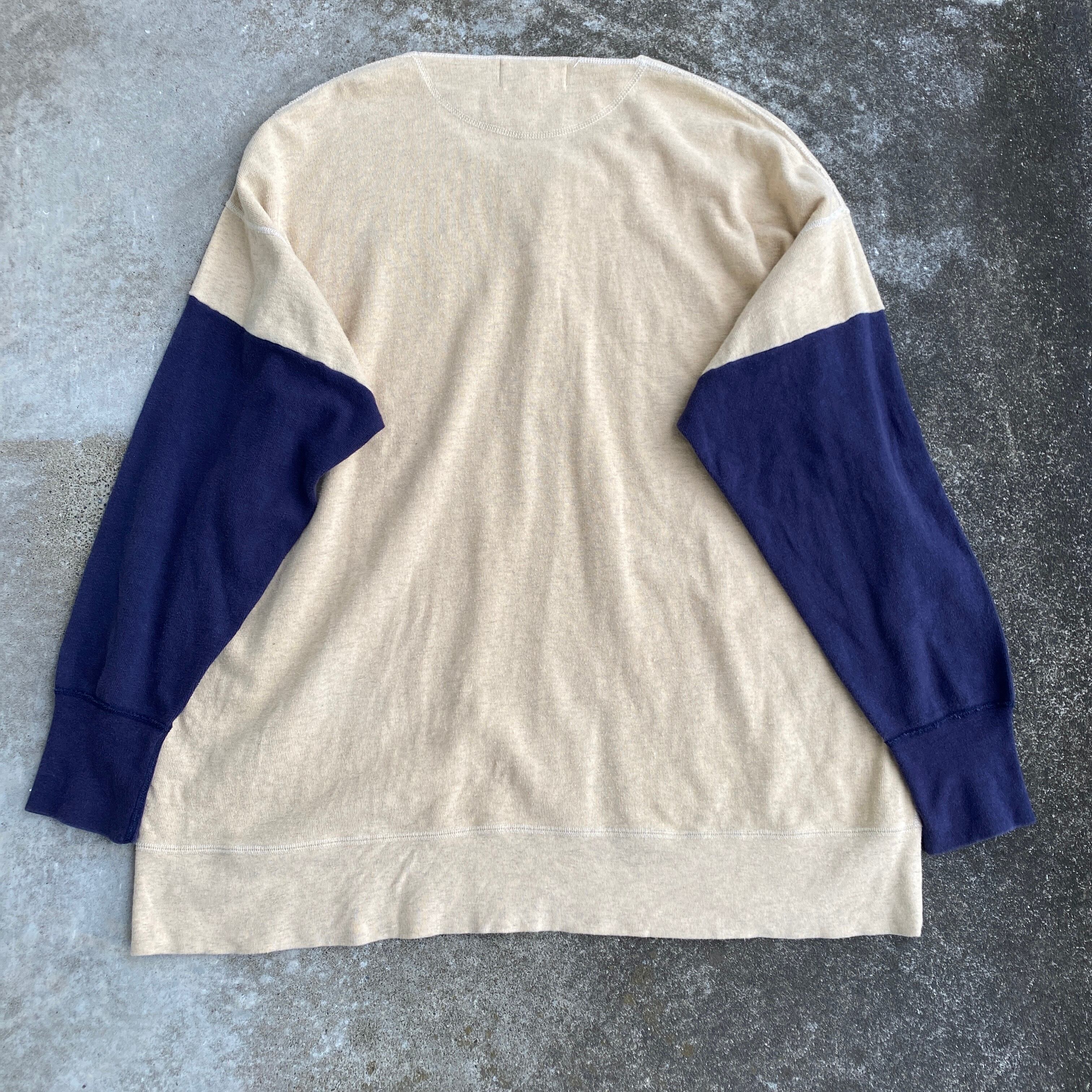 スウェットとカットソーのあいだぐらいのヘビーウェイトな生地に、だらっとした抜け感のあるシルエット、袖の切り替えデザインが非常にかわいい一着。