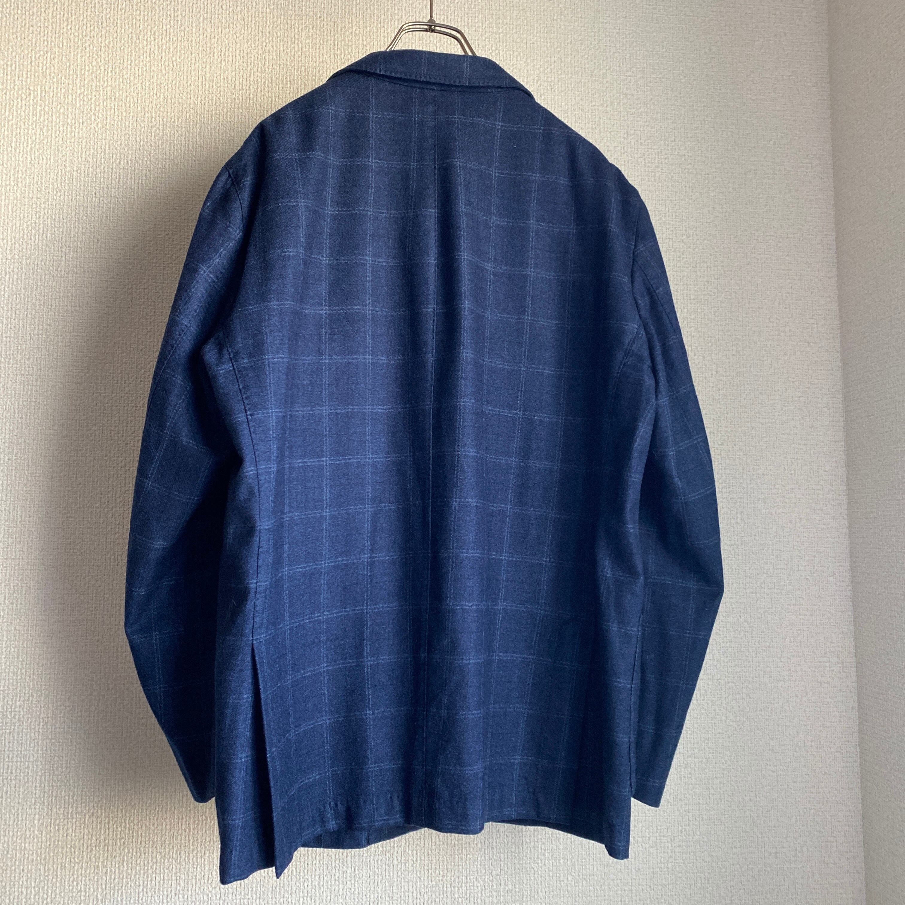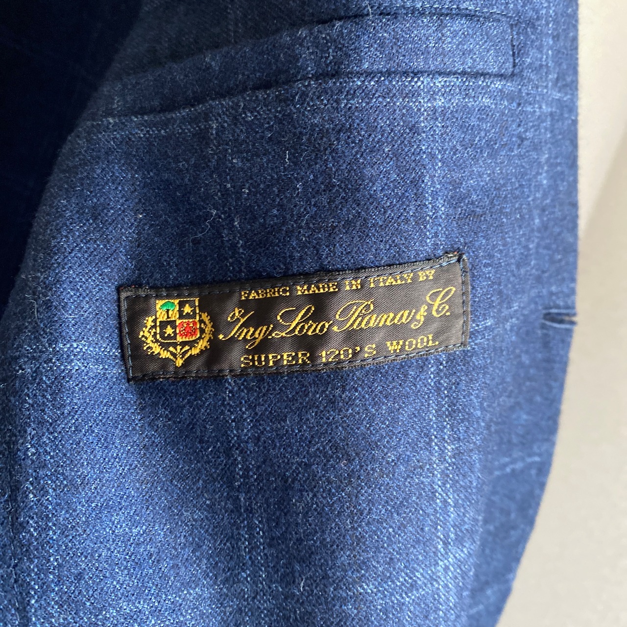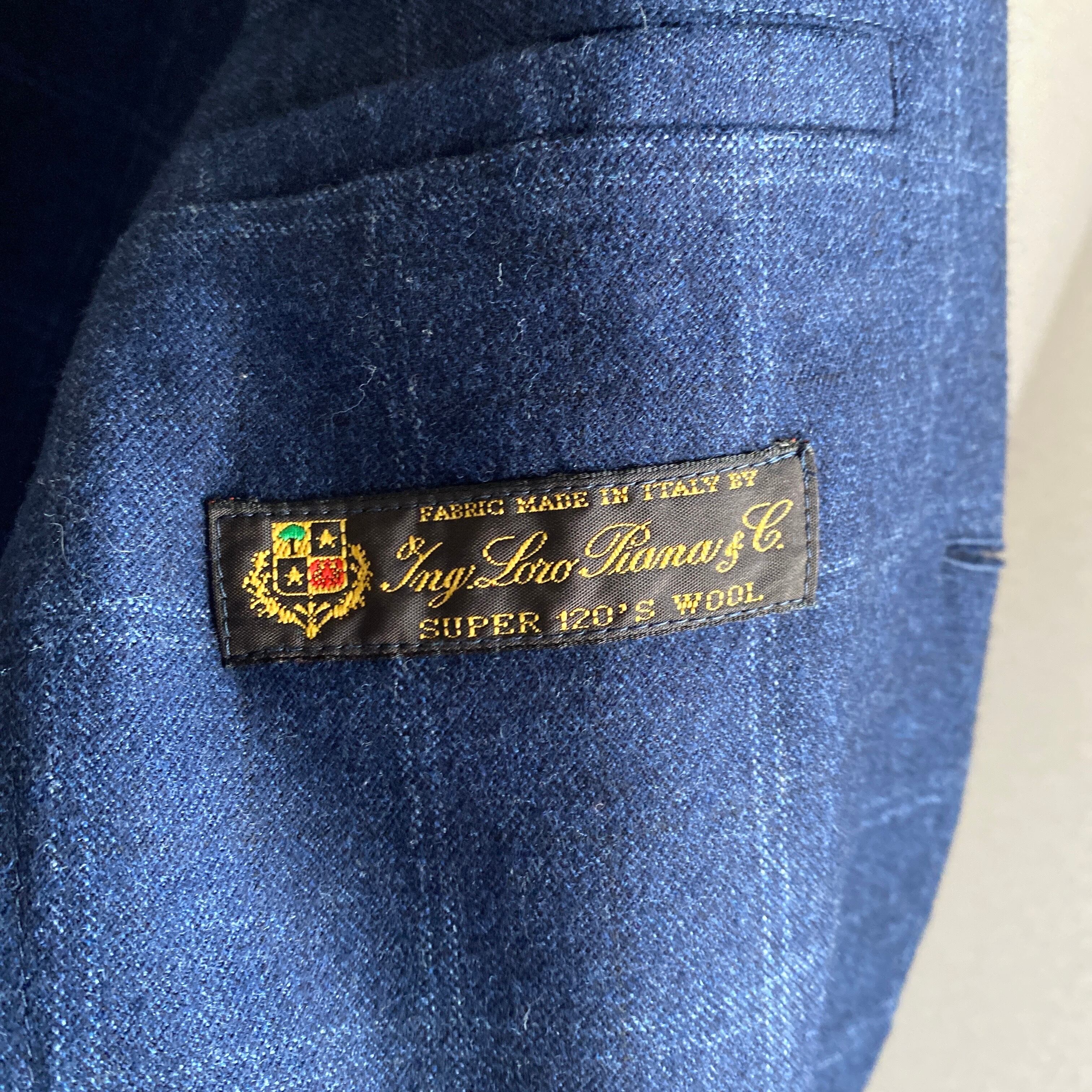 ネイビーベースのウィンドウペンチェックのロロピアーナ生地を使用し、袖裏のみの背抜き、パッドなしのアンコン仕様(肩に薄いキャンバス生地は入ります)で仕立てられた上質な一着。