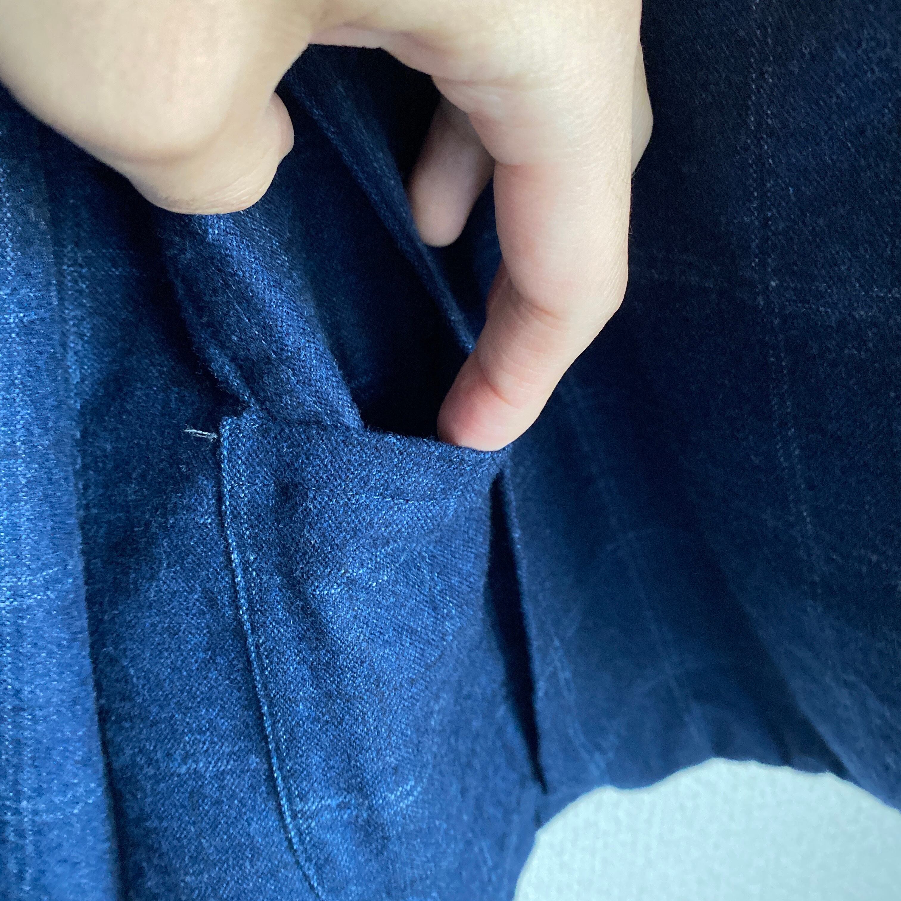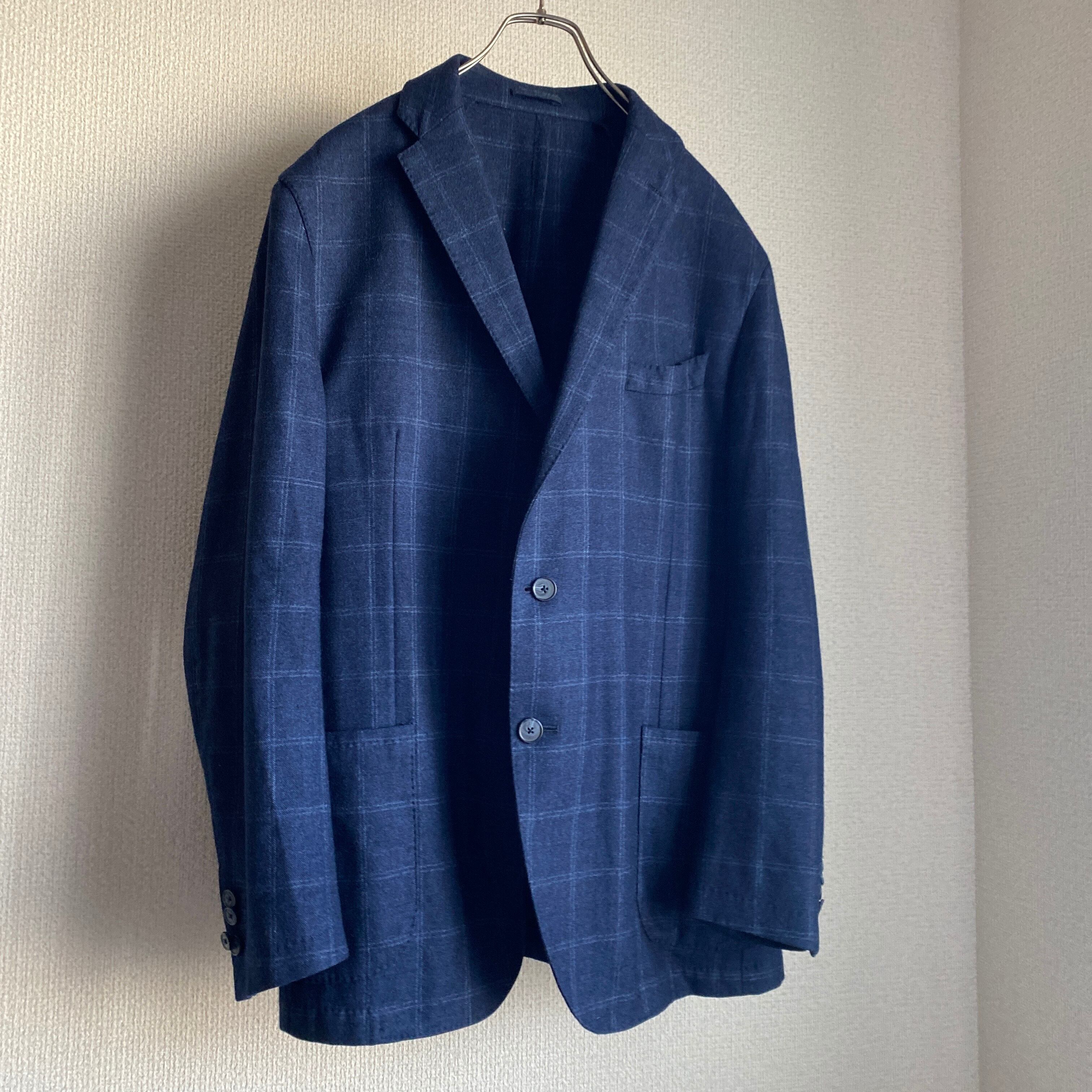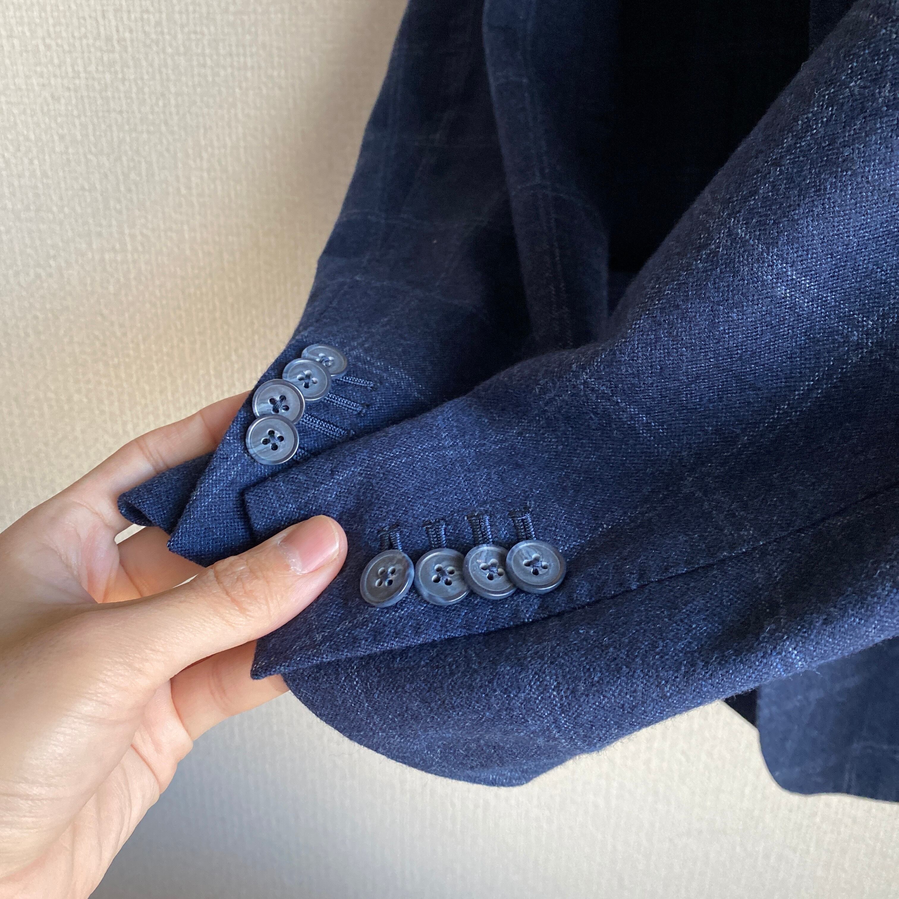 ネイビーベースのウィンドウペンチェックのロロピアーナ生地を使用し、袖裏のみの背抜き、パッドなしのアンコン仕様(肩に薄いキャンバス生地は入ります)で仕立てられた上質な一着。