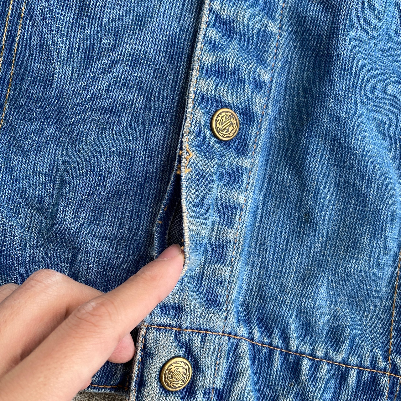 程よく肉厚で、雰囲気の良い色落ち具合のデニム生地に、たっぷりとした身幅に対して長すぎない着丈の良いバランスのシルエットが非常に格好良い一着。(176 68の私で中にヘビーオンスのスウェットを挟んで前が閉められます。)
