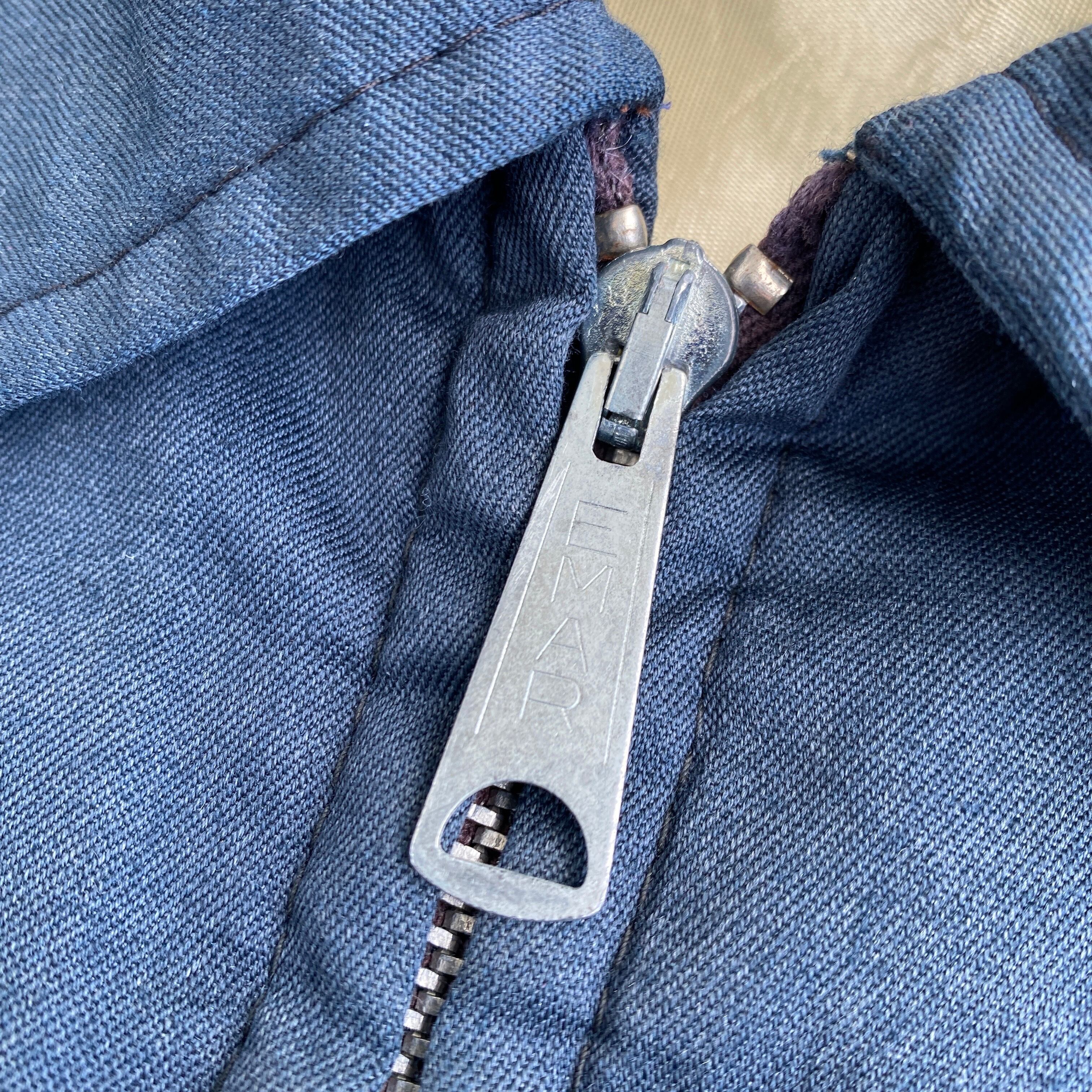 民間のデッキジャケットなどでよく見かけるEMARのアルミデカジップに、良い感じに色褪せたネイビーブルーの色目、ゆったりとした身幅に対して短め丈の無骨なバランスのシルエットが非常に格好良い一着。