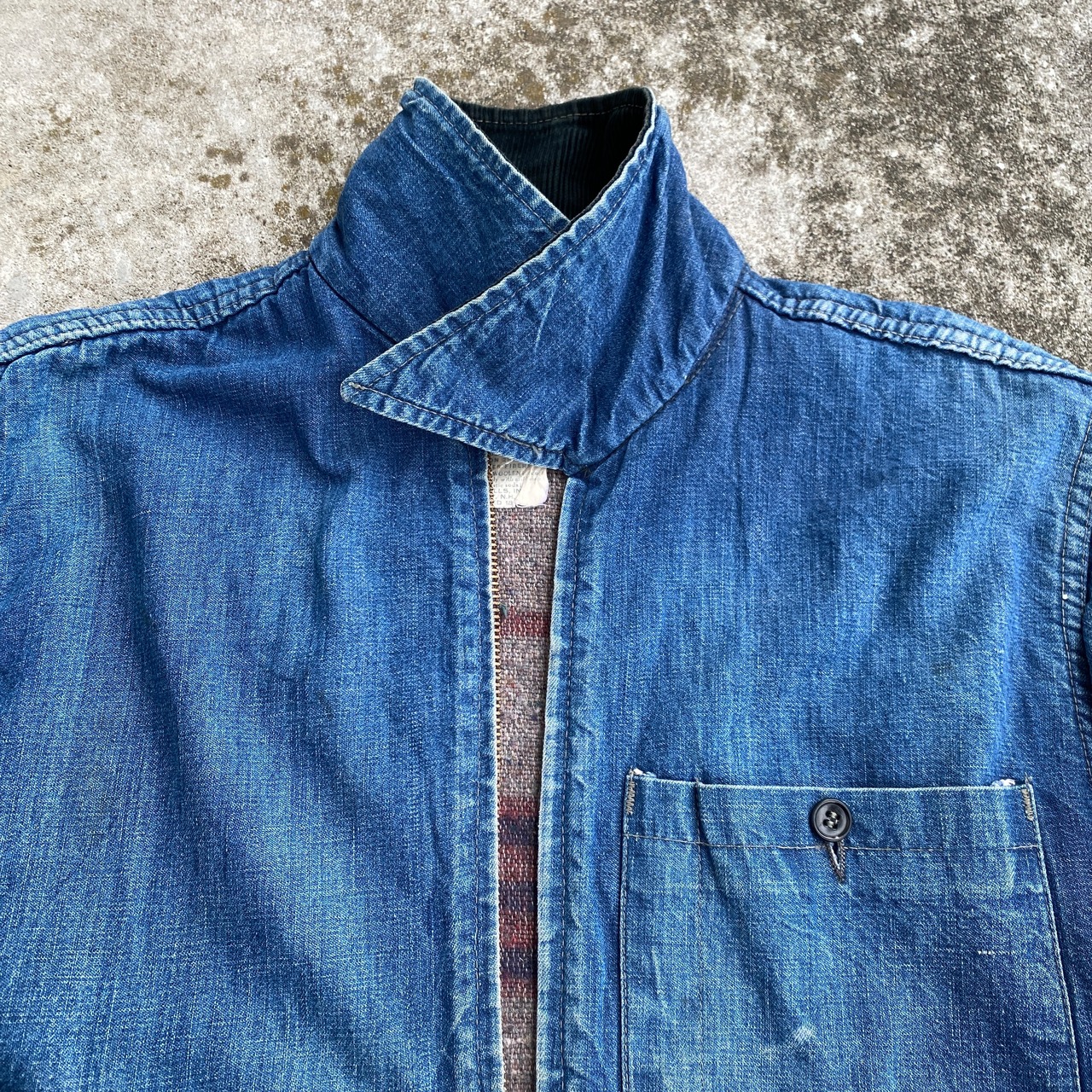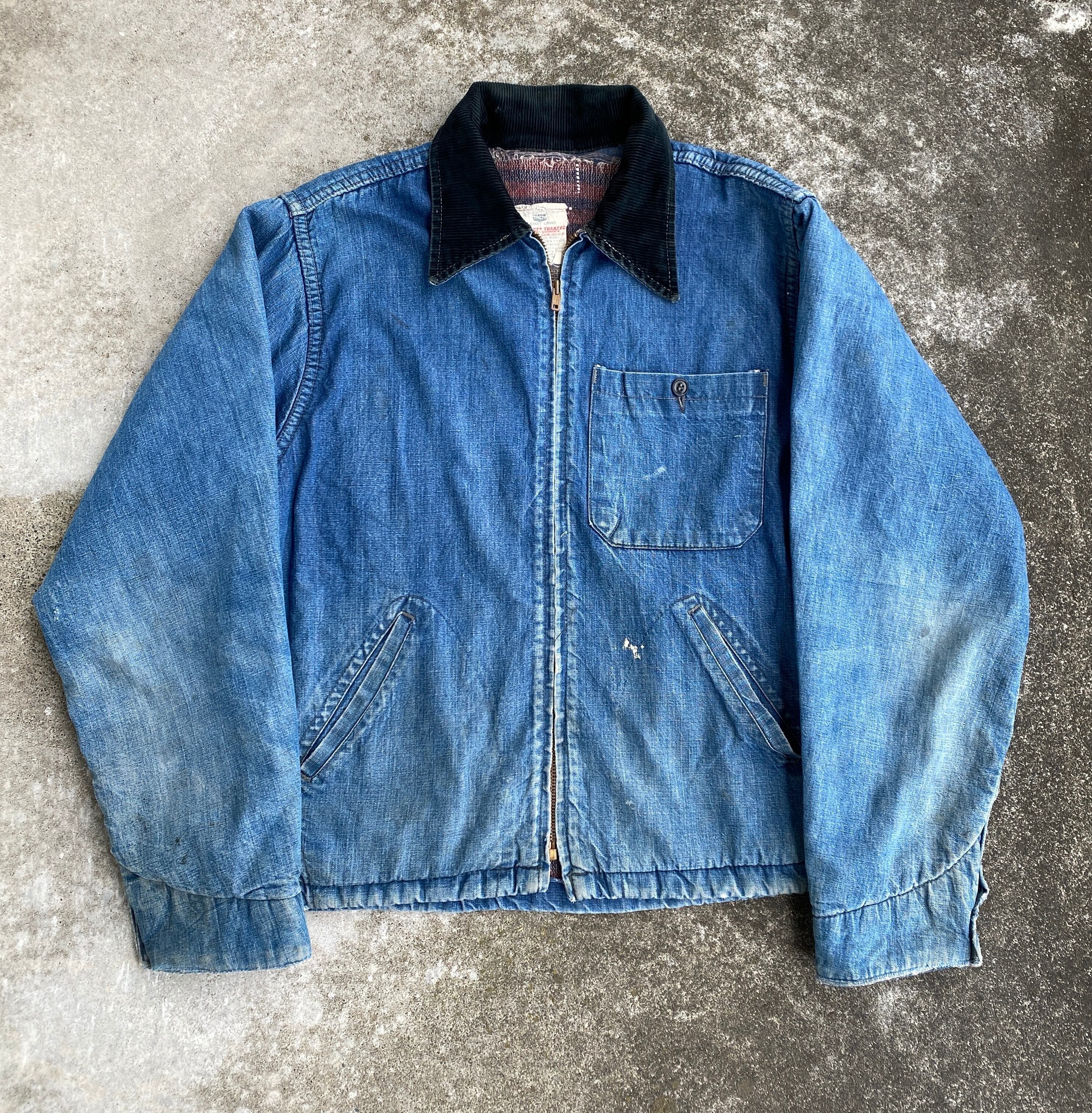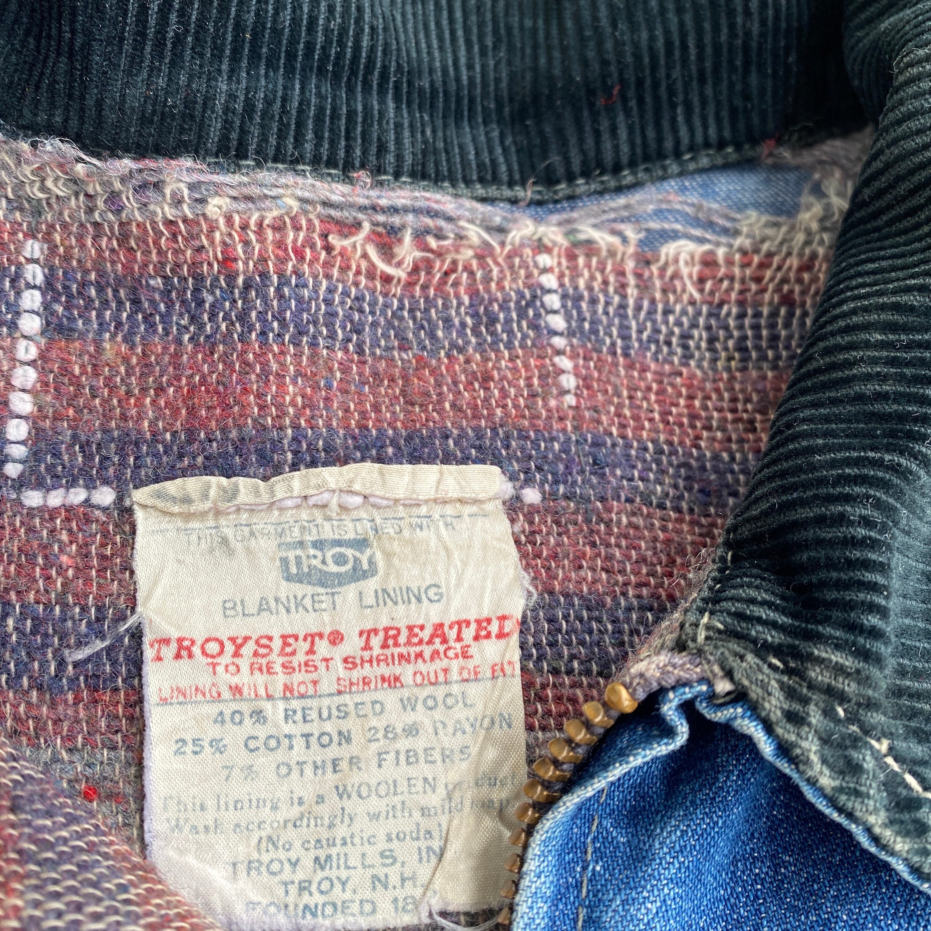 古い年代のデニム生地特有の、縦落ちが出まくった素晴らしい雰囲気のボディに、襟のコーデュロイ切り替え、Levi'sなどでも使用されていたTROY社のブランケットライニング、真鍮のTALONジップなど、ヴィンテージの良いところ満載で抜群に格好良い一着。