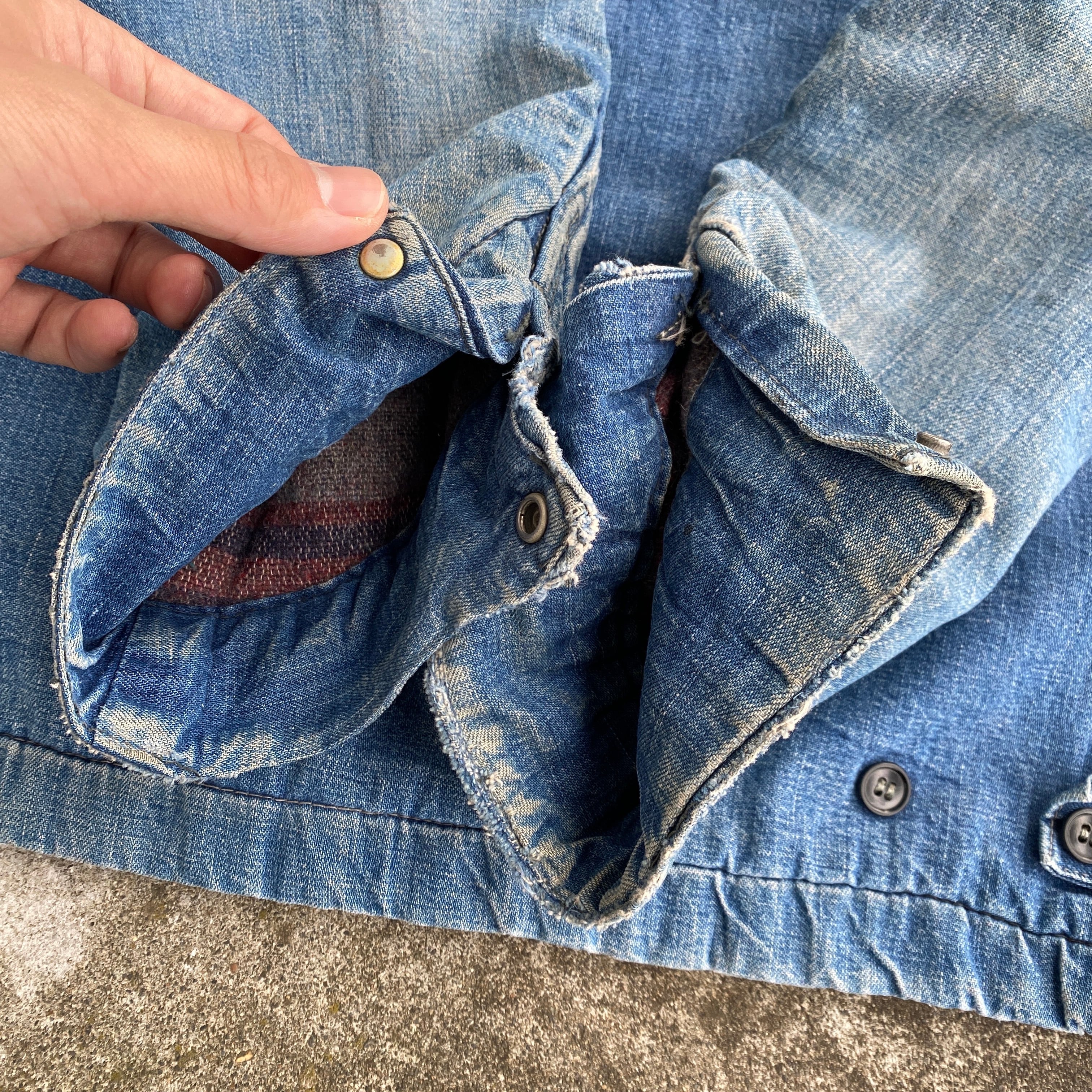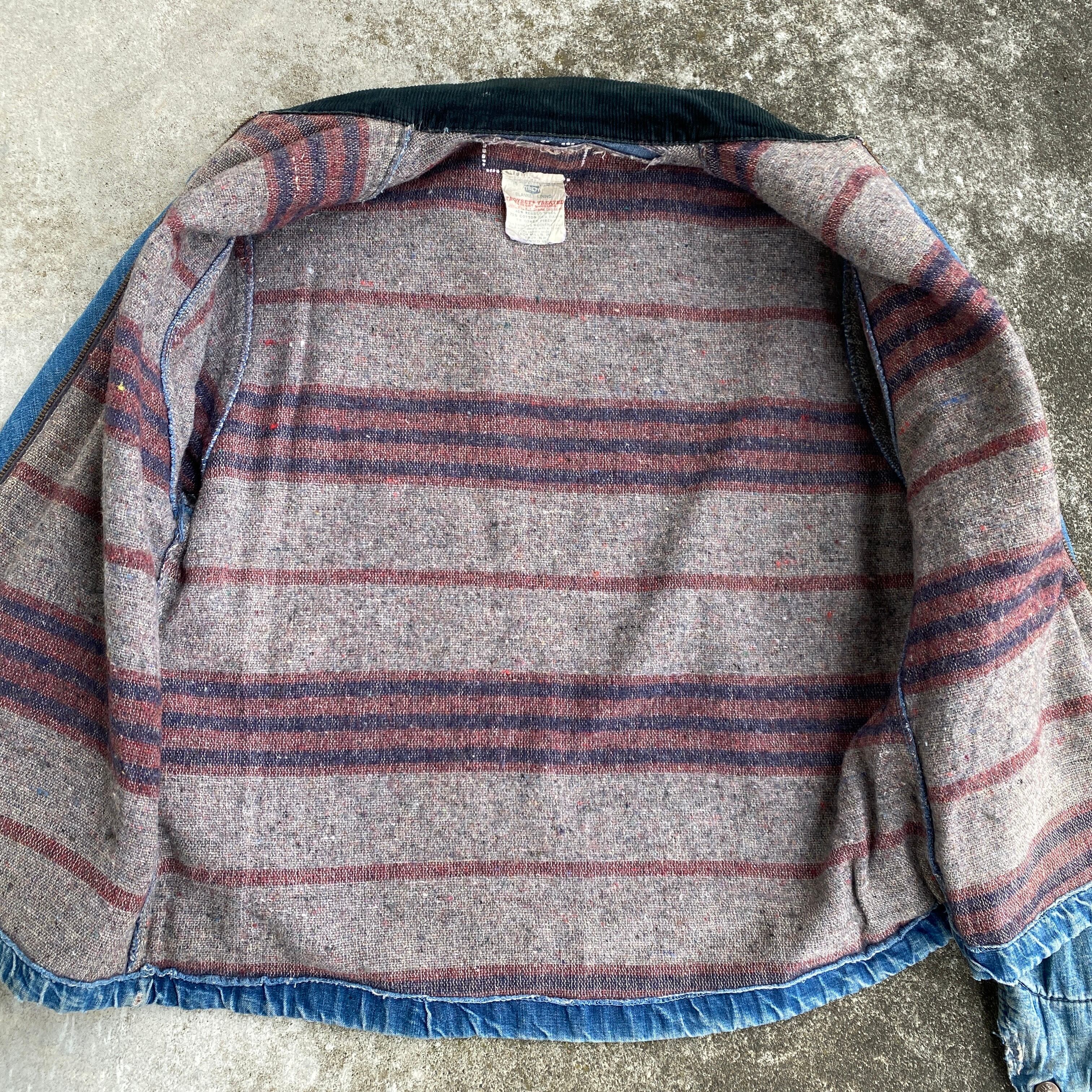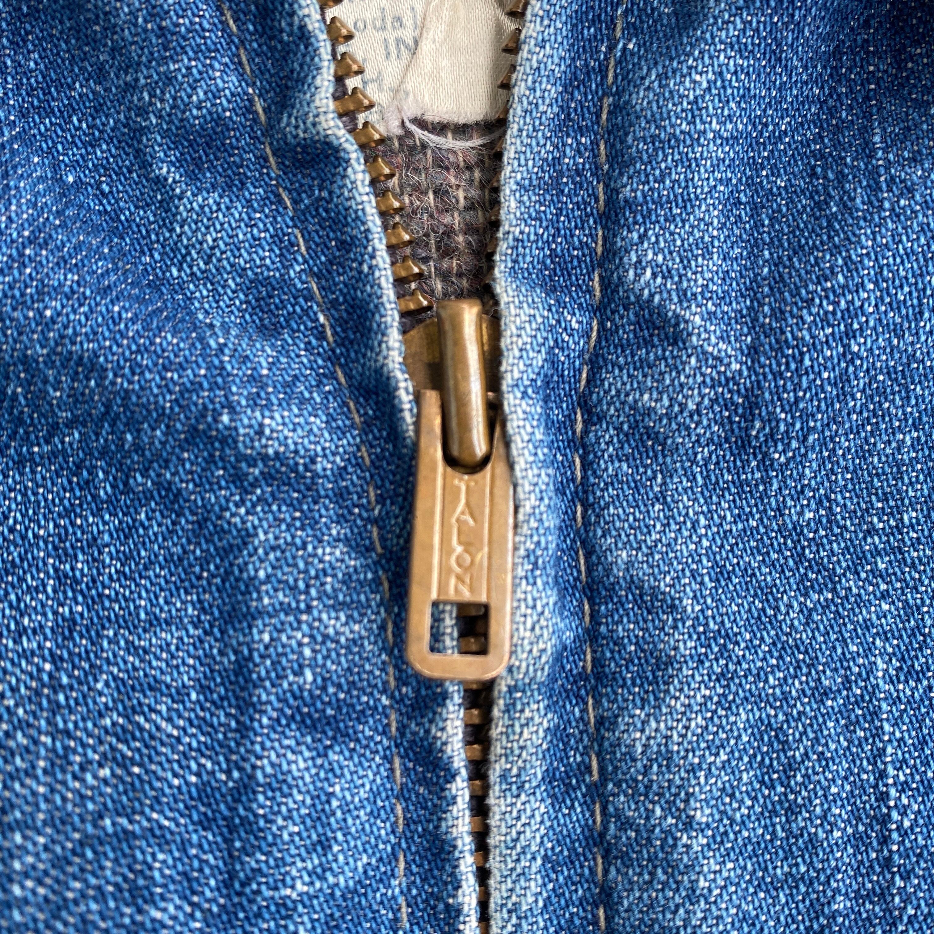 古い年代のデニム生地特有の、縦落ちが出まくった素晴らしい雰囲気のボディに、襟のコーデュロイ切り替え、Levi'sなどでも使用されていたTROY社のブランケットライニング、真鍮のTALONジップなど、ヴィンテージの良いところ満載で抜群に格好良い一着。