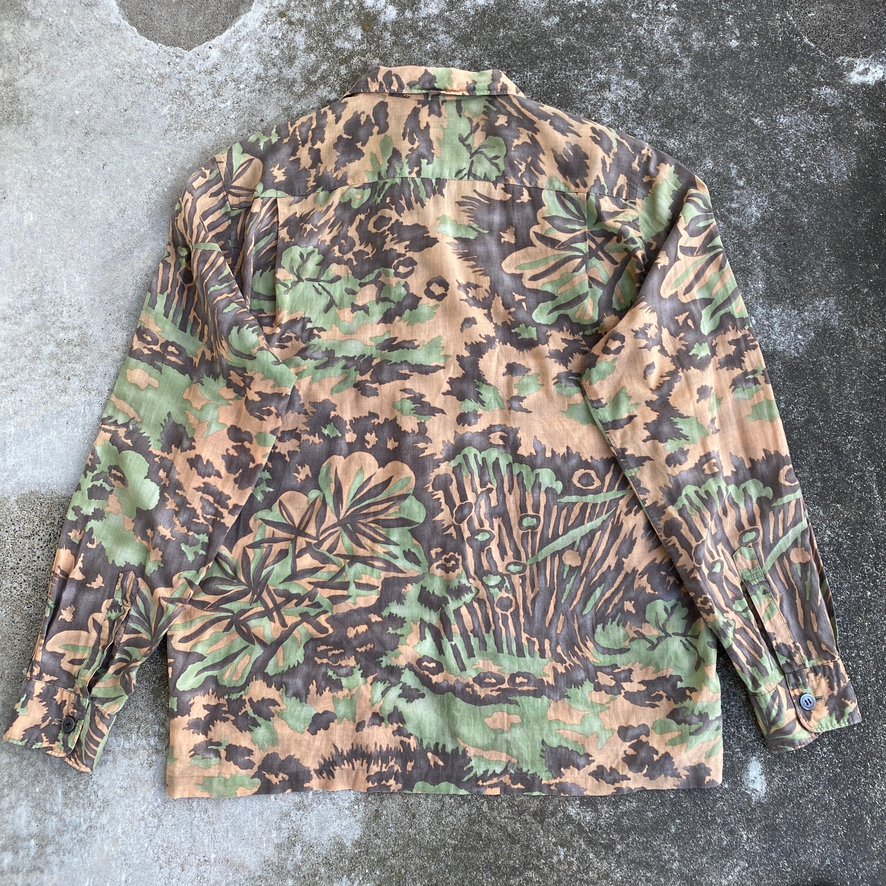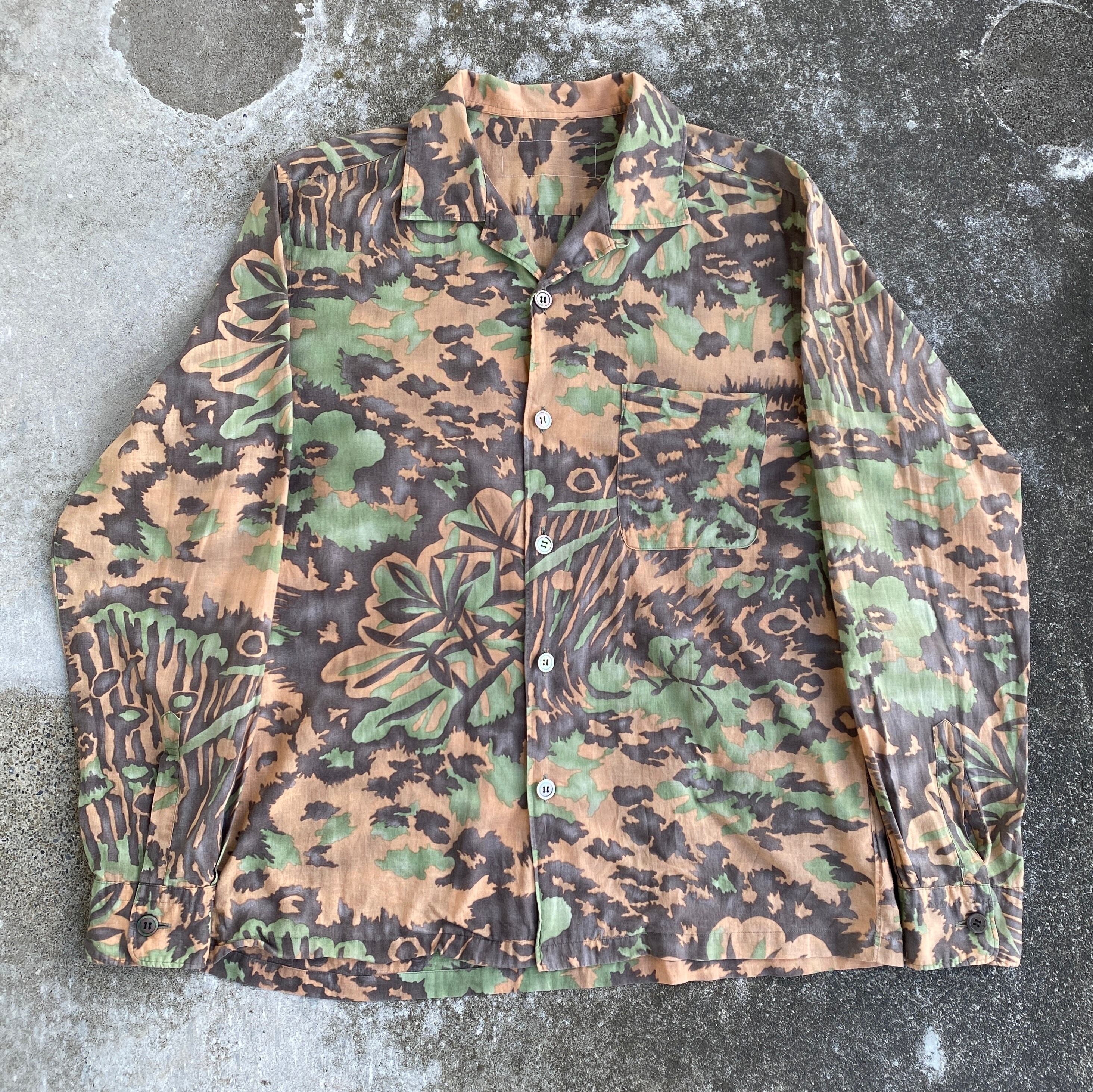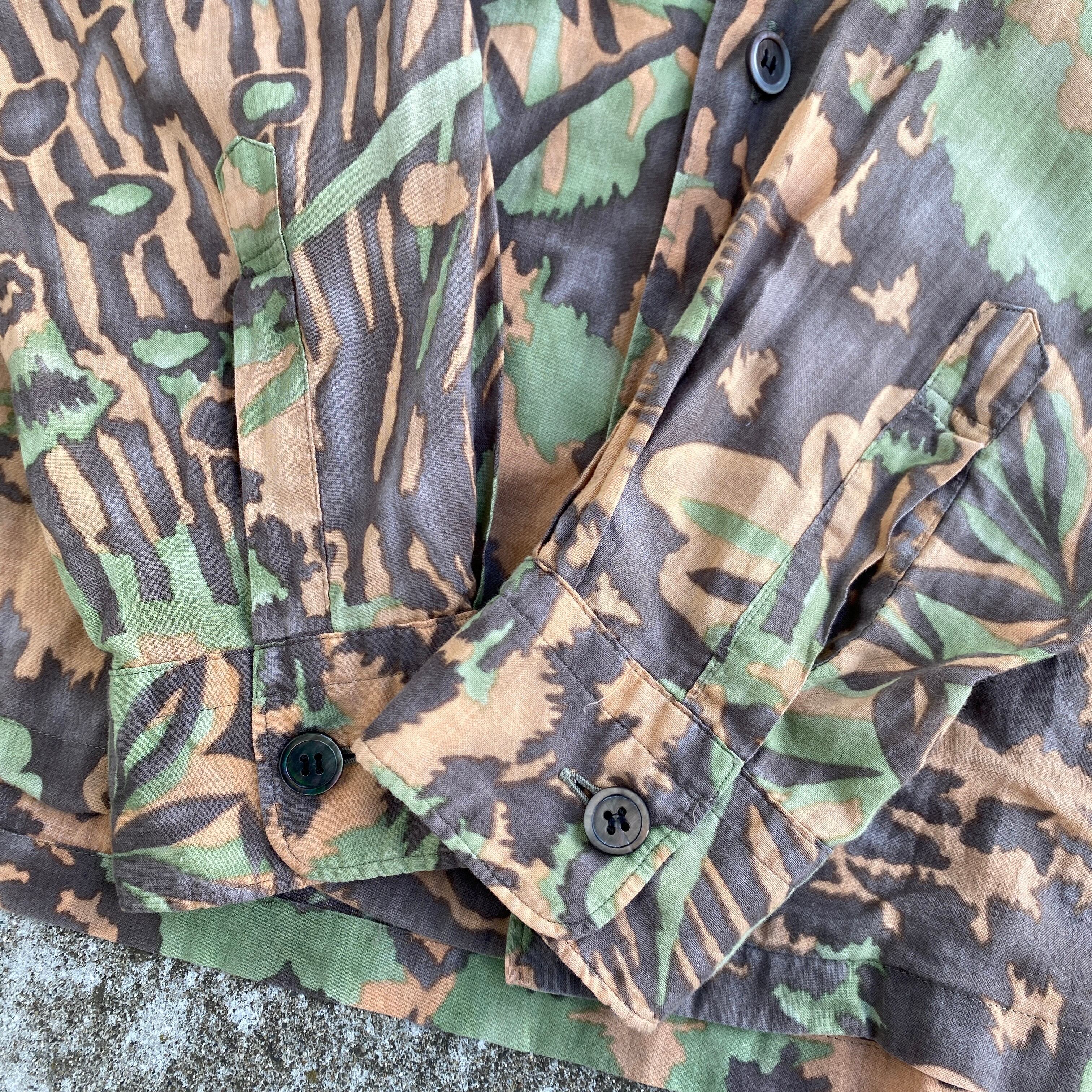 顔料プリントされた迷彩のようなボタニカルプリント、ボックスシルエットのシンプルなオープンカラーが格好良い一着。