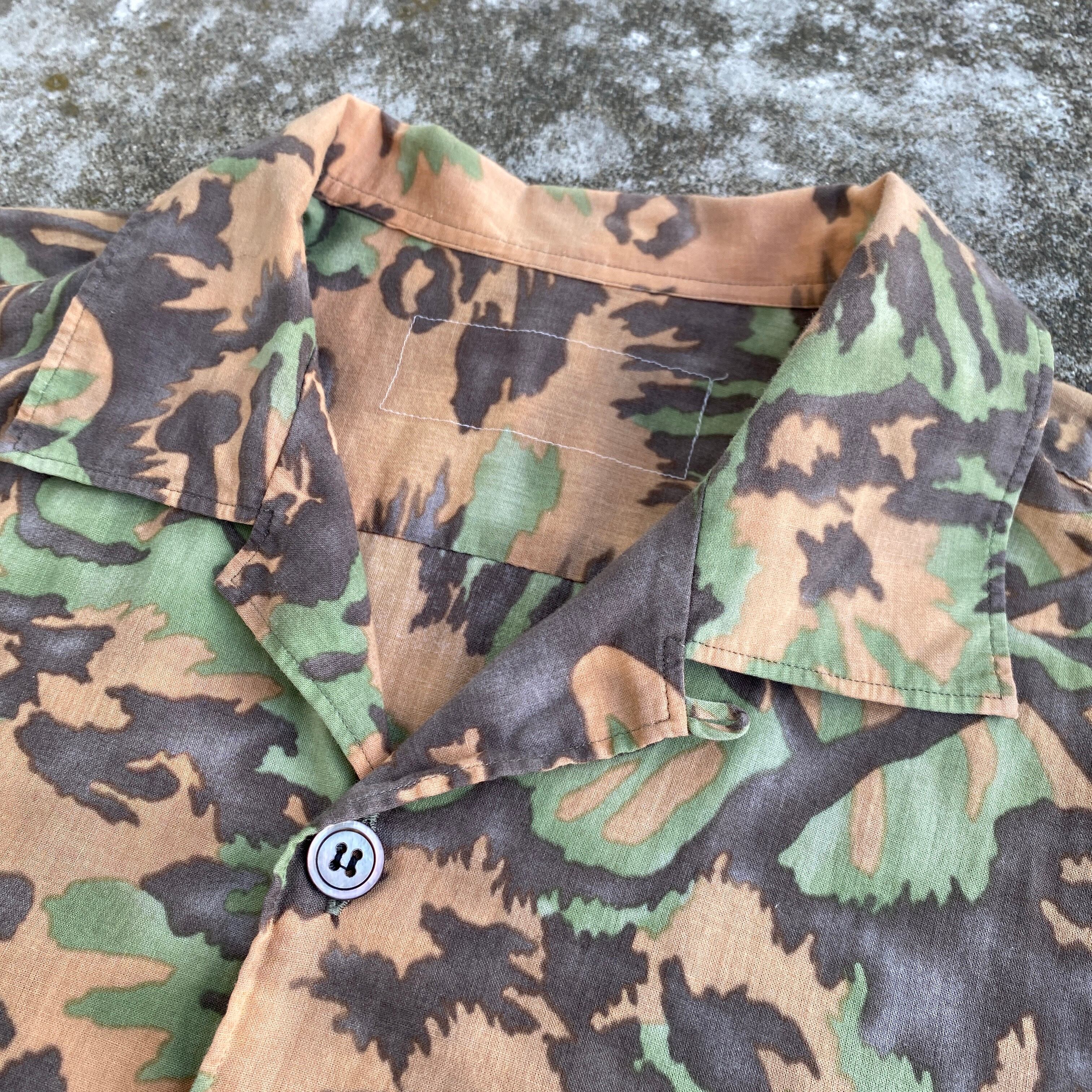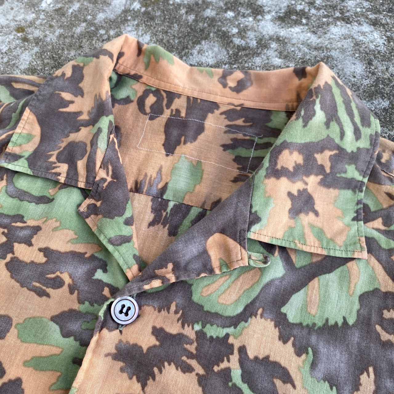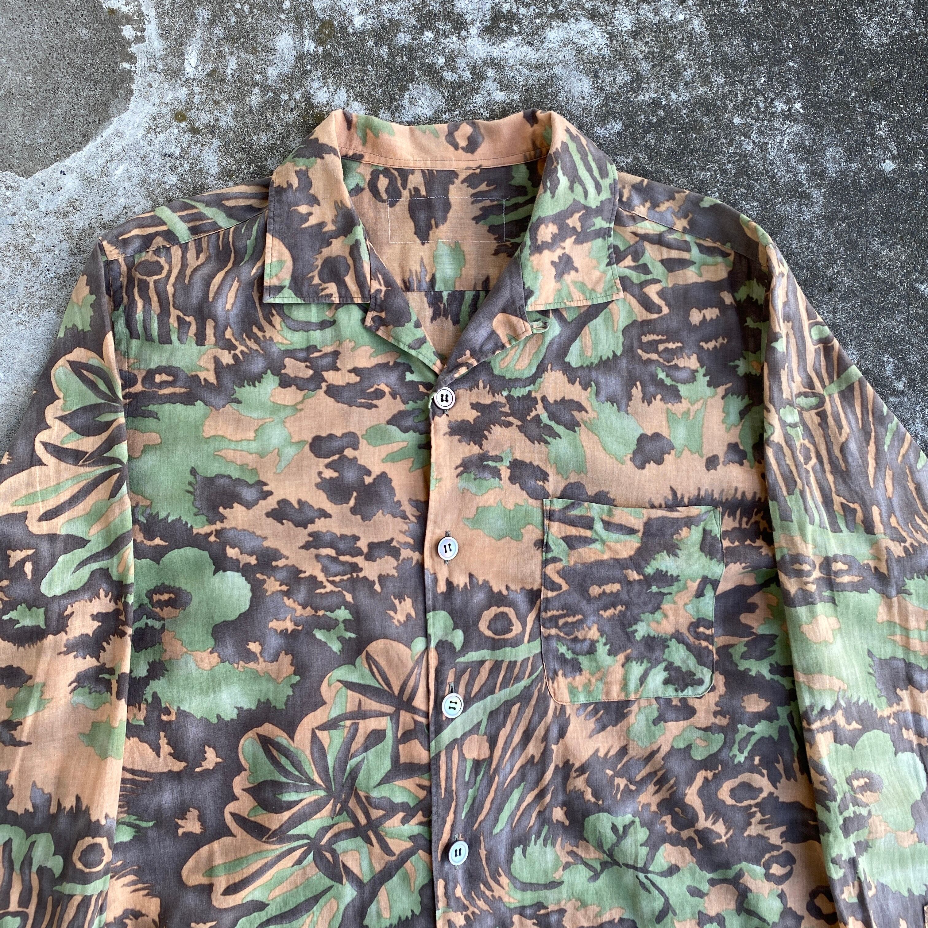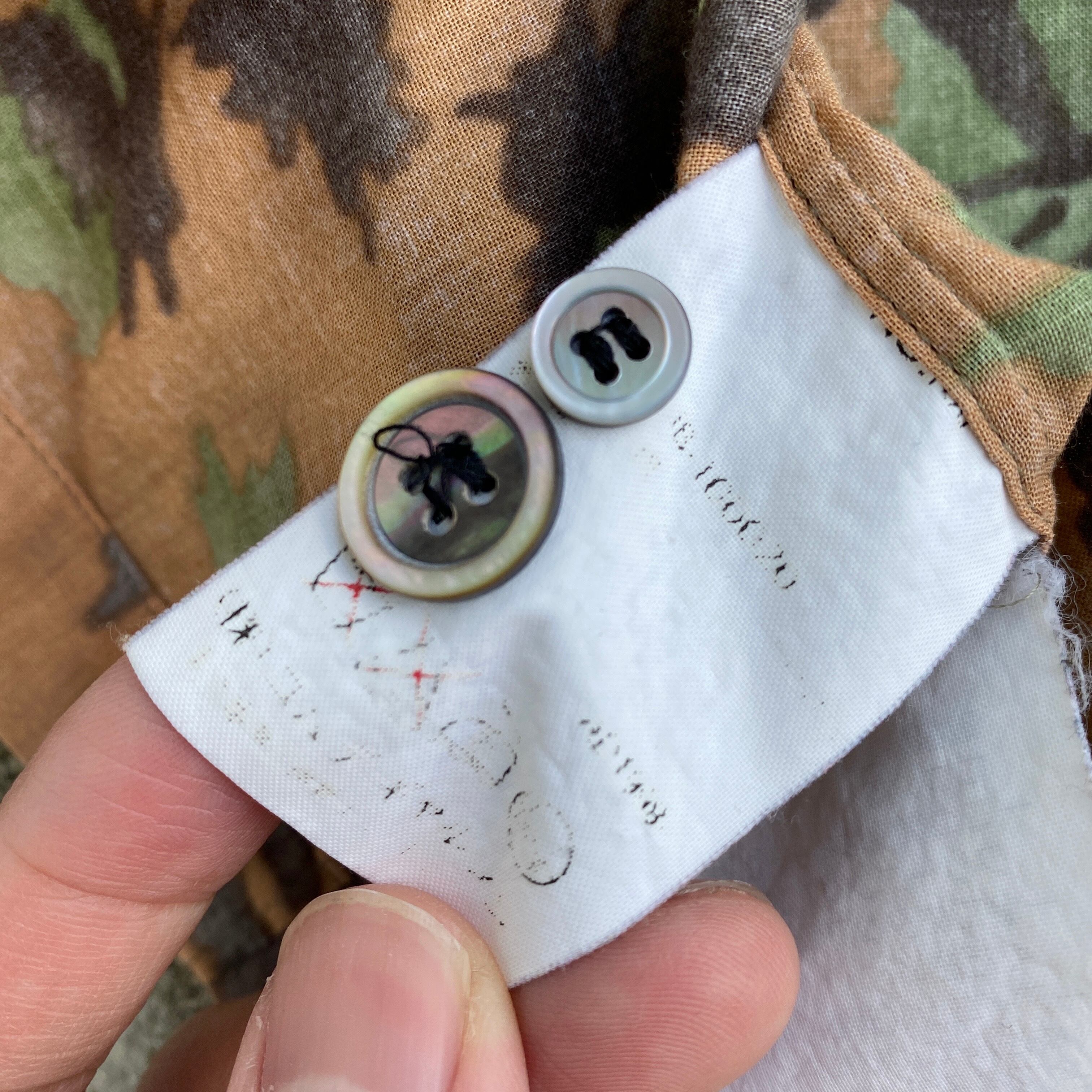 顔料プリントされた迷彩のようなボタニカルプリント、ボックスシルエットのシンプルなオープンカラーが格好良い一着。