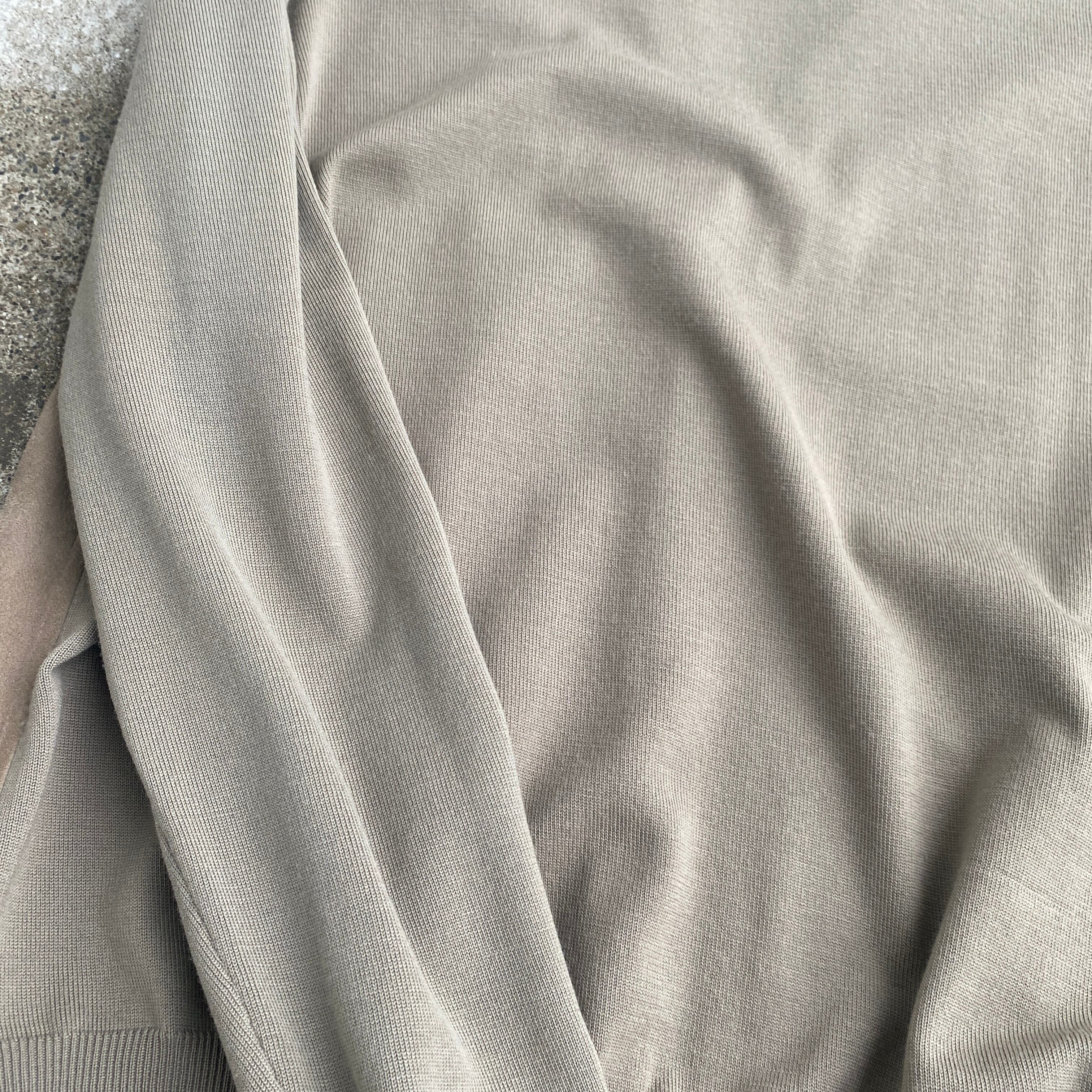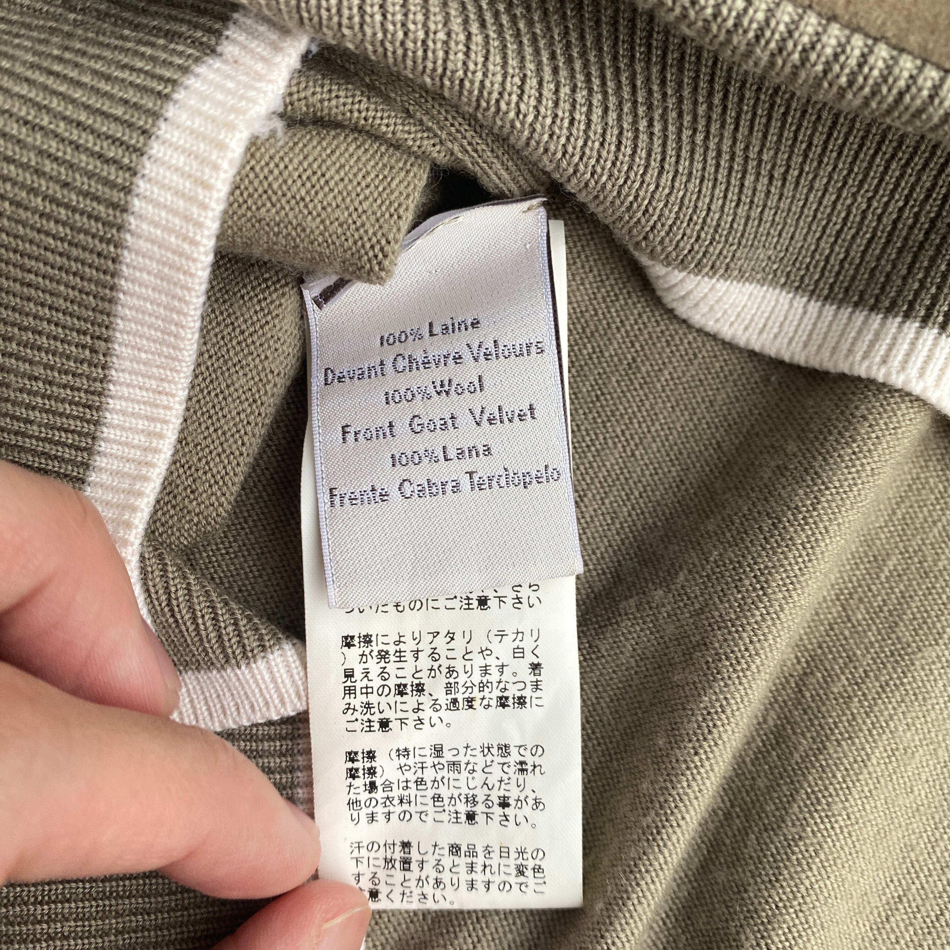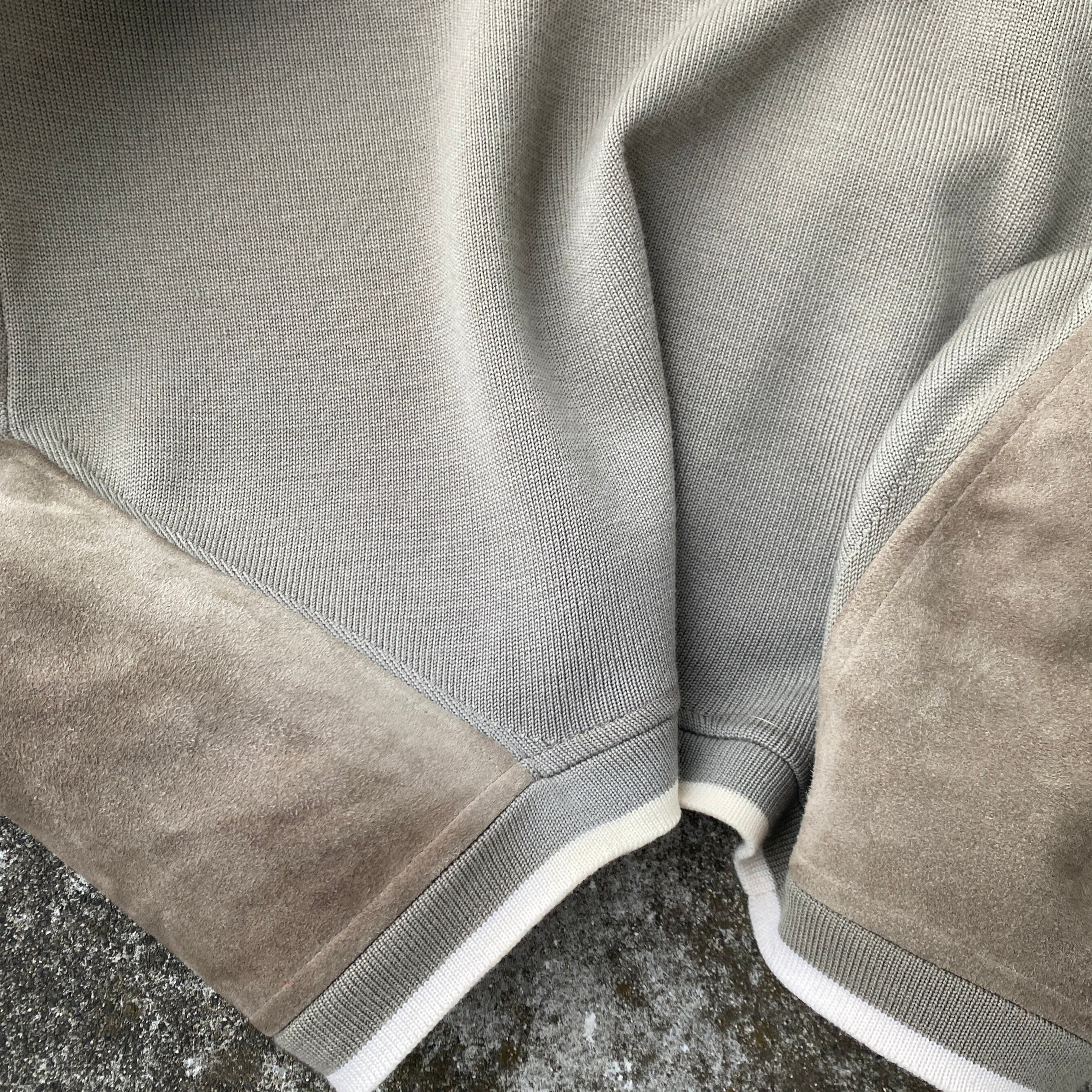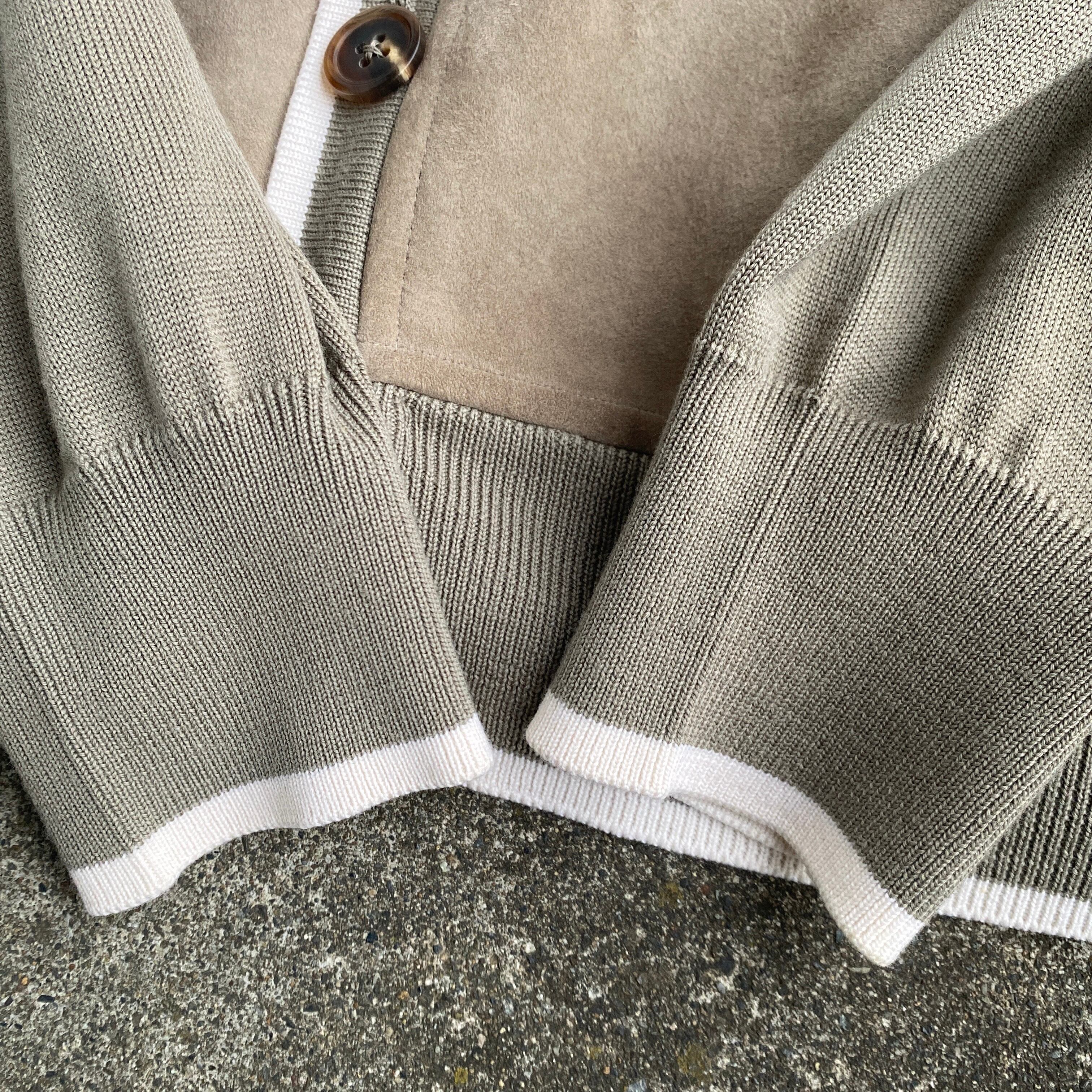 ベージュ(画像2がちかいです)を基調とした美しい配色、上質なハイゲージメリノニット、スエードの質感が素晴らしい一着。