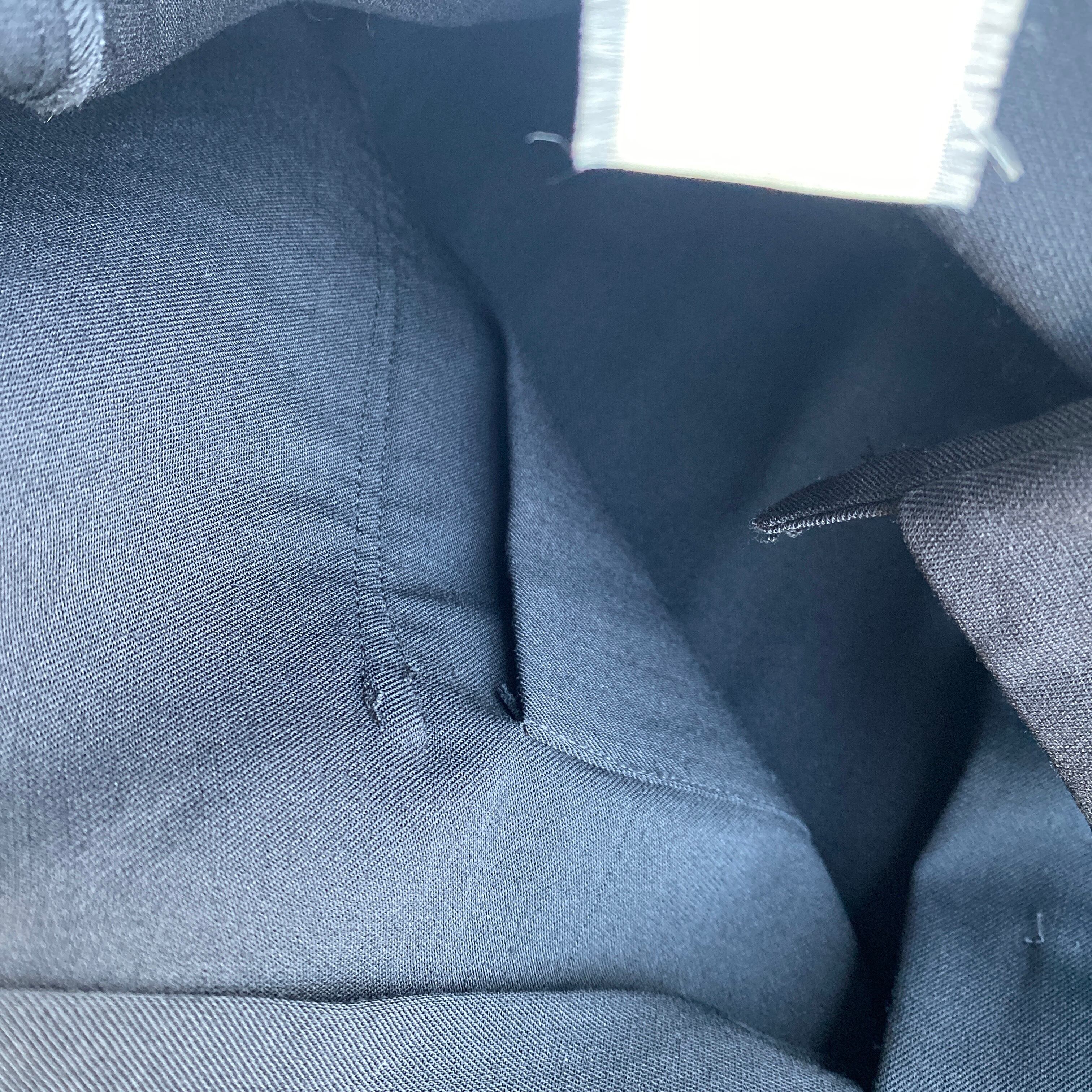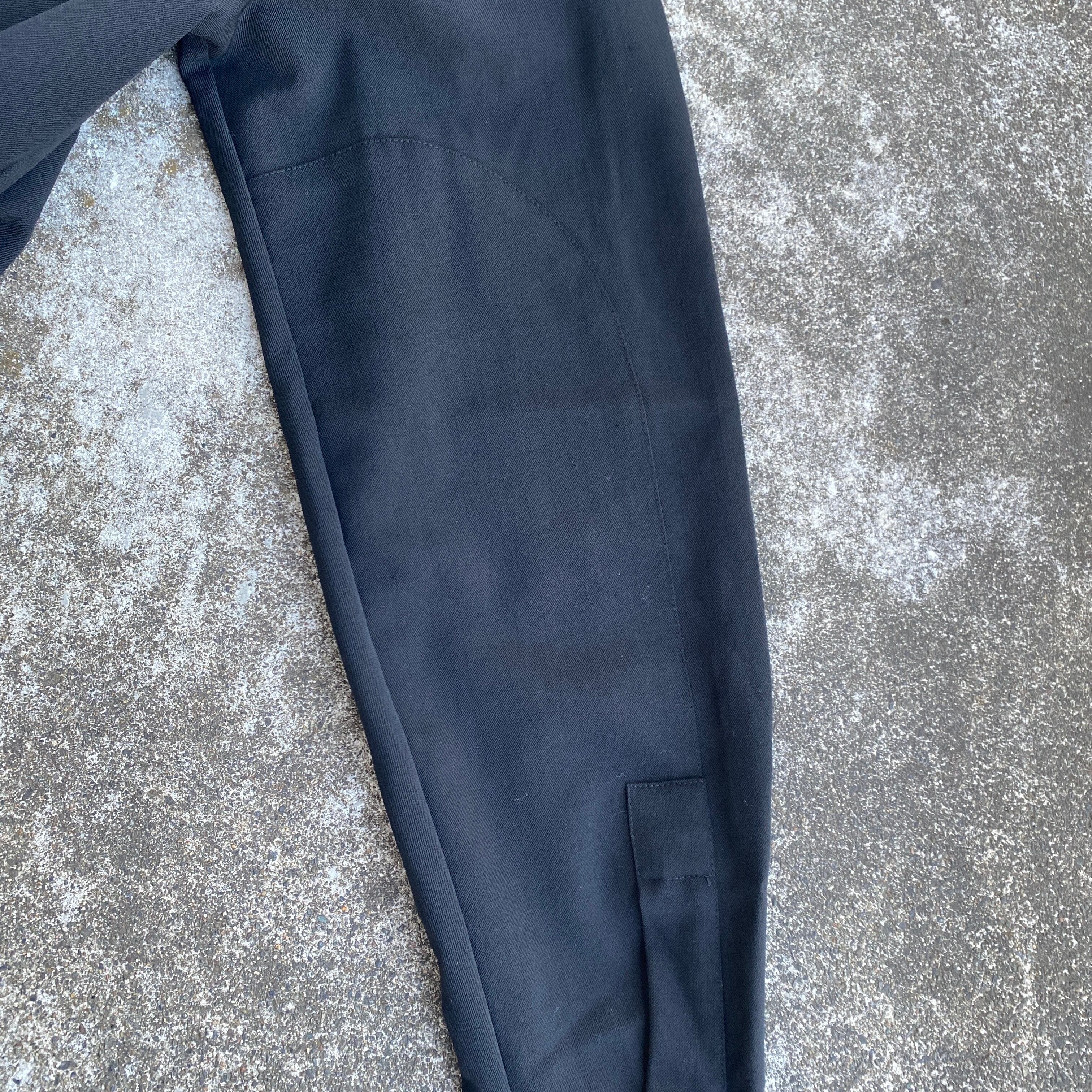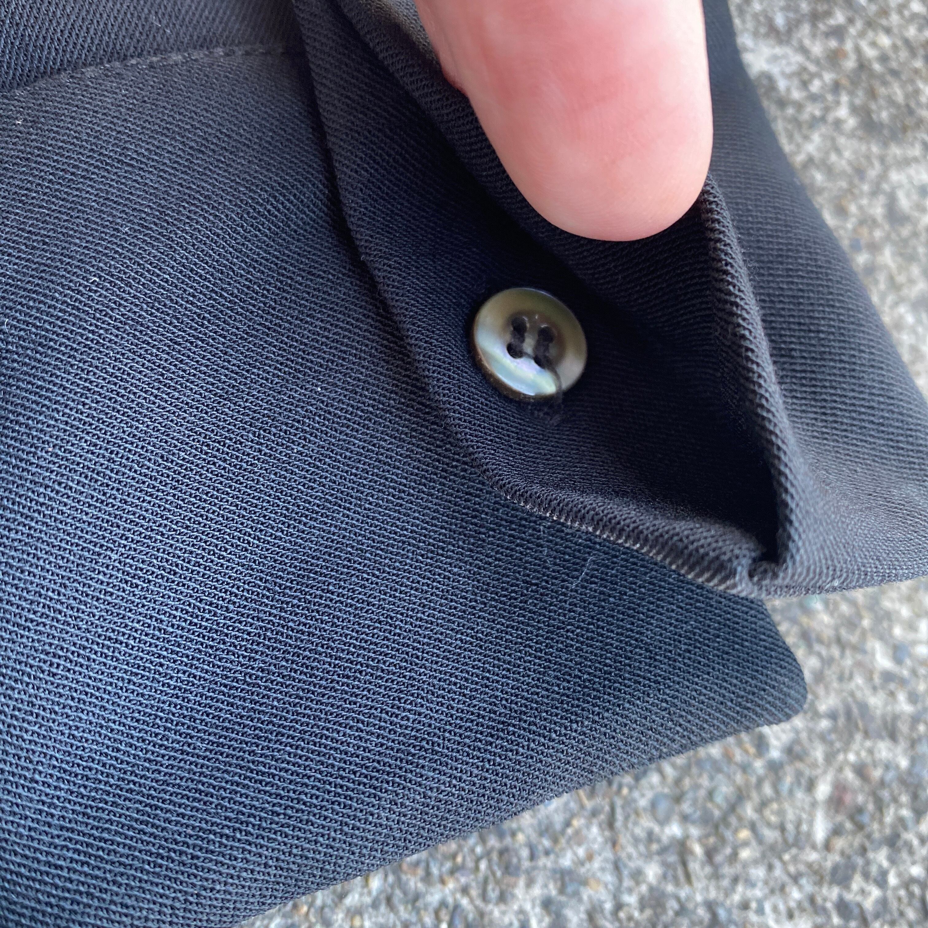 滑らかで落ち感のある上質なブラックウールギャバ(表記は消えていますが経験上間違いないかと)を使用し、フライフロント仕様のミニマルなデザインに仕立てられた非常に格好良い一着。