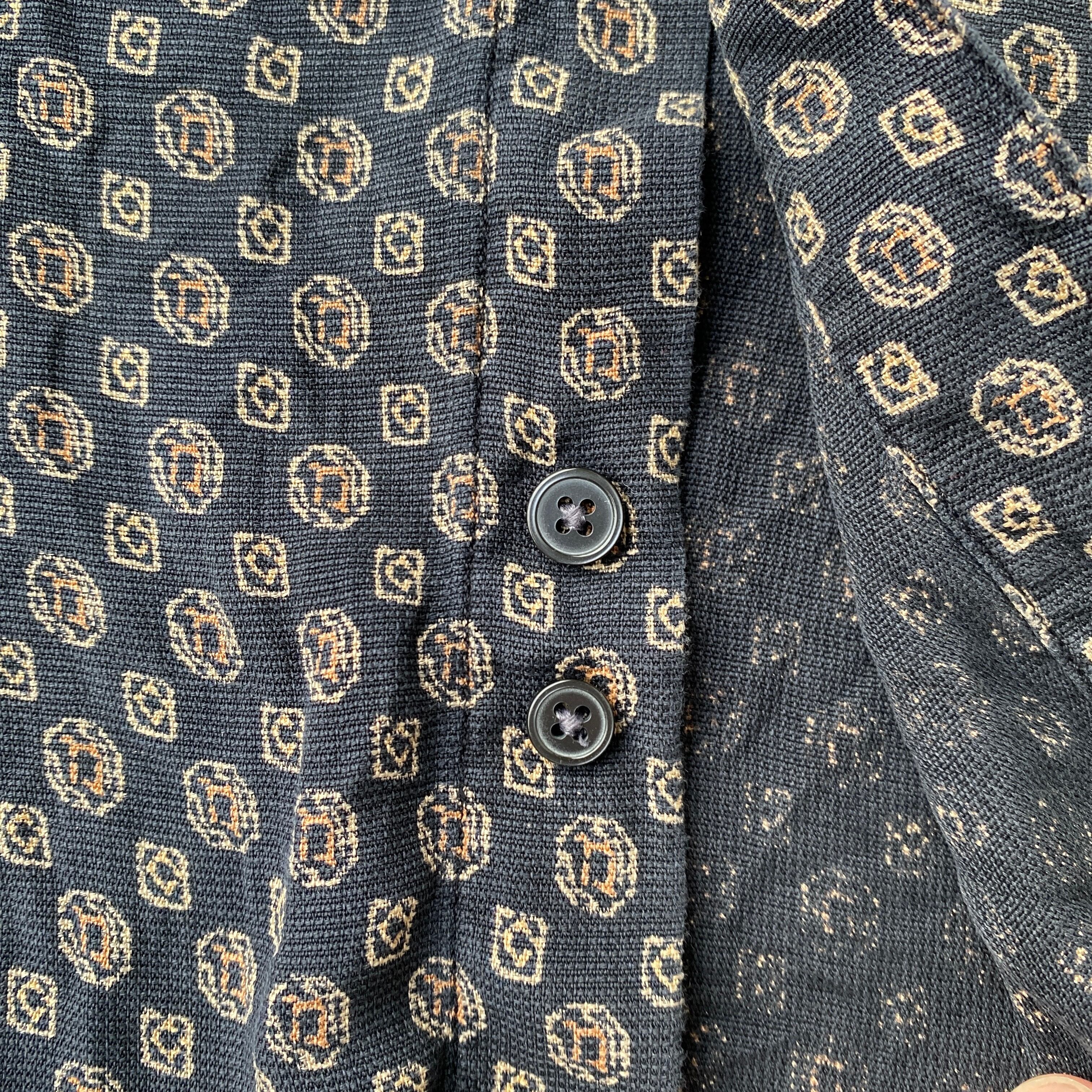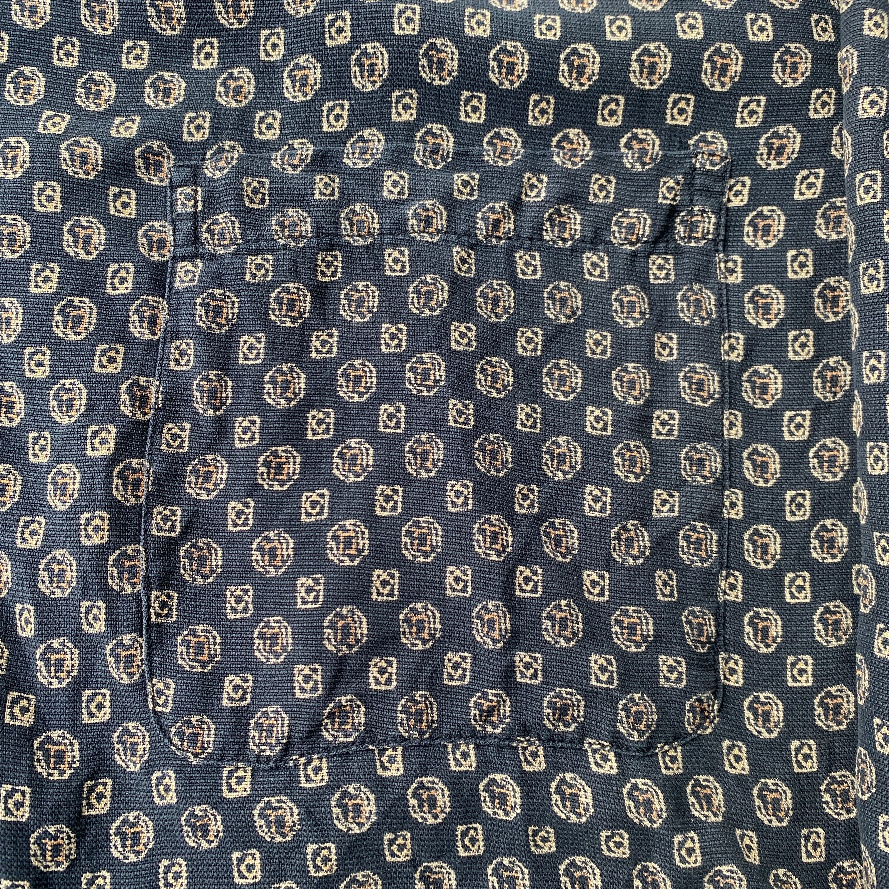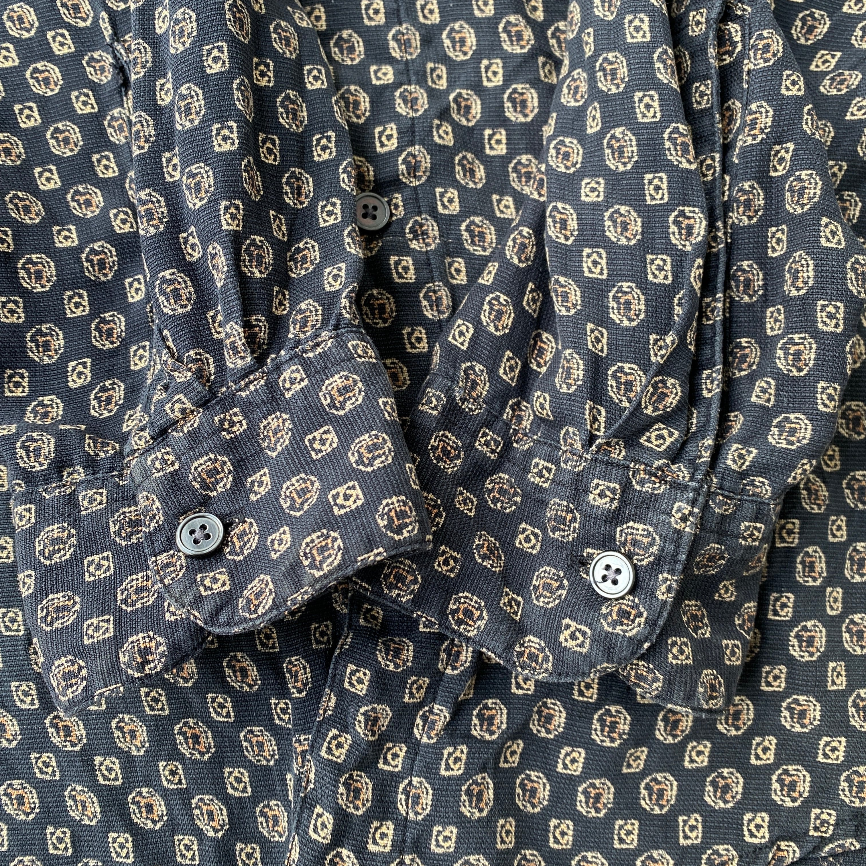 ブラックをベースとした小紋の総柄パターン、やや肉厚で落ち感のあるシルク生地、90sらしいゆったりとしたシルエットが非常に格好良い一着。