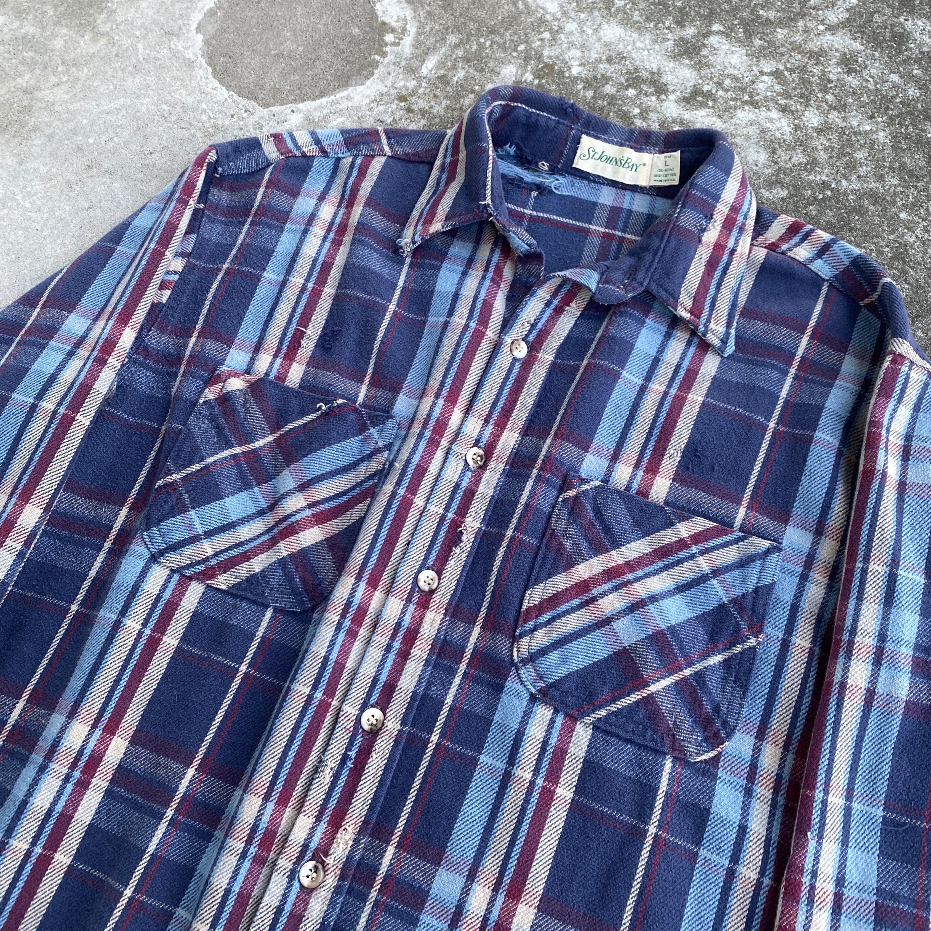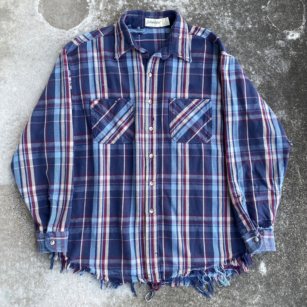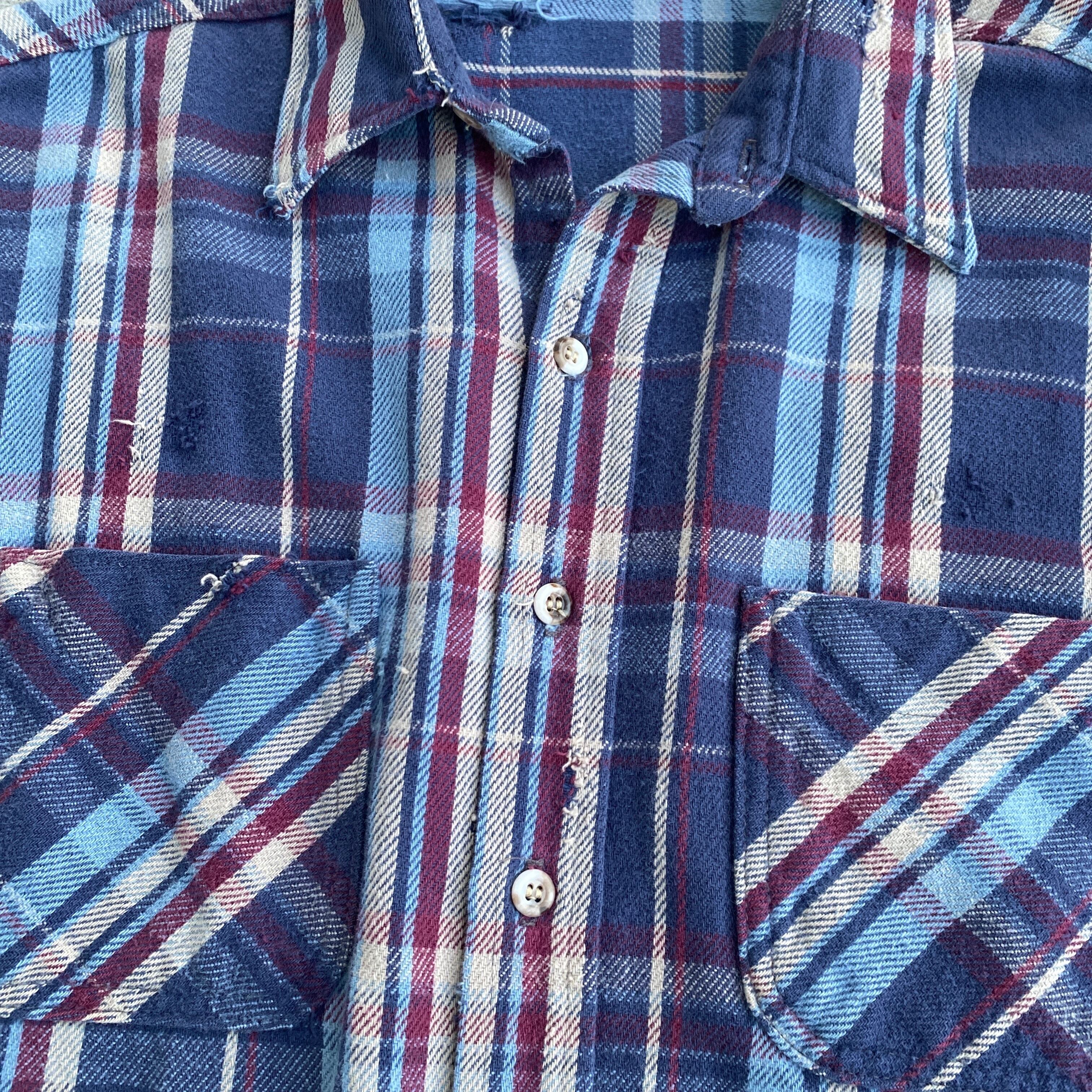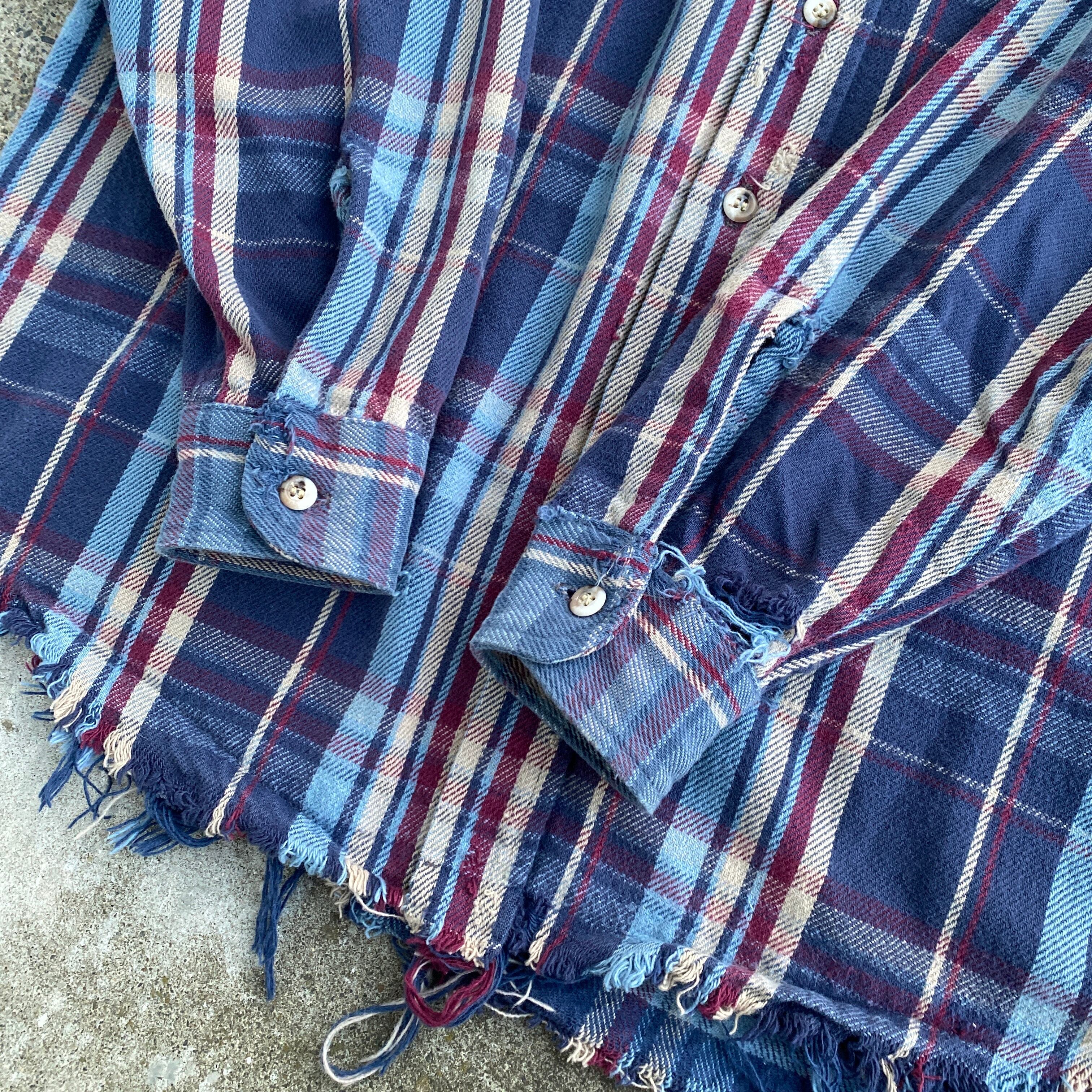 肉厚でモチっとしたコットンネル素材に、ブルーを基調とした絶妙な配色、グランジな雰囲気に加工された雰囲気が抜群に格好良い一着。