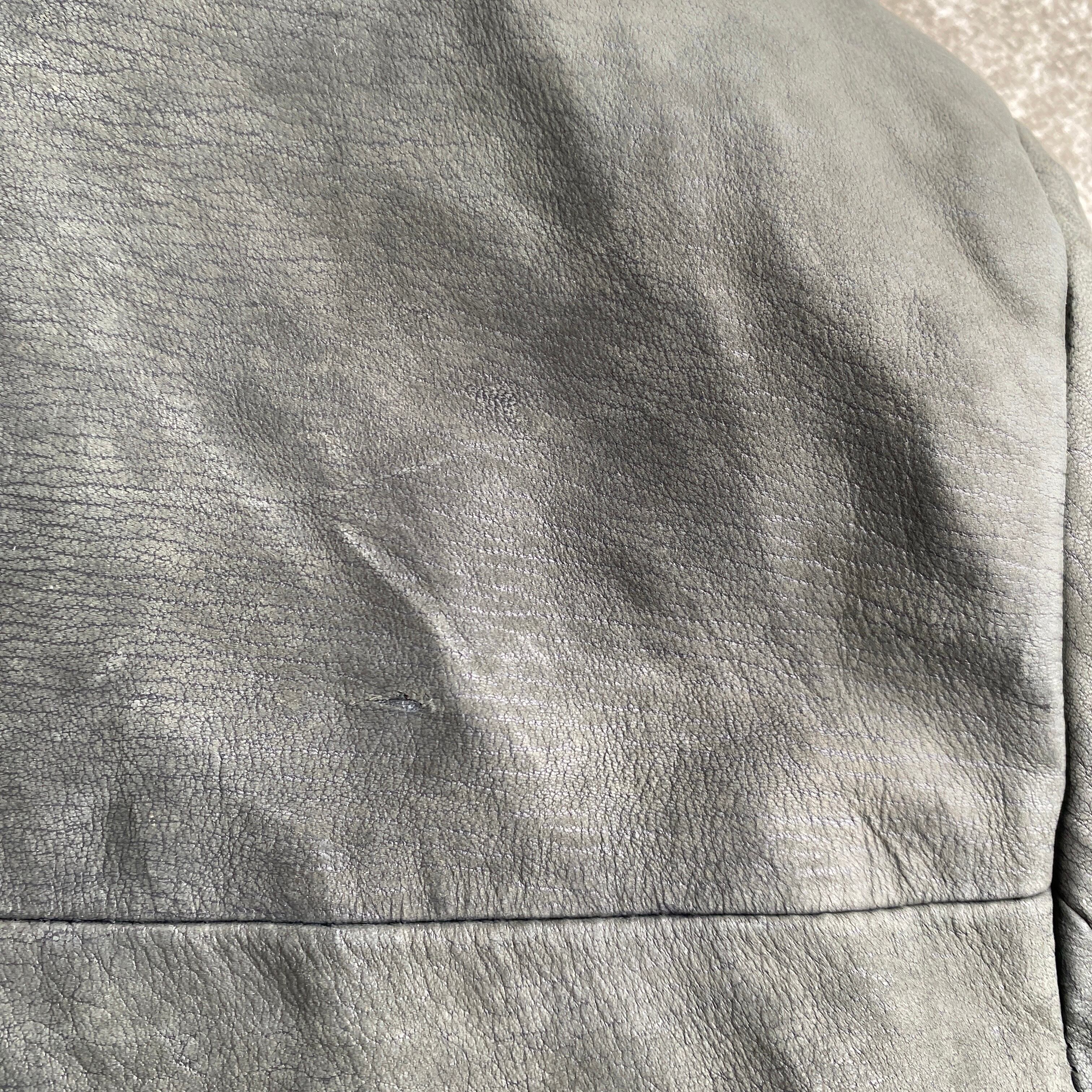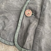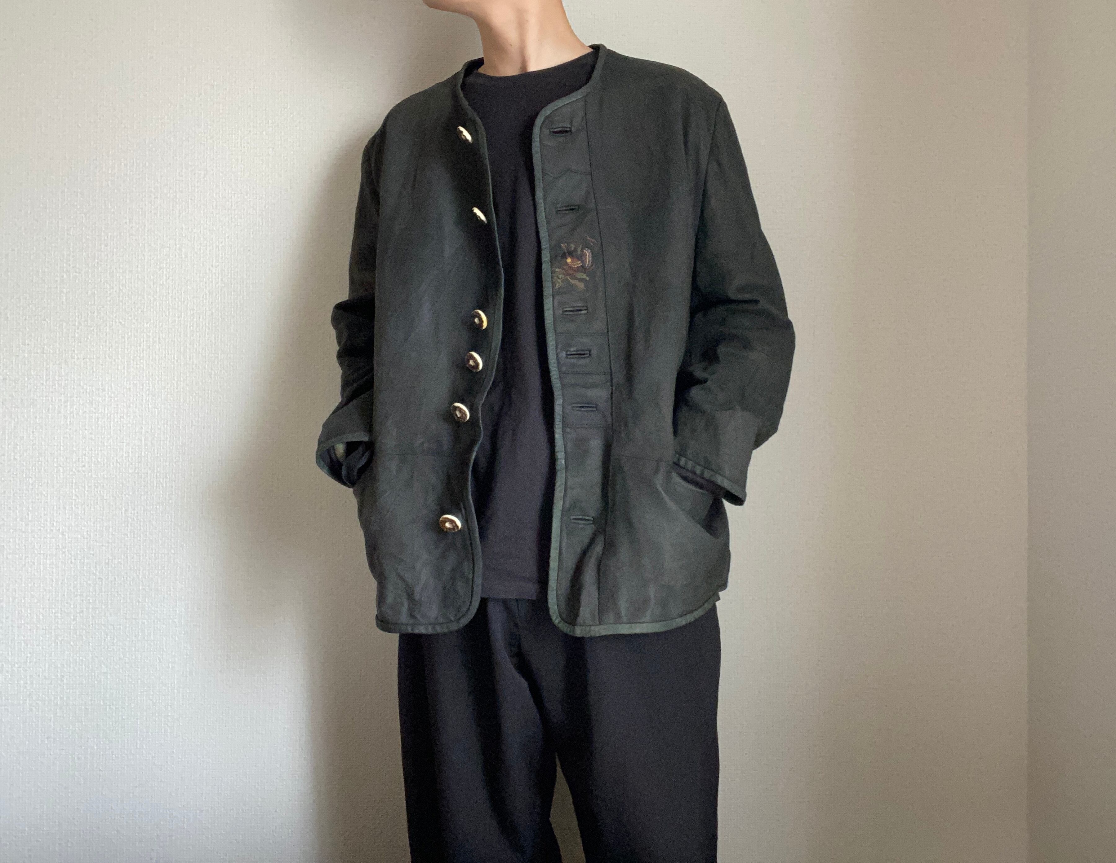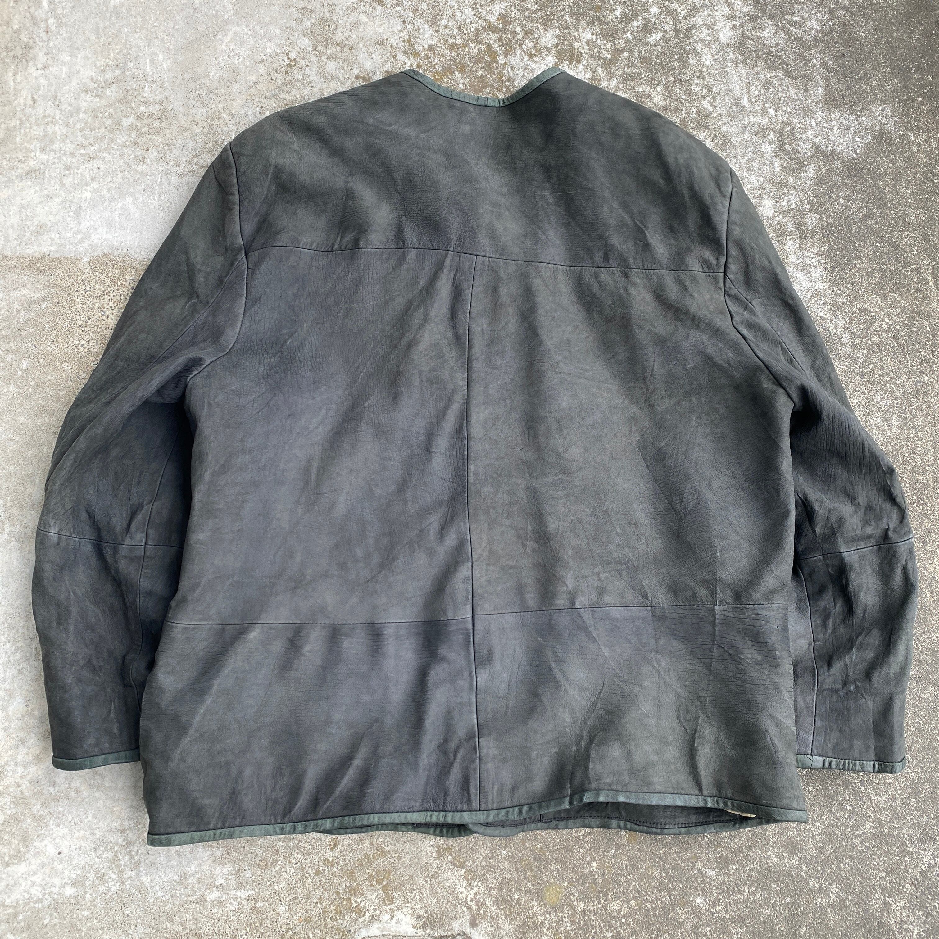 チャコールグレー系の色目のディアスキンヌバックレザー(おそらく)を使用し、ジャーキンジャケットのようなノーカラーデザインで仕立てられた一着。