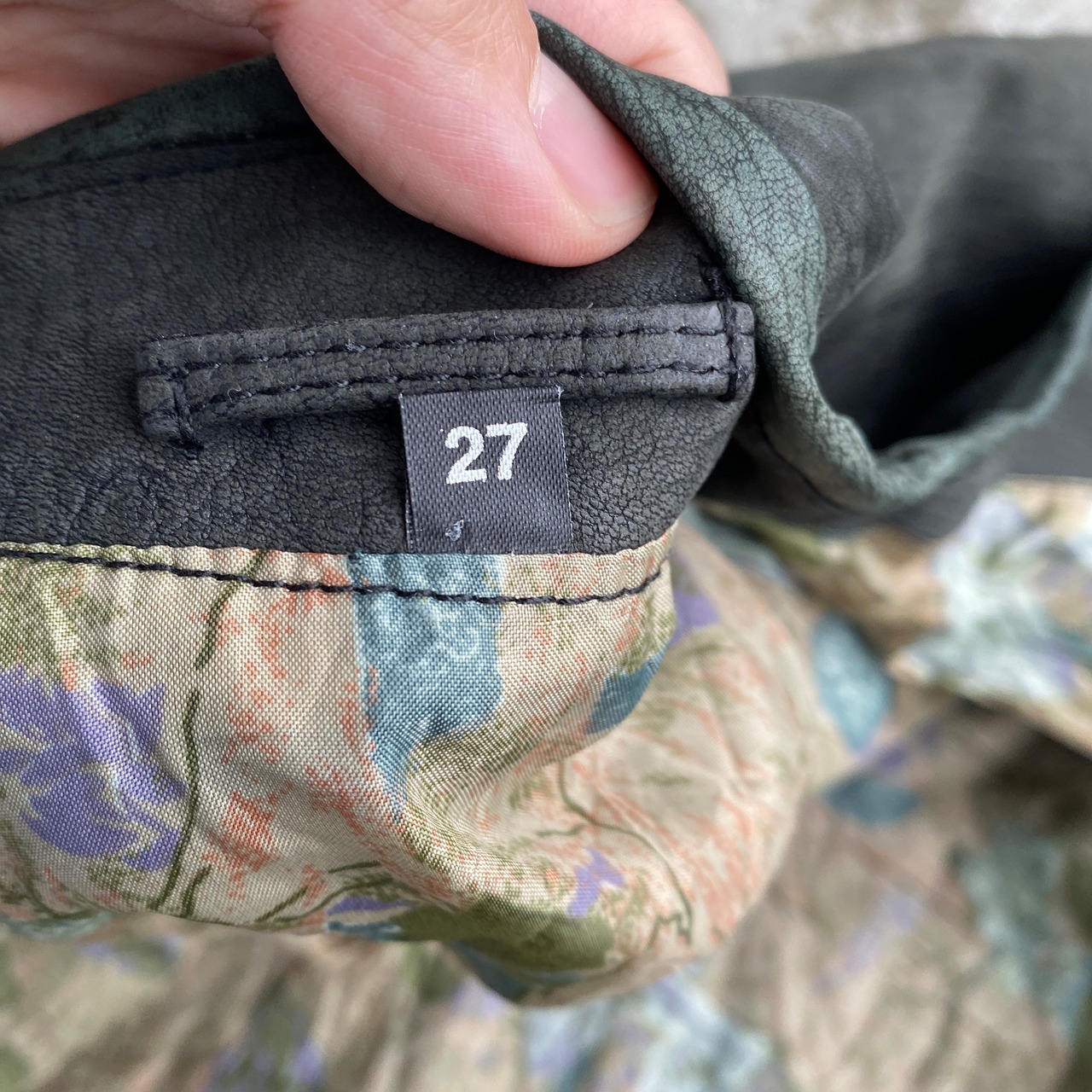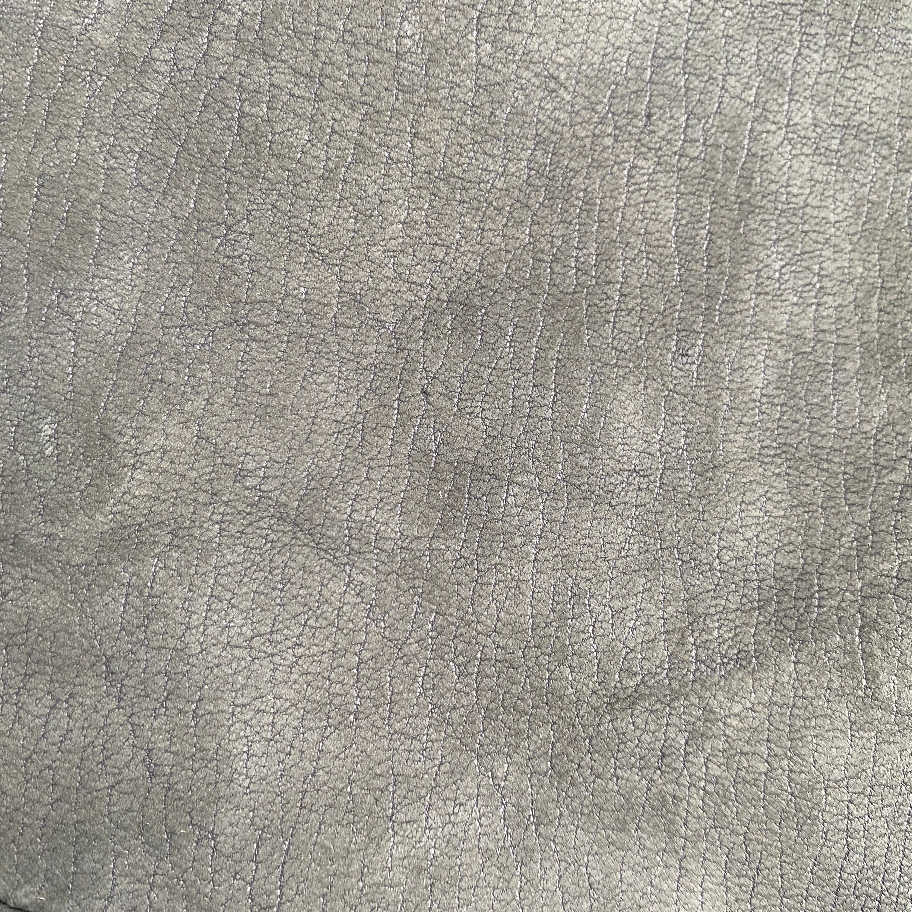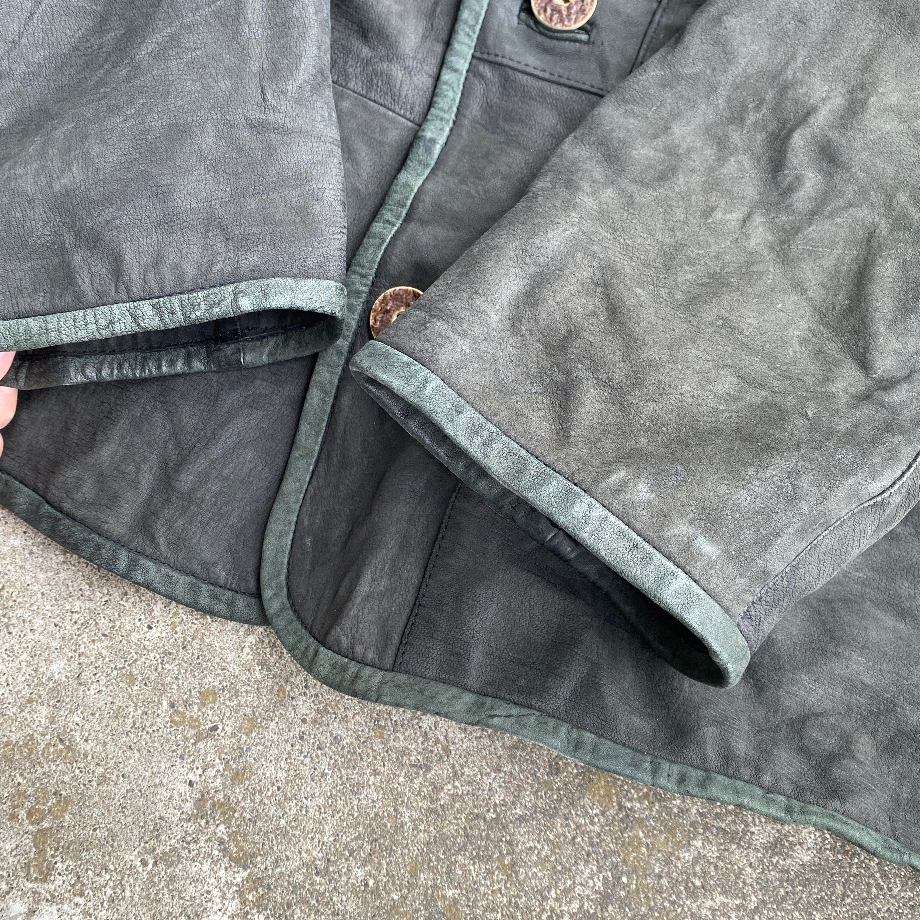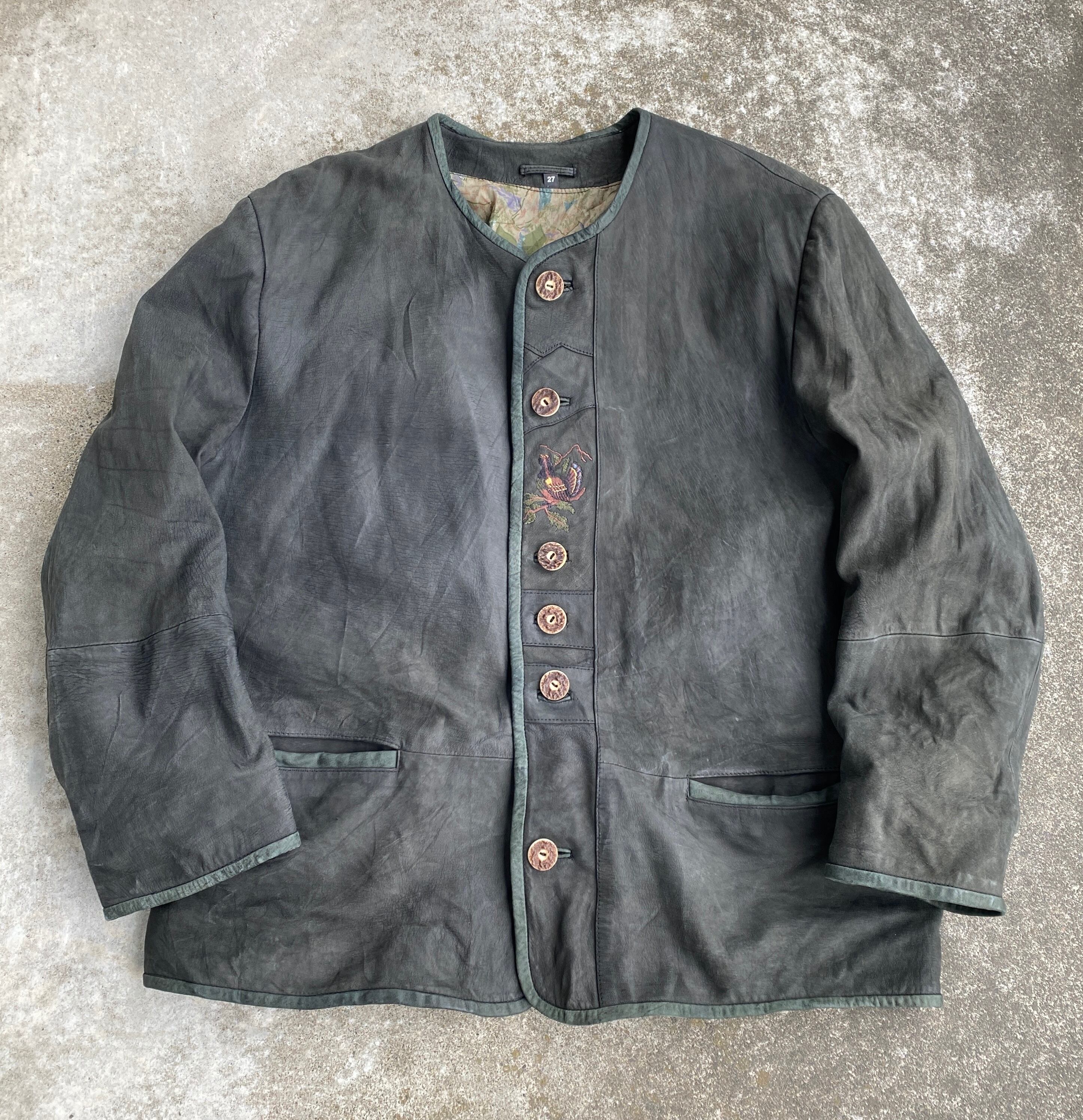 チャコールグレー系の色目のディアスキンヌバックレザー(おそらく)を使用し、ジャーキンジャケットのようなノーカラーデザインで仕立てられた一着。