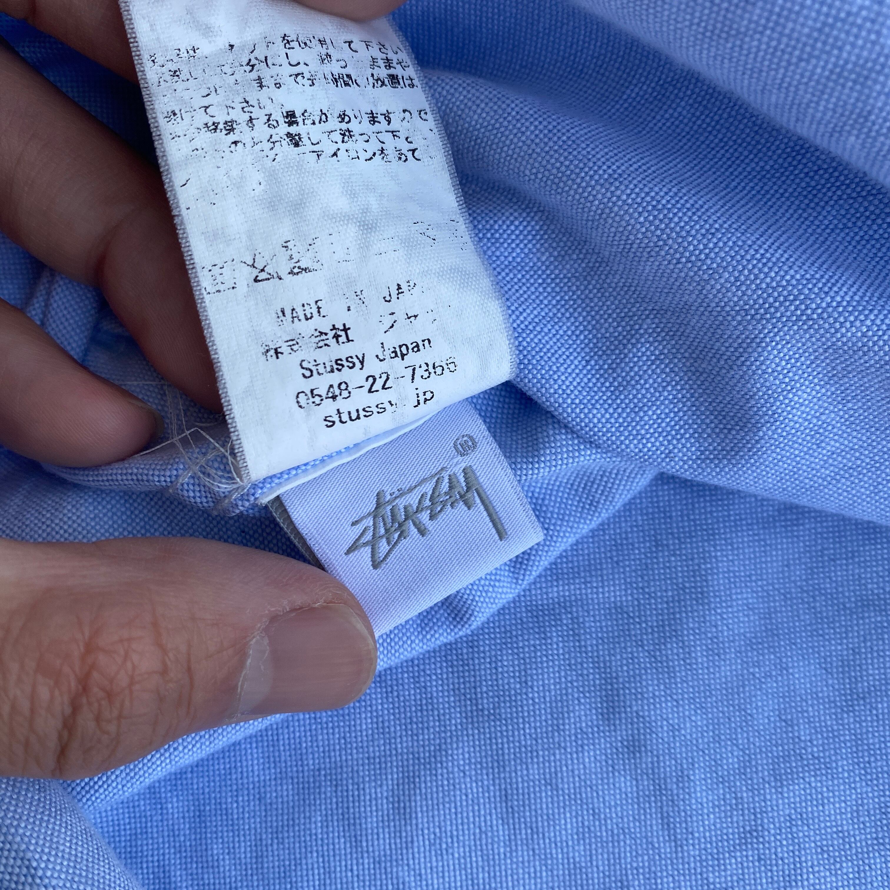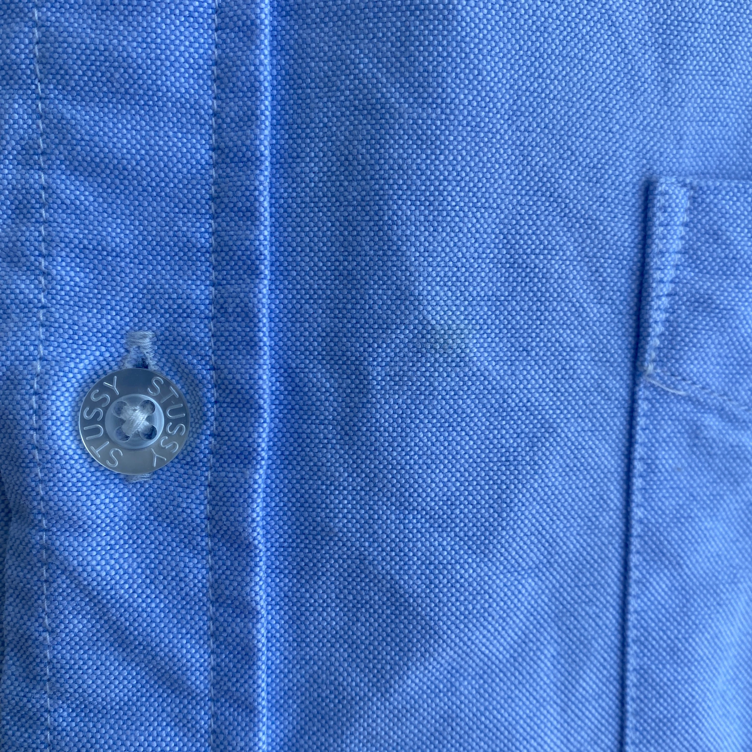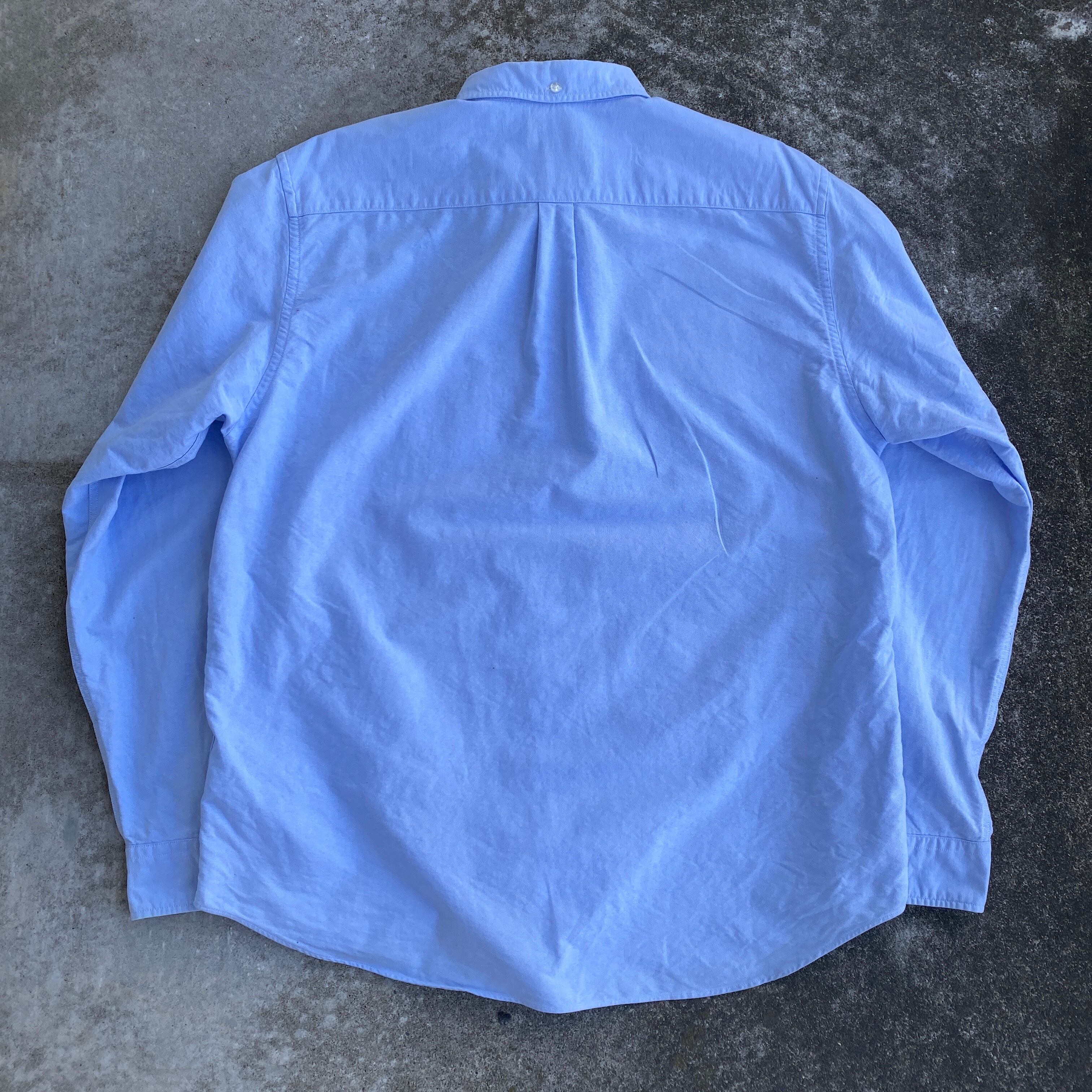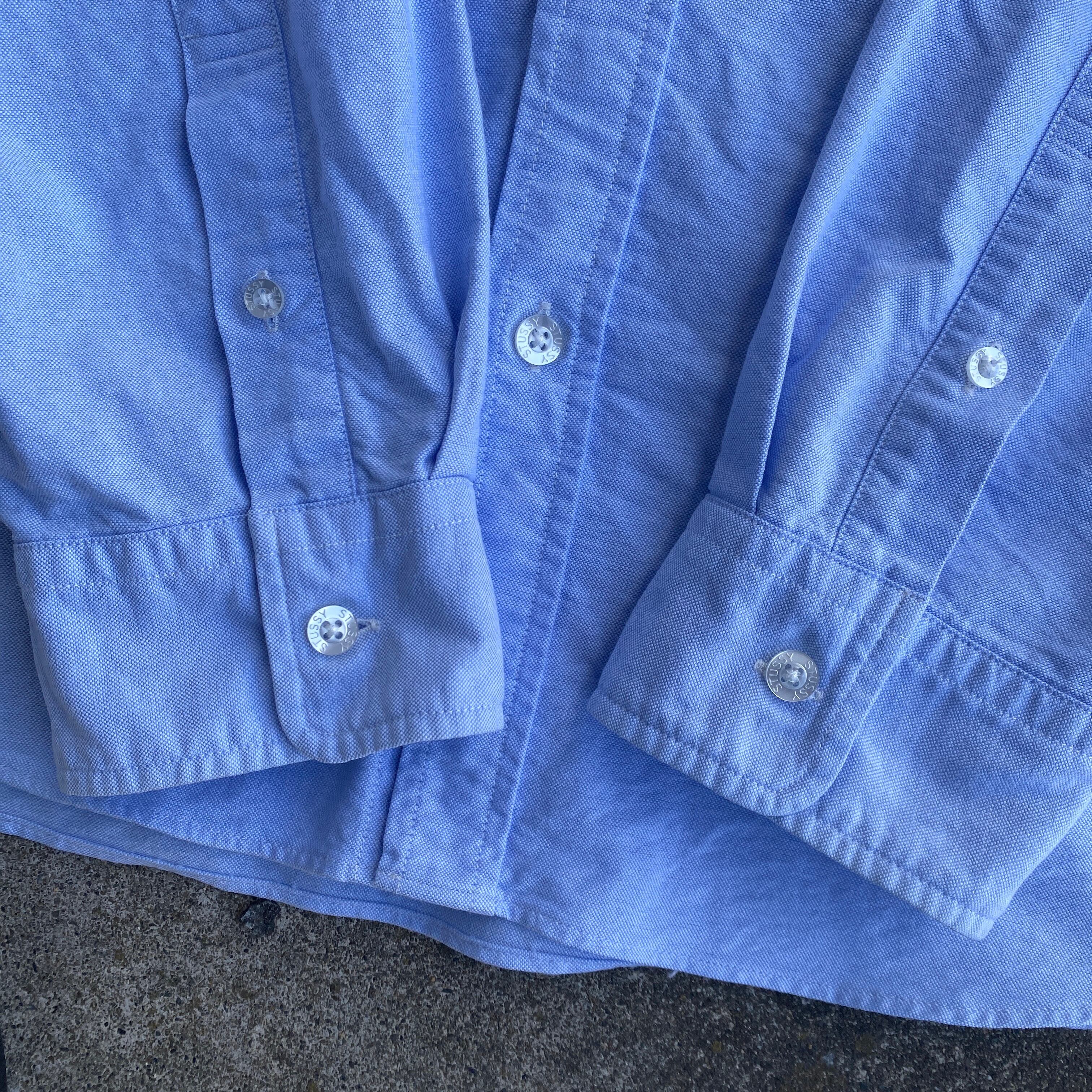コットン100の上質なオックスフォード生地に、美しいサックスブルーカラー(画像10参照)、三点留めボタンで、やや襟が小さめのクラシックなスタイルが非常に格好良い一着。