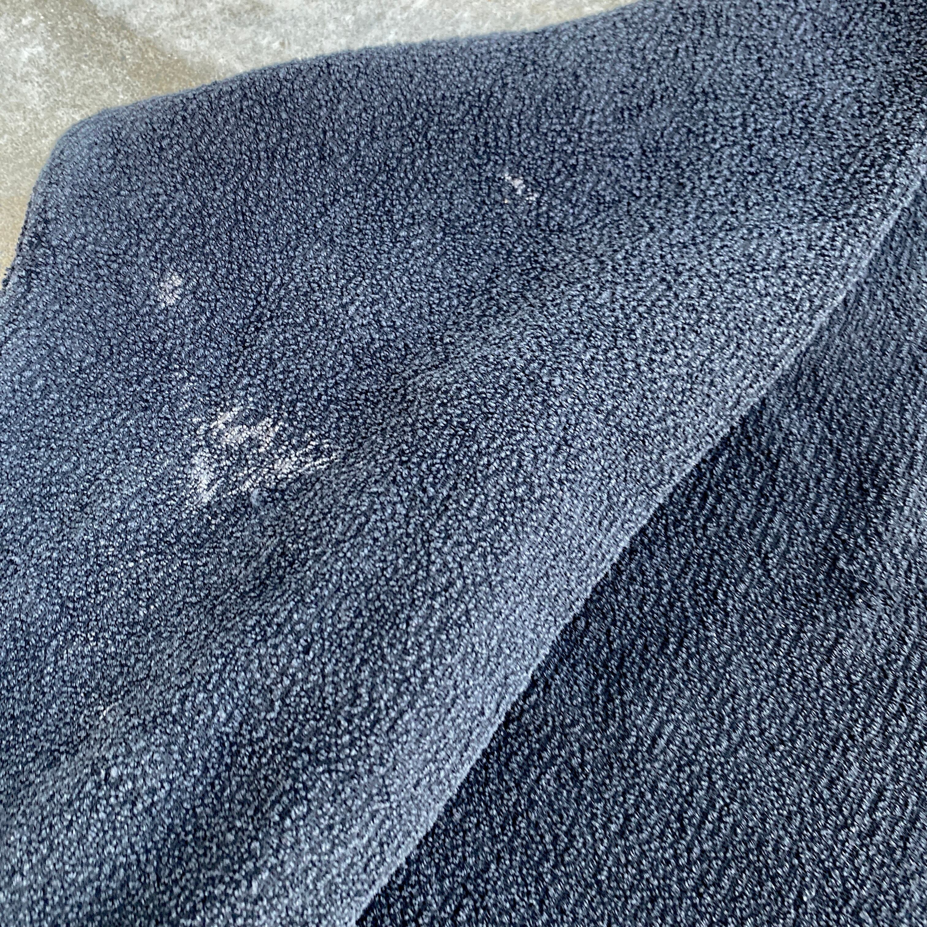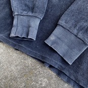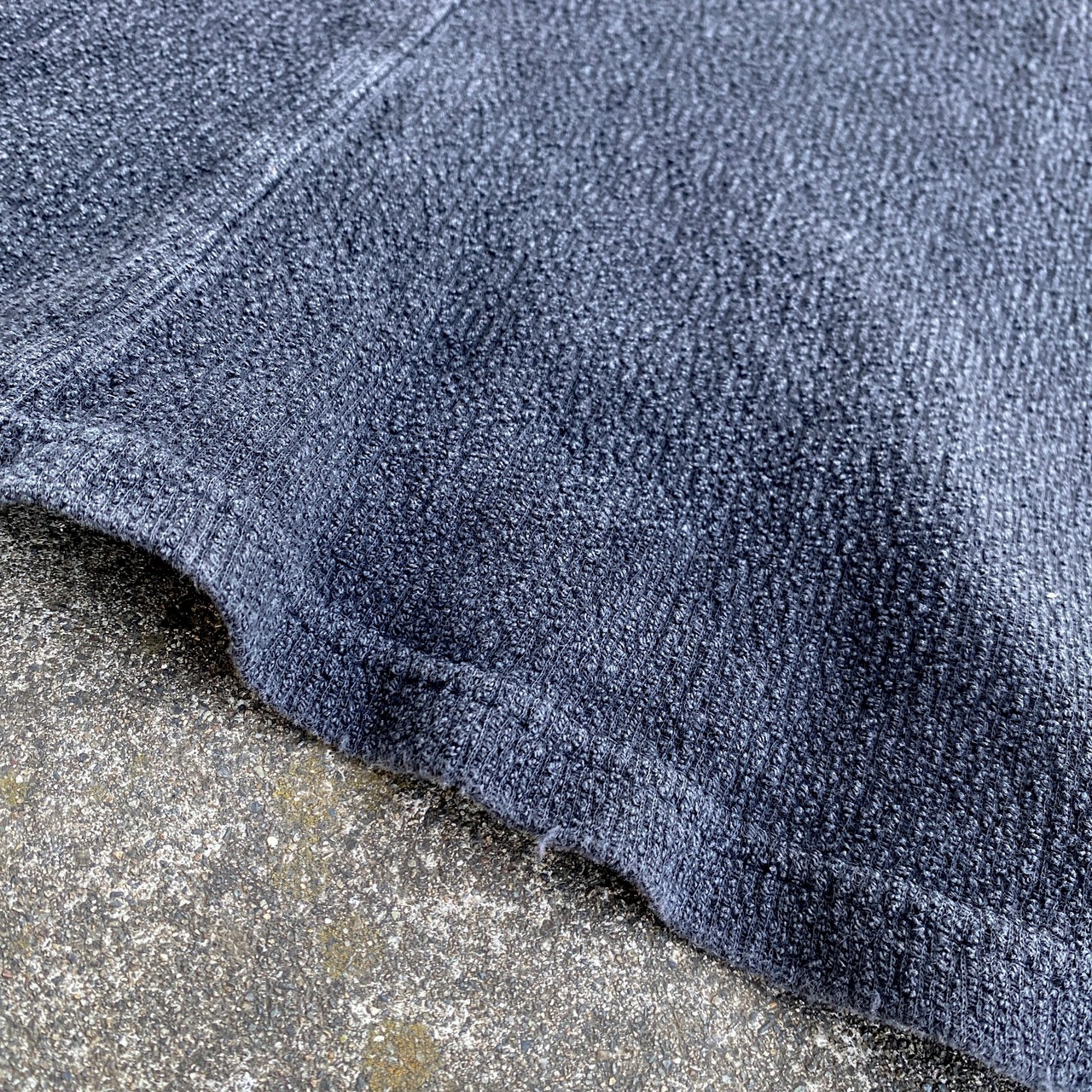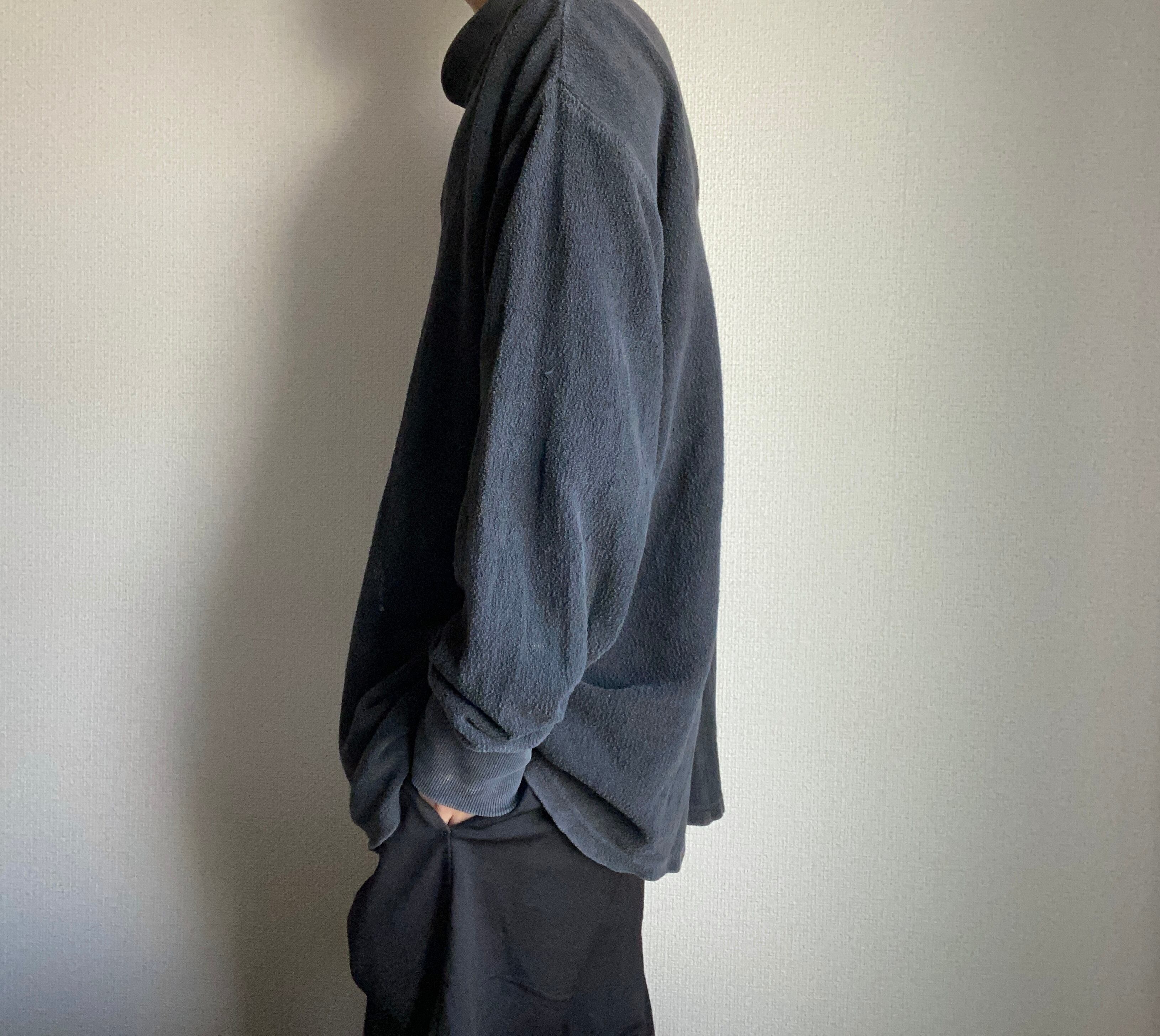 色褪せたブラックカラーのら凹凸感のある強撚コットン素材に、程よく入ったダメージや汚れ、ゆったりとしたビッグシルエットが非常にかわいい一着。