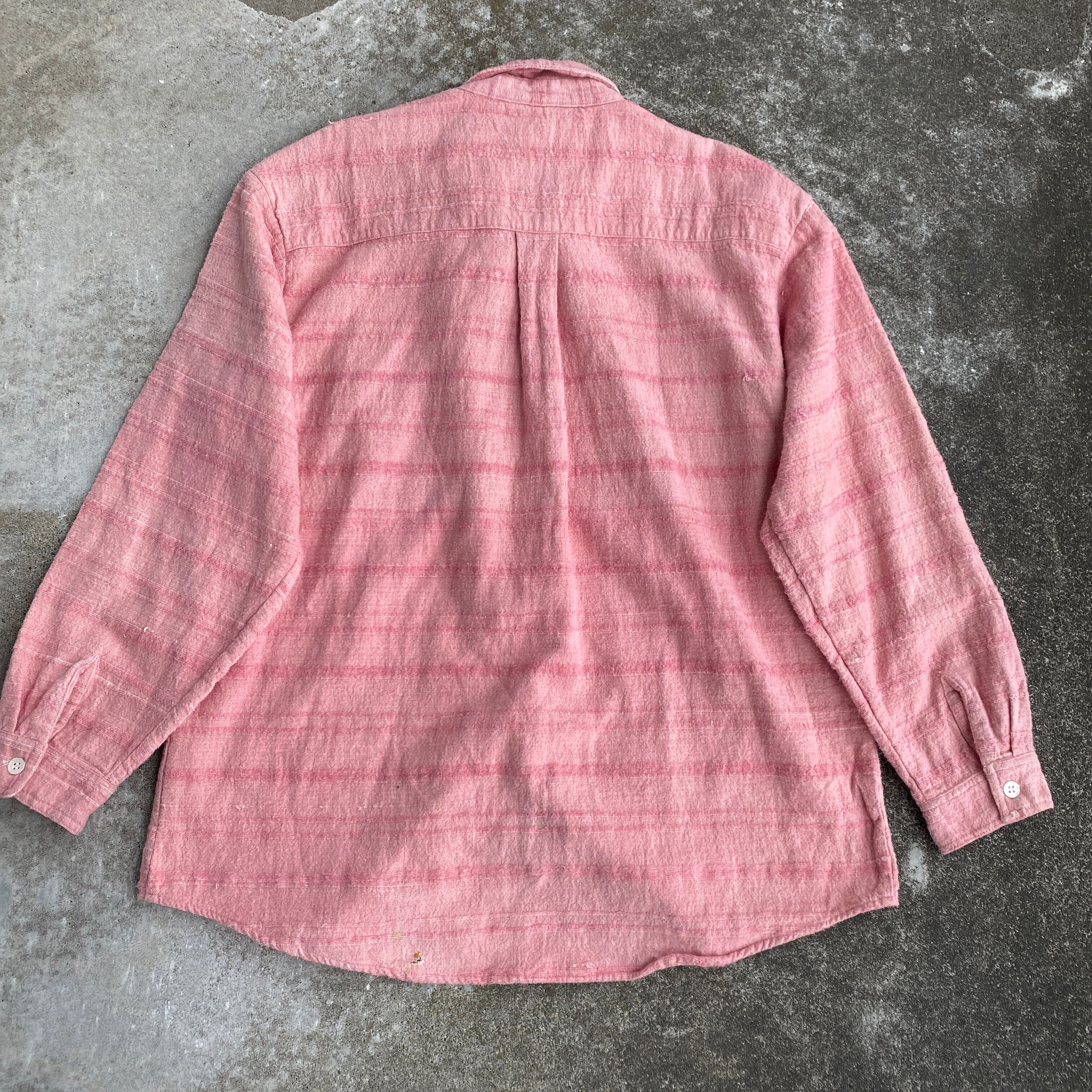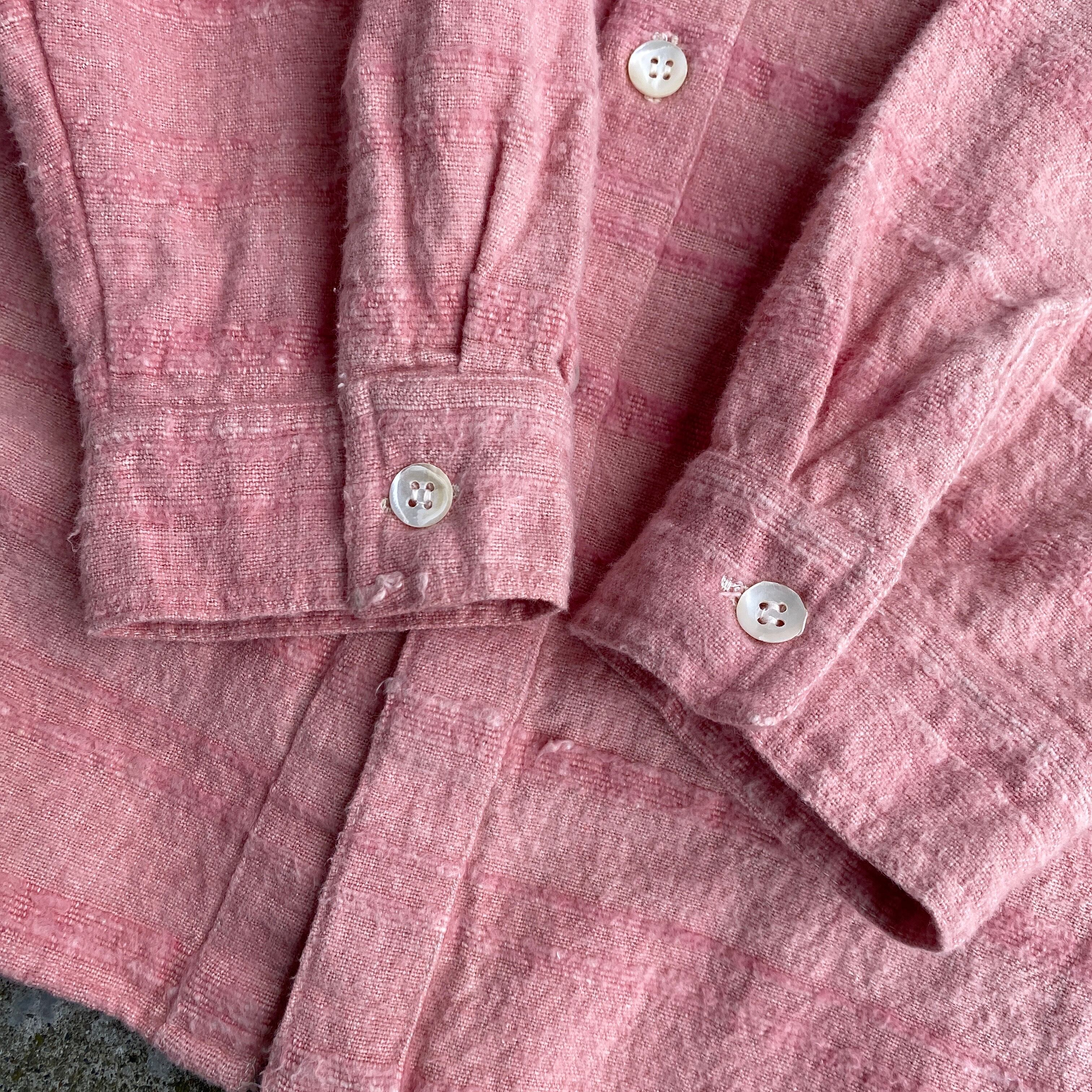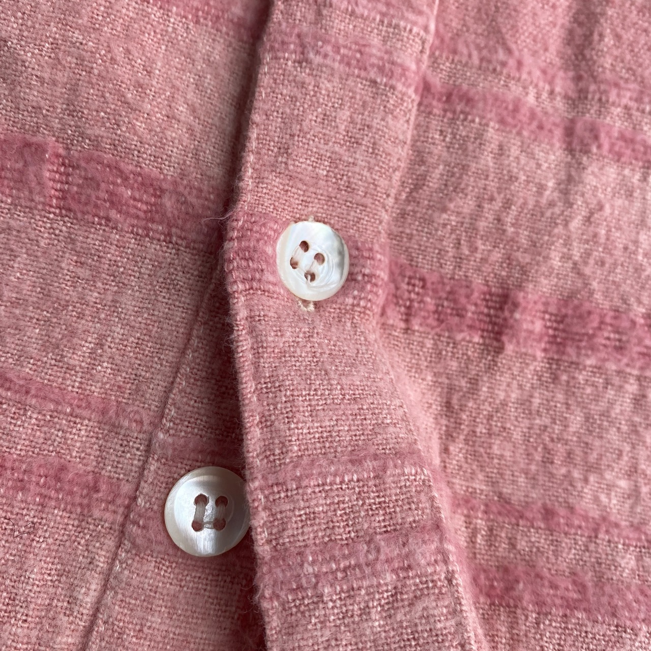 肉厚で柔らかいコットン素材に、くすんだピンクの織柄ボーダー、荒い削り出しのシェルボタン、ゆったりとしたサイズ感が抜群に格好良い一着。