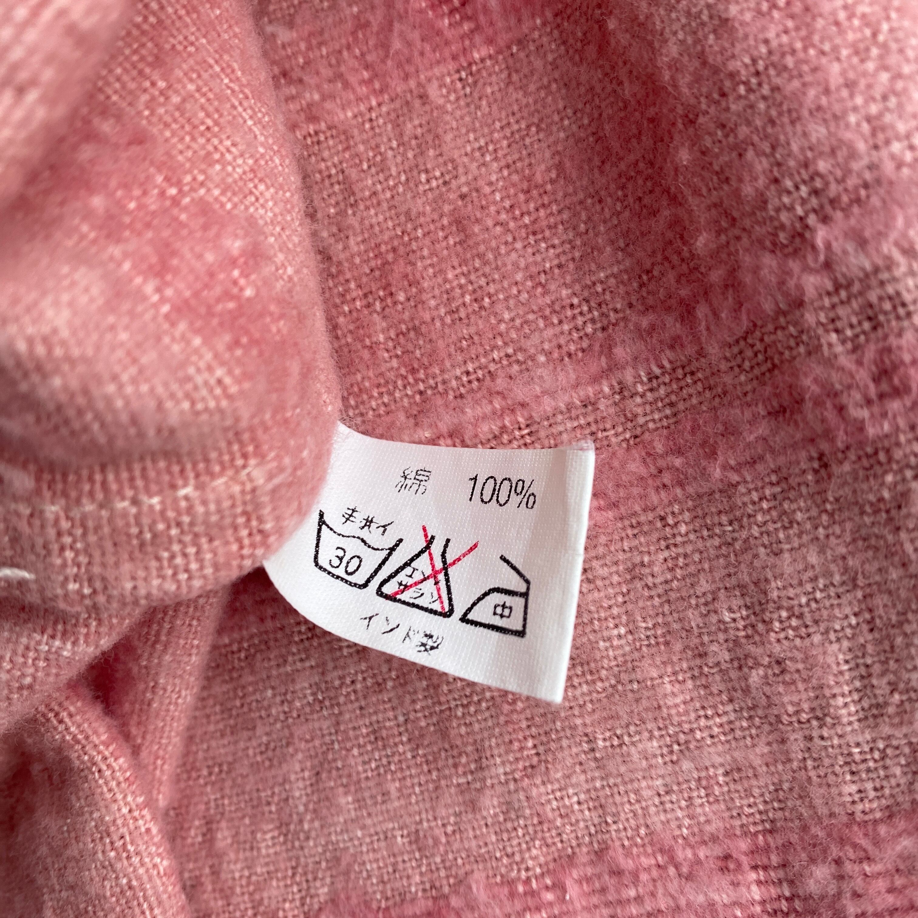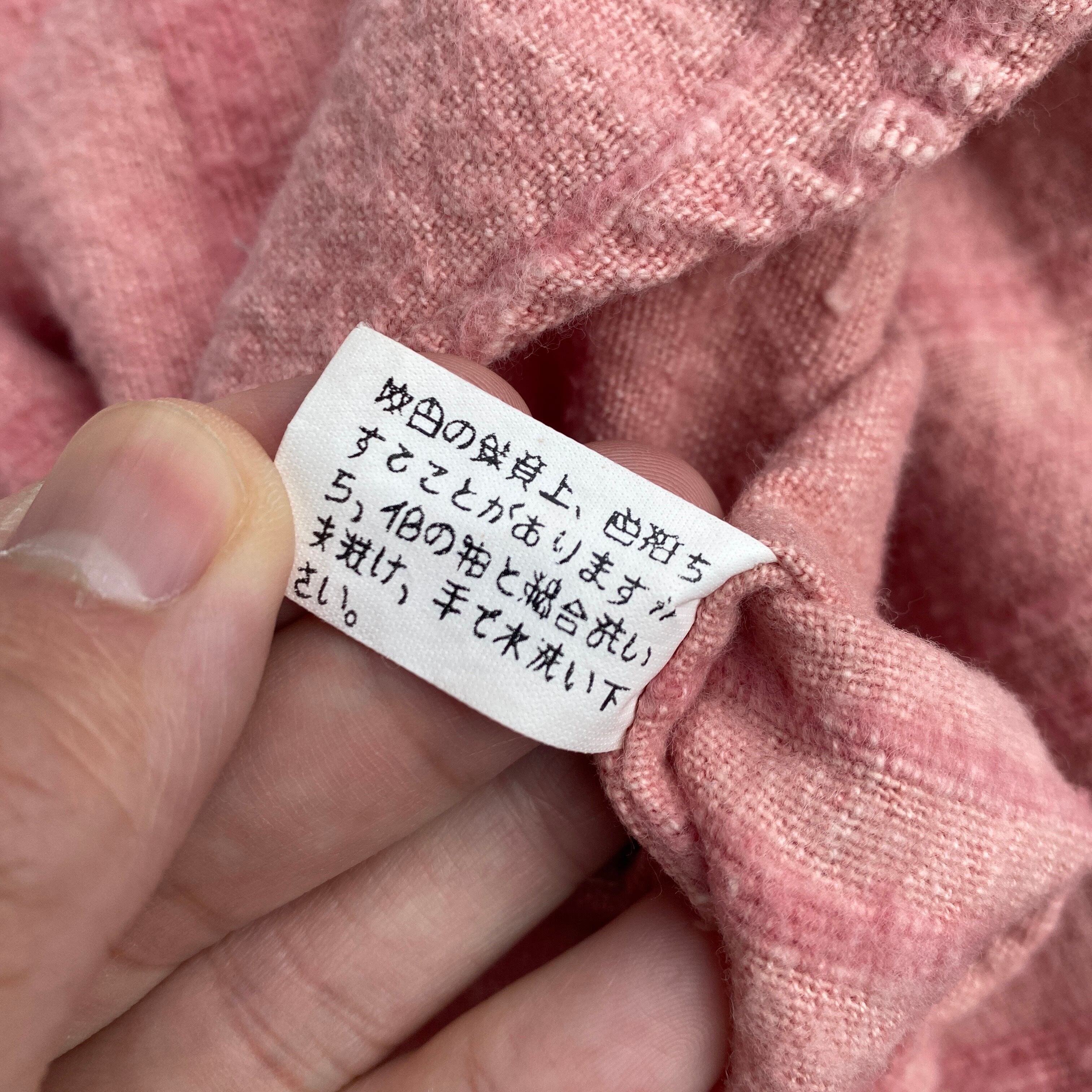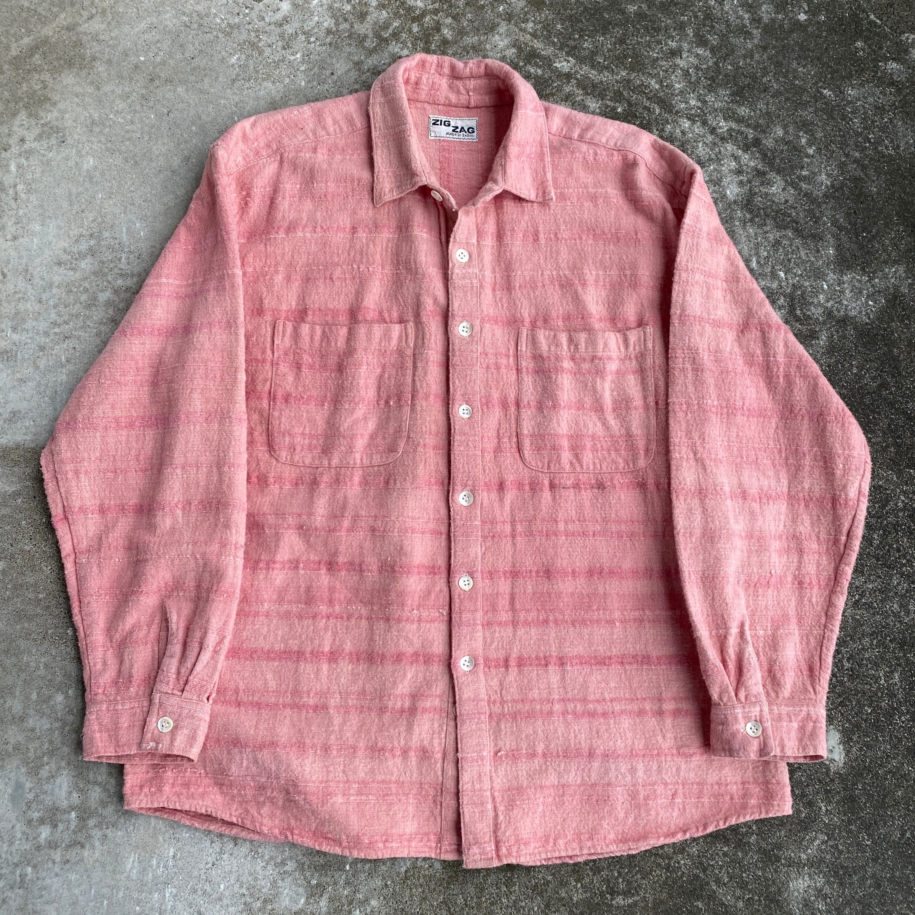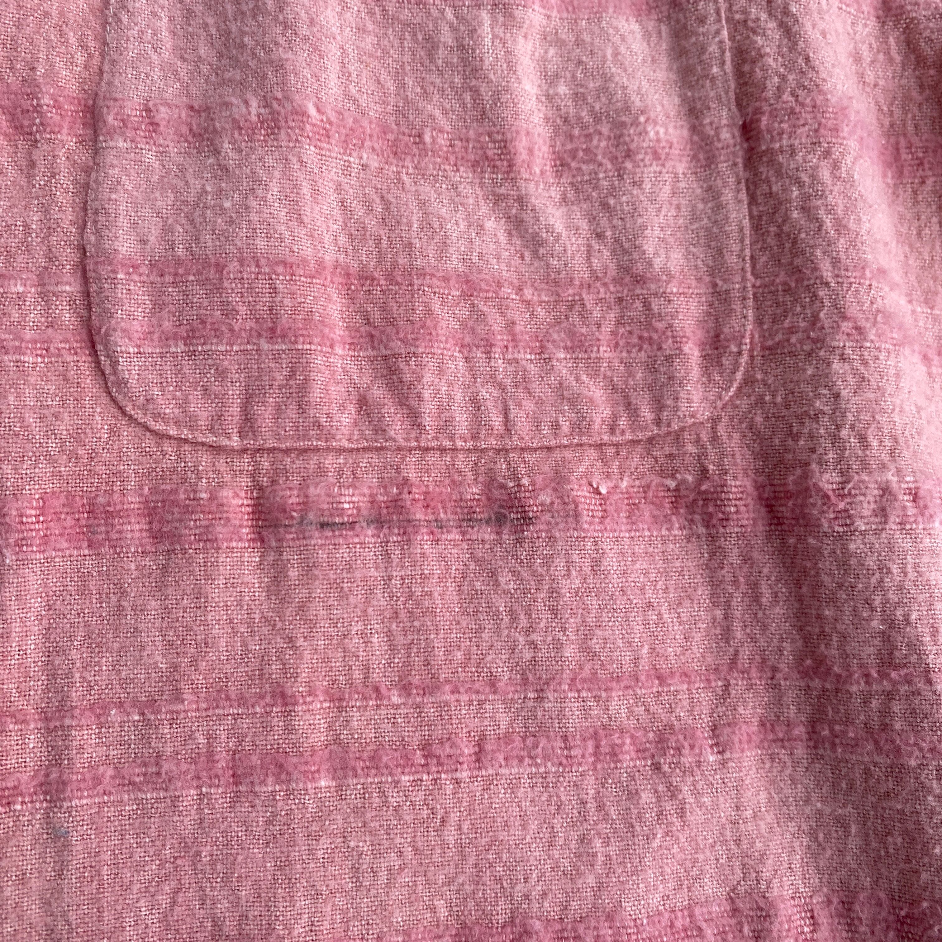 肉厚で柔らかいコットン素材に、くすんだピンクの織柄ボーダー、荒い削り出しのシェルボタン、ゆったりとしたサイズ感が抜群に格好良い一着。