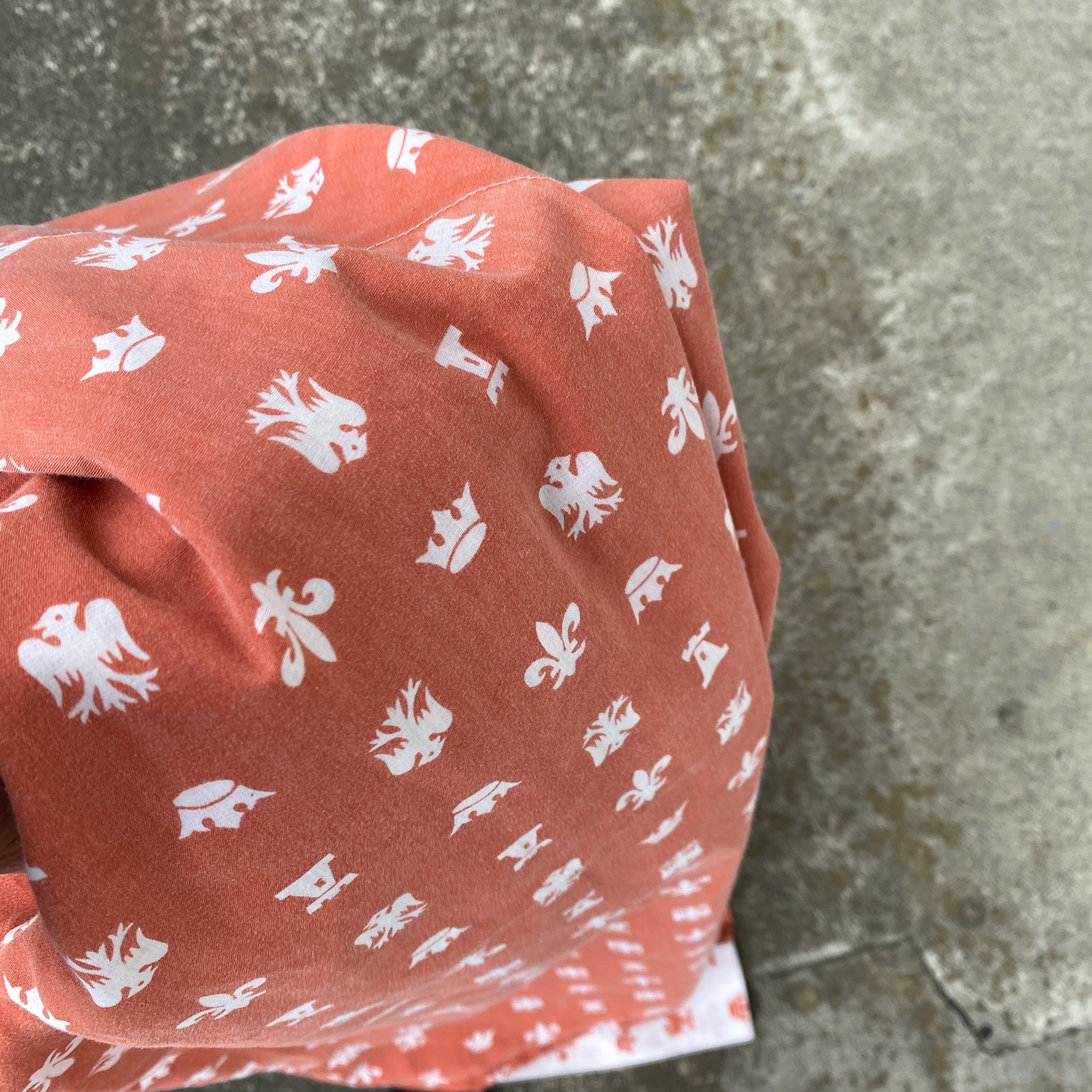 春らしいくすんだオレンジ×ホワイト(画像8が近いです)のカラーに、ポリベースのサラッとした素材感、袖と襟が反転したデザインが非常にかわいい一着。