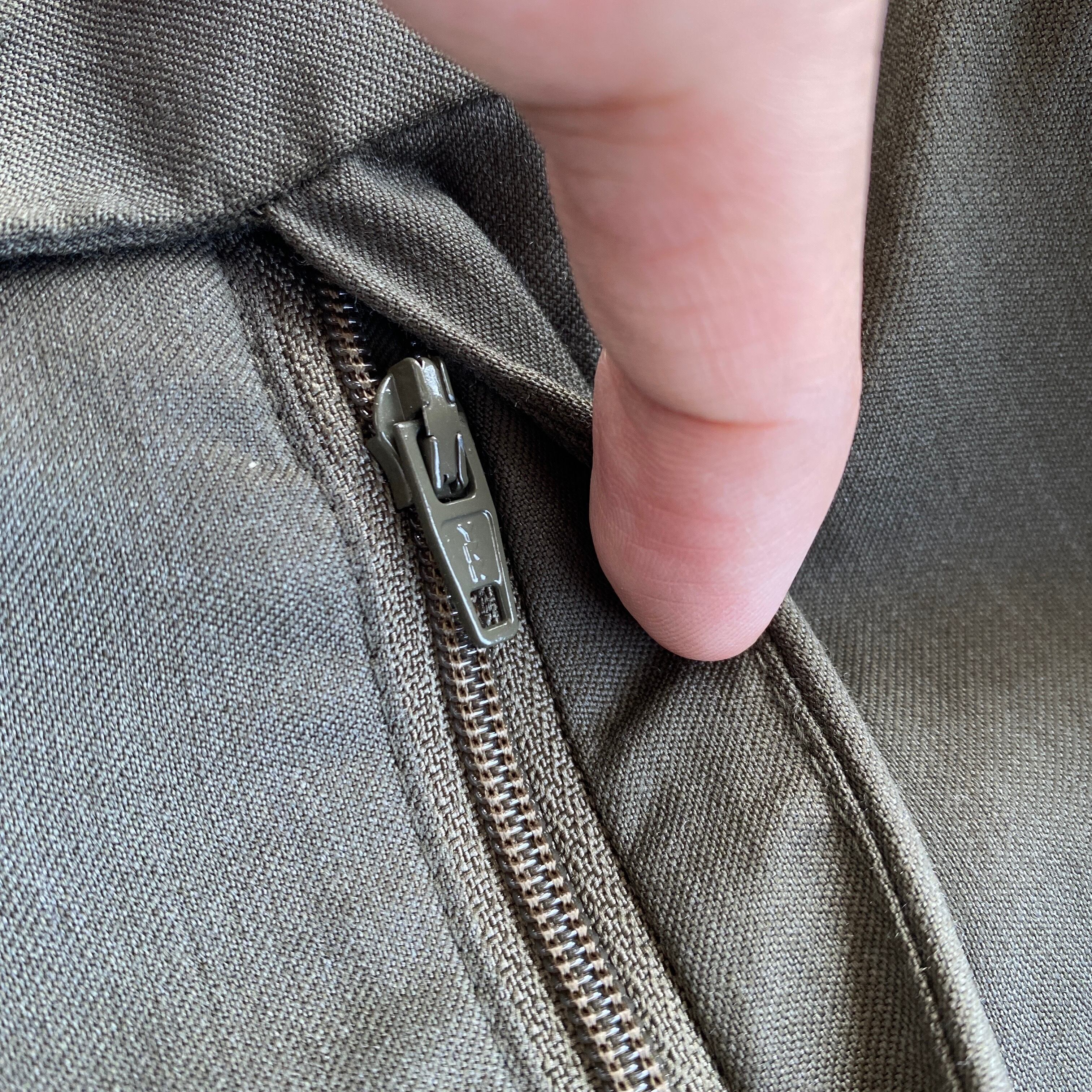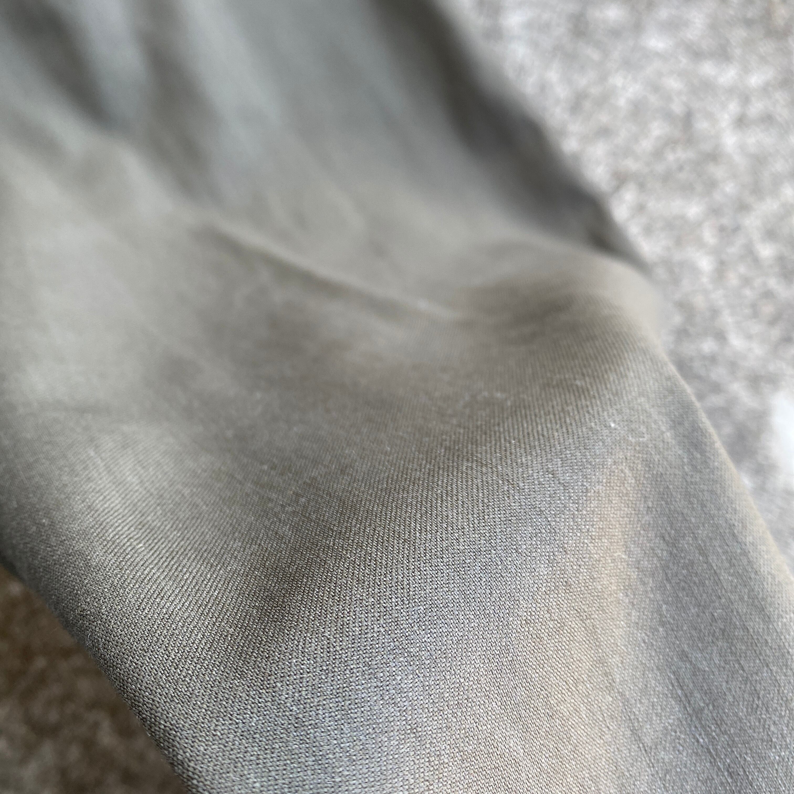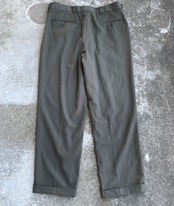 ウエスト、ワタリ付近のゆとりのあるパターン、生地のとろみから生まれる歩いた時のドレープ、美しいダークオリーブグレー系の色目は本当に素晴らしいです。