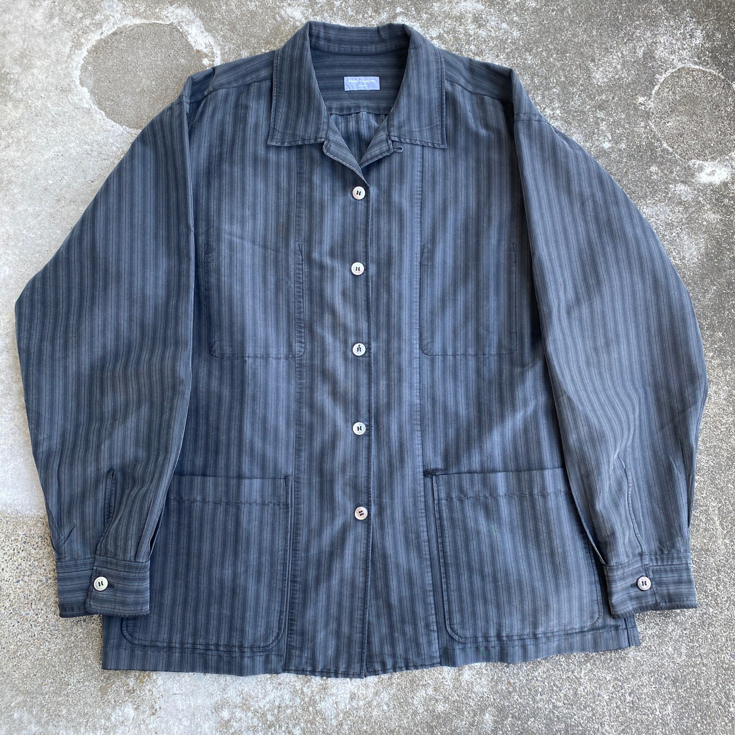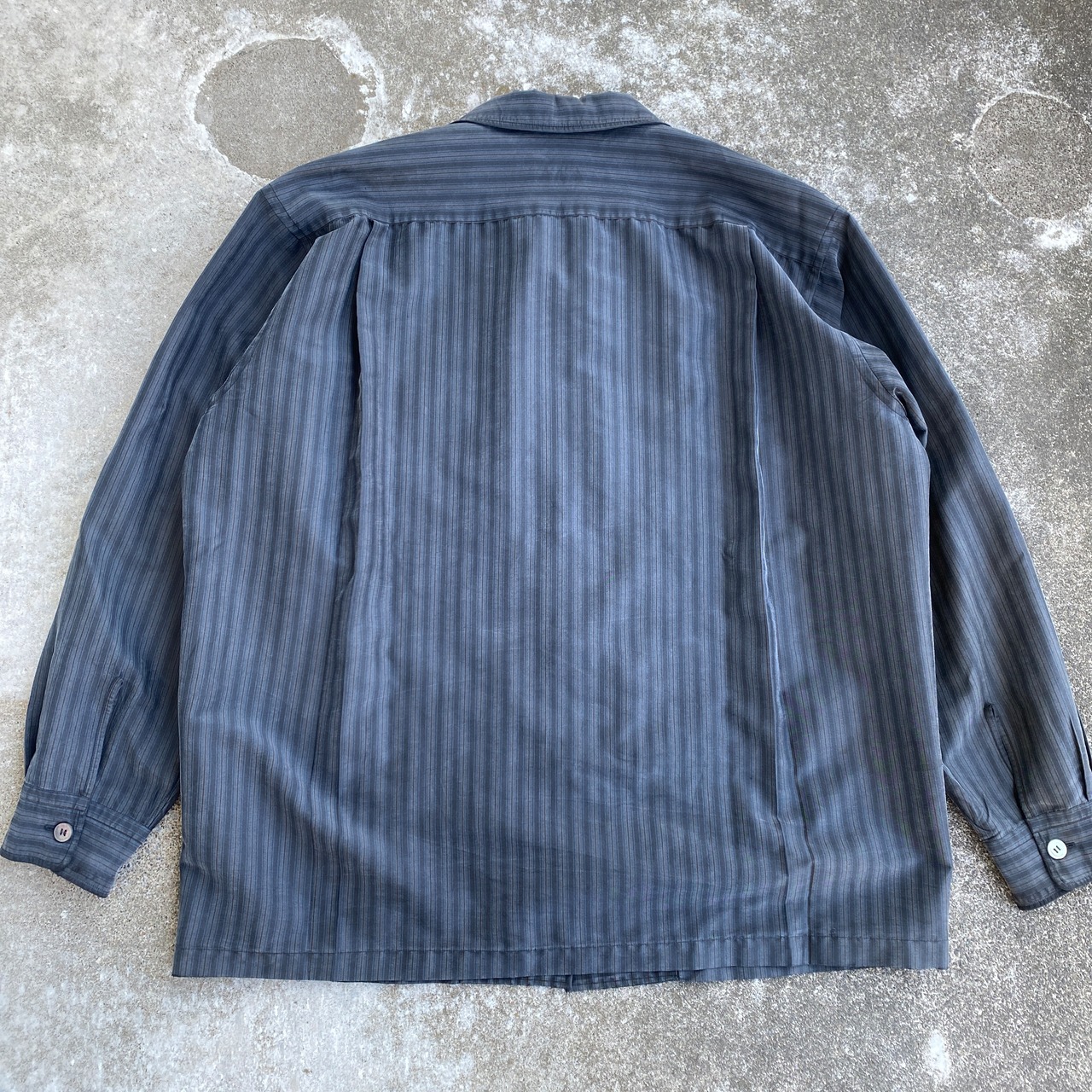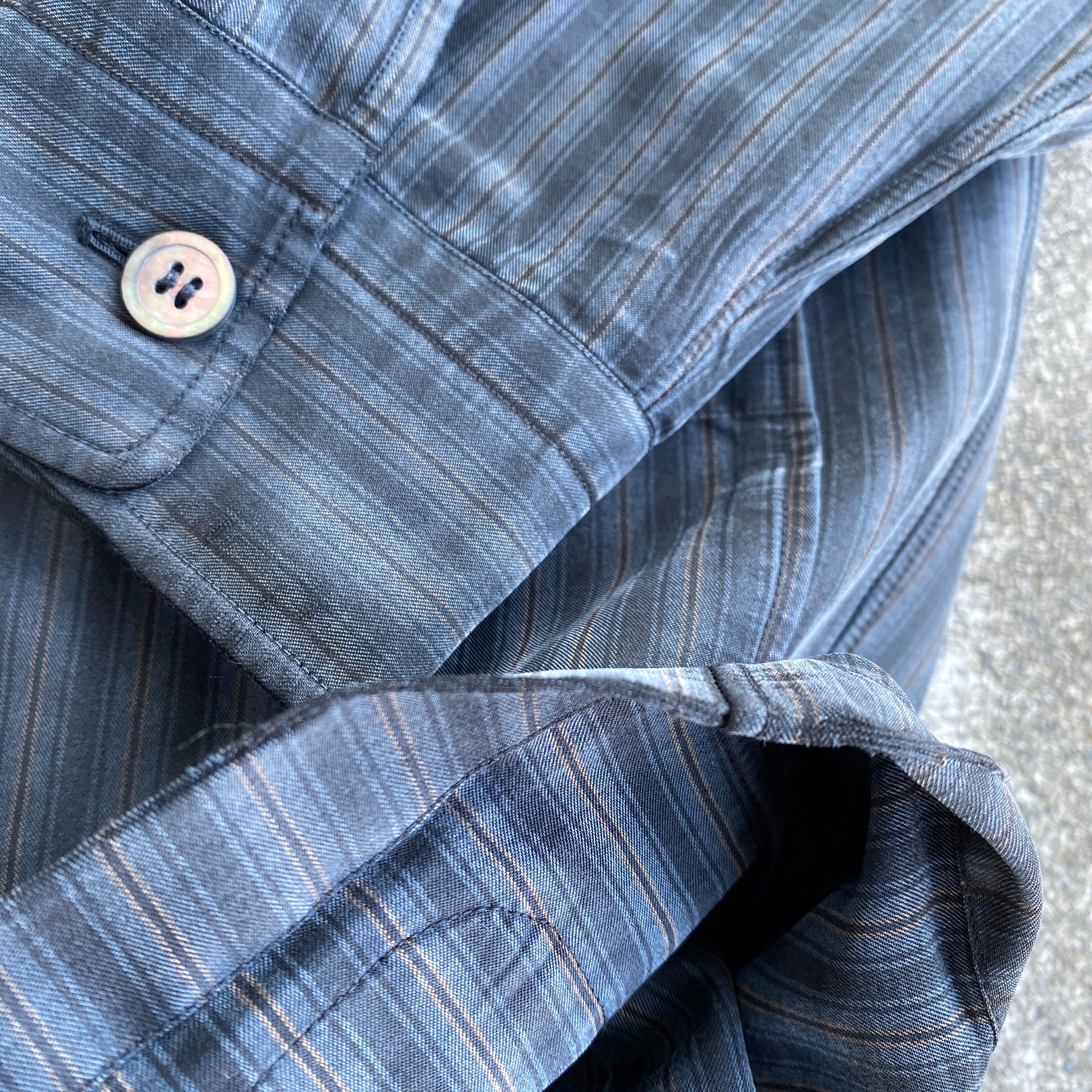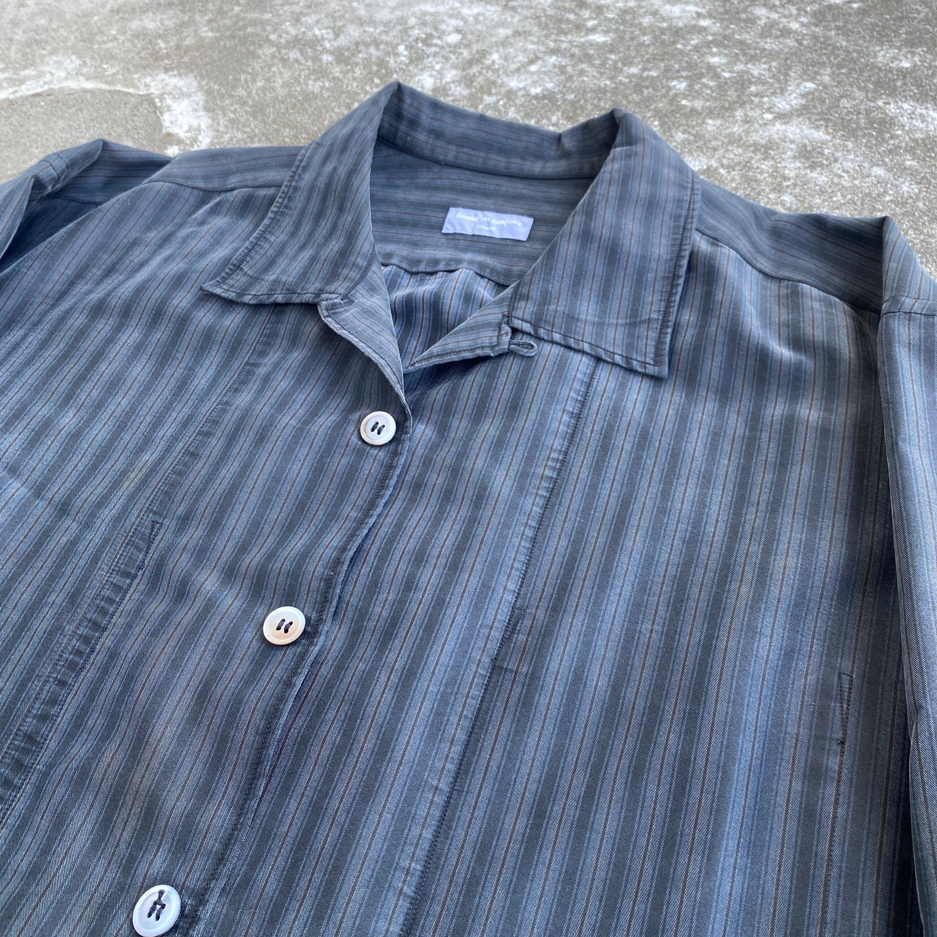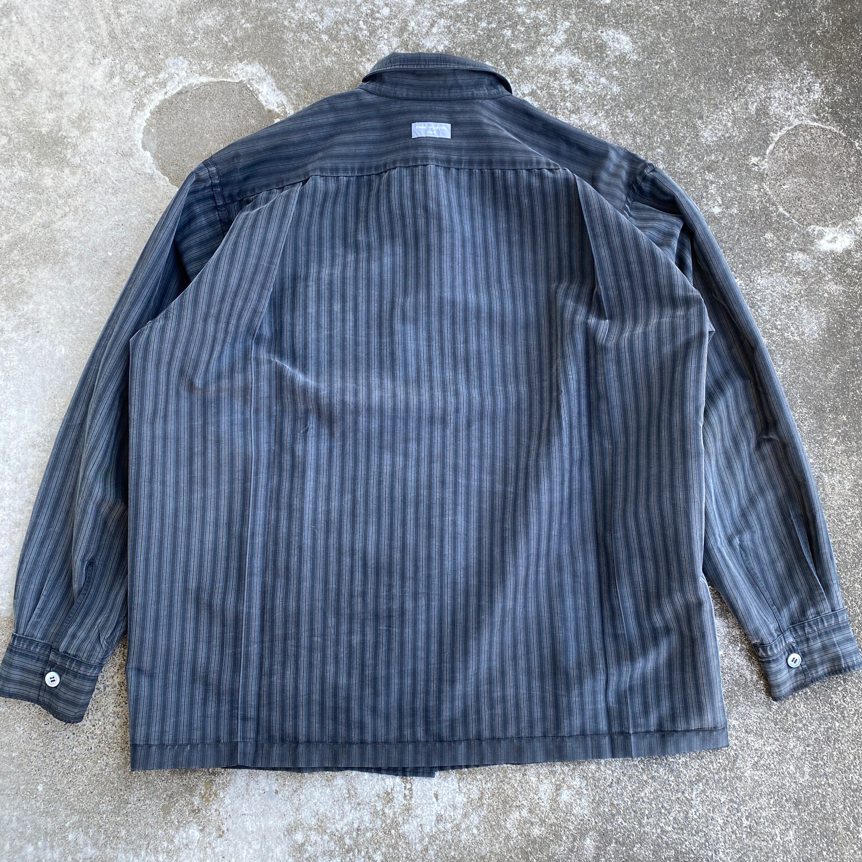 キュプラ×ポリエステル素材のハリコシのある素材感、上記素材に製品染めが施されることによって生まれた、鈍い光沢感のあるくすんだストライプの色目、ゆとりのあるシルエットが非常に格好良い一着。
