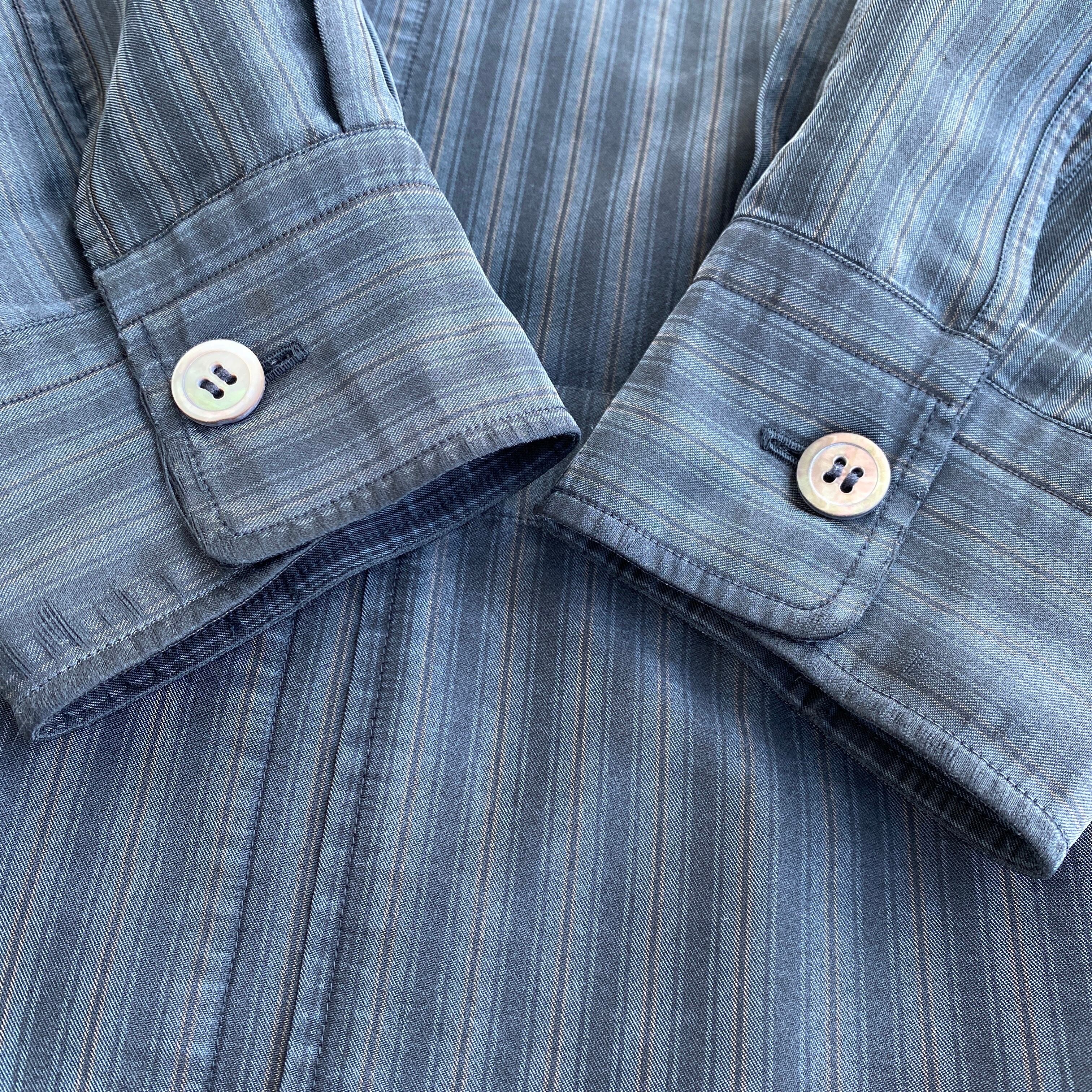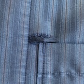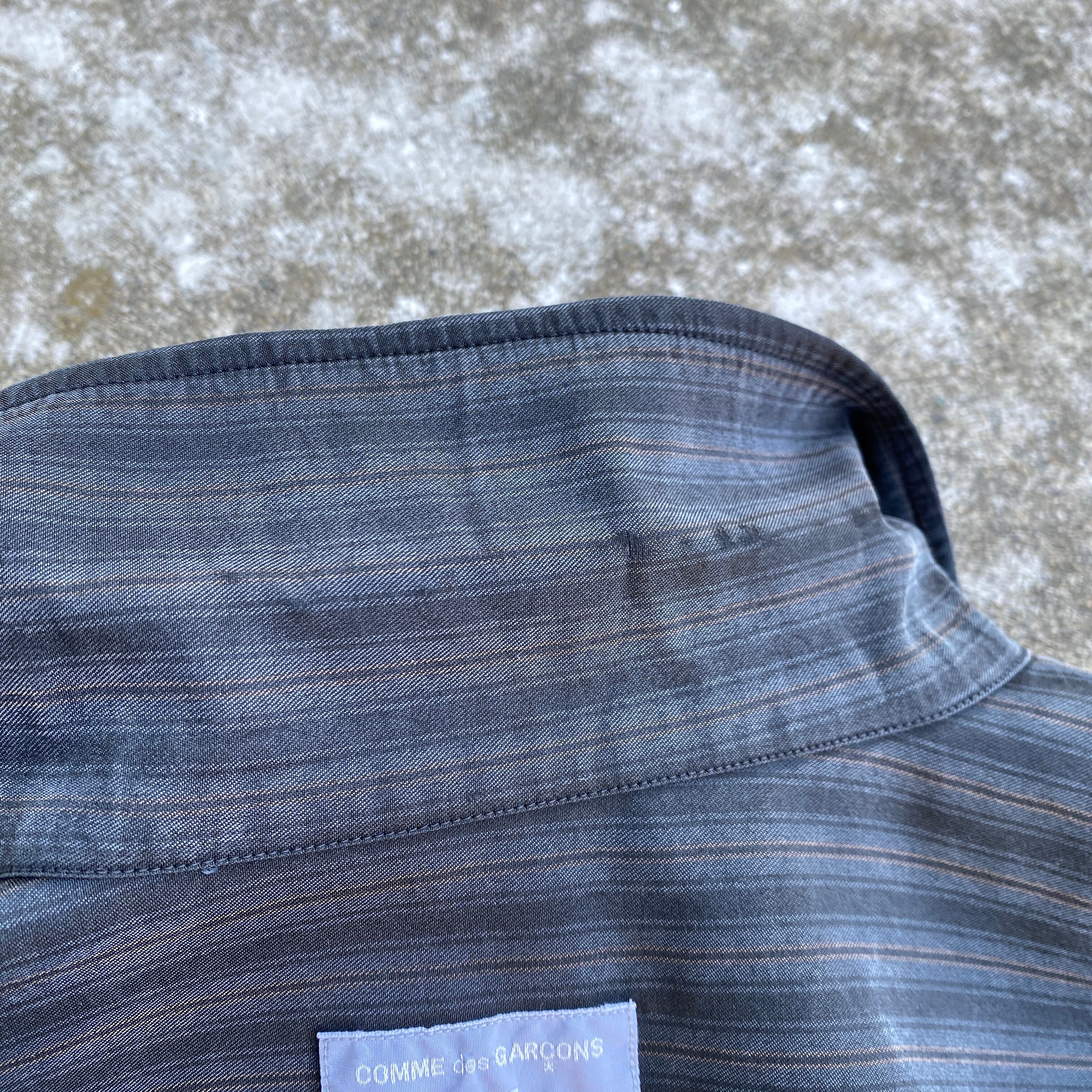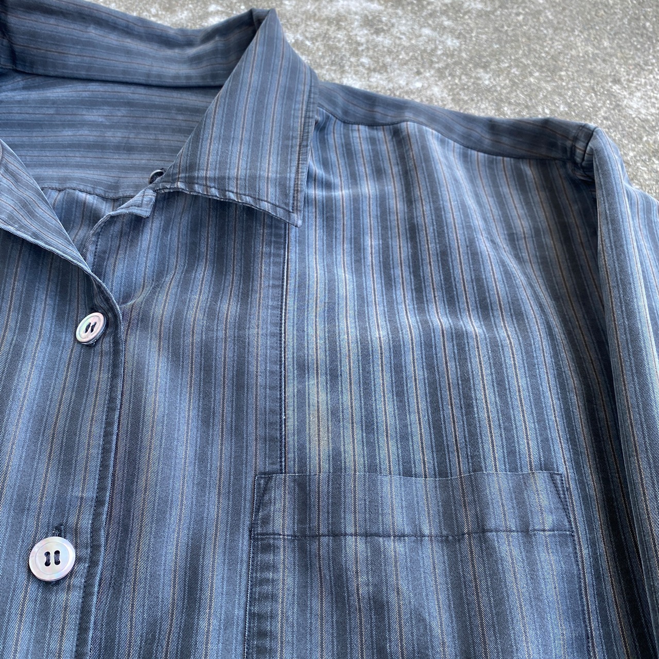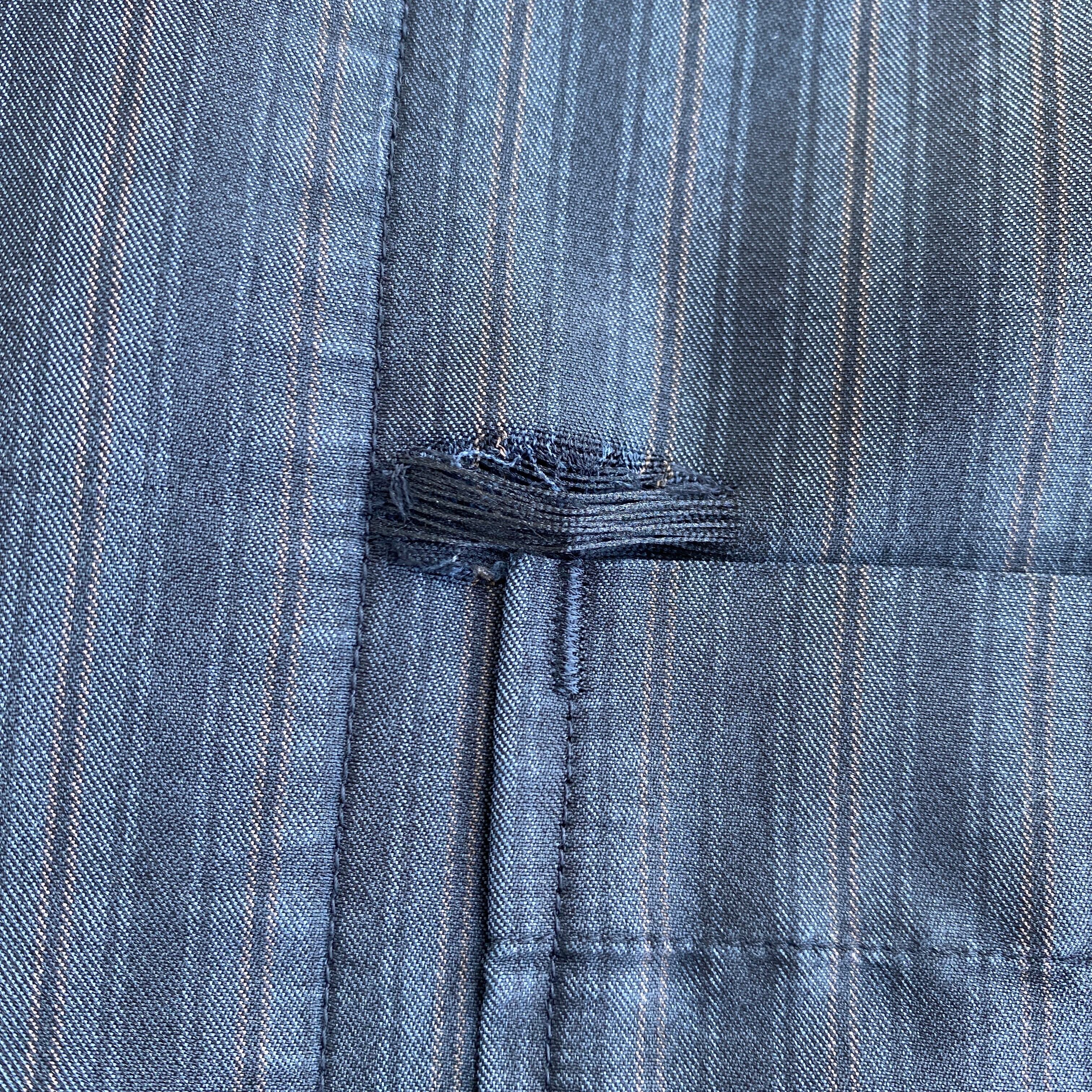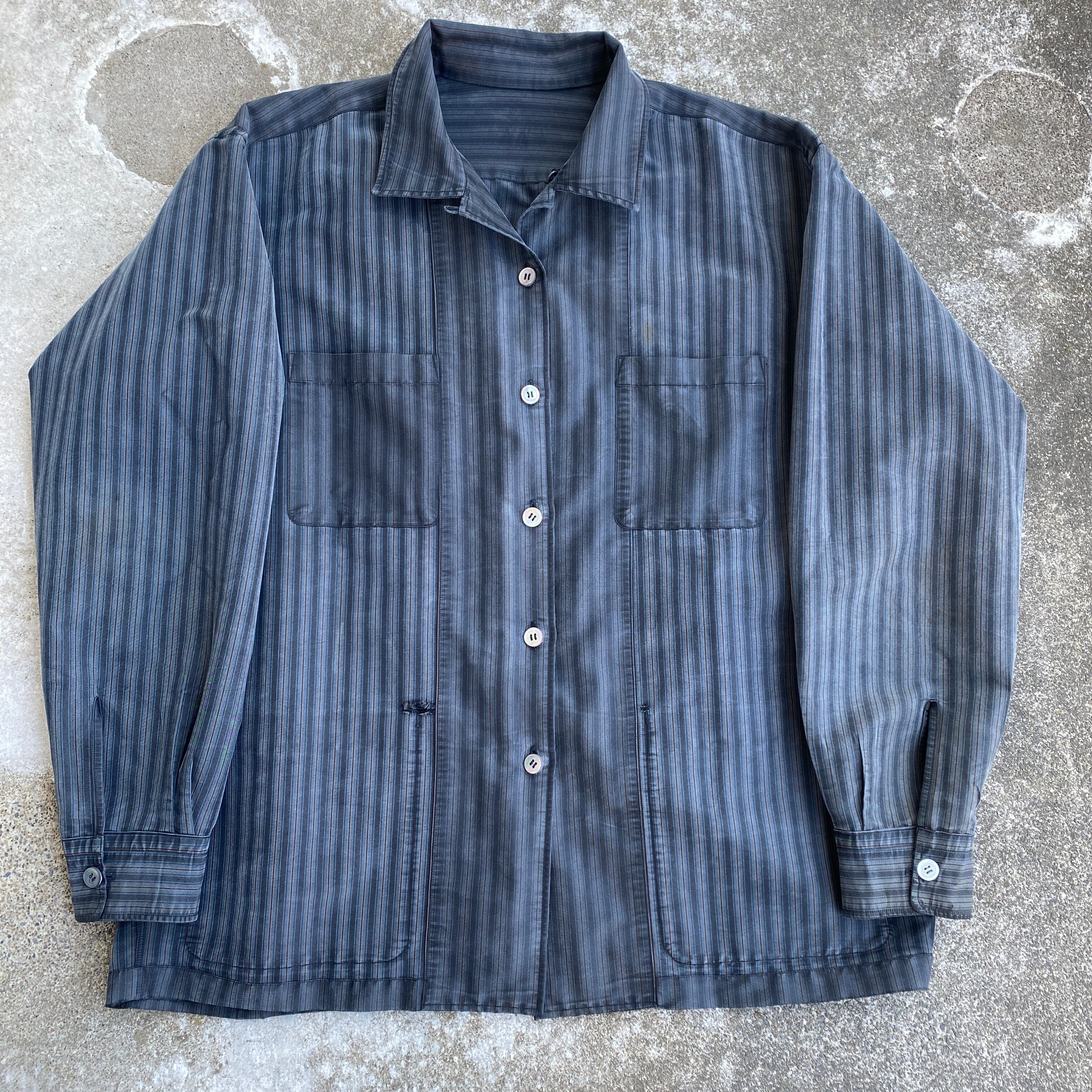 キュプラ×ポリエステル素材のハリコシのある素材感、上記素材に製品染めが施されることによって生まれた、鈍い光沢感のあるくすんだストライプの色目、ゆとりのあるシルエットが非常に格好良い一着。