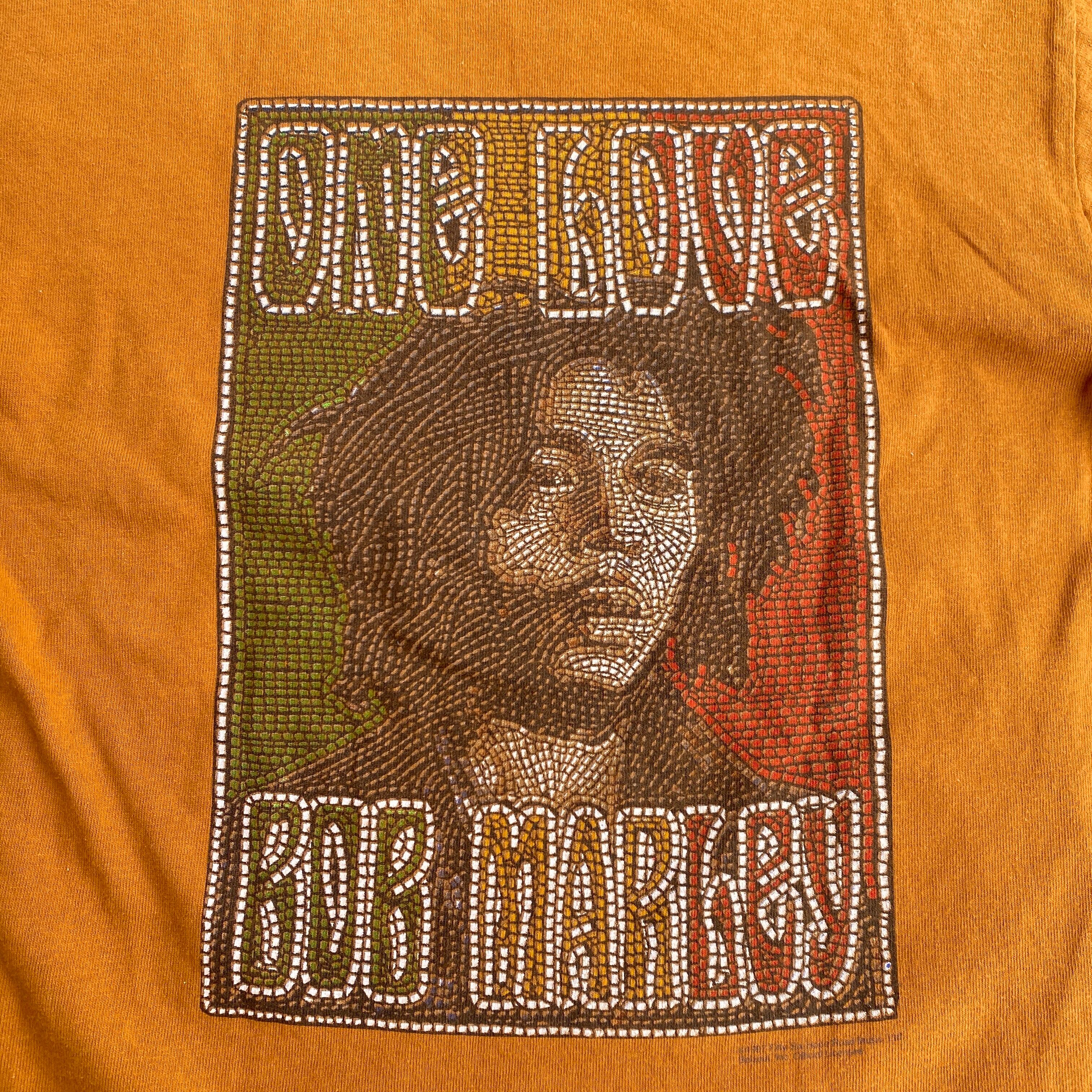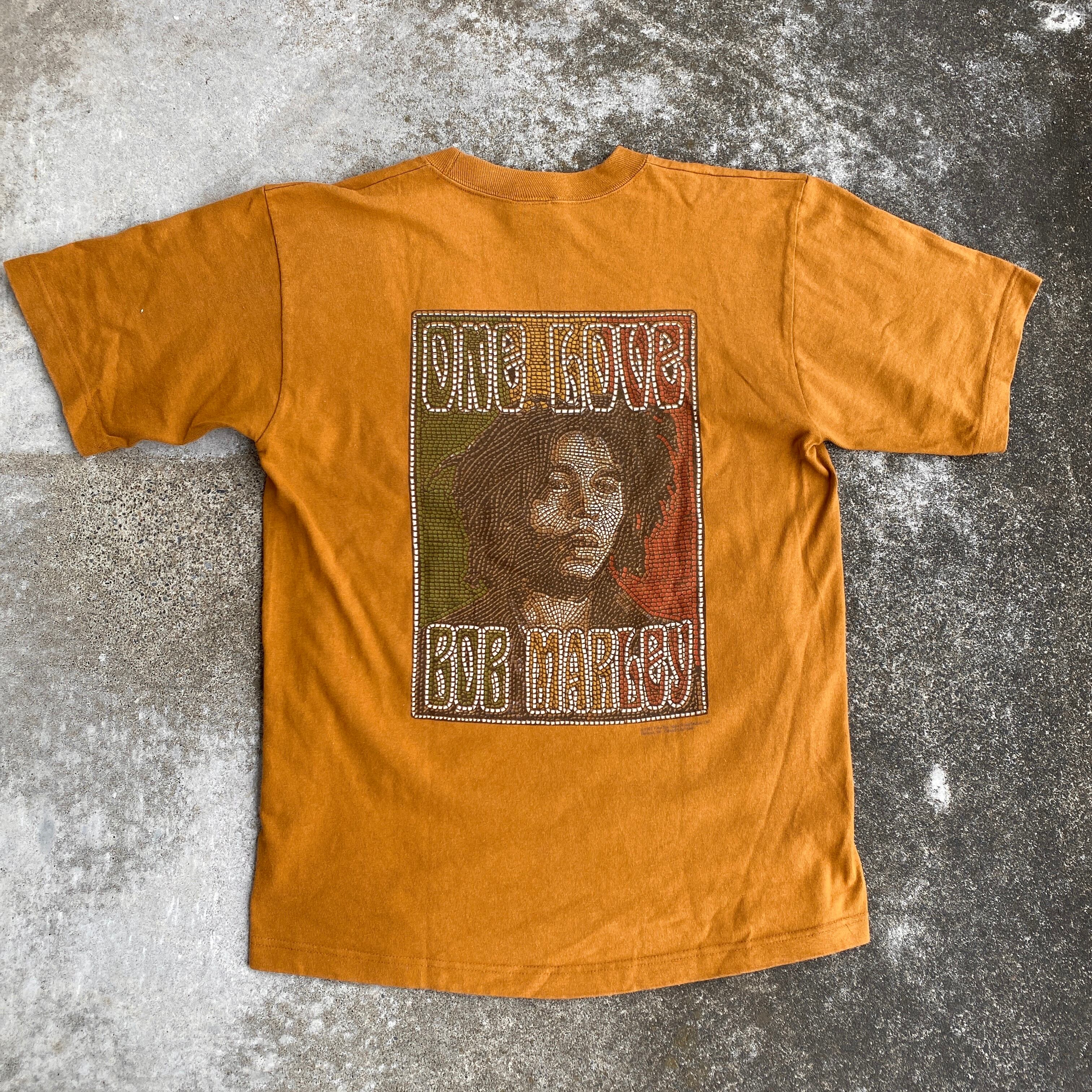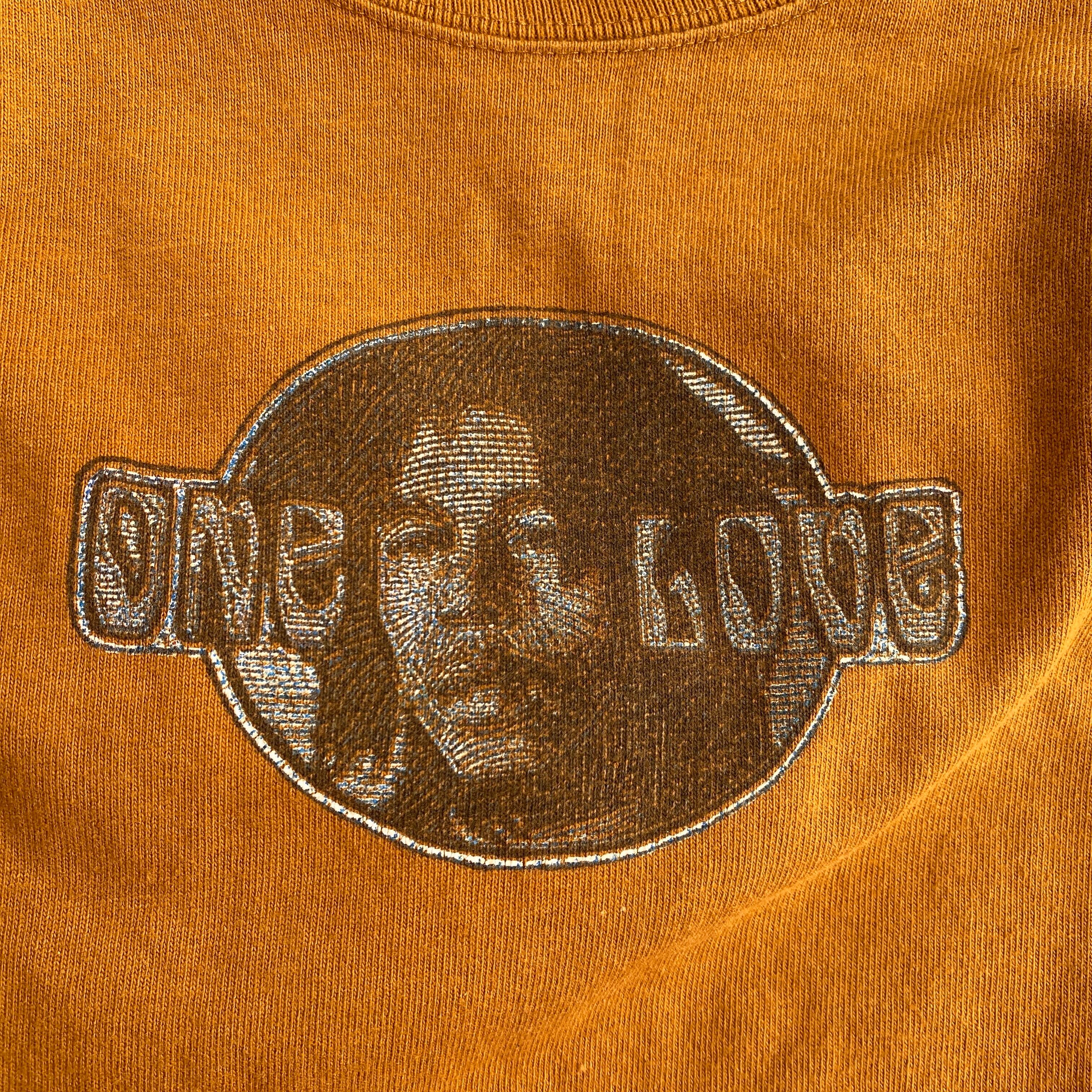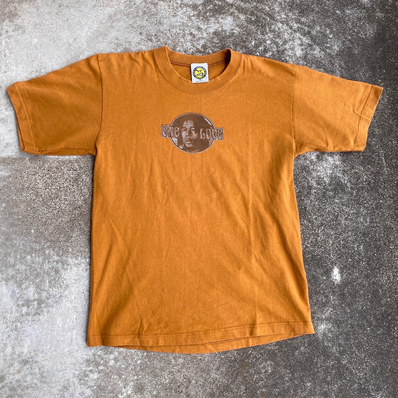 くすんだオレンジのボディに名曲「ワンラブ」の文字、アート調なボブマーリーのイラストが入った非常に格好良い一着。