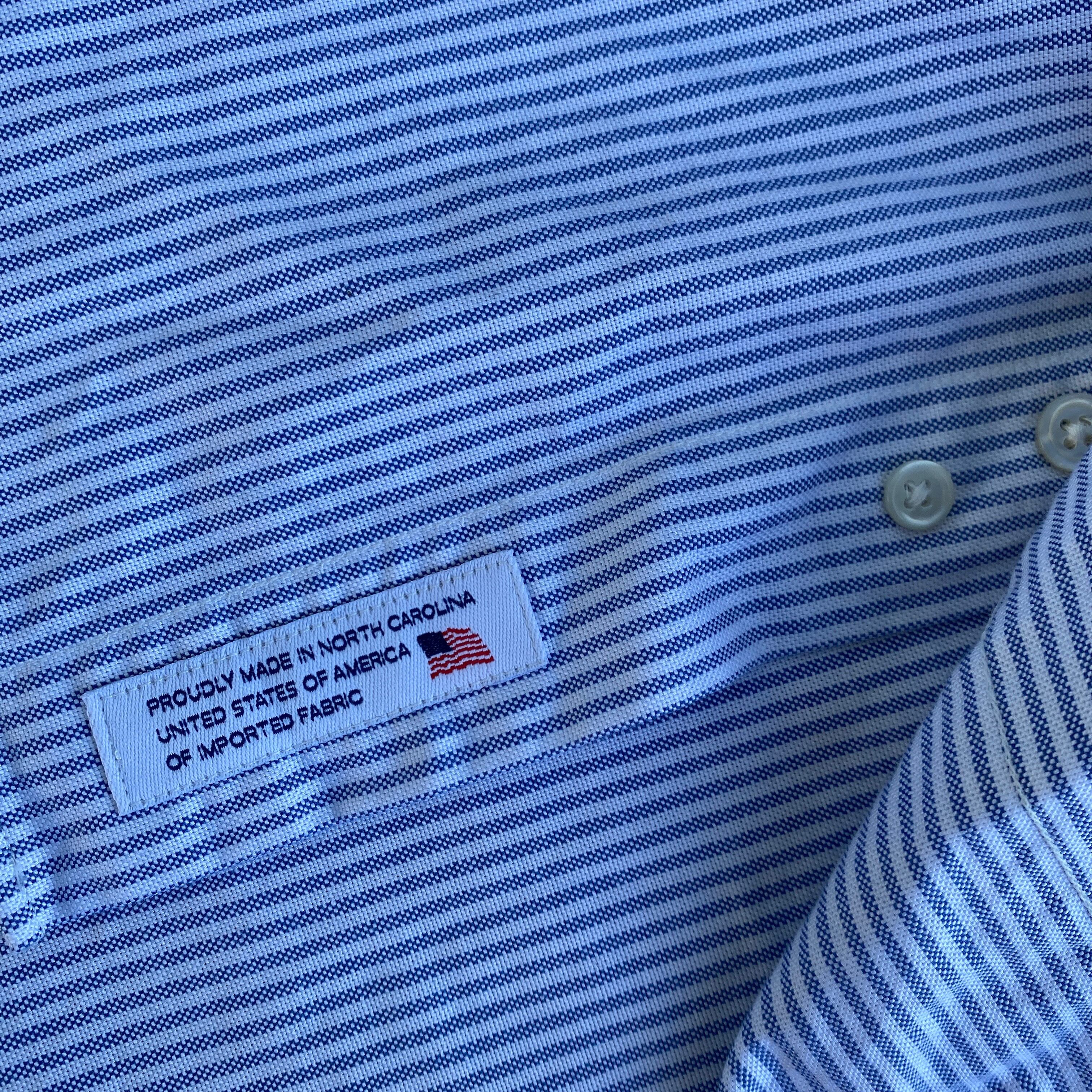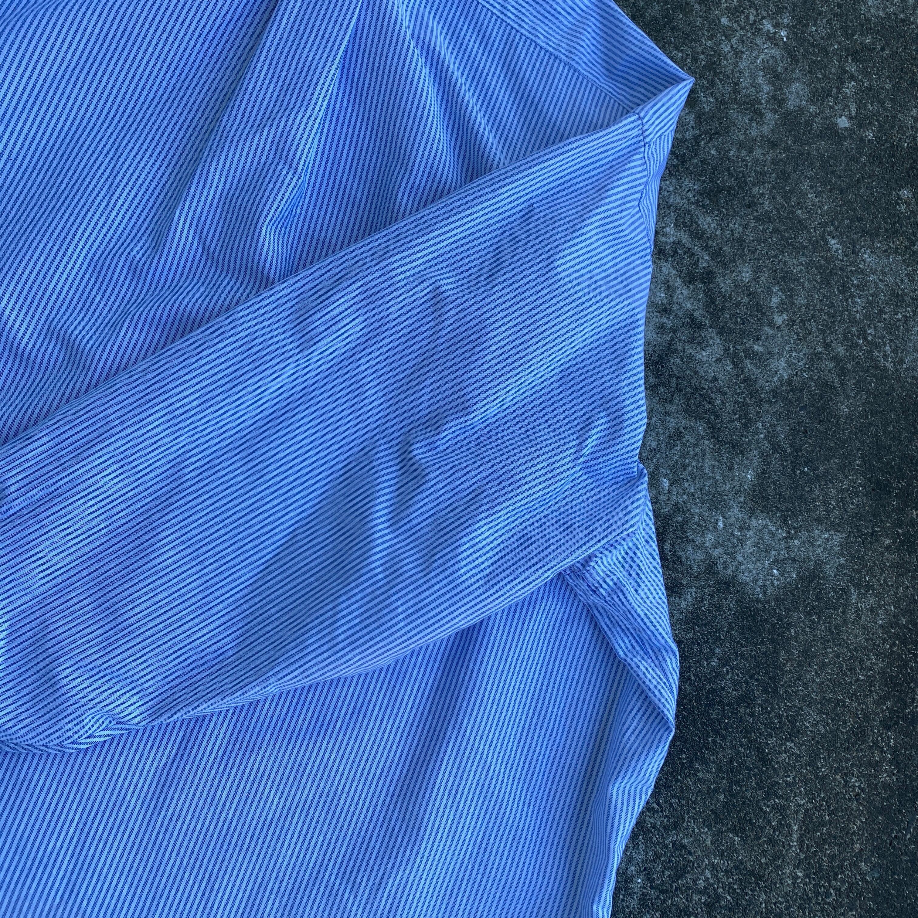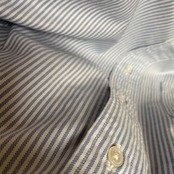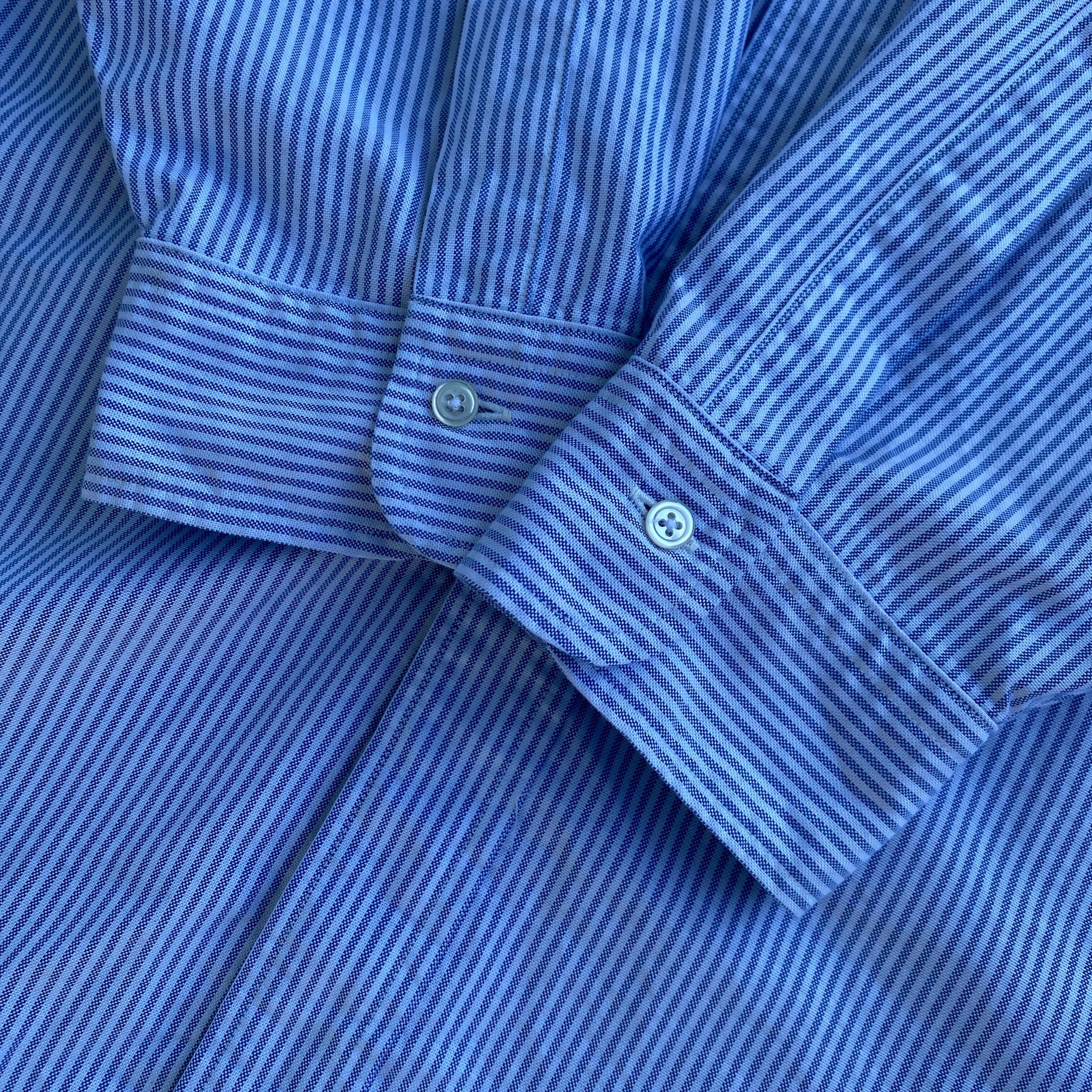 ピマコットンを使った上質なオックスフォード生地に、淡いサックス×ホワイトの綺麗な色目のストライプがクリーンで春らしい一着。