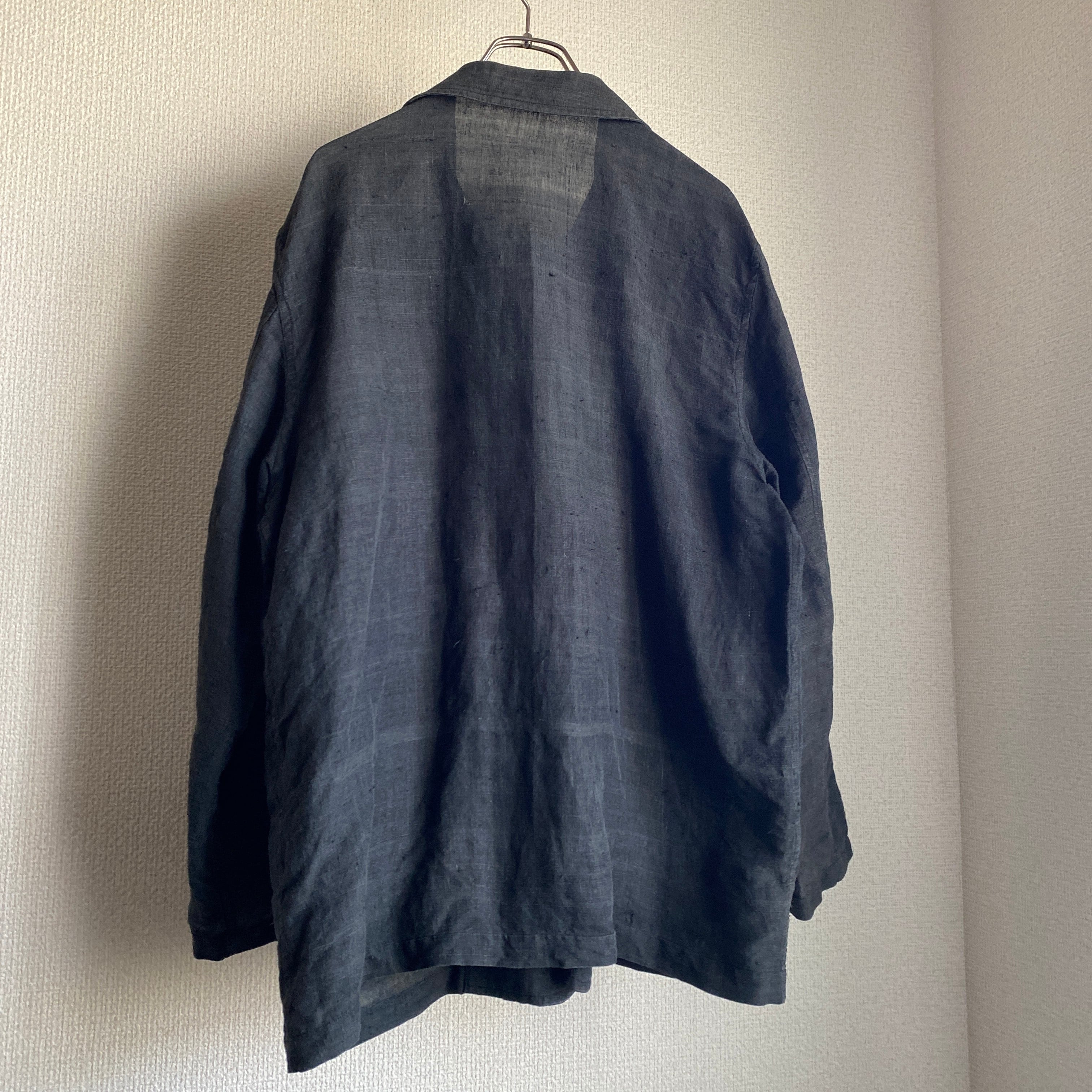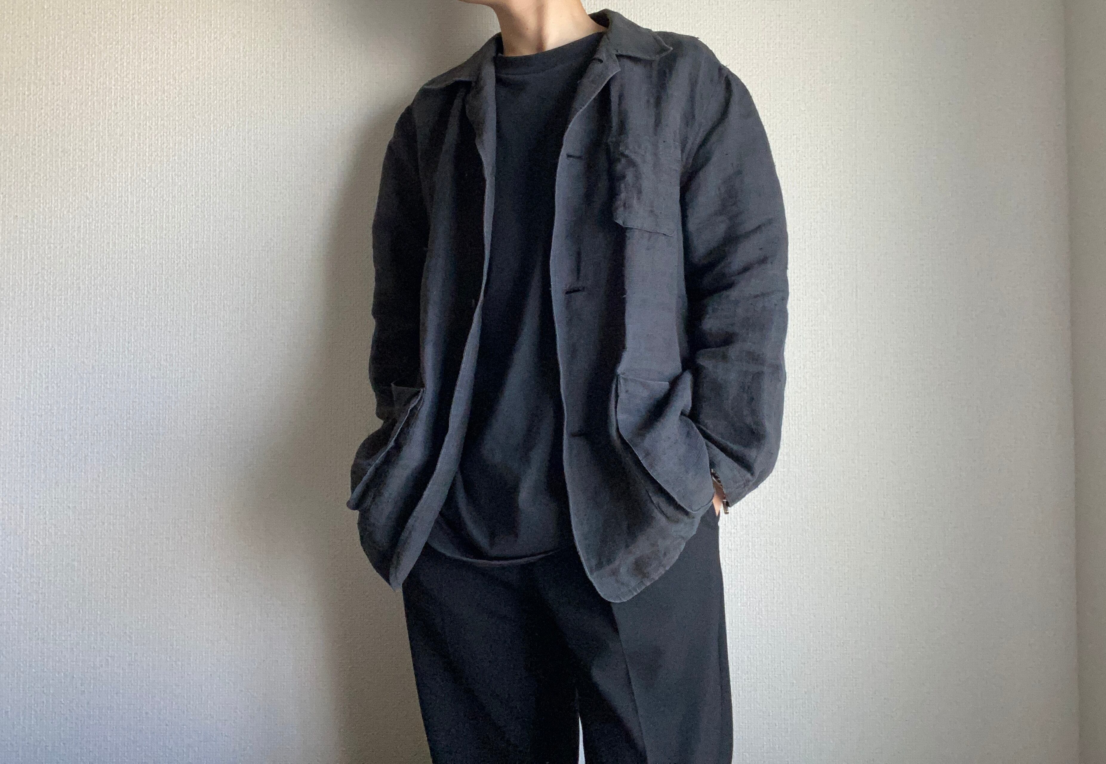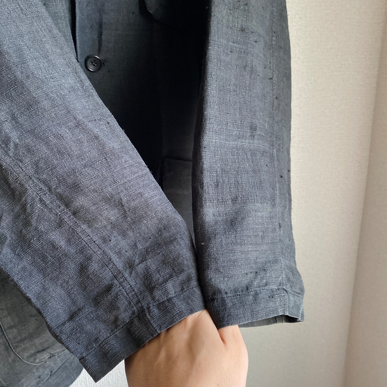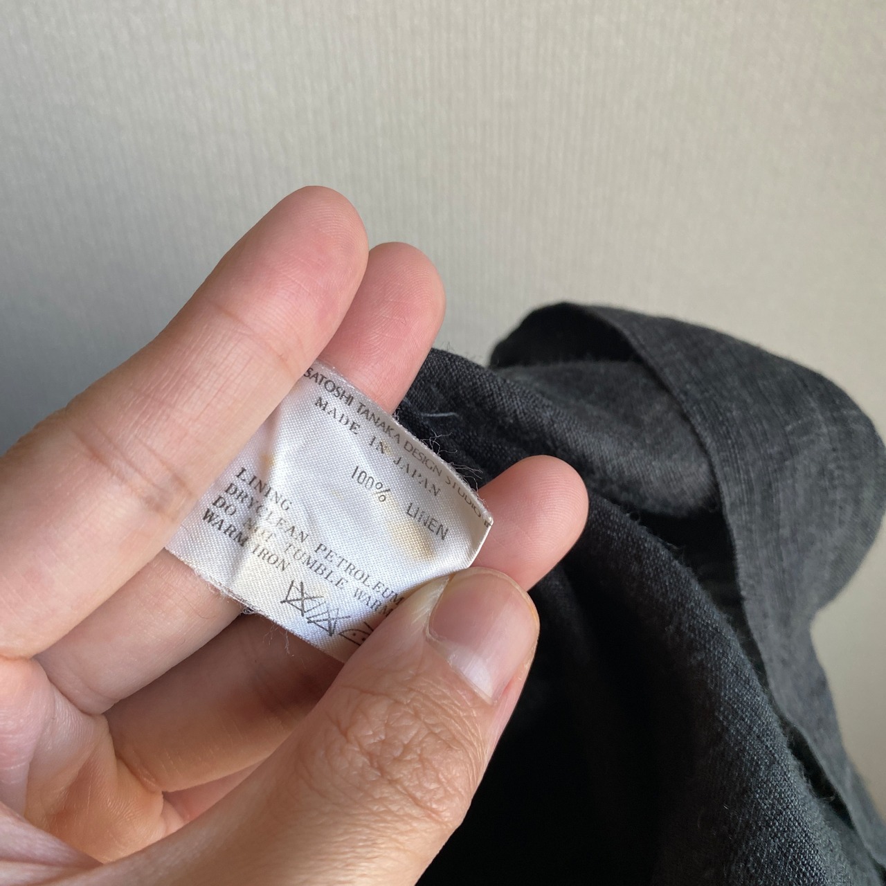 80年代にyohji yamamoto pour hommeのテキスタイルデザインや企画などをされていた「タナカサトシ」によるシグネチャーブランドで、ブラックカラーのヘビーリネンを用いた、無骨でモードな雰囲気が素晴らしい一着。