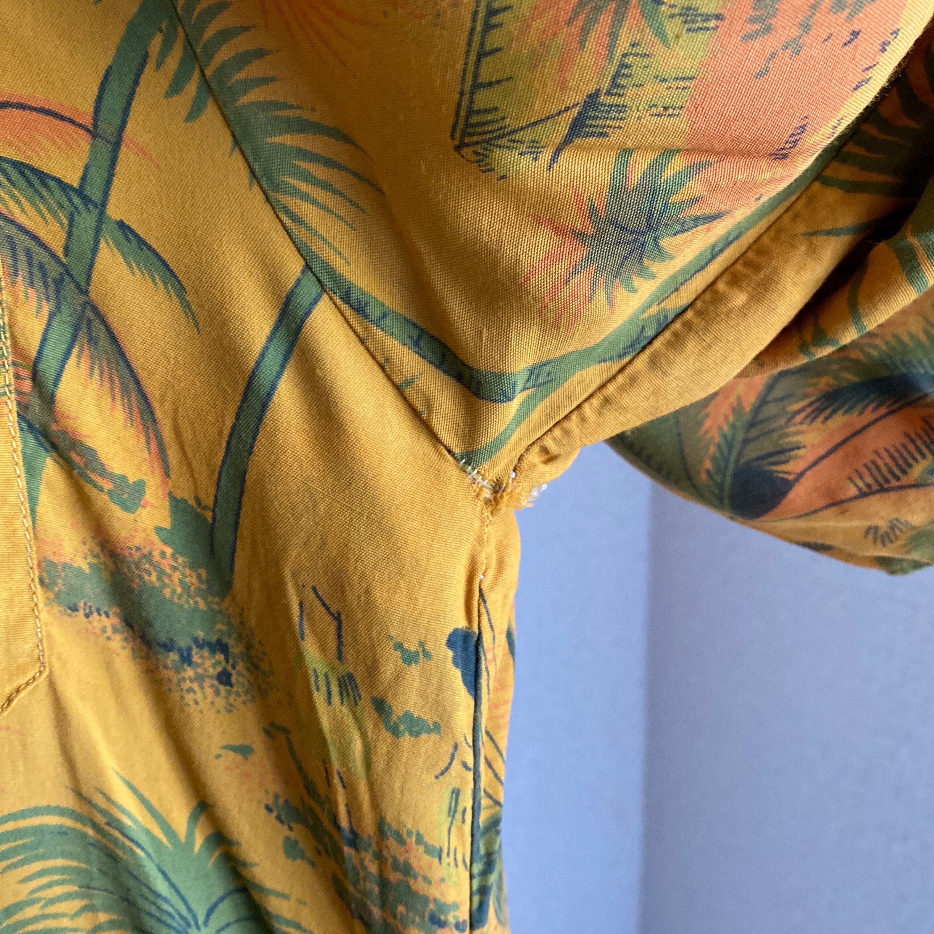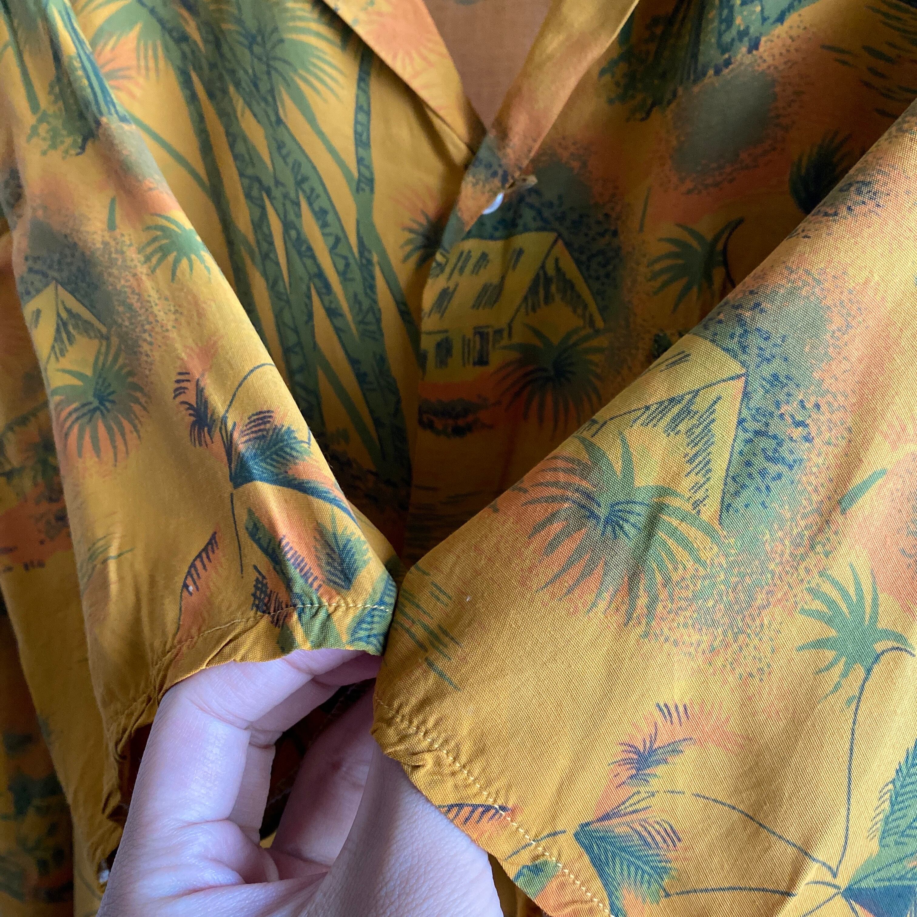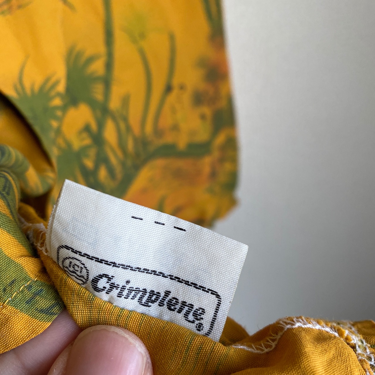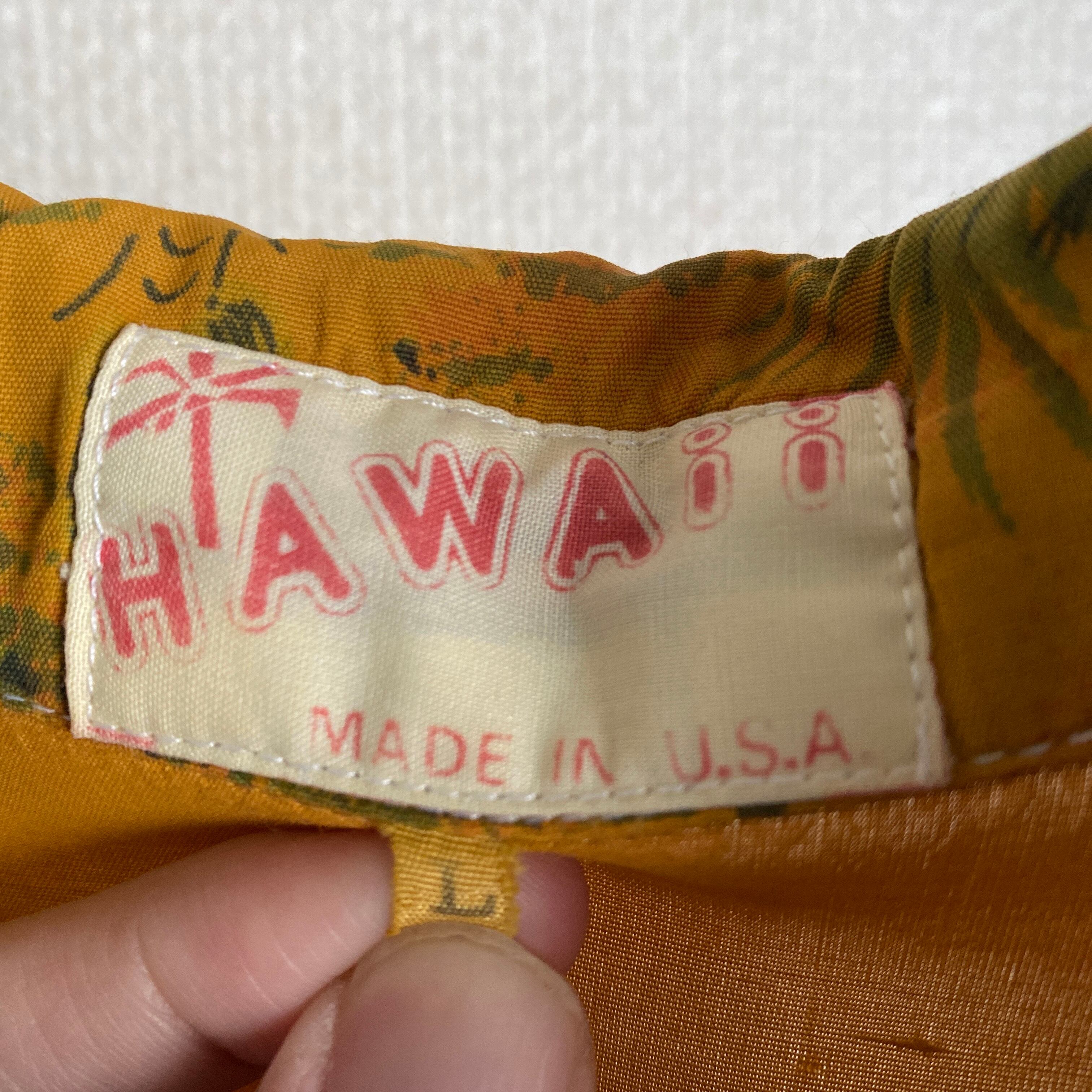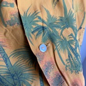 〜1960年代頃のUSA製オープンカラーレーヨンアロハシャツになります。(crimpleneが誕生したのが1959年、70年代には買収されていることや、襟型などから見て60年代で間違いないと思われます)