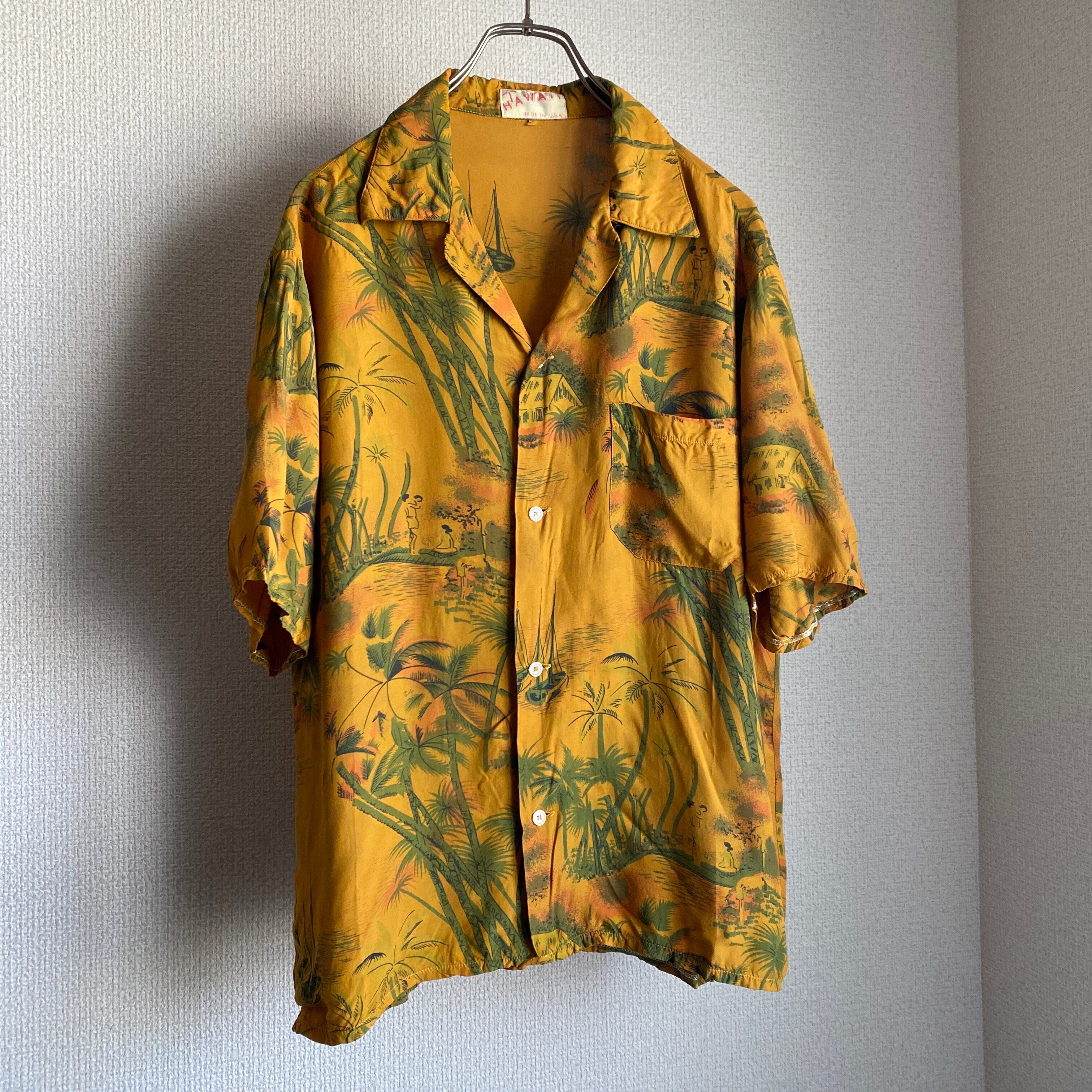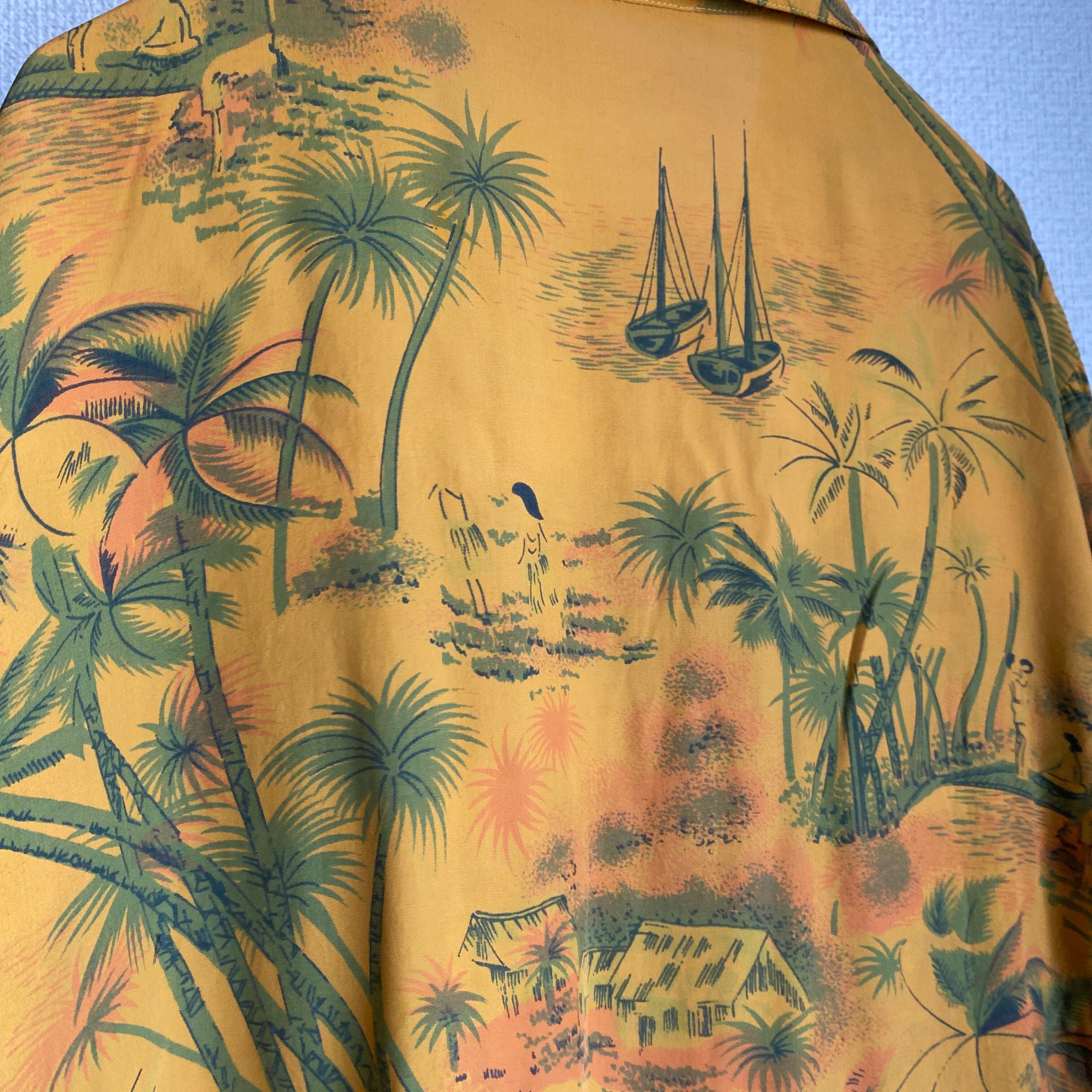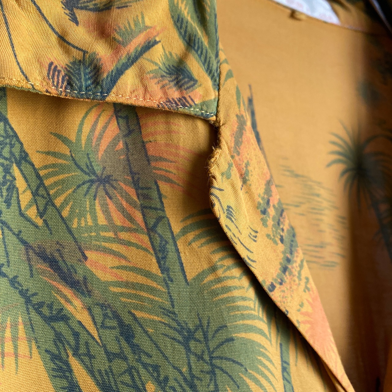 アロハシャツでは非常に珍しい山吹色ベースに、ヤシや人などのらしいデザインが非常に格好良い一着。