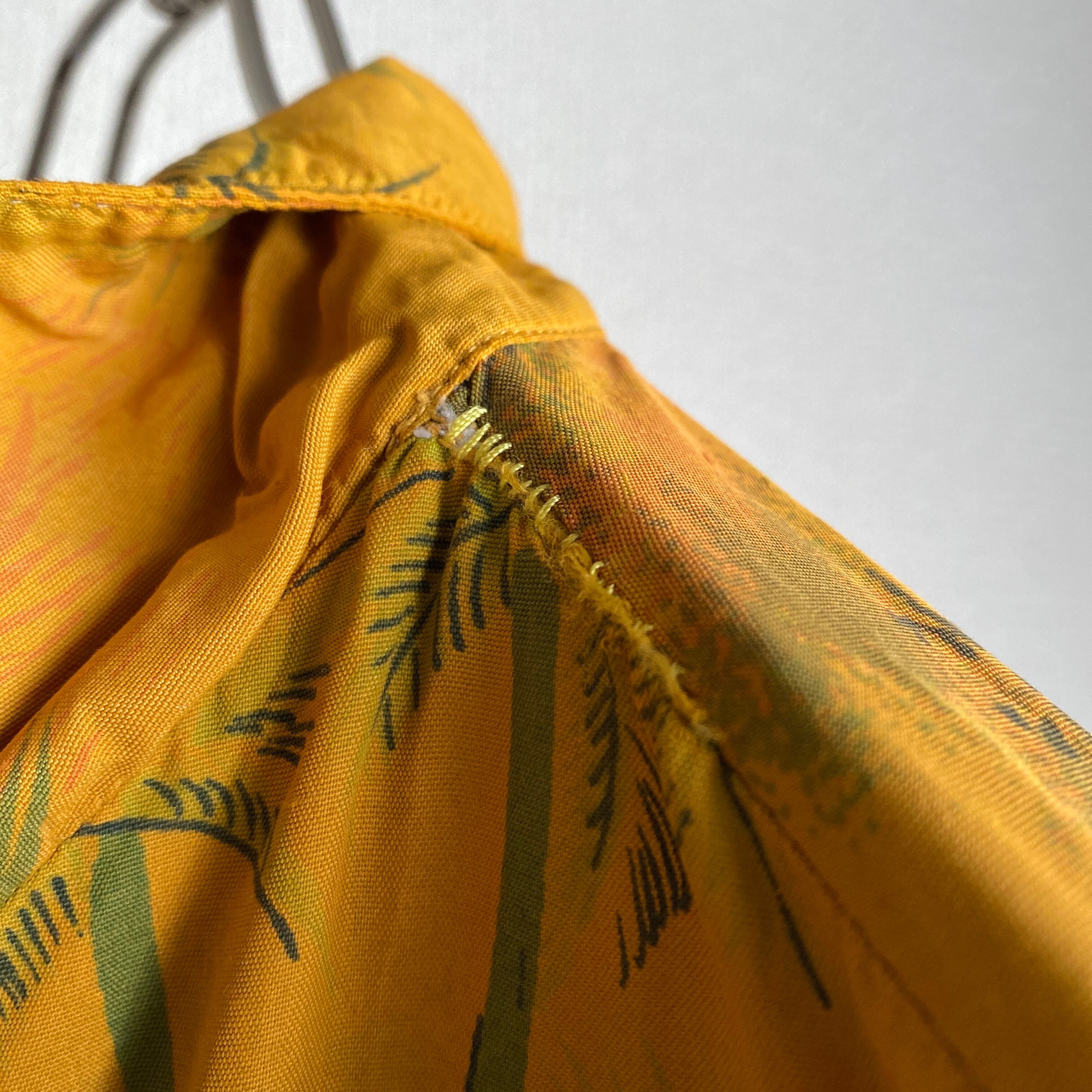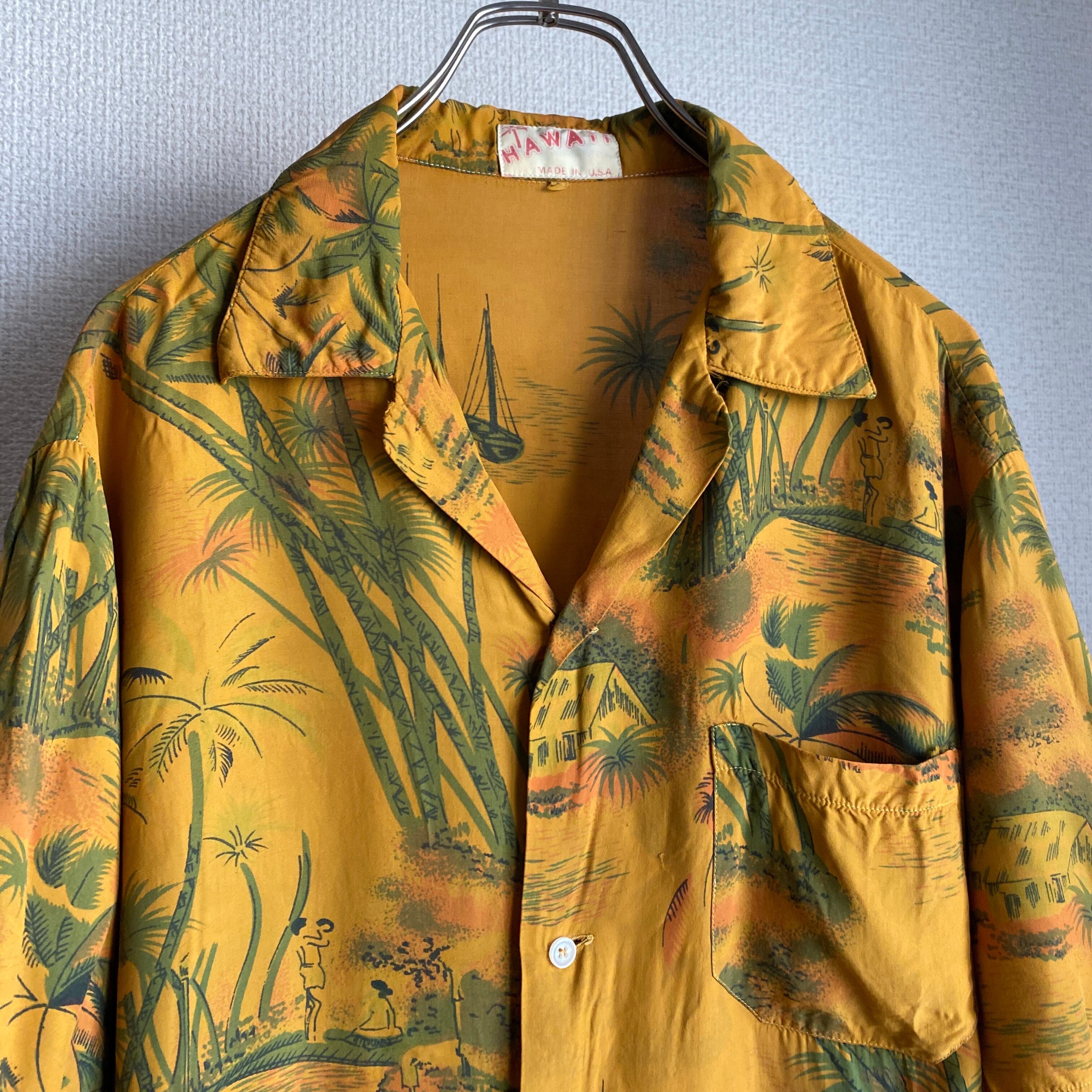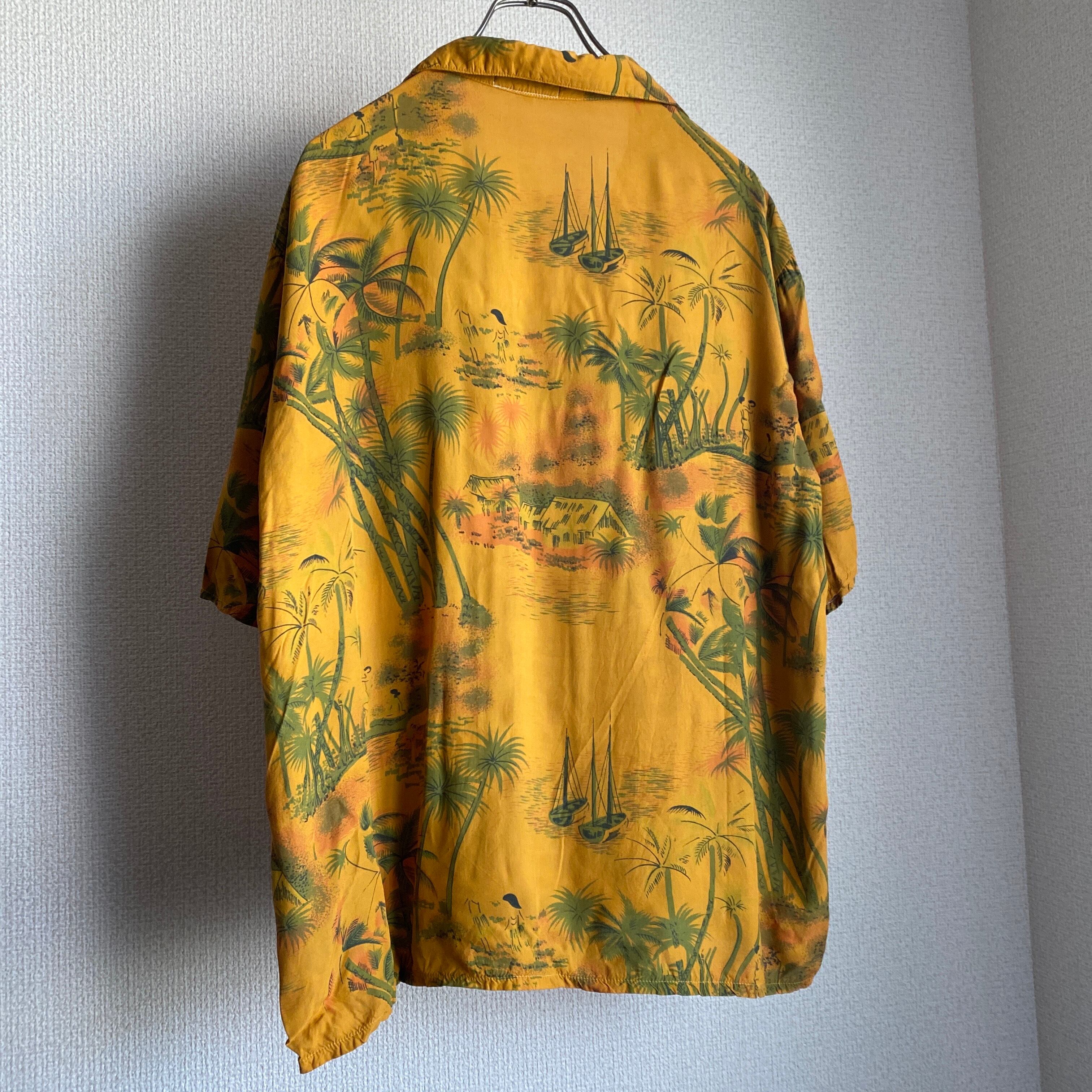 アロハシャツでは非常に珍しい山吹色ベースに、ヤシや人などのらしいデザインが非常に格好良い一着。