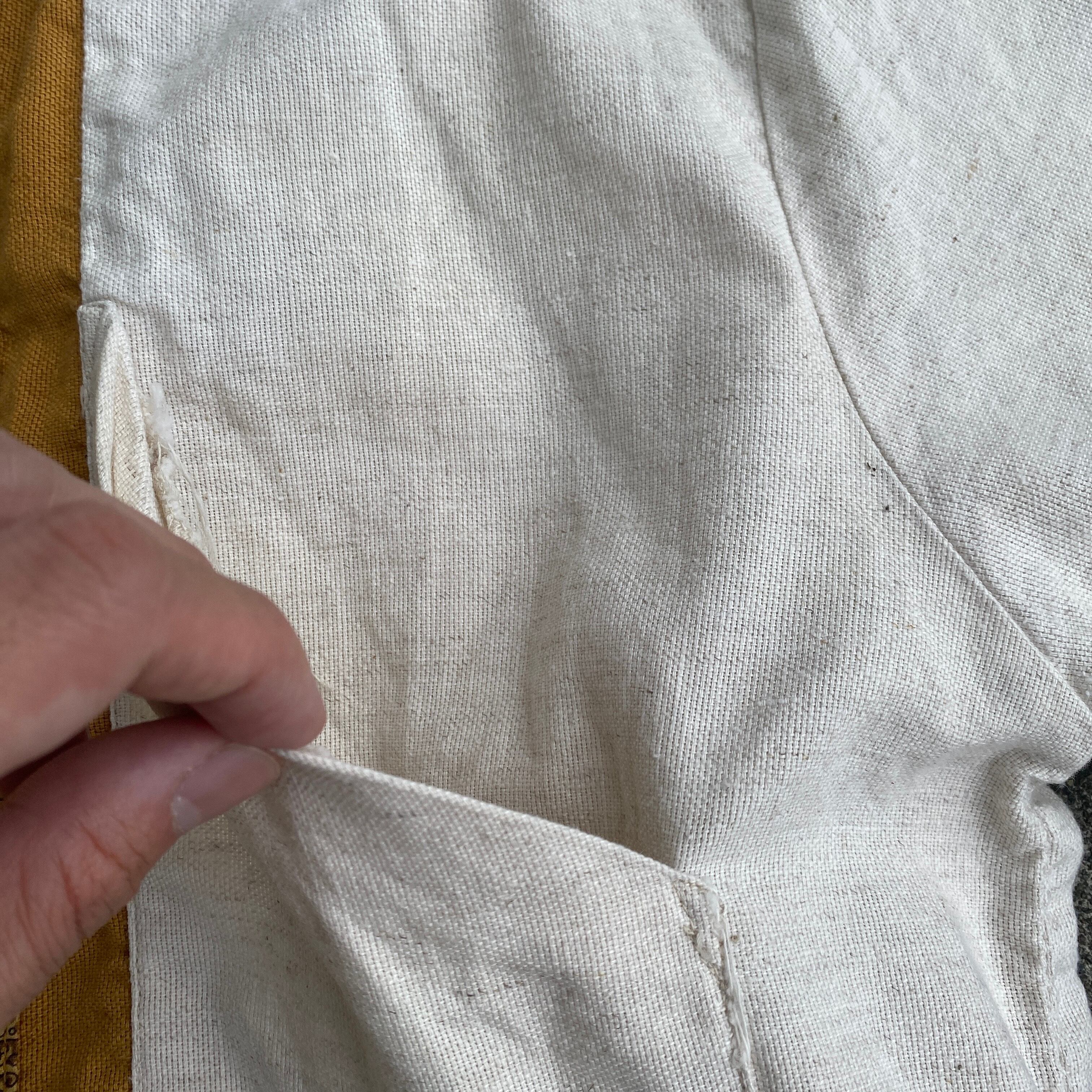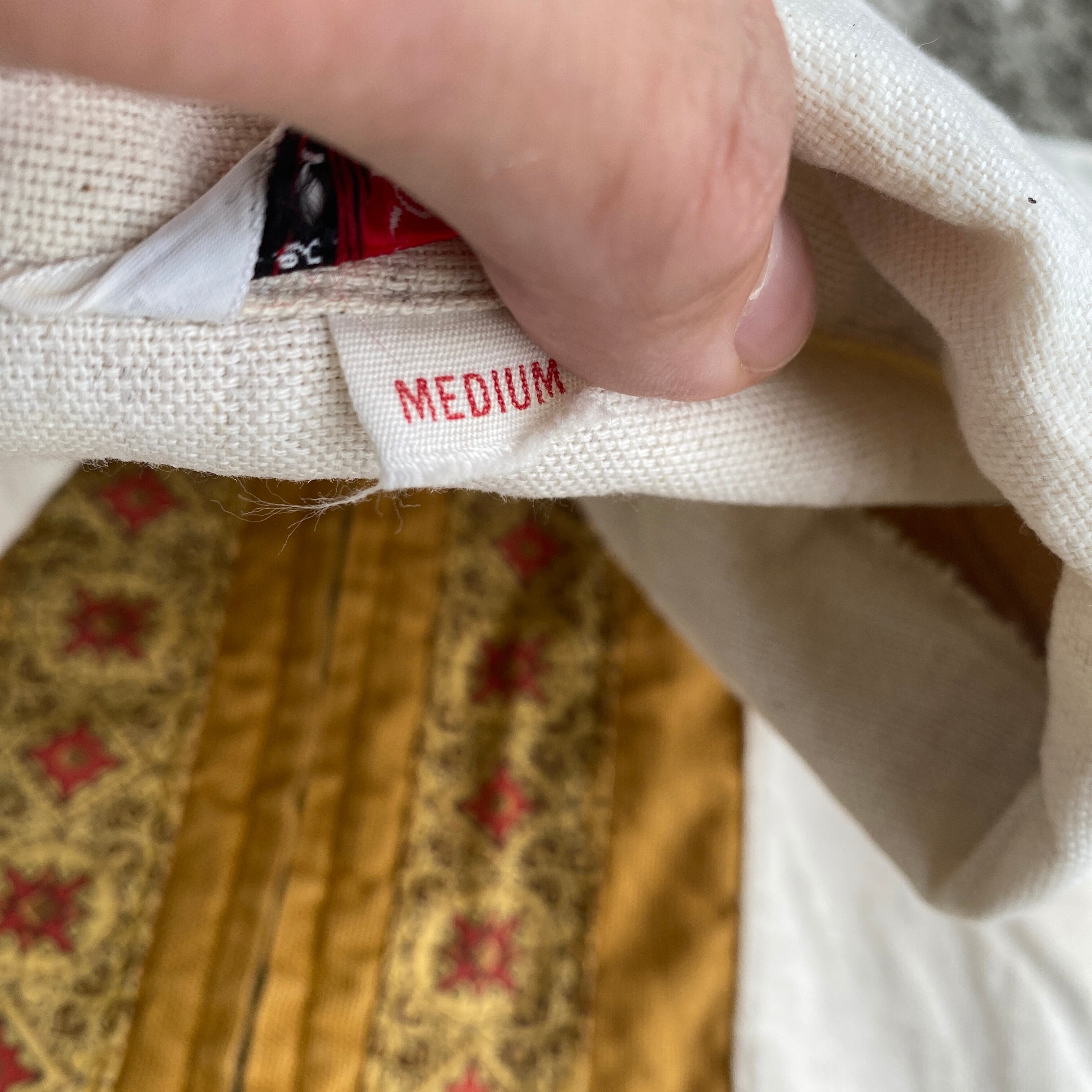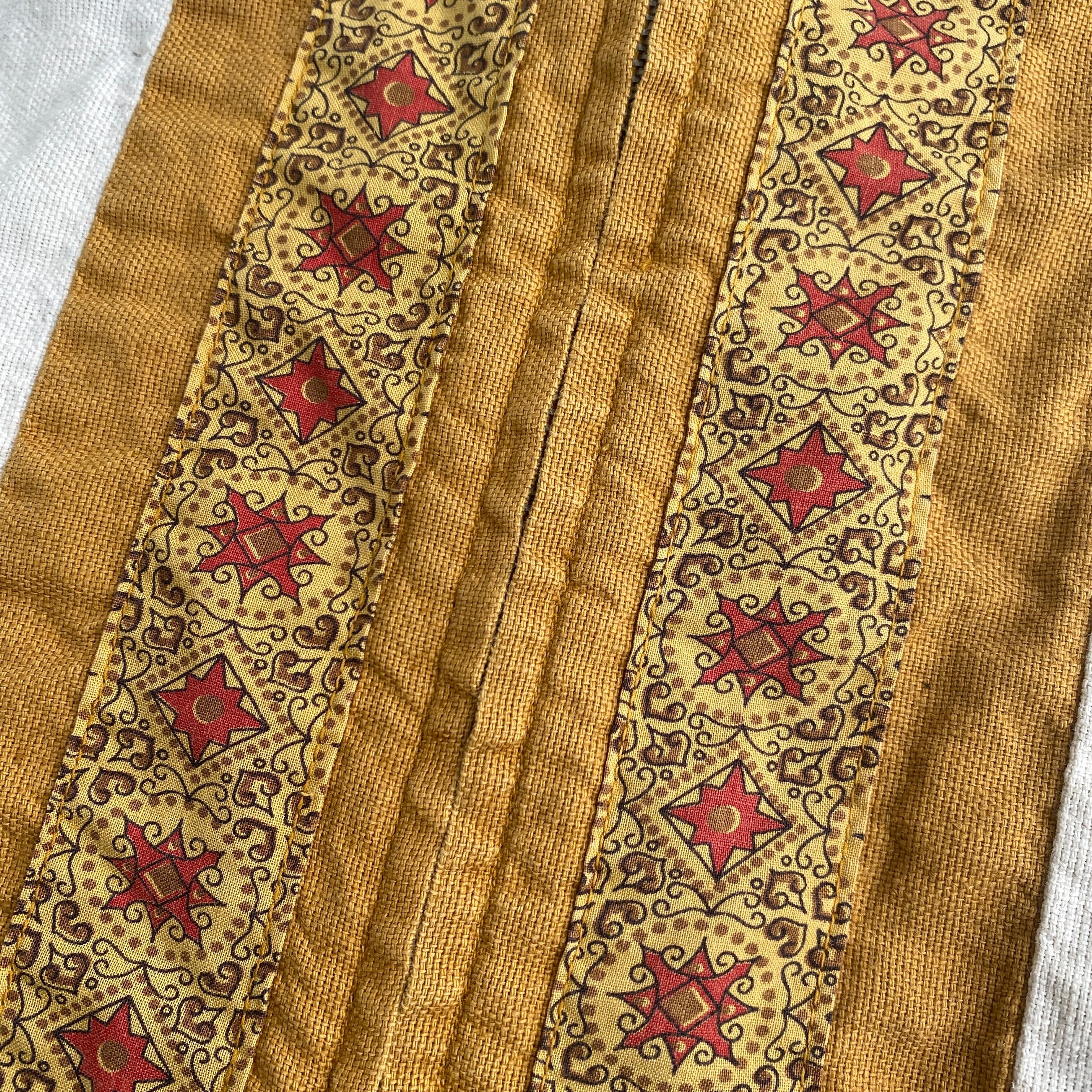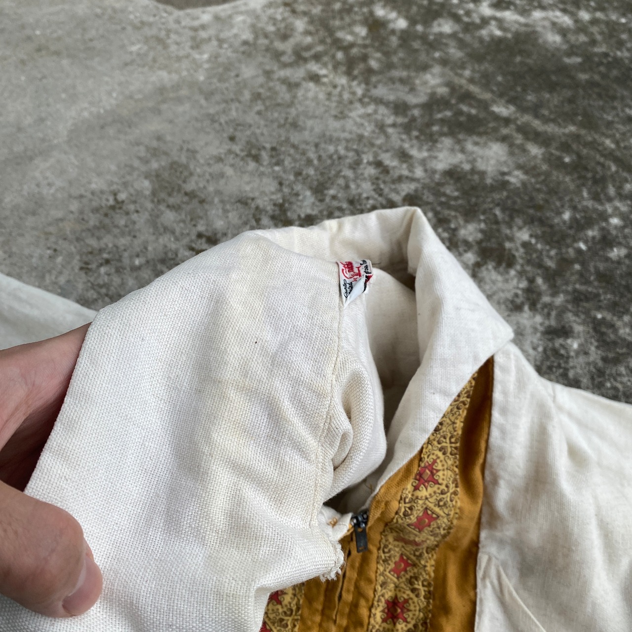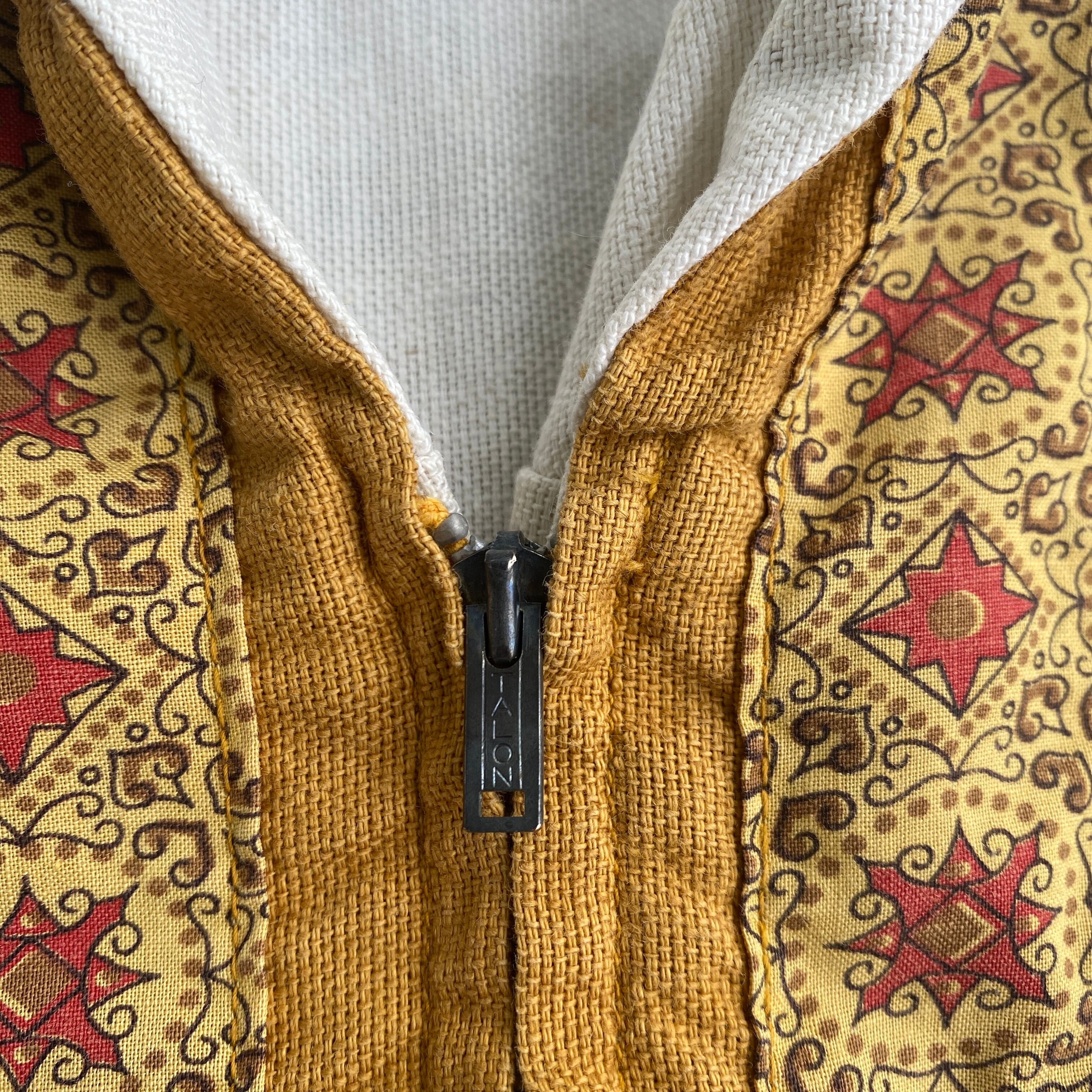 ナチュラルカラーのやや地厚なコットン生地に、バティックのような幾何学、民族柄の切り替え、裾はブルゾンのようなデザインと、非常に珍しい一着。