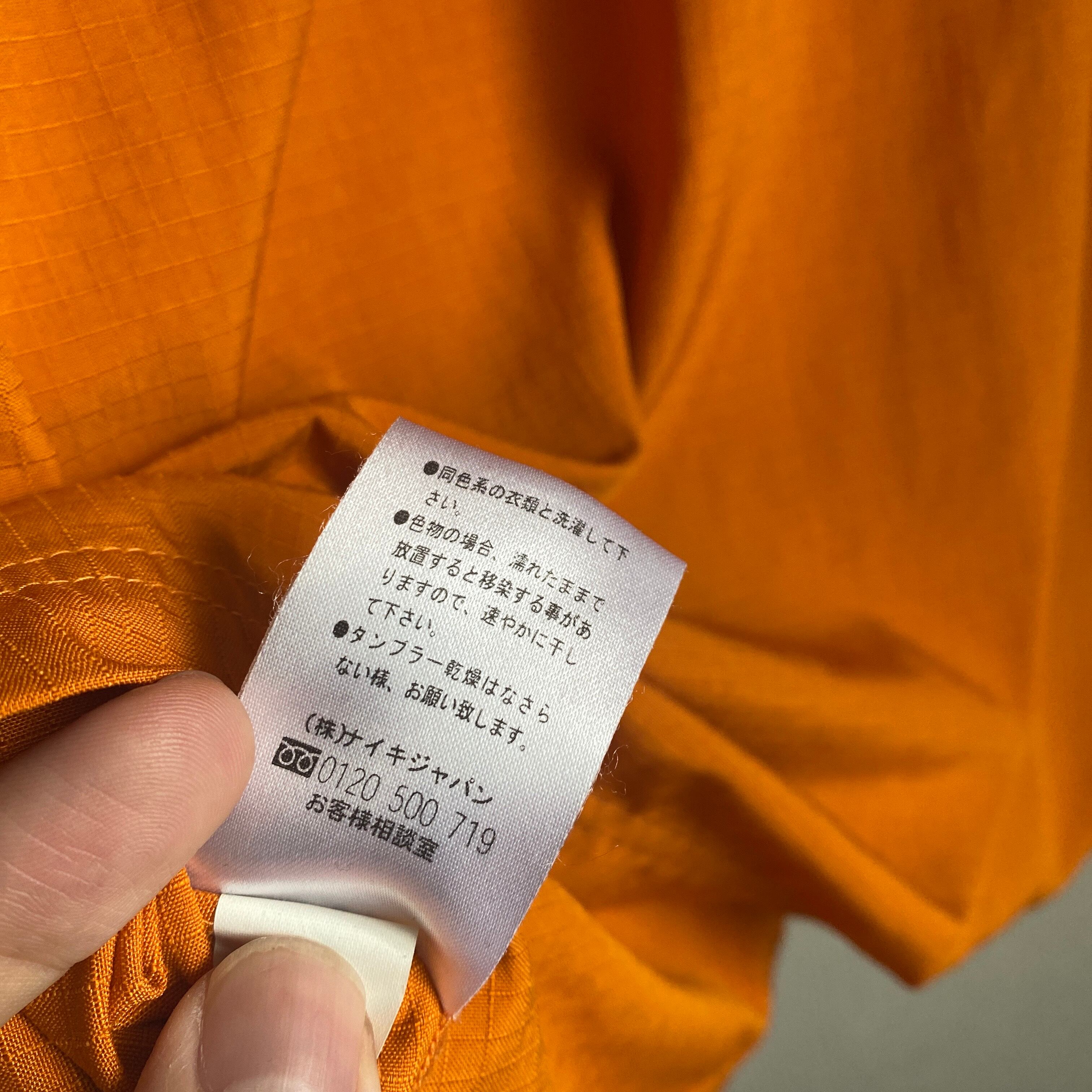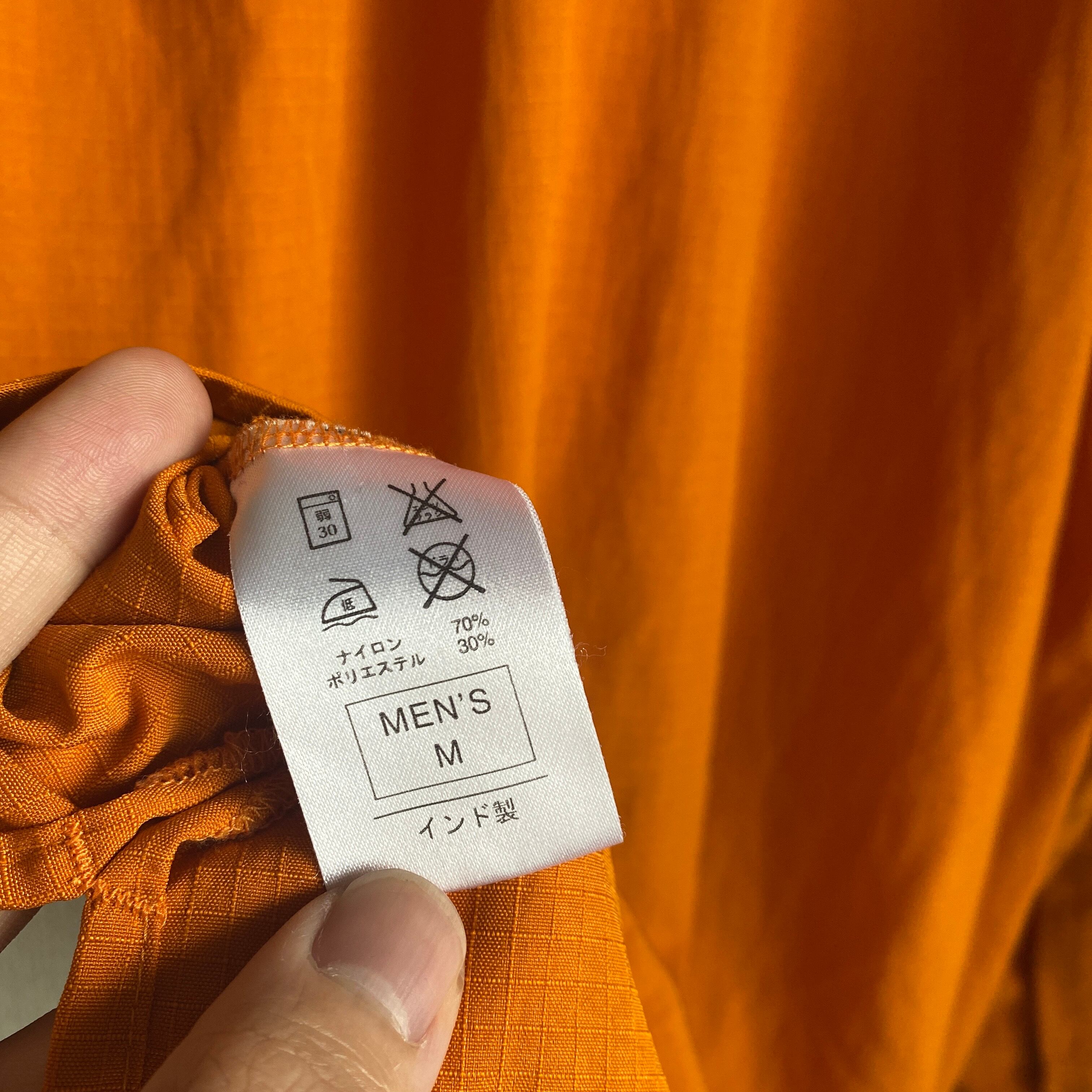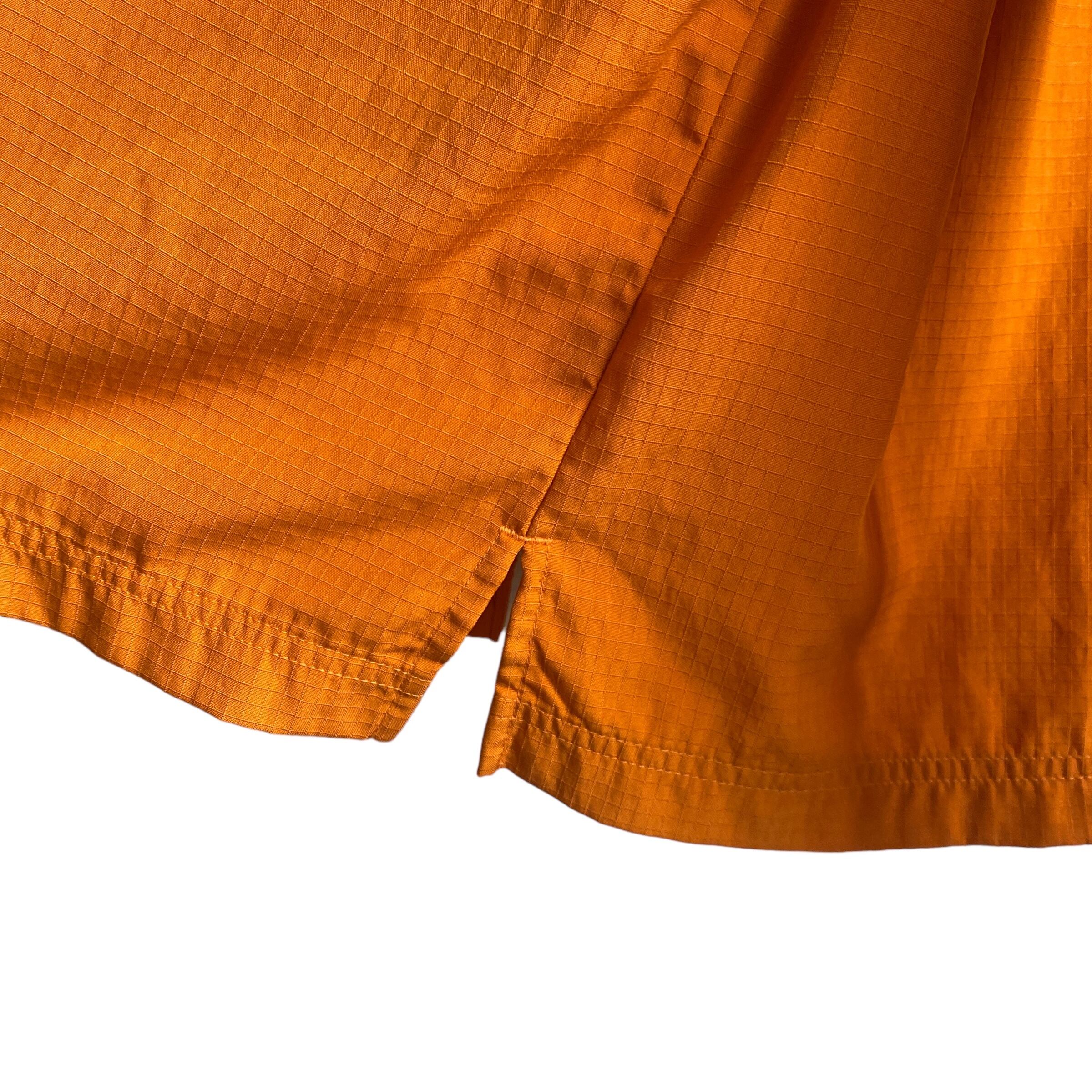 やや暗めの綺麗なオレンジカラーに、シャリ感のあるリップストップナイロンの素材感が非常に格好良い一着。