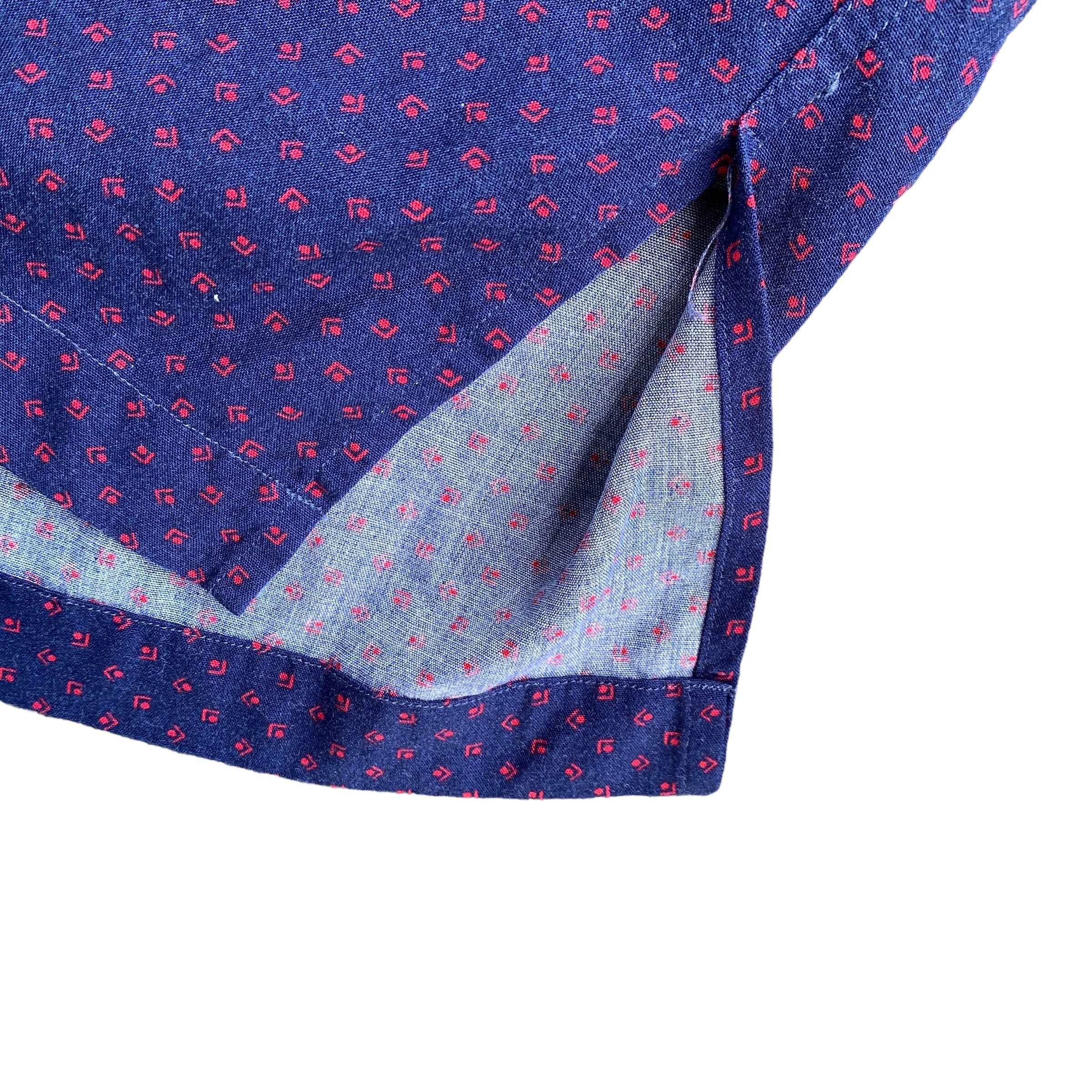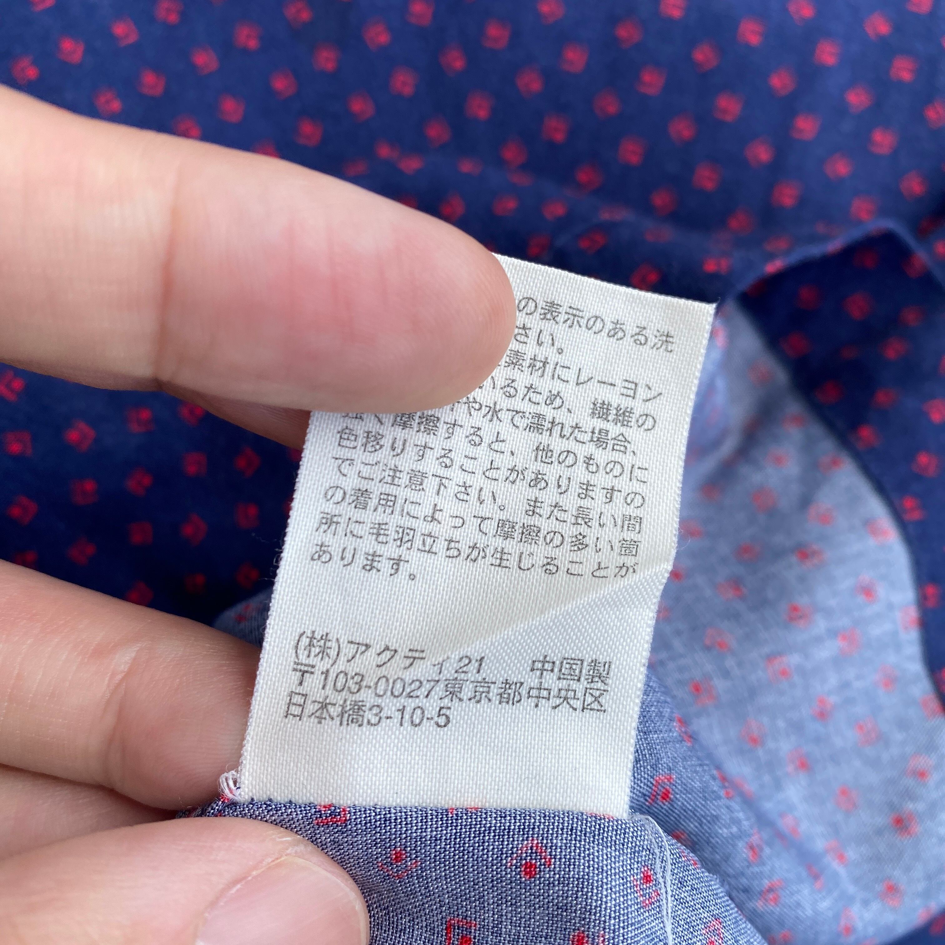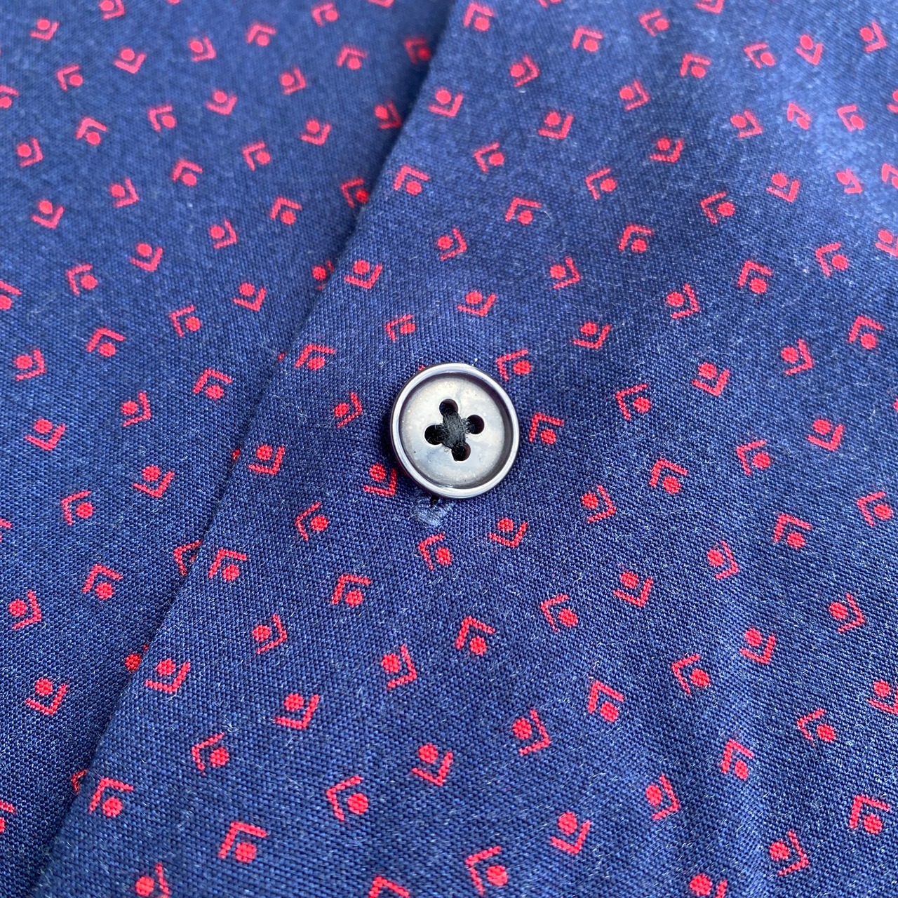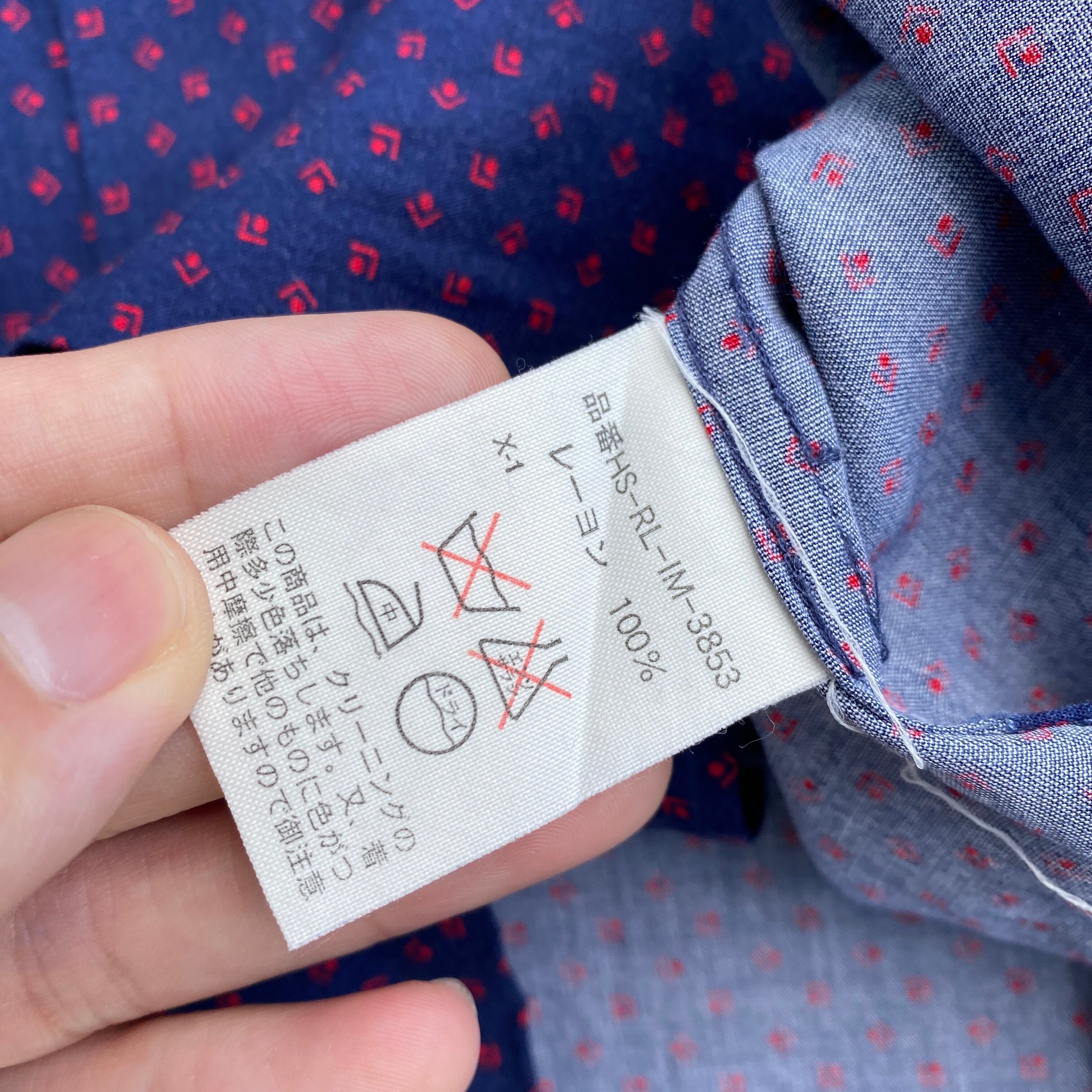 程よく肉厚で落ち感の良いレーヨン生地に、ネイビー×レッドの細かい小紋パターンが非常に格好良い一着。