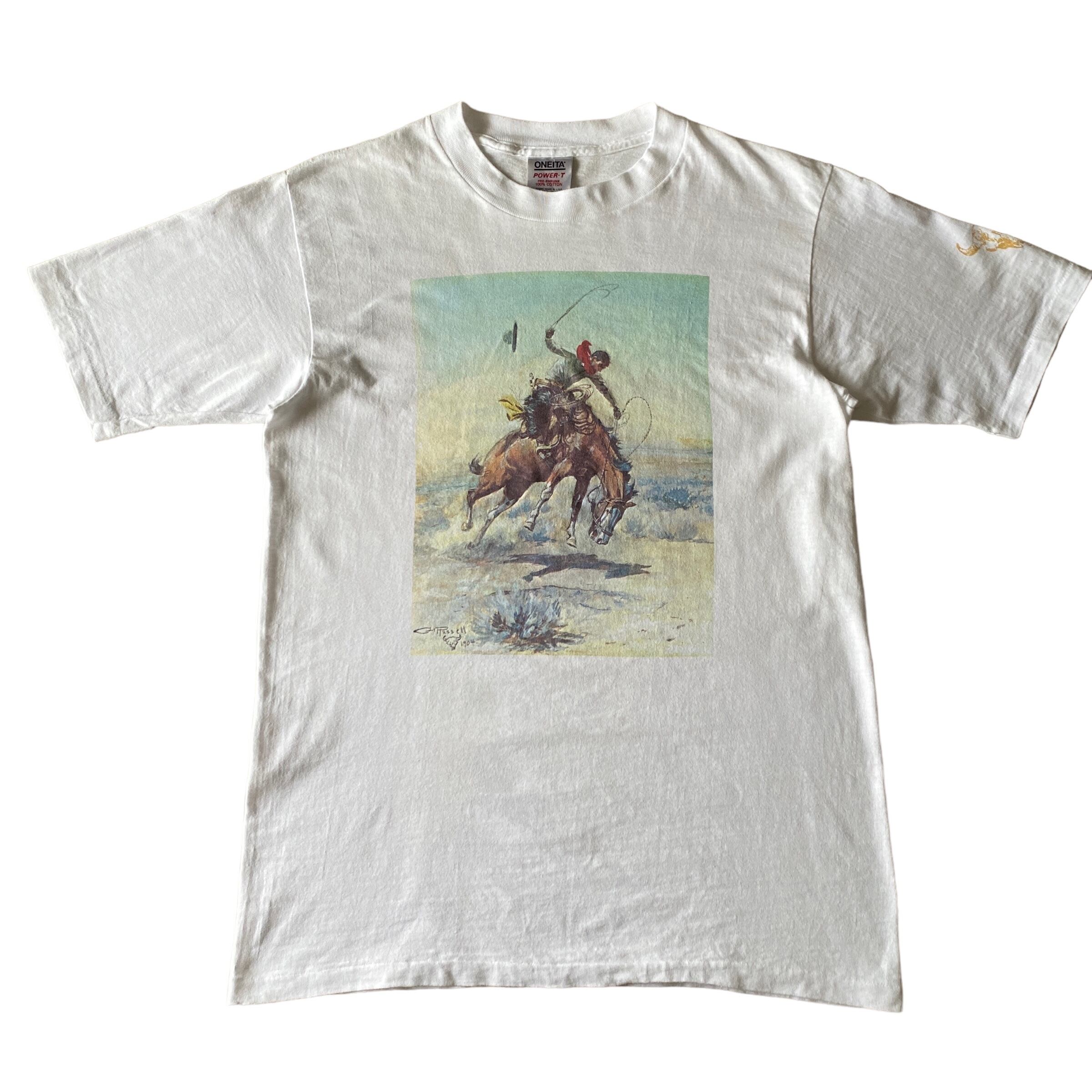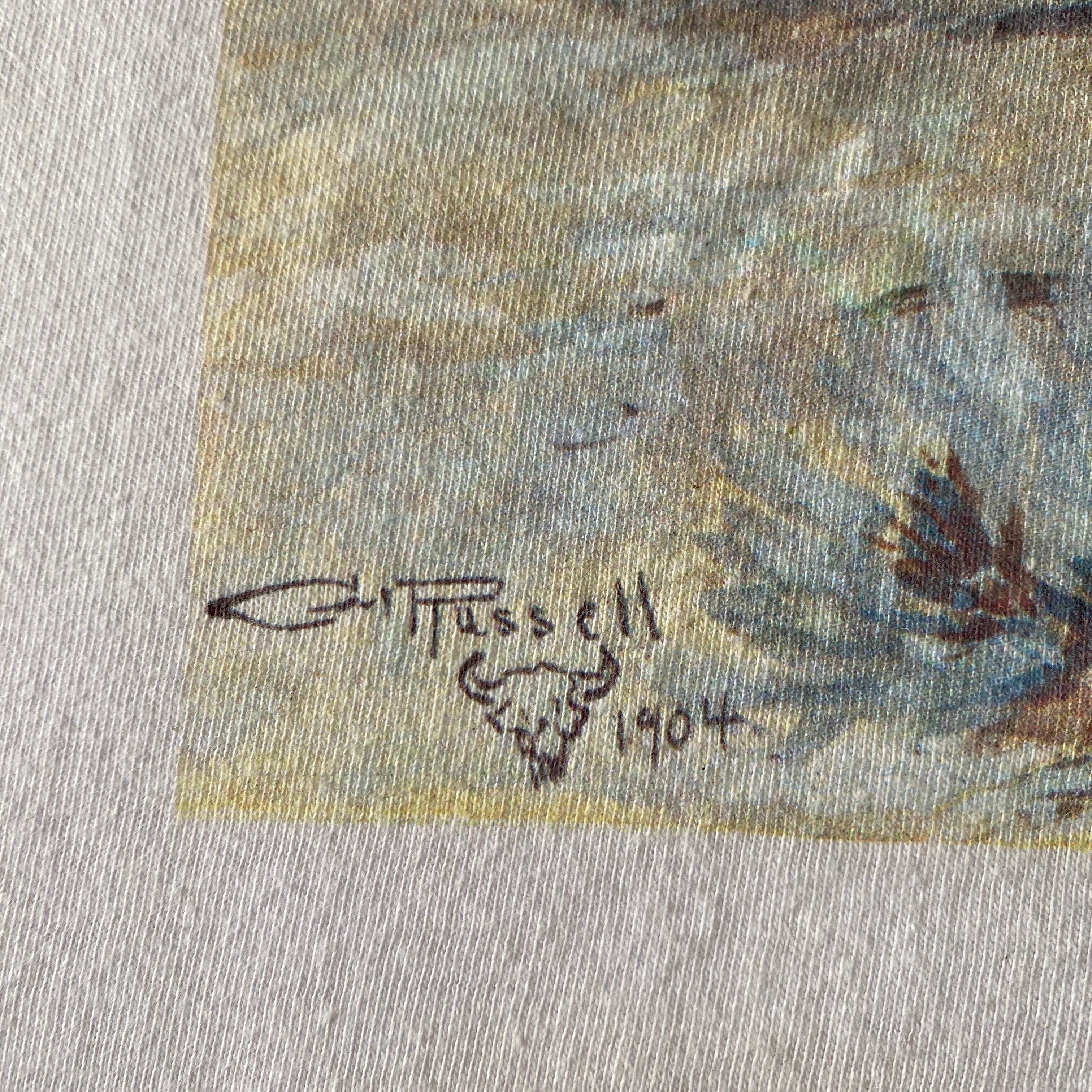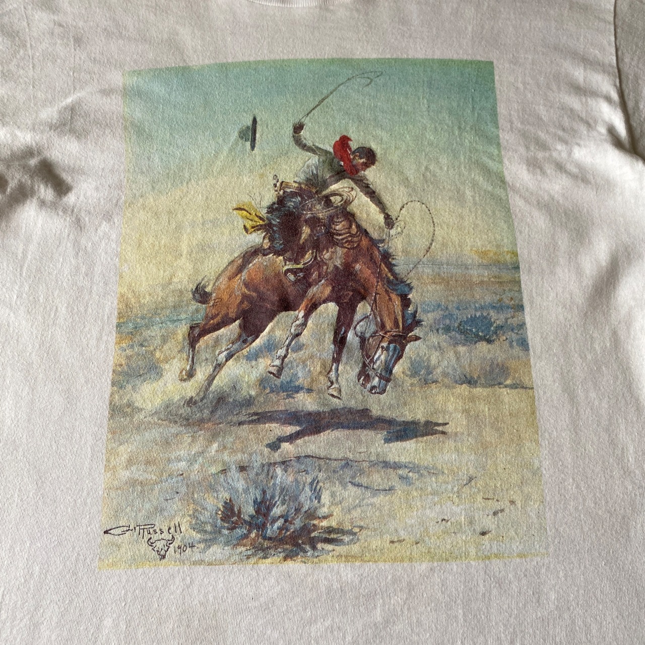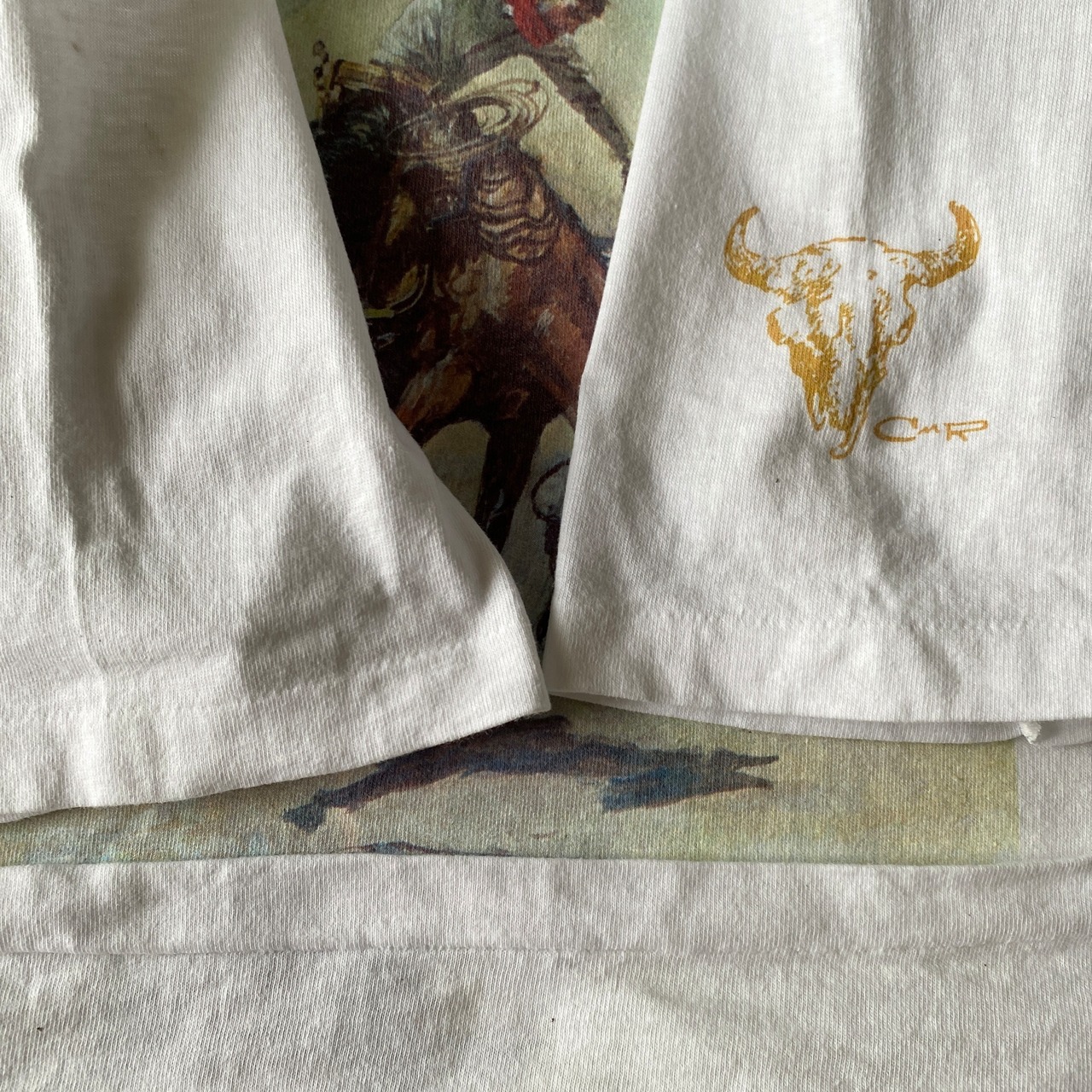 1980-90年代初頭ごろの「チャールズマリオンラッセル」アートtシャツになります。(日本ではそこまで有名なアーティストではないかもしれませんが、西部開拓時代に2000点にもなる作品を残した偉人です。西部開拓時代を語る上では文献としても非常に希少。)