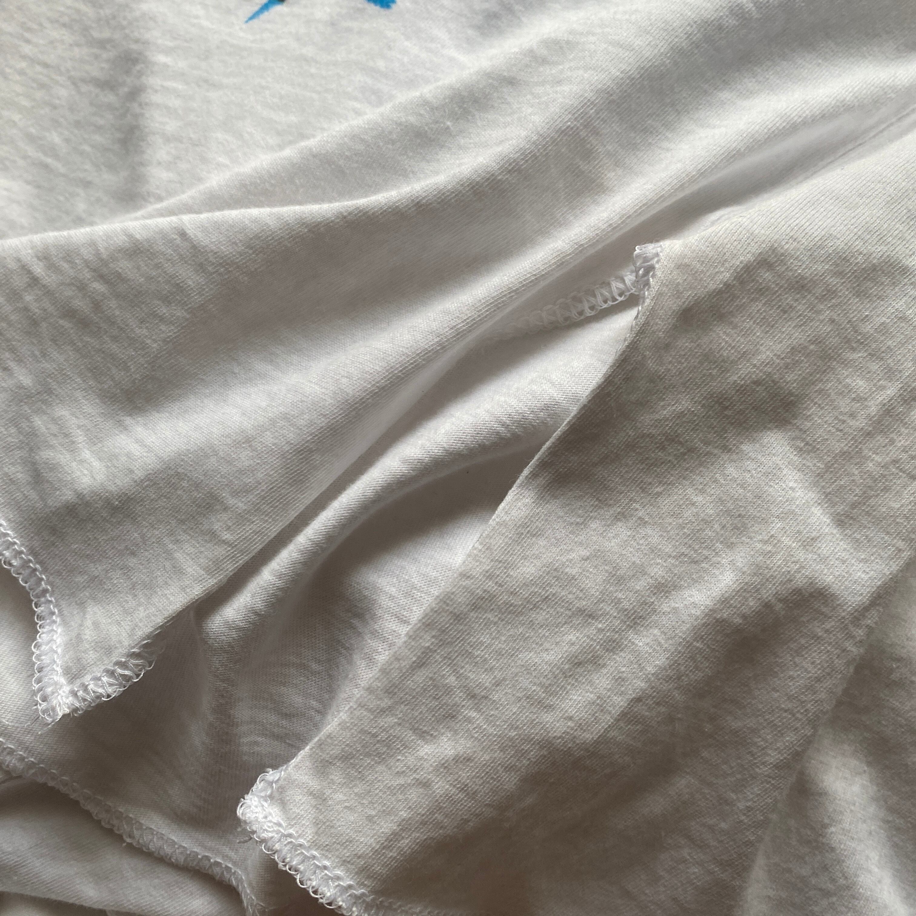 ホワイトのボディに、西洋画のようなブルーのアートプリントが施された非常に格好良い一着。