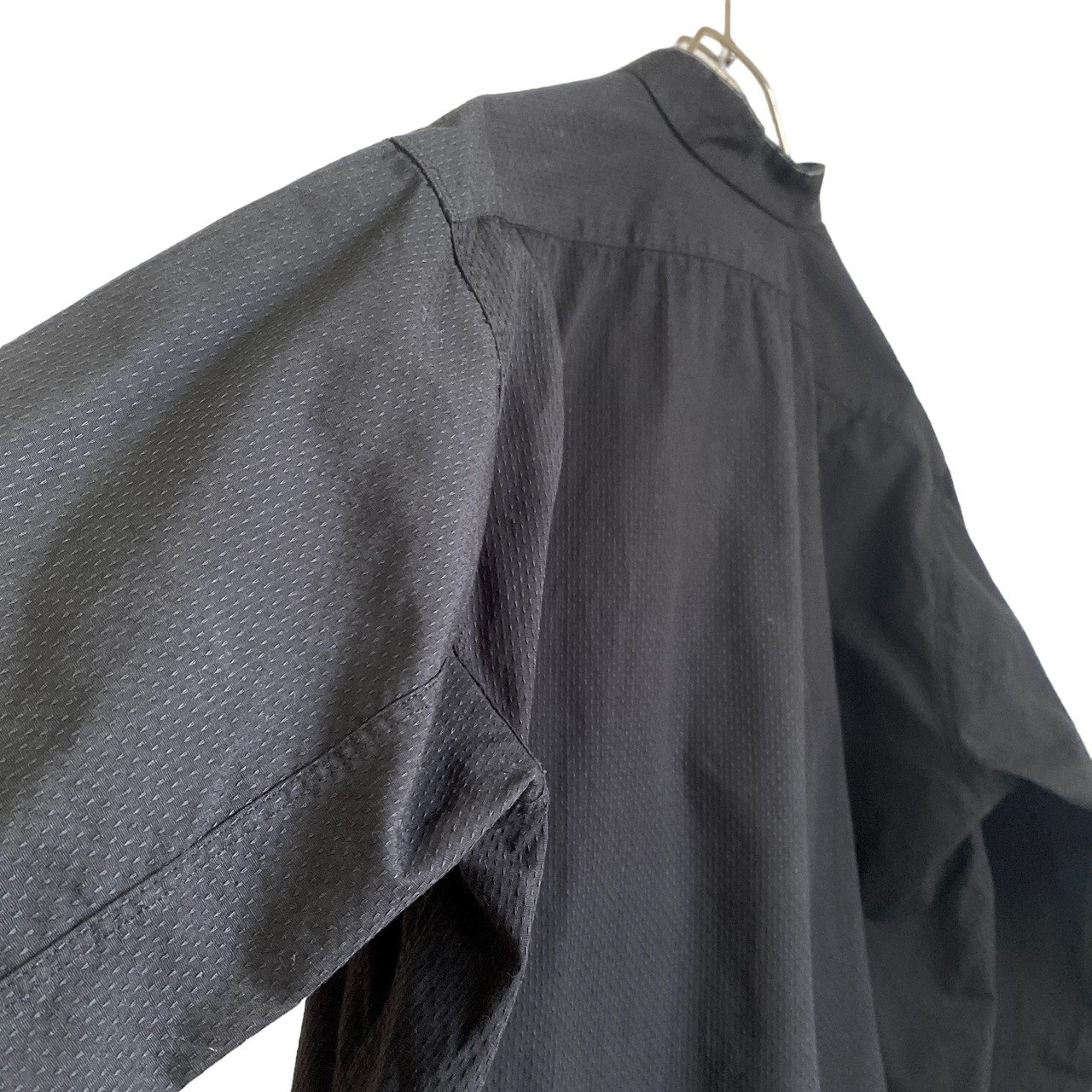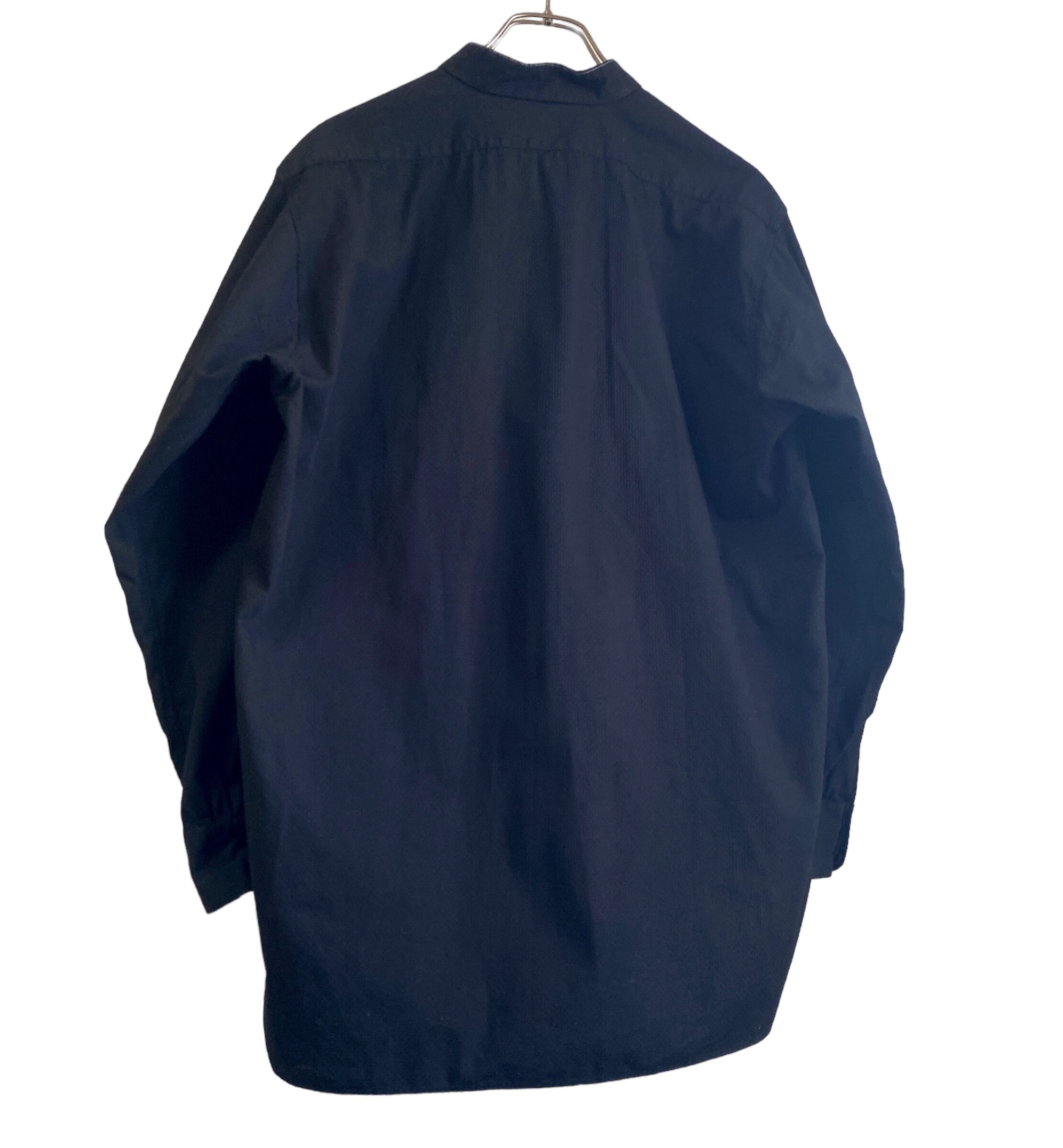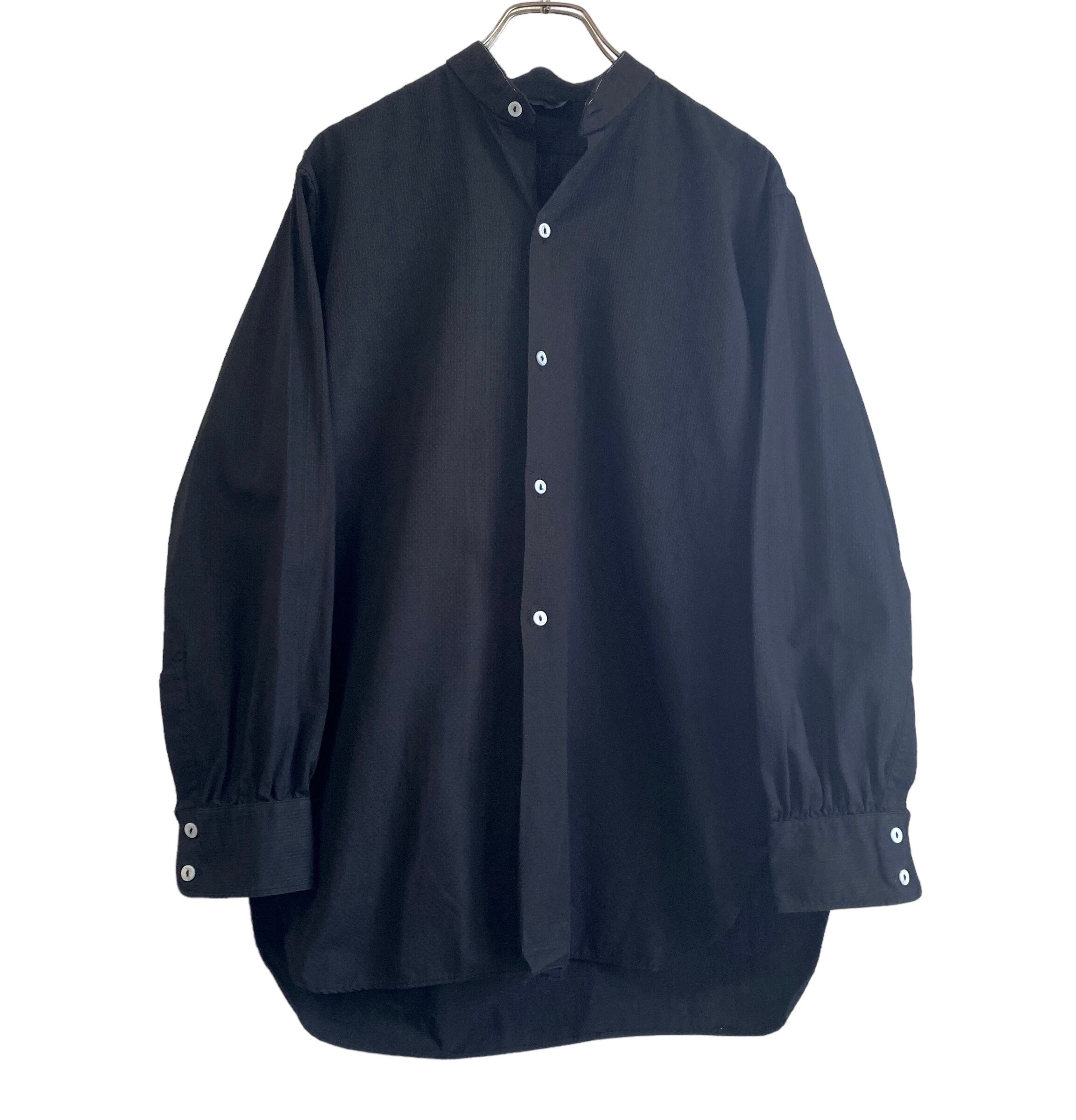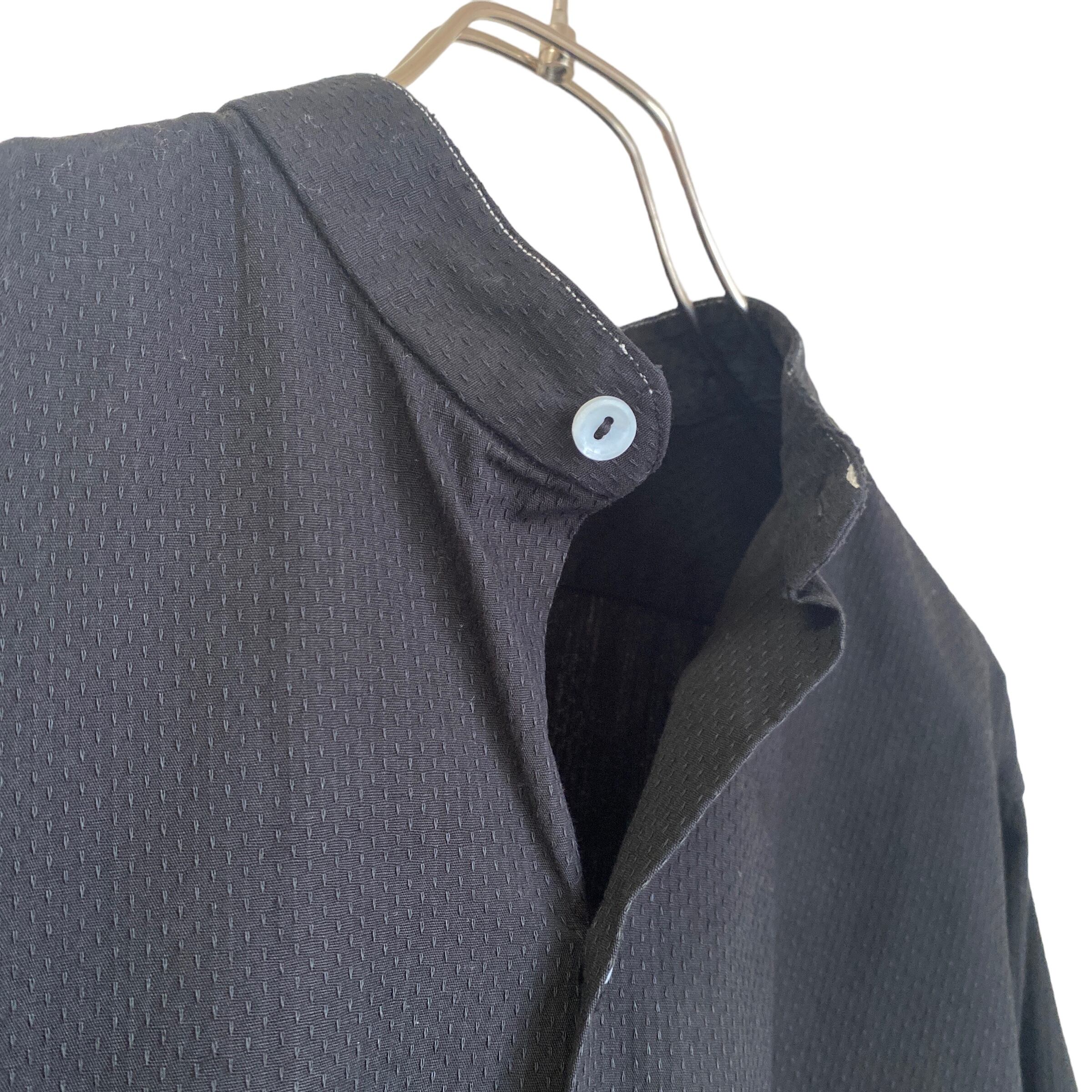 おそらくドレス用のシャツがオーバーダイ(写真だと明るいものもありますが、実際はかなり深い黒染め)&スタンドカラーにリメイクされた一着。