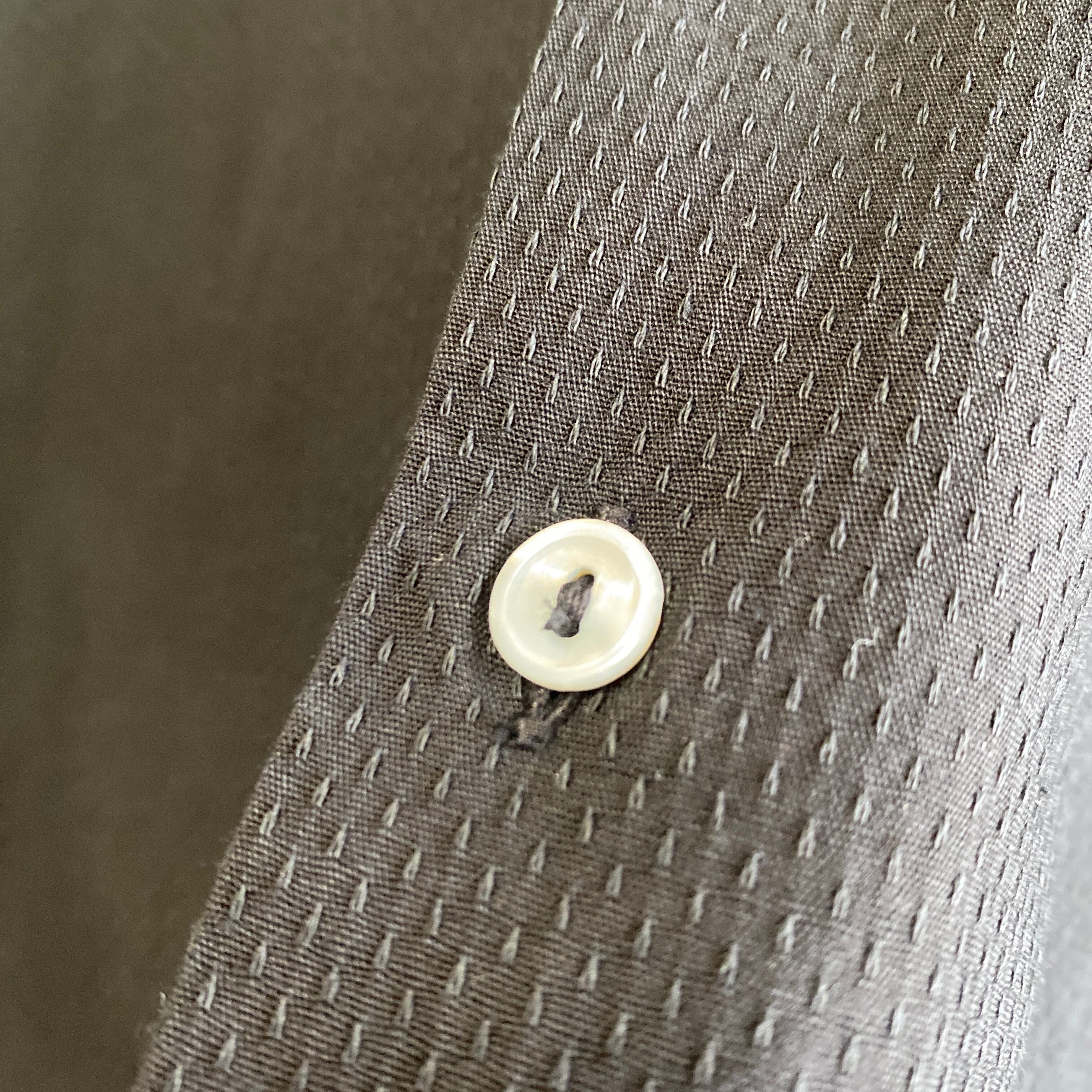刺し子のような織柄の入ったハリコシのあるコットン生地に、二穴のシェルボタン、カフの綺麗ないせ込み、細かなステッチ、二列ボタンのカフスなど非常にクオリティの高いお品です。