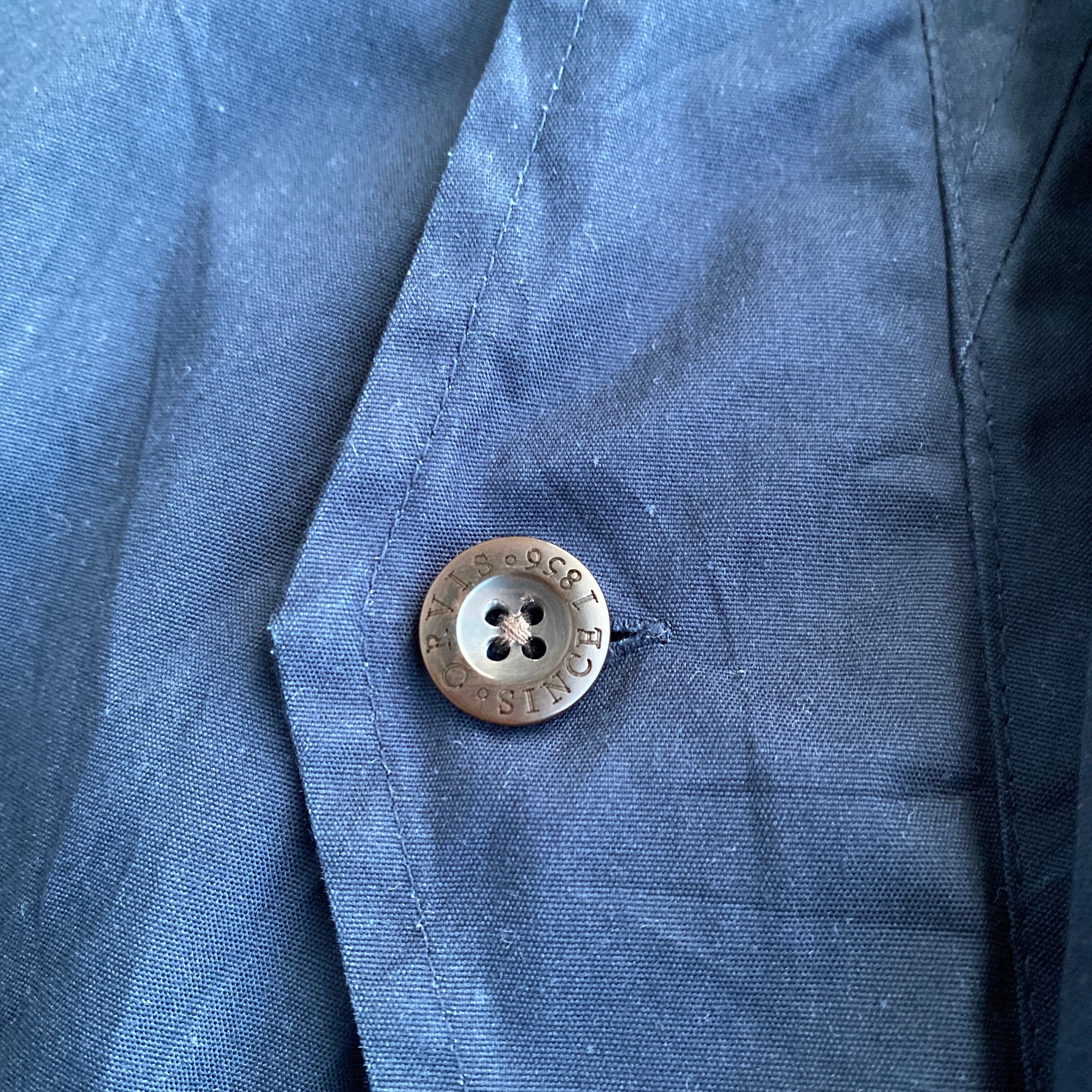 ややくすんだようなダークネイビー(画像2を参考にしてください)に、ハリ感のあるポリコットン地、程よくゆったりしたバランスの良いシルエットは、正直本家のvan heusenライセンスあたりのものより上質です。