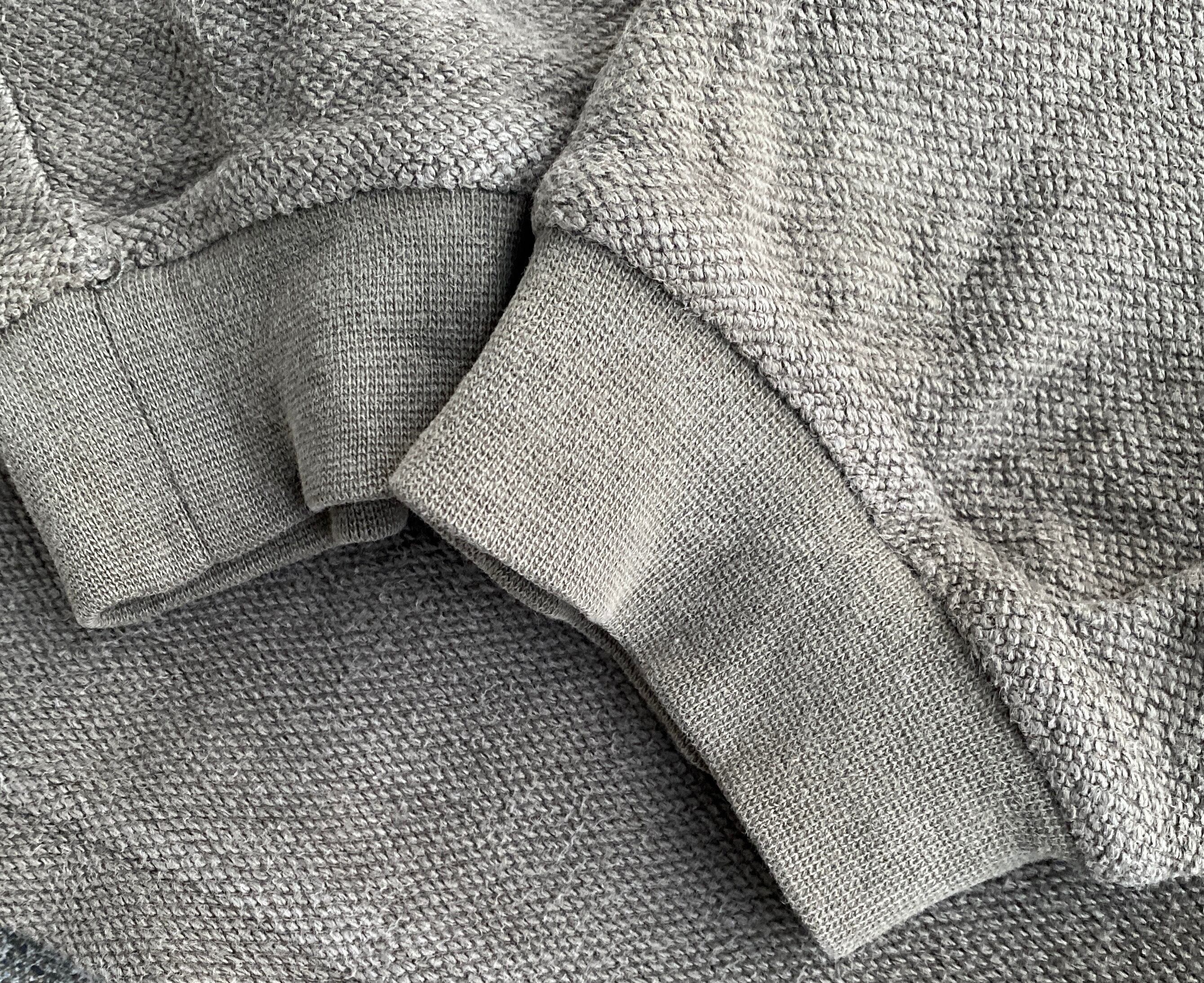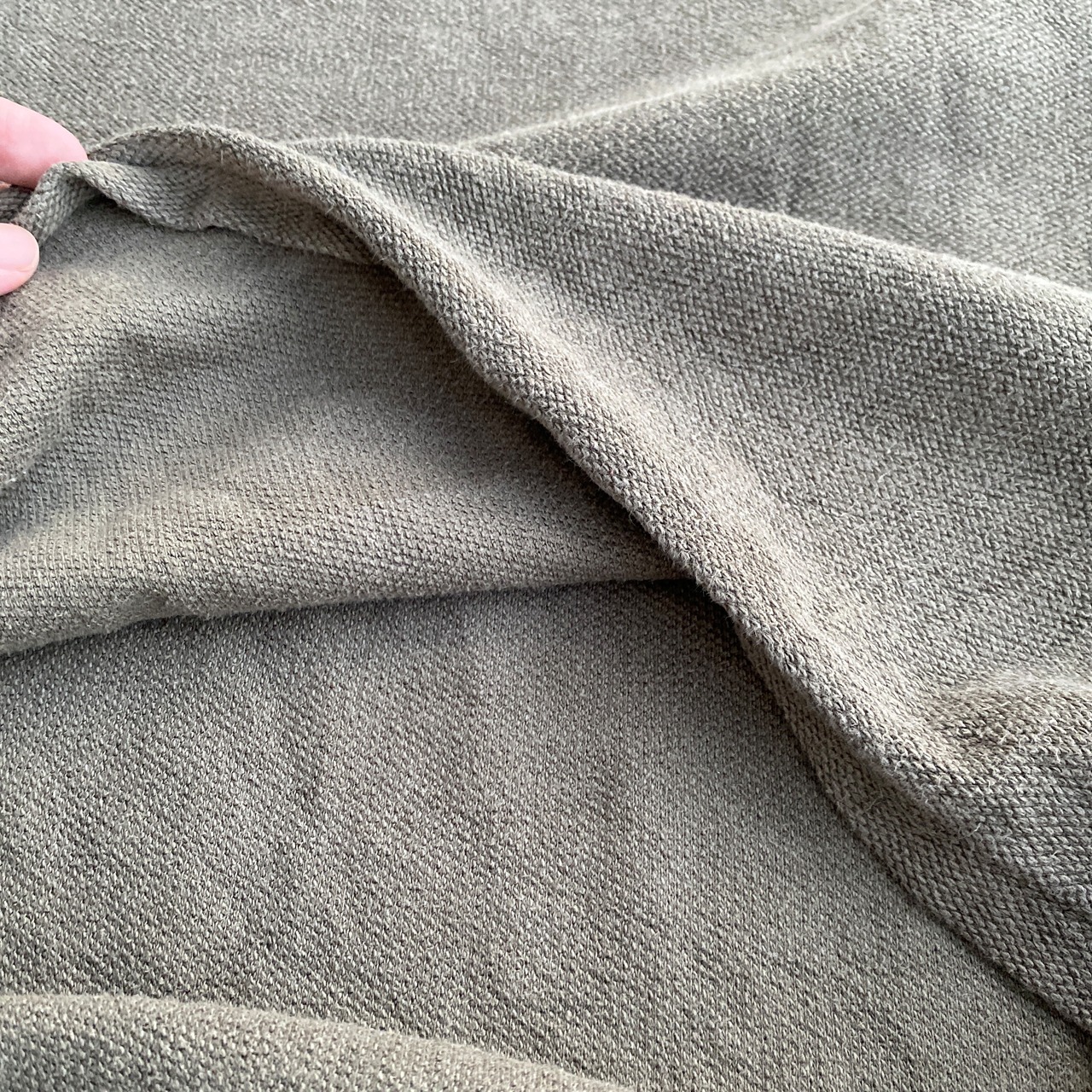 どこかリックオウエンスのダークダストみを感じる、グレイッシュなオリーブカラーの程よく肉厚で柔らかな鹿の子スウェット素材、身幅ゆったりのストンと落ちるボックスシルエットが非常に格好良い一着。