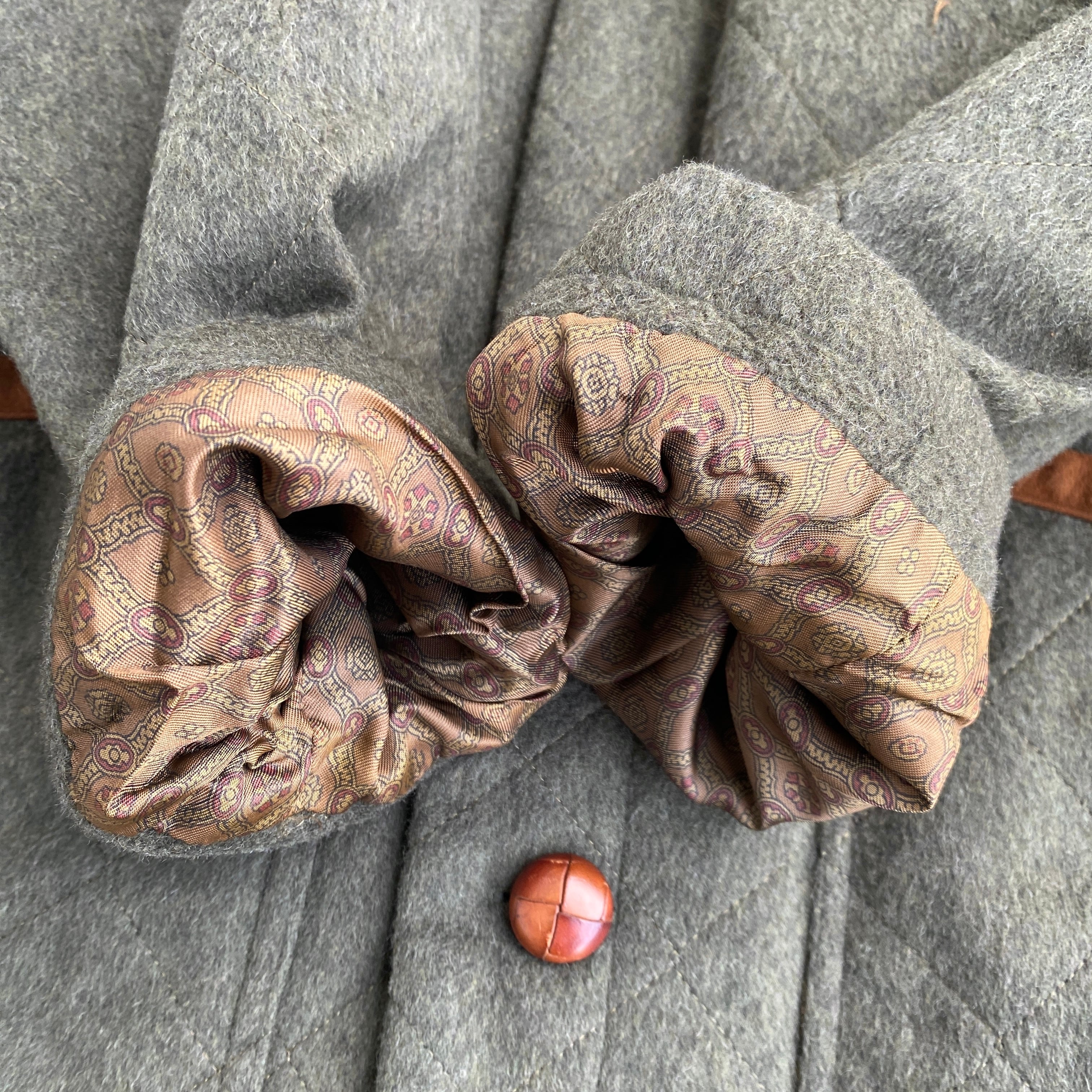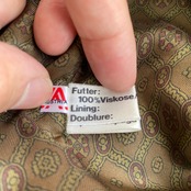 ノーブランドなので、おそらくオーストリアのデパートなどで普通に売られていたレギュラー物だと思われますが、本革のスエード切り替えやレザーの胡桃ボタン、裏地には総柄のビスコース生地が使用されるなどとても高級感があります。