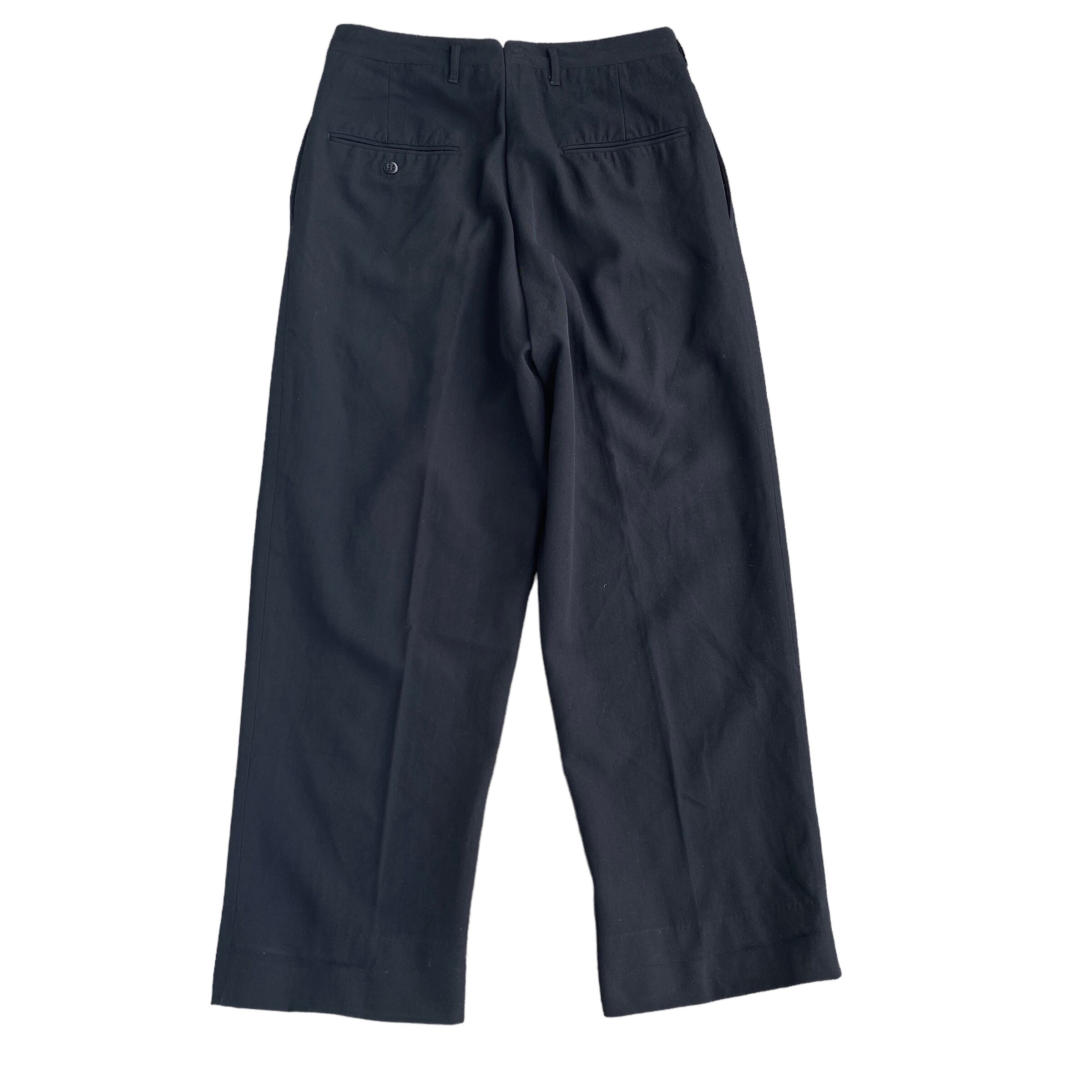 深い黒色の肉厚で超上質なウールギャバ素材を使用し、ゆったりとした2タックシルエットに仕立てられた非常に格好良い一着。