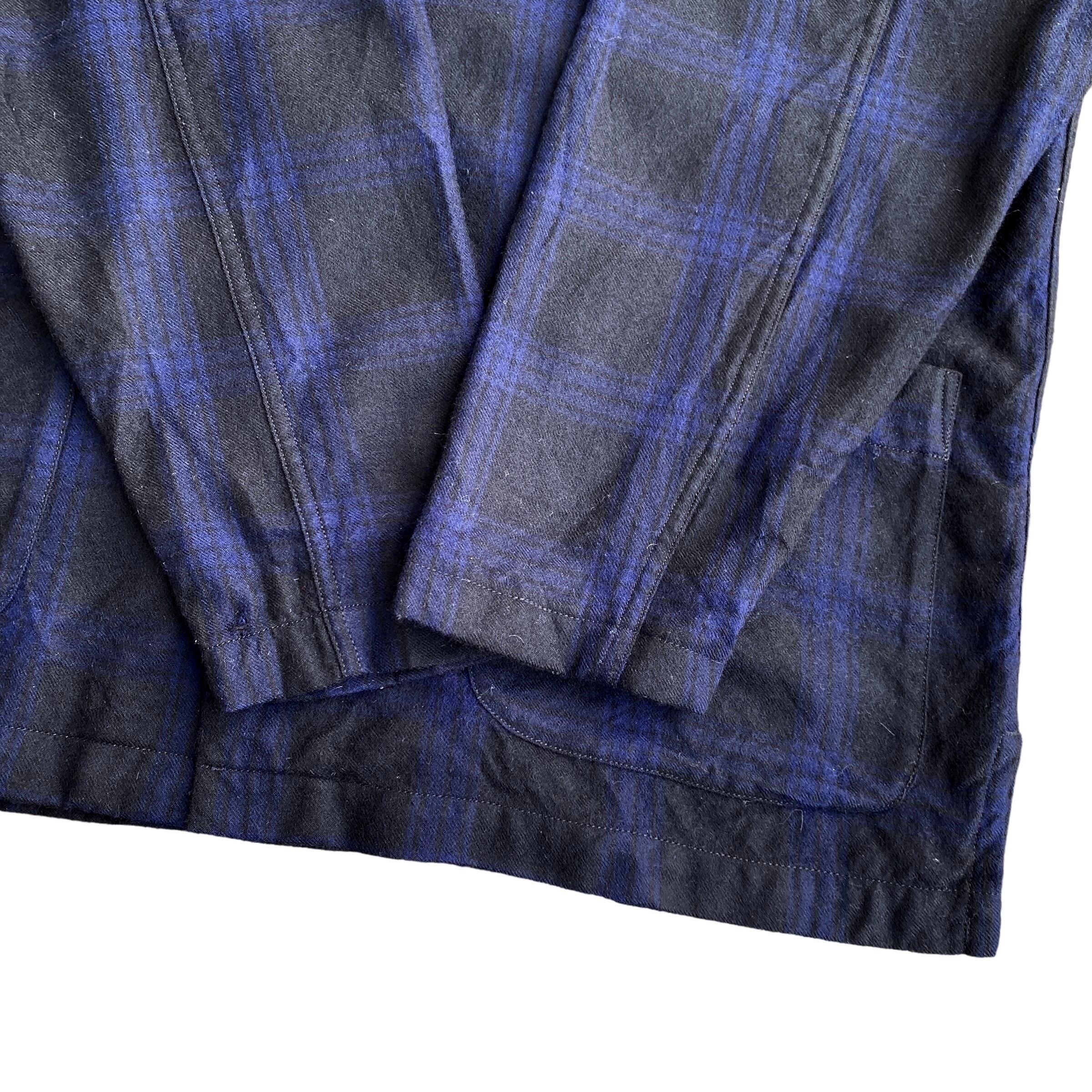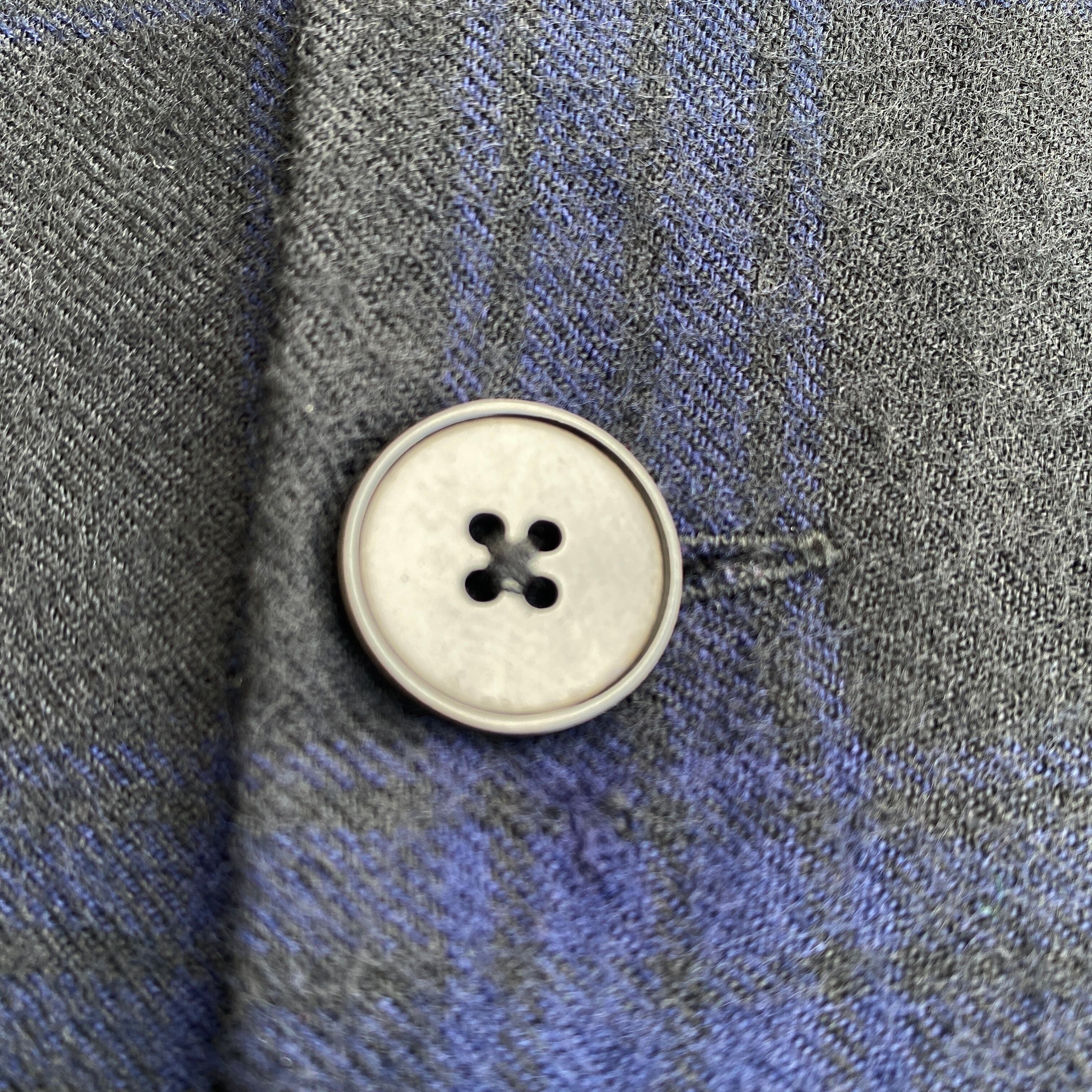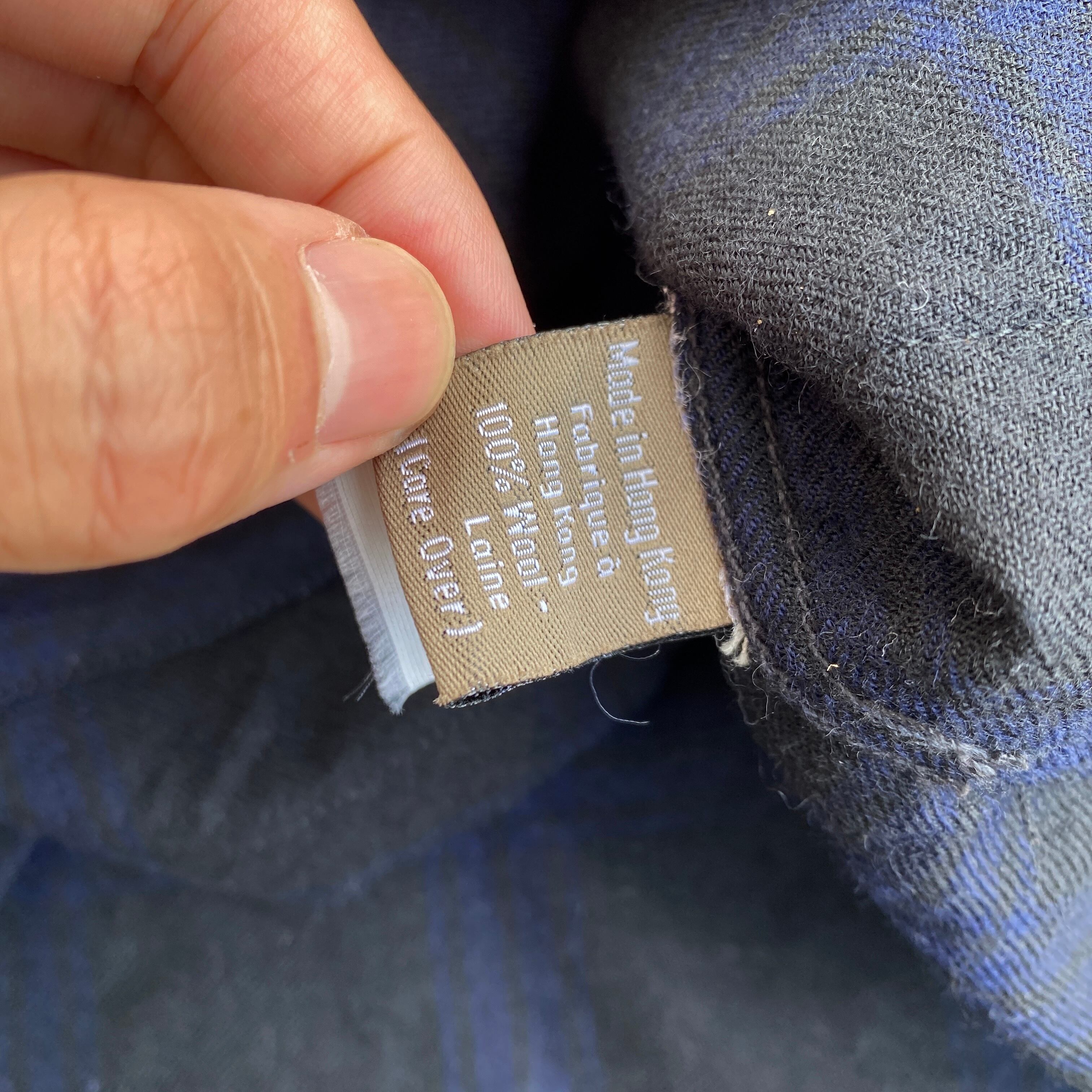 ブラックとダークネイビー二色使い(実物は画像2のようにかなり暗い合わせで、遠目で見るとオンブレのように見えます)のチェックに、少し毛羽立ち感のあるスーツ地のような薄手の梳毛ウールが上品で非常に格好良い一着。