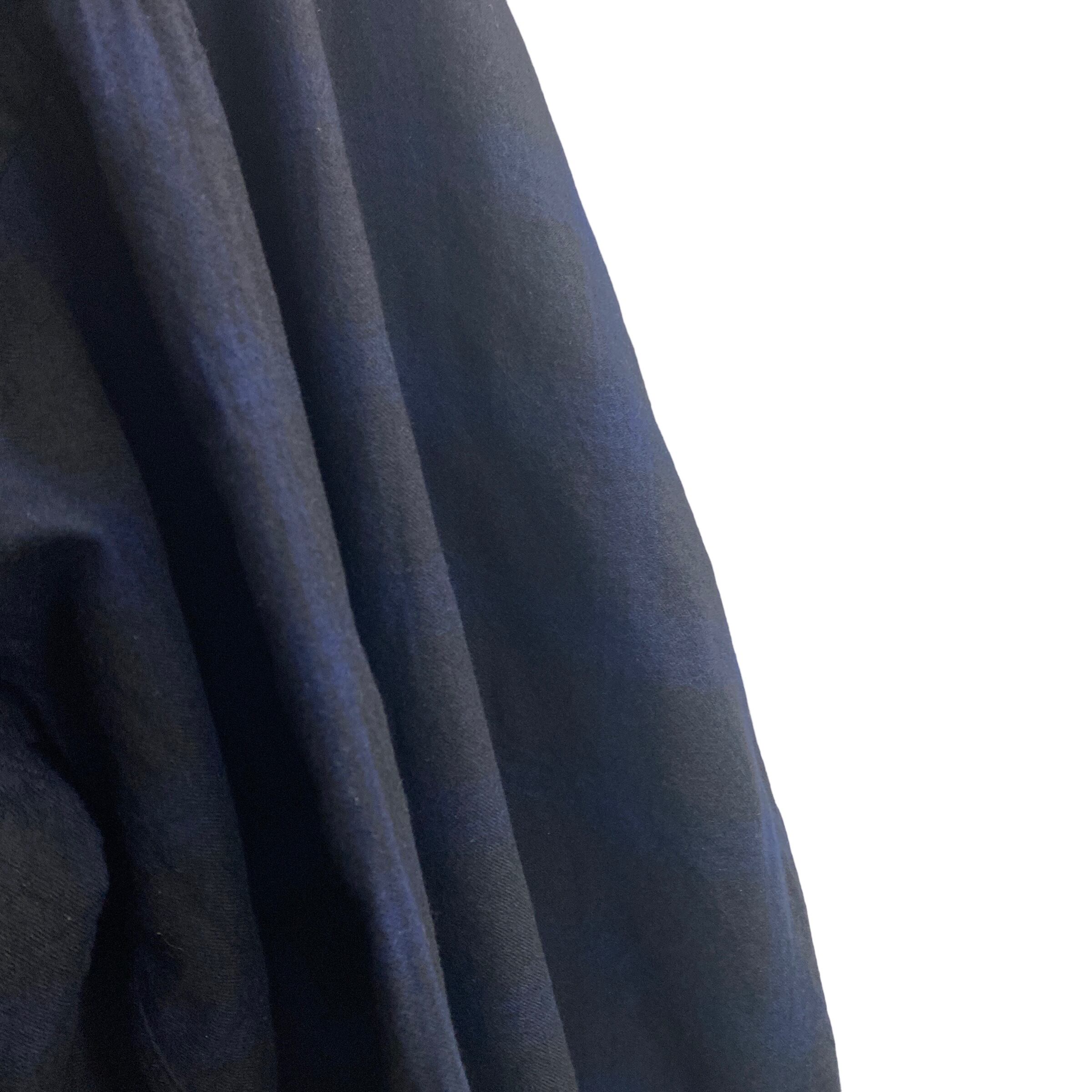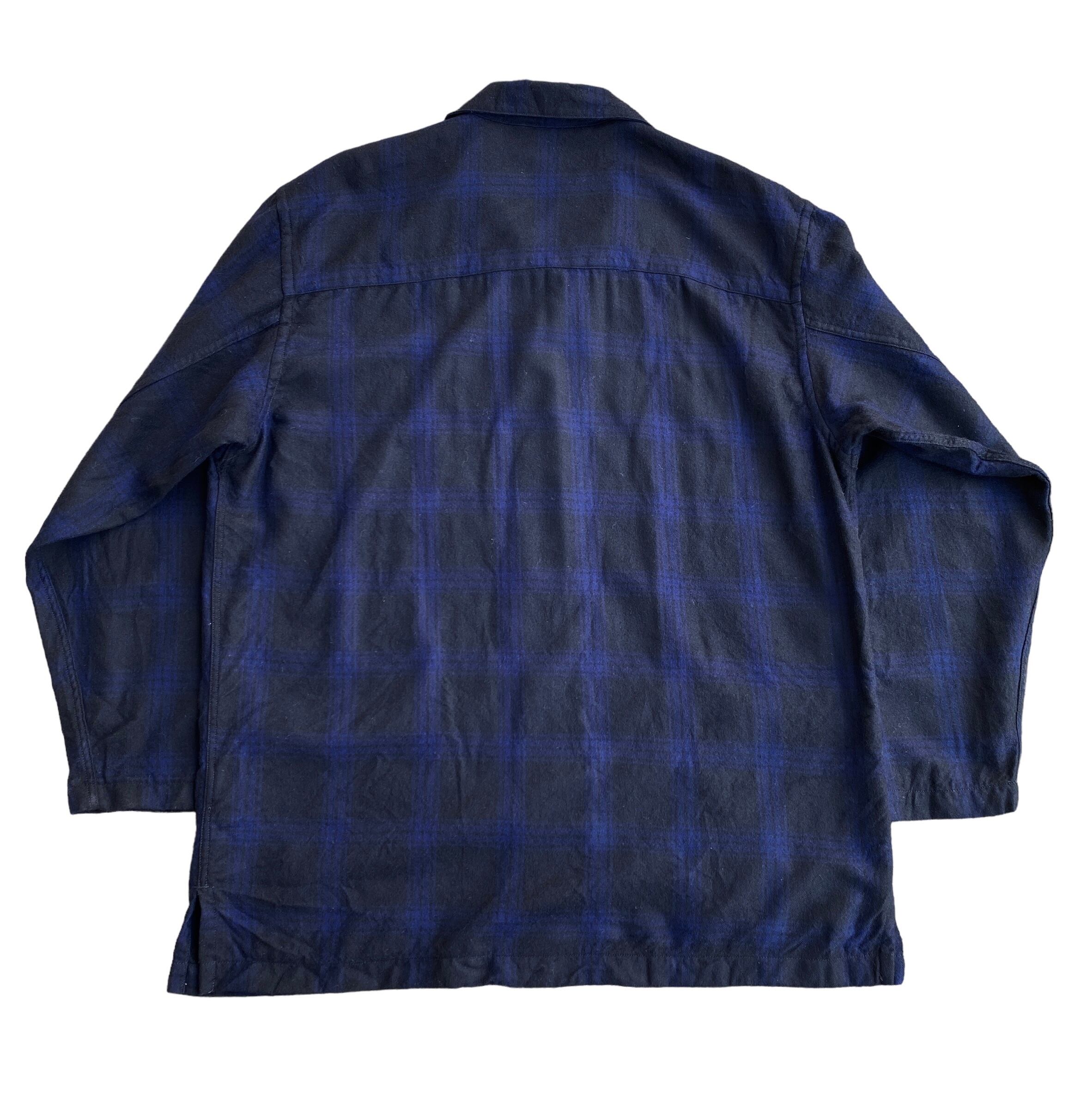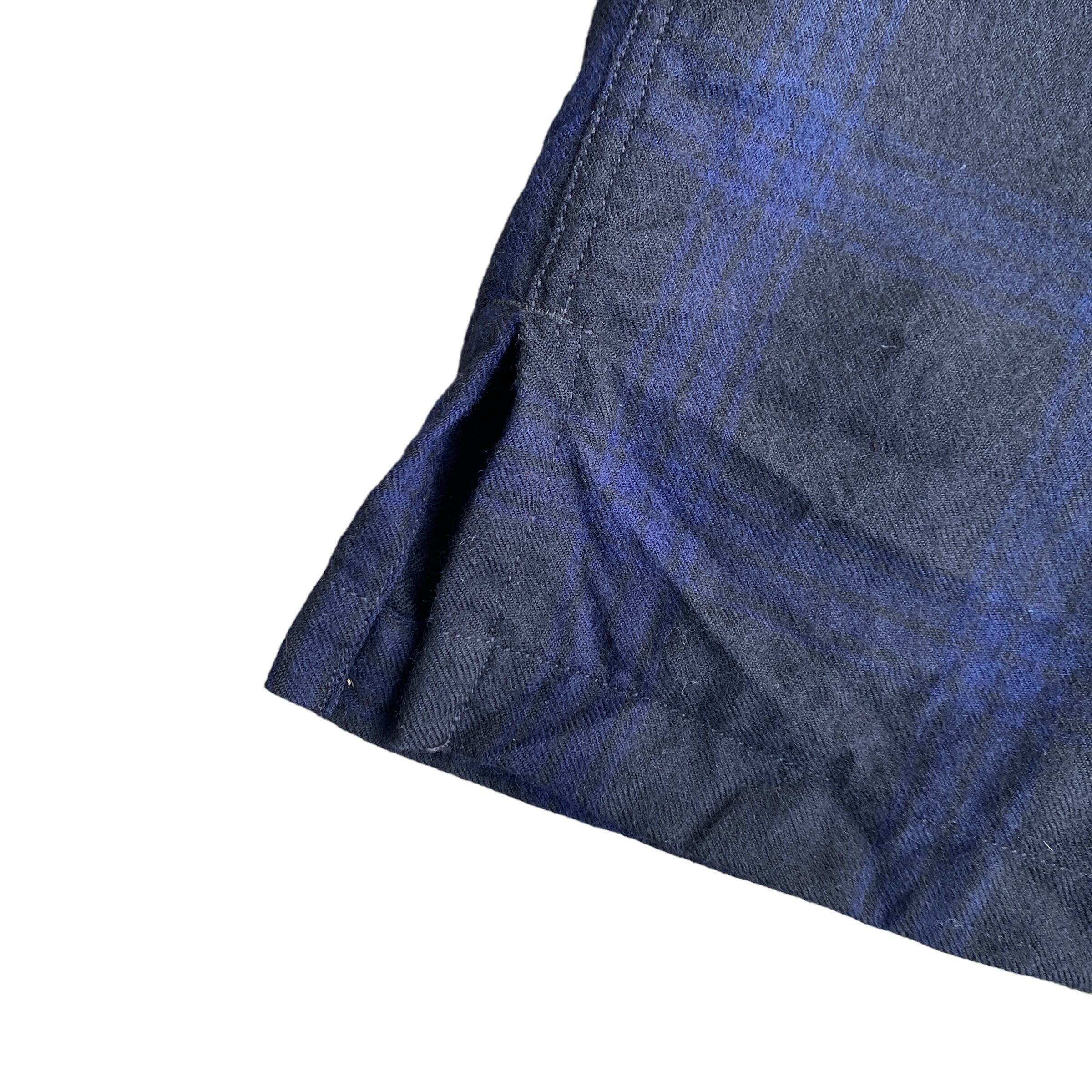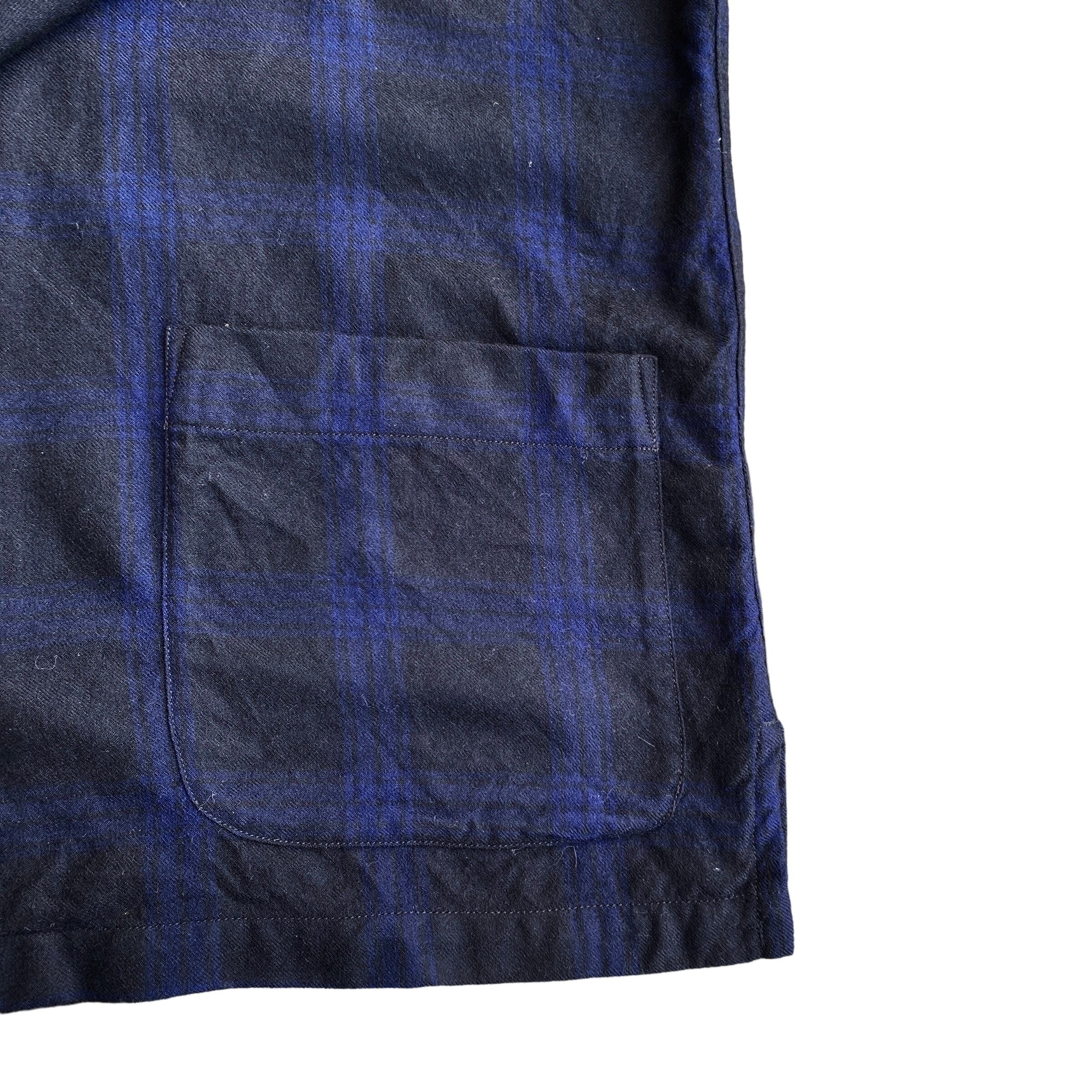 ブラックとダークネイビー二色使い(実物は画像2のようにかなり暗い合わせで、遠目で見るとオンブレのように見えます)のチェックに、少し毛羽立ち感のあるスーツ地のような薄手の梳毛ウールが上品で非常に格好良い一着。