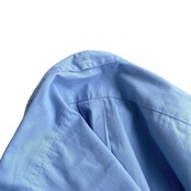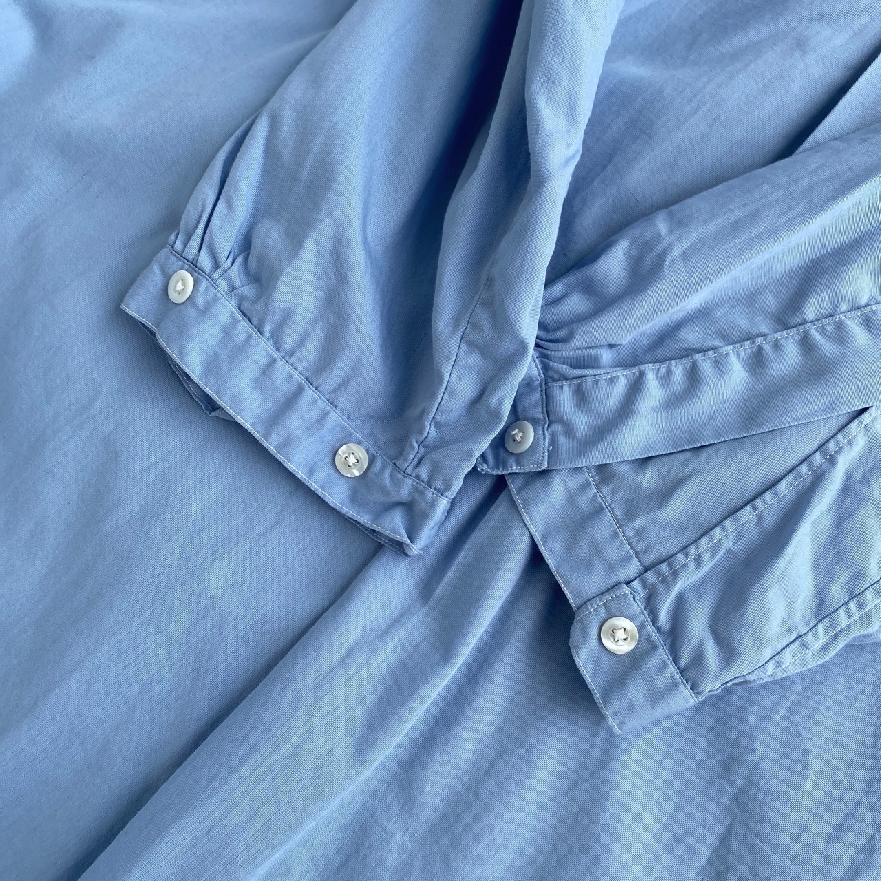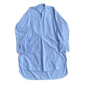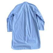美しいサックスブルーカラー、ノーカラー(付け襟仕様)でクセのないシンプルなデザインのロングシルエットが非常に格好良い一着。