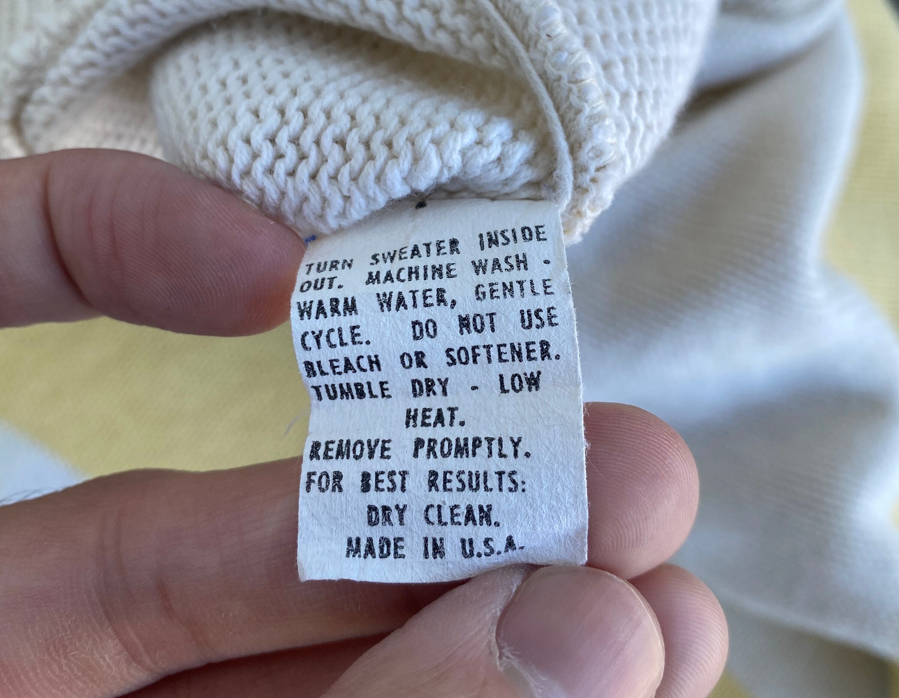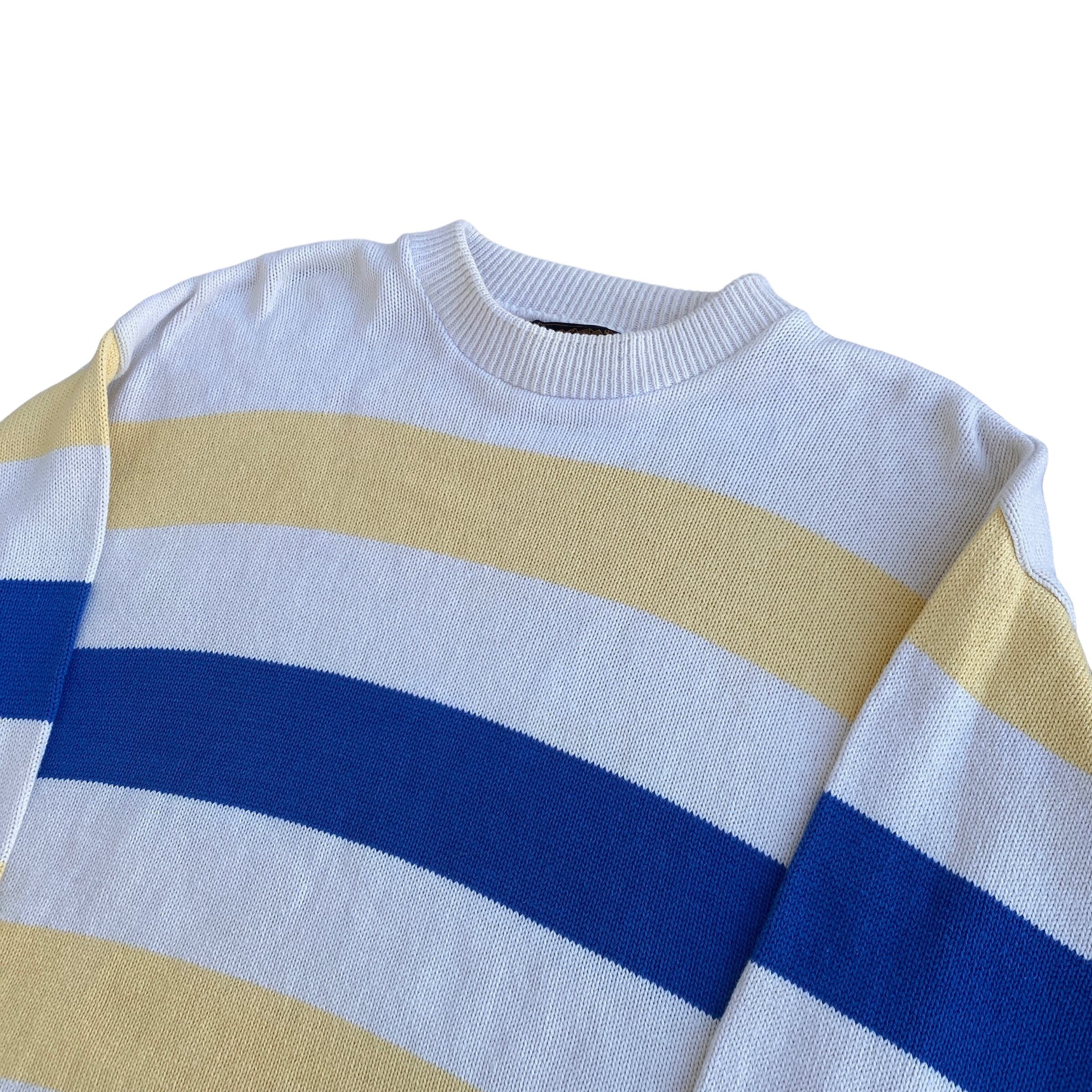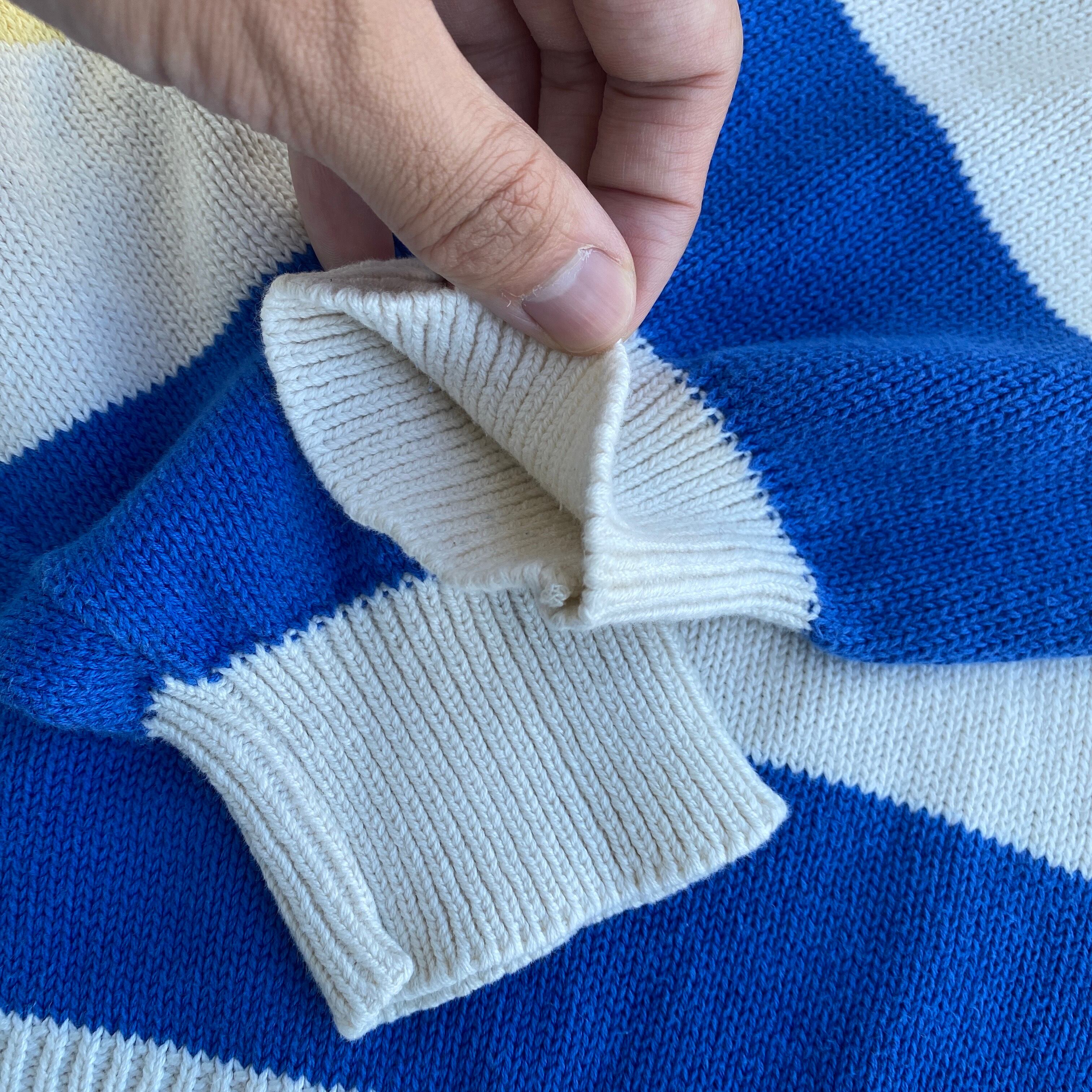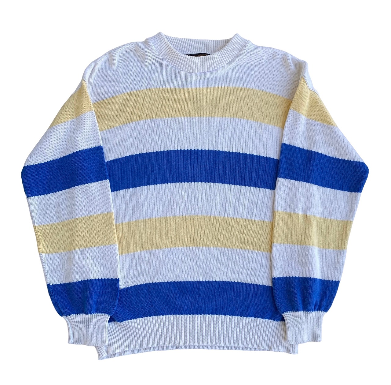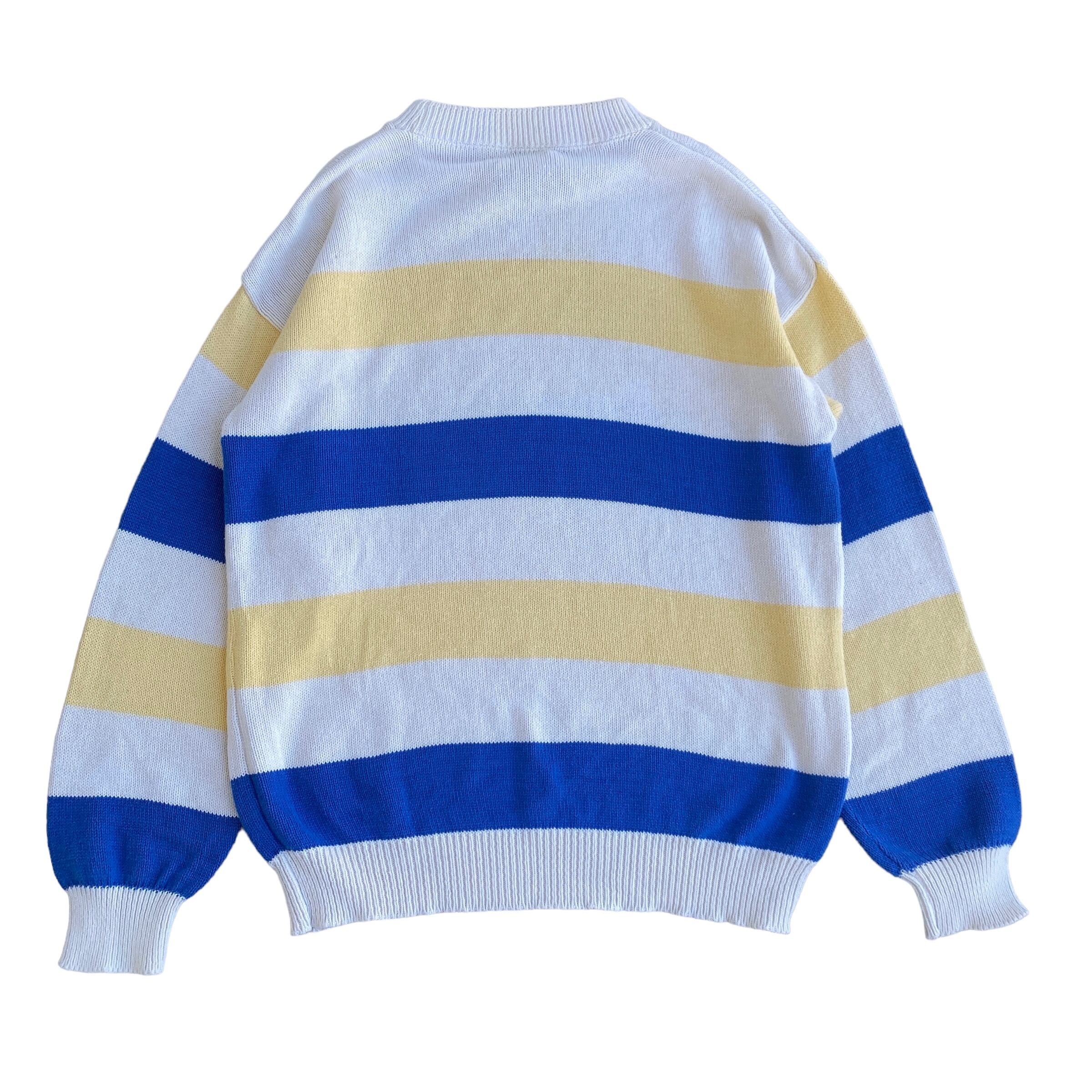 アイボリー、ブルー、イエローのマリンっぽい雰囲気の爽やかでポップなカラーリングに、肉厚なコットンニットの質感、ゆったりとした丸みのあるシルエットが非常に格好良い一着。